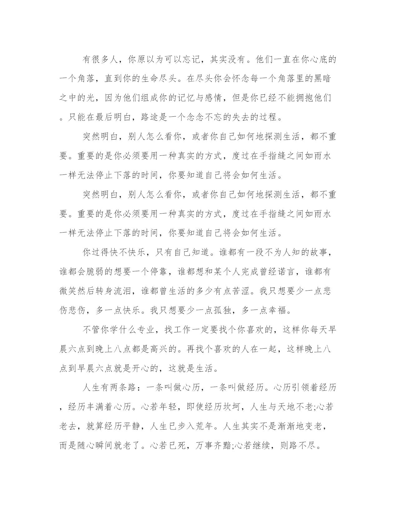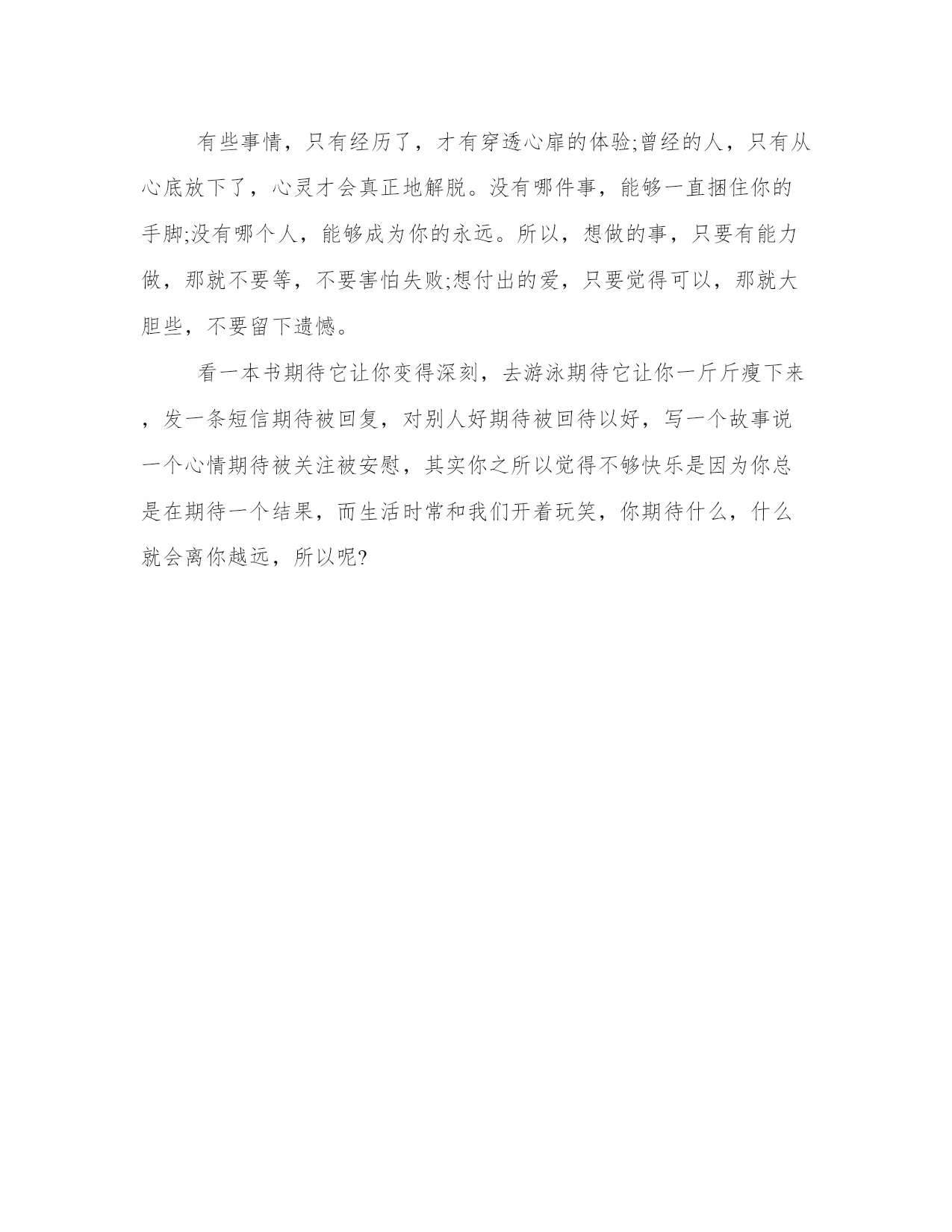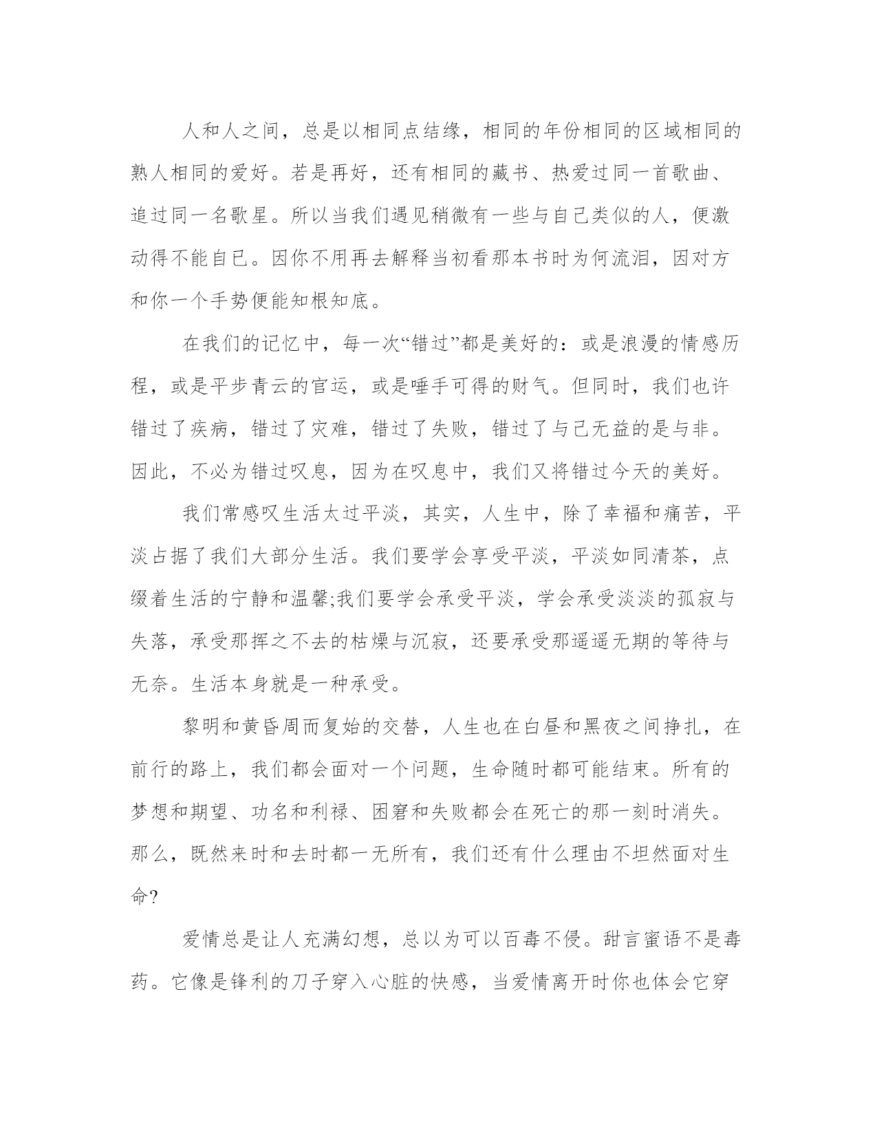 专属女人的生活心情语录忘掉那些长篇大论,忽略那些爱情专家,摒弃那些星座指南吧。爱情从来就没有一个公式可循,有时候想要平平淡淡却变得轰轰烈烈,有时候不想爱他却变得无法自拔。给爱情一个机会,趁你们还年轻。走过去牵她的手,趁你们还相爱。谁的经验都不要信,听从自己的内心。生命无法用来证明爱情,就像我们无法证明自己可以不再相信爱情。在这个城市里,诚如劳力士是物质的奢侈品,爱情则是精神上的奢侈品。可是生命脆弱无比,根本没办法承受那么多的奢侈。爱上一个人,就是爱上一个伤口。每一次爱情,都像一个新鲜的伤口,生长在心里,偶尔疼痛。然而,正是那些疼痛和记忆让我们变得成熟、风情、包容、自制,并且冷静,更懂爱,也更会爱。不属于自己的浪漫,就象绑在线上的风筝,不管飞多高,风停了总会有跌落的时候;不属于自己的感情,就象握在手里的沙子,不管握多紧,都会有流逝的风险;不属于自己的心动,就象上了发条的钟表,不管走多久,终会有停摆的一天。为什么我们总是不懂得珍惜眼前人?在未可预知的重逢里,我们以为总会重逢,总会有缘再会,总以为有机会说一声对不起,却从没想过每一次挥手道别,都可能是诀别,每一声叹息,都可能是人间最后的一声叹息。人和人之间,总是以相同点结缘,相同的年份相同的区域相同的熟人相同的爱好。若是再好,还有相同的藏书、热爱过同一首歌曲、追过同一名歌星。所以当我们遇见稍微有一些与自己类似的人,便激动得不能自已。因你不用再去解释当初看那本书时为何流泪,因对方和你一个手势便能知根知底。在我们的记忆中,每一次“错过”都是美好的:或是浪漫的情感历程,或是平步青云的官运,或是唾手可得的财气。但同时,我们也许错过了疾病,错过了灾难,错过了失败,错过了与己无益的是与非。因此,不必为错过叹息,因为在叹息中,我们又将错过今天的美好。我们常感叹生活太过平淡,其实,人生中,除了幸福和痛苦,平淡占据了我们大部分生活。我们要学会享受平淡,平淡如同清茶,点缀着生活的宁静和温馨;我们要学会承受平淡,学会承受淡淡的孤寂与失落,承受那挥之不去的枯燥与沉寂,还要承受那遥遥无期的等待与无奈。生活本身就是一种承受。黎明和黄昏周而复始的交替,人生也在白昼和黑夜之间挣扎,在前行的路上,我们都会面对一个问题,生命随时都可能结束。所有的梦想和期望、功名和利禄、困窘和失败都会在死亡的那一刻时消失。那么,既然来时和去时都一无所有,我们还有什么理由不坦然面对生命?爱情总是让人充满幻想,总以为可以百毒不侵。甜言蜜语不是毒药。它像是锋利的刀子穿入心脏的快感,当爱情离开时你也体会它穿心的疼痛!然后把自己紧紧包裹,不愿让人看到留下的伤口,只有在孤单雨夜才放任自流,让所有的疼痛蔓延!女人伤心地说:我和他一起许多年了,可是,我知道他心里仍然怀念着逝去的妻子。我是没法代替她的。那就不要代替她好了。不要渴望自己可以代替别人。你是你自己,用不着代替任何人。一个人,走在陌生的城市,听伤感的音乐,看陌生的风景。我们都在寻找,人生就是寻找爱的过程,每个人都会遇到三种人,你爱的人,爱你的人,与你共度一生的人。并不是每一对有缘相爱的恋人,都有相守一生的缘分;也许这一场恋爱是情深缘浅,下一场就缘定终生了,去爱吧,像不曾受过一次伤一样。真正的感情根本不需要追的,两个人的默契慢慢将两颗心的距离缩短,在无意识中渐渐靠近彼此。从好朋友到情人,真正的感情是用不了多久的。从你喜欢上他的那一刻起,也许他也在那一刻喜欢上了你。同节奏的爱情往往能奏出最和谐最动听的乐章。真正的爱情需要两个人在一起是轻松快乐的没有压力。人生的平凡、平淡、平庸,常归因于一个字:怕。怕得到的会失去,怕转身了就是永别,怕摔跤后再也起不来,在怕中畏首畏尾裹足不前。人生就一条路,走一步有一步的景观。上帝不会眷顾谁,你有勇气放弃,才有机会得到。华丽的跌倒,胜过无谓的徘徊;哪怕败得彻底,就当赶上了命运的另一盛宴。有很多人,你原以为可以忘记,其实没有。他们一直在你心底的一个角落,直到你的生命尽头。在尽头你会怀念每一个角落里的黑暗之中的光,因为他们组成你的记忆与感情,但是你已经不能拥抱他们。只能在最后明白,路途是一个念念不忘的失去的过程。突然明白,别人怎么看你,或者你自己如何地探测生活,都不重要。重要的是你必须要用一种真实的方式,度过在手指缝之间如雨水一样无法停止下落的时间,你要知道自己将会如何生活。突然明白,别人怎么看你,或者你自己如何地探测生活,都不重要。重要的是你必须要用一种真实的方式,度过在手指缝之间如雨水一样无法停止下落的时间,你要知道自己将会如何生活。你过得快不快乐,只有自己知道。谁都有一段不为人知的故事,谁都会脆弱的想要一个停靠,谁都想和某个人完成曾经诺言,谁都有微笑然后转身流泪,谁都曾生活的多少有点苦涩。我只想要少一点悲伤悲伤,多一点快乐。我只想