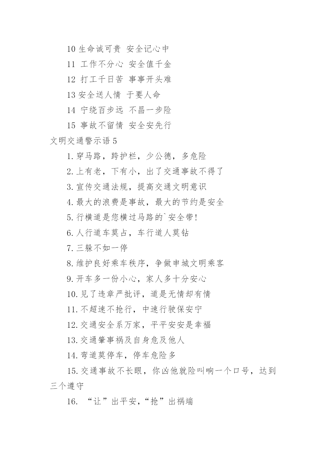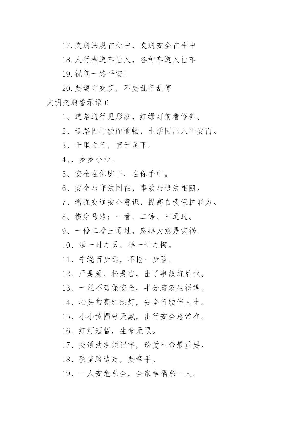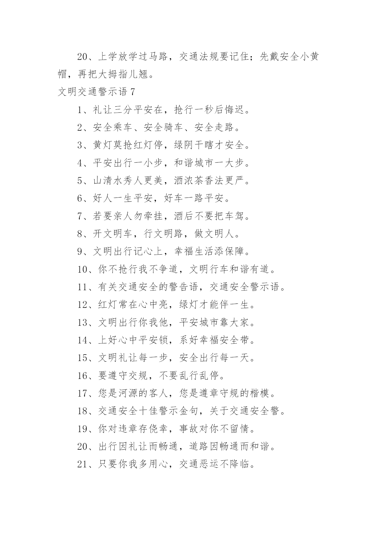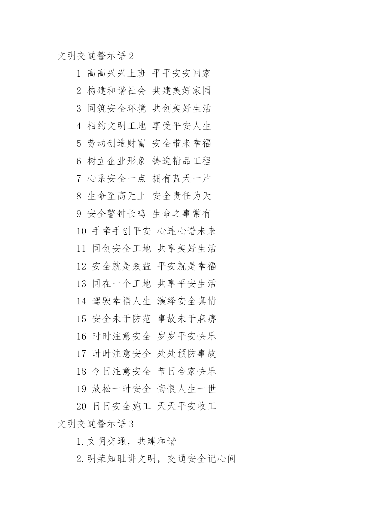 文明交通警示语文明交通警示语(优)在日常学习、工作和生活中,大家没少看到过警示语吧,警示语就是告诉或提醒人们什么该做什么不该做的话语。写起警示语来就毫无头绪?以下是小编整理的文明交通警示语,欢迎阅读与收藏。文明交通警示语11.骑好车走好路安全伴您每一步2.遵守交通信号,遵守交通标志,遵守交通标线3.树立文明意识,搞好交通秩序4.违规是交通事故的祸根,侥幸是交通事故的.隐患5.良药苦口利于病,交通规则利于行6.路好车好安全最好,慢行快行平安才行7.讲究交通公德,遵守交通法规8.车铃车闸齐全,维系您的安全9.遵守交规得平安,道路畅通保安全10.骑车抢行一秒,危险增加十分11.交通安全抛脑后,交通事故在前头12.您保持车况良好,车容整洁13.交通安全在我心中!14.加强综合治理,保障交通安全15.学龄前儿童上街要有成年人带领文明交通警示语21高高兴兴上班平平安安回家2构建和谐社会共建美好家园3同筑安全环境共创美好生活4相约文明工地享受平安人生5劳动创造财富安全带来幸福6树立企业形象铸造精品工程7心系安全一点拥有蓝天一片8生命至高无上安全责任为天9安全警钟长鸣生命之事常有10手牵手创平安心连心谱未来11同创安全工地共享美好生活12安全就是效益平安就是幸福13同在一个工地共享平安生活14驾驶幸福人生演绎安全真情15安全未于防范事故未于麻痹16时时注意安全岁岁平安快乐17时时注意安全处处预防事故18今日注意安全节日合家快乐19放松一时安全悔恨人生一世20日日安全施工天天平安收工文明交通警示语31.文明交通,共建和谐2.明荣知耻讲文明,交通安全记心间3.红灯很短暂,人生却漫长,绿灯还会亮,生命不重来4.宁绕百步远,不冒一步险5.红绿灯下讲文明,斑马线上知荣辱6.红灯亮了不要急,歇歇脚后慢慢骑7.带文明上路,携平安回家8.红绿灯下见文明,黄白线间现公德9.文明在您心中,安全在您手中10.迈文明步子,开安全车子,做礼让君子,过平安日子11.人人文明,路路畅通12.我礼让,我遵章,我平安13.交通文明两相连,大众安全一线牵14.让一让,海阔天空;抢一抢,寸步难行15.相逢是缘份,会车皆有礼文明交通警示语41建美好家园构和谐社会2宿舍是我家卫生靠大家3人人都有家安全靠大家4与安全牵系让幸福常有5安全你一人幸福全家人6安全手拉手幸福心连心7人人讲安全安全为人人8家人盼平安上岗讲安全9上班到工地安全数第一10生命诚可贵安全记心中11工作不分心安全值千金12打工千日苦事事开头难13安全送人情于要人命14宁绕百步远不昌一步险15事故不留情安全安先行文明交通警示语51.穿马路,跨护栏,少公德,多危险2.上有老,下有小,出了交通事故不得了3.宣传交通法规,提高交通文明意识4.最大的浪费是事故,最大的节约是安全5.行横道是您横过马路的`安全带!6.人行道车莫占,车行道人莫钻7.三躲不如一停8.维护良好乘车秩序,争做申城文明乘客9.开车多一份小心,家人多十分安心10.见了违章严批评,道是无情却有情11.不超速不抢行,中速行驶保安宁12.交通安全系万家,平平安安是幸福13.交通肇事祸及自身危及他人14.弯道莫停车,停车危险多15.交通事故不长眼,你凶他就险叫响一个口号,达到三个遵守16.“让”出平安,“抢”出祸端17.交通法规在心中,交通安全在手中18.人行横道车让人,各种车道人让车19.祝您一路平安!20.要遵守交规,不要乱行乱停文明交通警示语61、道路通行见形象,红绿灯前看修养。2、道路因行驶而通畅,生活因出入平安而。3、千里之行,慎于足下。4、,步步小心。5、安全在你脚下,在你手中。6、安全与守法同在,事故与违法相随。7、增强交通安全意识,提高自我保护能力。8、横穿马路:一看、二等、三通过。9、一停二看三通过,麻痹大意是灾祸。10、逞一时之勇,得一世之悔。11、宁绕百步远,不抢一步险。12、严是爱、松是害,出了事故坑后代。13、一丝不苟保安全,半分疏忽生祸端。14、心头常亮红绿灯,安全行驶伴人生。15、小小黄帽每天戴,出行安全总常在。16、红灯短暂,生命无限。17、交通法规须记牢,珍爱生命最重要。18、孩童路边走,要牵手。19、一人安危系全,全家幸福系一人。20、上学放学过马路,交通法规要记住;先戴安全小黄帽,再把大拇指儿翘。文明交通警示语71、礼让三分平安在,抢行一秒后悔迟。2、安全乘车、安全骑车、安全走路。3、黄灯莫抢红灯停,绿阴干瞎才安全。4、平安出行一小步,和谐城市一大步。5、山清水秀人更美,酒浓茶香法更严。6、好人一生平安,好车一路平安。7、若要亲人勿牵挂,酒后不要把车驾。8、开文明车,行文明路,做文明人。9、文明出行记心上,幸福生活添保障。10、你不抢行我不争道,文明行车和谐有道。11、有关交通安全的警告语,交通安全警示语。12、红灯常在心中亮