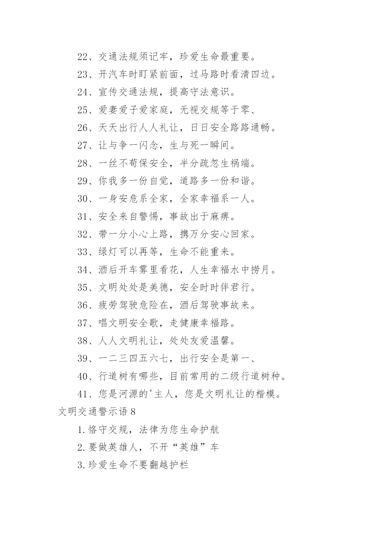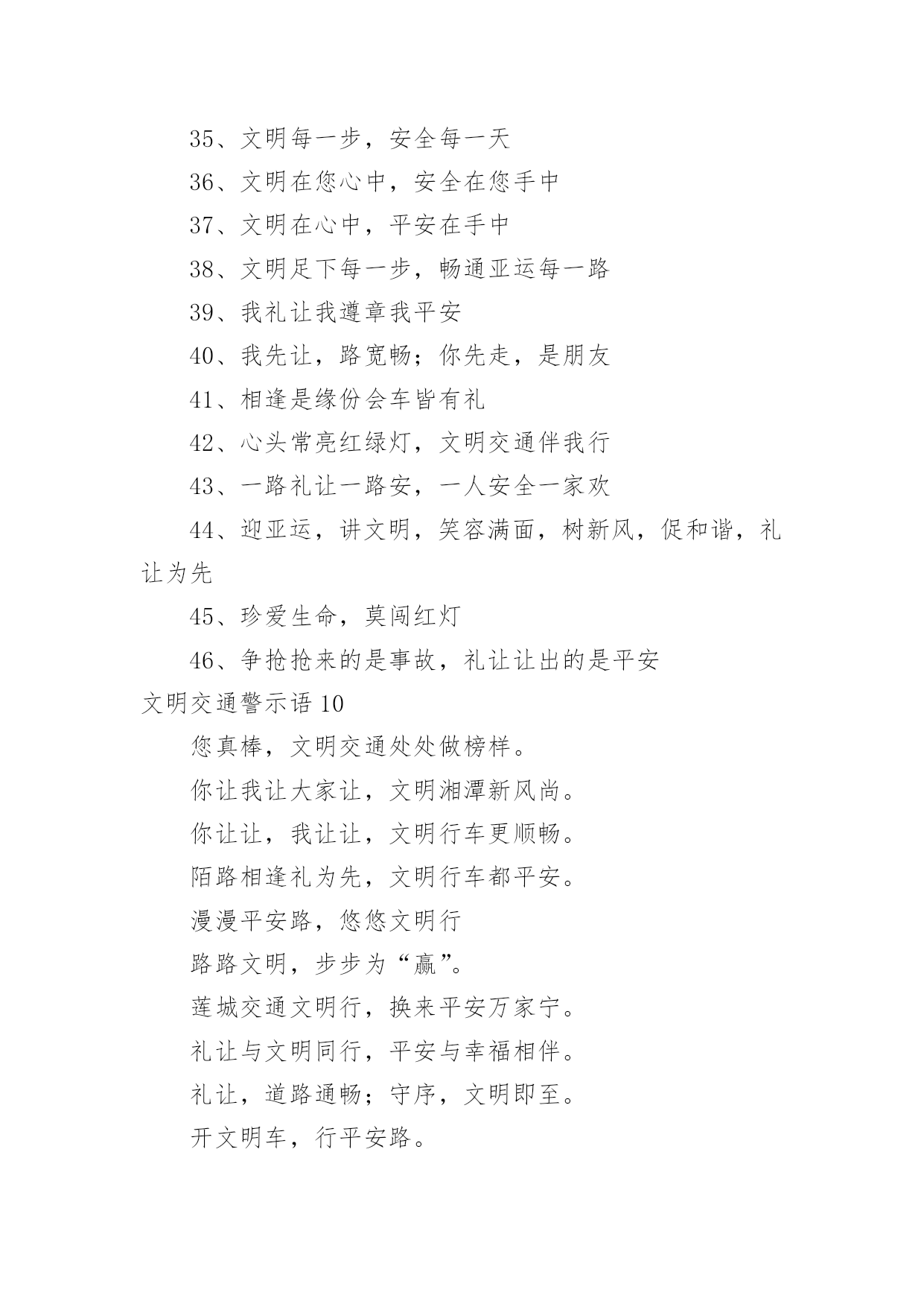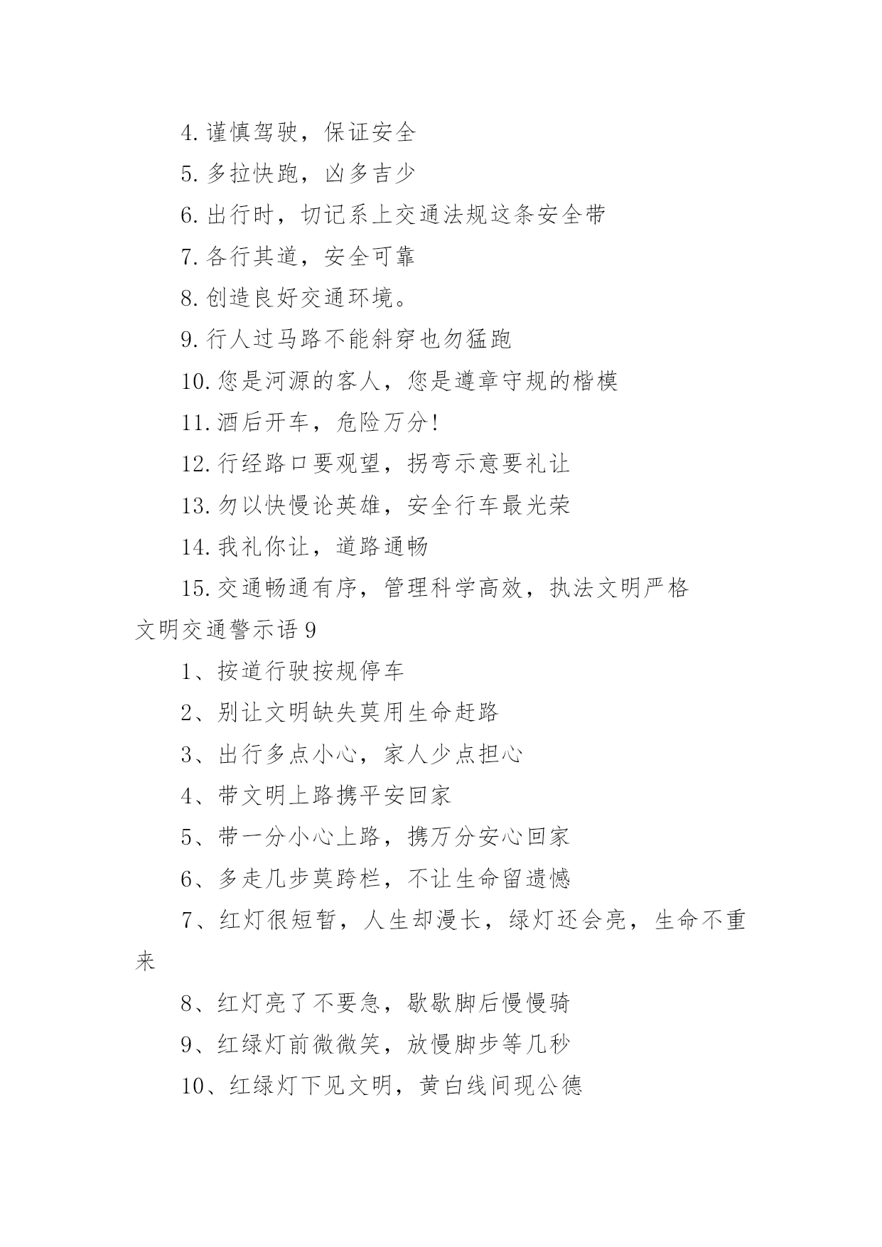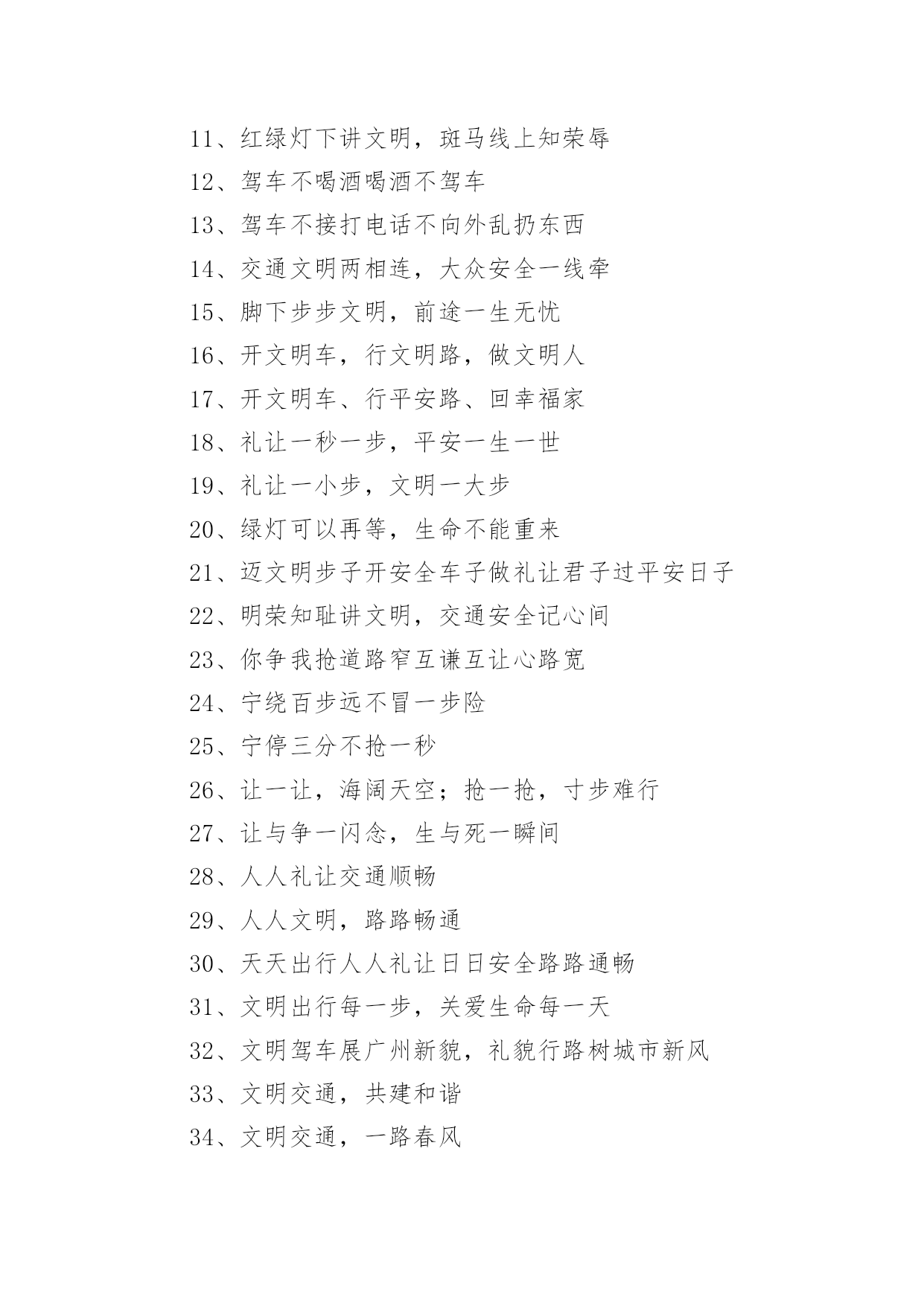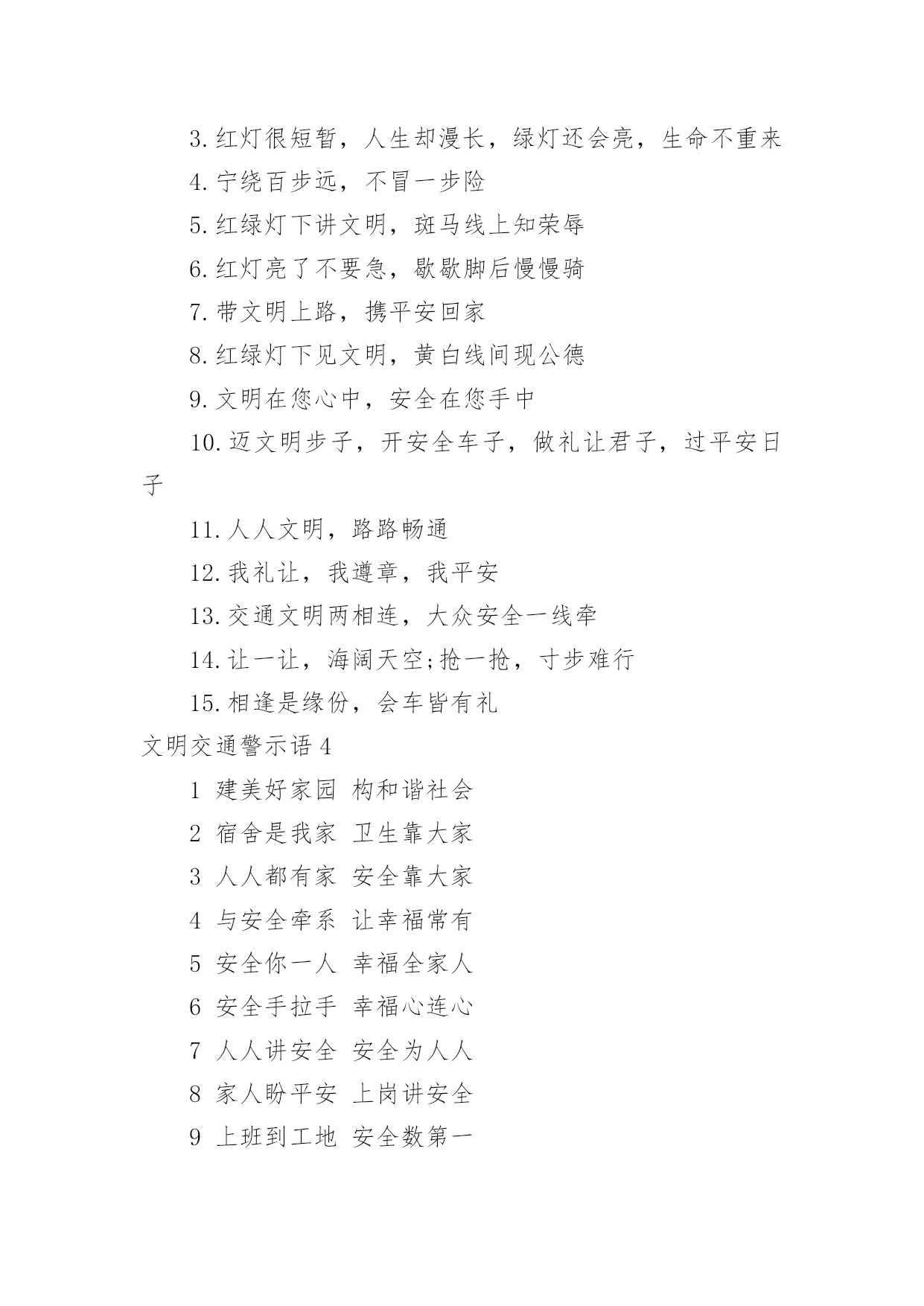 文明交通警示语文明交通警示语(优)在日常学习、工作和生活中,大家没少看到过警示语吧,警示语就是告诉或提醒人们什么该做什么不该做的话语。写起警示语来就毫无头绪?以下是小编整理的文明交通警示语,欢迎阅读与收藏。文明交通警示语11.骑好车走好路安全伴您每一步2.遵守交通信号,遵守交通标志,遵守交通标线3.树立文明意识,搞好交通秩序4.违规是交通事故的祸根,侥幸是交通事故的.隐患5.良药苦口利于病,交通规则利于行6.路好车好安全最好,慢行快行平安才行7.讲究交通公德,遵守交通法规8.车铃车闸齐全,维系您的安全9.遵守交规得平安,道路畅通保安全10.骑车抢行一秒,危险增加十分11.交通安全抛脑后,交通事故在前头12.您保持车况良好,车容整洁13.交通安全在我心中!14.加强综合治理,保障交通安全15.学龄前儿童上街要有成年人带领文明交通警示语21高高兴兴上班平平安安回家2构建和谐社会共建美好家园3同筑安全环境共创美好生活4相约文明工地享受平安人生5劳动创造财富安全带来幸福6树立企业形象铸造精品工程7心系安全一点拥有蓝天一片8生命至高无上安全责任为天9安全警钟长鸣生命之事常有10手牵手创平安心连心谱未来11同创安全工地共享美好生活12安全就是效益平安就是幸福13同在一个工地共享平安生活14驾驶幸福人生演绎安全真情15安全未于防范事故未于麻痹16时时注意安全岁岁平安快乐17时时注意安全处处预防事故18今日注意安全节日合家快乐19放松一时安全悔恨人生一世20日日安全施工天天平安收工文明交通警示语31.文明交通,共建和谐2.明荣知耻讲文明,交通安全记心间3.红灯很短暂,人生却漫长,绿灯还会亮,生命不重来4.宁绕百步远,不冒一步险5.红绿灯下讲文明,斑马线上知荣辱6.红灯亮了不要急,歇歇脚后慢慢骑7.带文明上路,携平安回家8.红绿灯下见文明,黄白线间现公德9.文明在您心中,安全在您手中10.迈文明步子,开安全车子,做礼让君子,过平安日子11.人人文明,路路畅通12.我礼让,我遵章,我平安13.交通文明两相连,大众安全一线牵14.让一让,海阔天空;抢一抢,寸步难行15.相逢是缘份,会车皆有礼文明交通警示语41建美好家园构和谐社会2宿舍是我家卫生靠大家3人人都有家安全靠大家4与安全牵系让幸福常有5安全你一人幸福全家人6安全手拉手幸福心连心7人人讲安全安全为人人8家人盼平安上岗讲安全9上班到工地安全数第一10生命诚可贵安全记心中11工作不分心安全值千金12打工千日苦事事开头难13安全送人情于要人命14宁绕百步远不昌一步险15事故不留情安全安先行文明交通警示语51.穿马路,跨护栏,少公德,多危险2.上有老,下有小,出了交通事故不得了3.宣传交通法规,提高交通文明意识4.最大的浪费是事故,最大的节约是安全5.行横道是您横过马路的`安全带!6.人行道车莫占,车行道人莫钻7.三躲不如一停8.维护良好乘车秩序,争做申城文明乘客9.开车多一份小心,家人多十分安心10.见了违章严批评,道是无情却有情11.不超速不抢行,中速行驶保安宁12.交通安全系万家,平平安安是幸福13.交通肇事祸及自身危及他人14.弯道莫停车,停车危险多15.交通事故不长眼,你凶他就险叫响一个口号,达到三个遵守16.“让”出平安,“抢”出祸端17.交通法规在心中,交通安全在手中18.人行横道车让人,各种车道人让车19.祝您一路平安!20.要遵守交规,不要乱行乱停文明交通警示语61、道路通行见形象,红绿灯前看修养。2、道路因行驶而通畅,生活因出入平安而。3、千里之行,慎于足下。4、,步步小心。5、安全在你脚下,在你手中。6、安全与守法同在,事故与违法相随。7、增强交通安全意识,提高自我保护能力。8、横穿马路:一看、二等、三通过。9、一停二看三通过,麻痹大意是灾祸。10、逞一时之勇,得一世之悔。11、宁绕百步远,不抢一步险。12、严是爱、松是害,出了事故坑后代。13、一丝不苟保安全,半分疏忽生祸端。14、心头常亮红绿灯,安全行驶伴人生。15、小小黄帽每天戴,出行安全总常在。16、红灯短暂,生命无限。17、交通法规须记牢,珍爱生命最重要。18、孩童路边走,要牵手。19、一人安危系全,全家幸福系一人。20、上学放学过马路,交通法规要记住;先戴安全小黄帽,再把大拇指儿翘。文明交通警示语71、礼让三分平安在,抢行一秒后悔迟。2、安全乘车、安全骑车、安全走路。3、黄灯莫抢红灯停,绿阴干瞎才安全。4、平安出行一小步,和谐城市一大步。5、山清水秀人更美,酒浓茶香法更严。6、好人一生平安,好车一路平安。7、若要亲人勿牵挂,酒后不要把车驾。8、开文明车,行文明路,做文明人。9、文明出行记心上,幸福生活添保障。10、你不抢行我不争道,文明行车和谐有道。11、有关交通安全的警告语,交通安全警示语。12、红灯常在心中亮