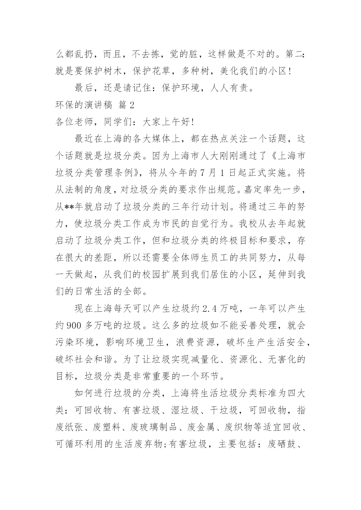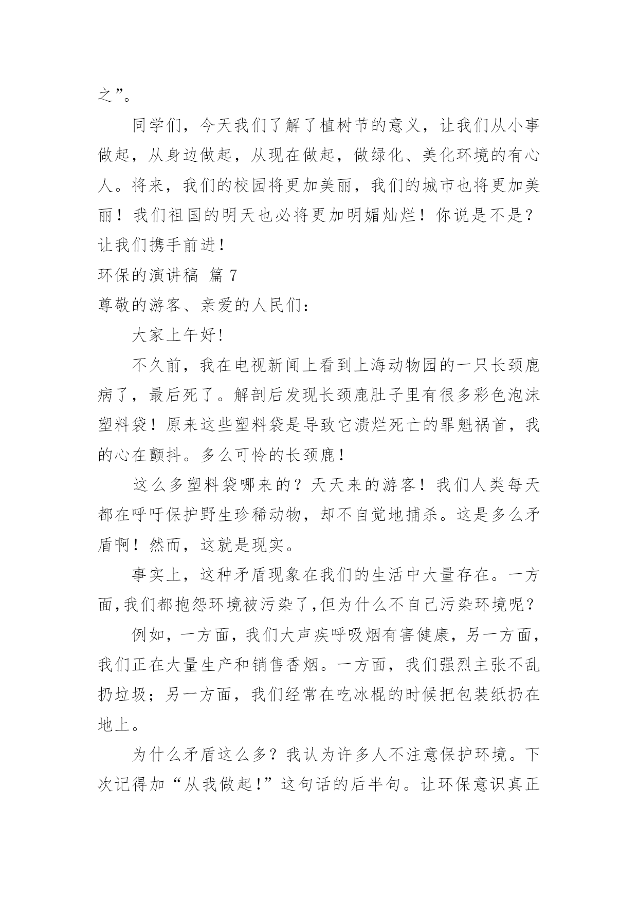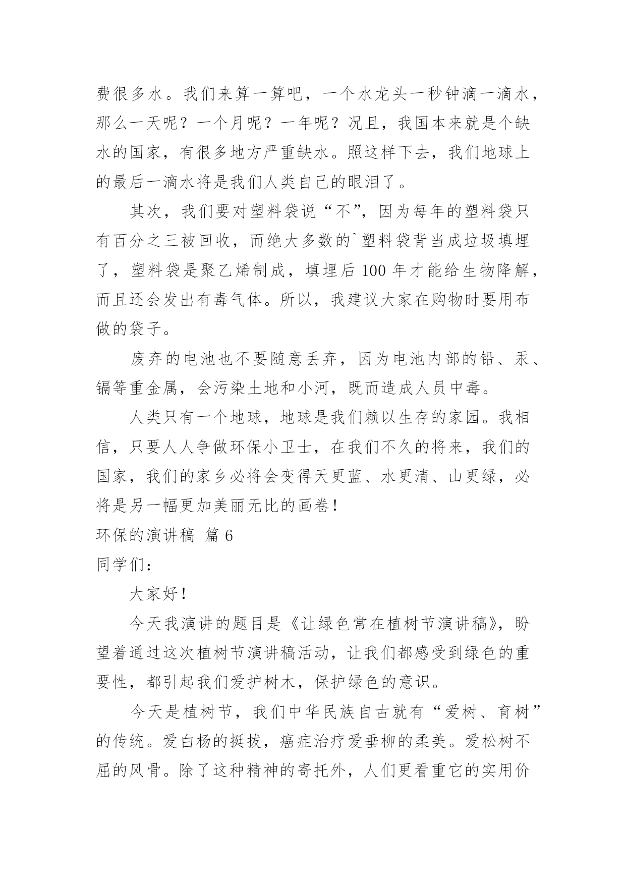 环保的演讲稿关于环保的演讲稿锦集八篇演讲稿在写作上具有一定的格式要求。随着社会一步步向前发展,越来越多人会去使用演讲稿,那么,怎么去写演讲稿呢?下面是小编为大家收集的环保的演讲稿10篇,仅供参考,欢迎大家阅读。环保的演讲稿篇1尊敬的老师们,亲爱的同学们:大家好!今天,在二区大门前的三色垃圾桶里,有两块被我扔掉的废电池静静的在红色箱里“安家”。我原来拿着这两块电池老是去做科学实验,这下可好,电用完了!我仔细的看着电池上的每一句话,啊呀,是电池过期了!我走到三色垃圾桶前,黄色的是“不可回收”的垃圾,蓝色的是“可回收”的垃圾,红色的是“有毒有害”的垃圾,我应该往哪扔呢?对了!我听妈妈说:“电池,是携带方便、人人都爱的东西,可他的坏处大着呢!有些人把电池直接扔在地上,结果,土壤发生变化。人们要是吃了废电池感染的土壤里种的东西,反映会越来越迟钝。最后,我把电池扔进了红色的箱内。因此,我想告诉同学们,现在的世界环境越来越恶化,所以,我们要保护环境。第一:首先要做到不要乱扔垃圾,见到绿地里有垃圾,我们要随手拣起每一个垃圾,不要干什么都乱扔,而且,不去拣,觉的脏,这样做是不对的。第二:就是要保护树木,保护花草,多种树,美化我们的小区!最后,还是请记住:保护环境,人人有责。环保的演讲稿篇2各位老师,同学们:大家上午好!最近在上海的各大媒体上,都在热点关注一个话题,这个话题就是垃圾分类。因为上海市人大刚刚通过了《上海市垃圾分类管理条例》,将从今年的7月1日起正式实施。将从法制的角度,对垃圾分类的要求作出规范。嘉定率先一步,从**年就启动了垃圾分类的三年行动计划。将通过三年的努力,使垃圾分类工作成为市民的自觉行为。我校从去年起就启动了垃圾分类工作,但和垃圾分类的终极目标和要求,存在很大的差距,所以还需要全体师生员工的共同努力,从每一天做起,从我们的校园扩展到我们居住的小区,延伸到我们的日常生活的全部。现在上海每天可以产生垃圾约2.4万吨,一年可以产生约900多万吨的垃圾。这么多的垃圾如不能妥善处理,就会污染环境,影响环境卫生,浪费资源,破坏生产生活安全,破坏社会和谐。为了让垃圾实现减量化、资源化、无害化的目标,垃圾分类是非常重要的一个环节。如何进行垃圾的分类,上海将生活垃圾分类标准为四大类:可回收物、有害垃圾、湿垃圾、干垃圾,可回收物,指废纸张、废塑料、废玻璃制品、废金属、废织物等适宜回收、可循环利用的生活废弃物;有害垃圾,主要包括:废硒鼓、废电池、废荧光灯、废温度计,废血压计,废药品及其包装物,废油漆、溶剂及其包装物,废杀虫剂、消毒剂及其包装物,废胶片及废相纸、还有同学们用的笔芯也是等。湿垃圾即易腐垃圾,指食材废料、剩菜剩饭、过期食品、瓜皮果核、花卉绿植、中药药渣等易腐的生物质生活废弃物。干垃圾,主要包括:污损后不宜回收利用的包装物、餐巾纸、厕纸、尿不湿、竹木和陶瓷碎片等。接下来,我们将扎实地做好垃圾分类工作,将继续开展以下工作:一是充分地进行垃圾分类的宣传和知识的普及,3月底我们进行一次全校性的垃圾分类的知识竞赛;二是清除班级和办公室的多余垃圾筒,将垃圾分类的要求做好分类工作,班级的垃圾分二种干垃圾和可回收垃圾,老师办公室分干垃圾和湿垃圾,其他产生的垃圾分放在各个楼层的厕所里的垃圾箱内。班级产生的干垃圾和可回收垃圾要集中到底楼东面大的垃圾箱内,要按要求分别投放,办公室产生的干垃圾同样投放到东面底楼的大垃圾箱内,湿垃圾投放到各个楼层厕所的垃圾筒内,这些垃圾再由学校的保洁员,把垃圾运到指定的垃圾中转点,按类别摆放,便于垃圾的清运。三是我们尽量要做到垃圾的减量化,少用一次性的用品,比如一次性的餐具等。同学们,老师们,让我们一起行动起来,对照我们签订的垃圾分类承诺书,在学校、在居住小区认真做好垃圾分类工作,为把我们的家乡、我们的校园建设得水更清、天更蓝、环境更优美共同努力。环保的演讲稿篇3尊敬的老师,亲爱的同学们:这么多年来。我国已经受到环境的严重污染,严重的沙尘暴在我国一再发生,严重影响了人们的生活,使我们难以生存。绿草会变成沙漠,大树会永远倒在地上,我们也不会快乐的活着:幸福没了,亲人没了,连我们居住的地球都会消失在茫茫宇宙中。然而,这不仅仅是沙尘暴造成的灾难。此刻,连南极都被污染破坏了。于是,最后一片净土在地球上消失了。泰山曾经是人们观赏的好地方,但也成了保护区。我们只能去袖手旁观,看着这个美丽而脆弱的地球永远消失?从此可以看到风吹草动看牛羊,马在白云下奔跑?虽然我们只是小学生,但还是可以为家乡做点贡献,让定西在期待中崛起。听父亲说塔克拉玛干沙漠边缘有罗布泊,是一片生机勃勃的绿洲。这里空气清新,环境宜人,四周绿树环绕,终年被丛林遮挡,这使得那里的人们重新燃起了对沙漠绿洲生活的期望。但是谁又能理解,这个延续了几百年甚至几千年的圣地,竟然在那里消