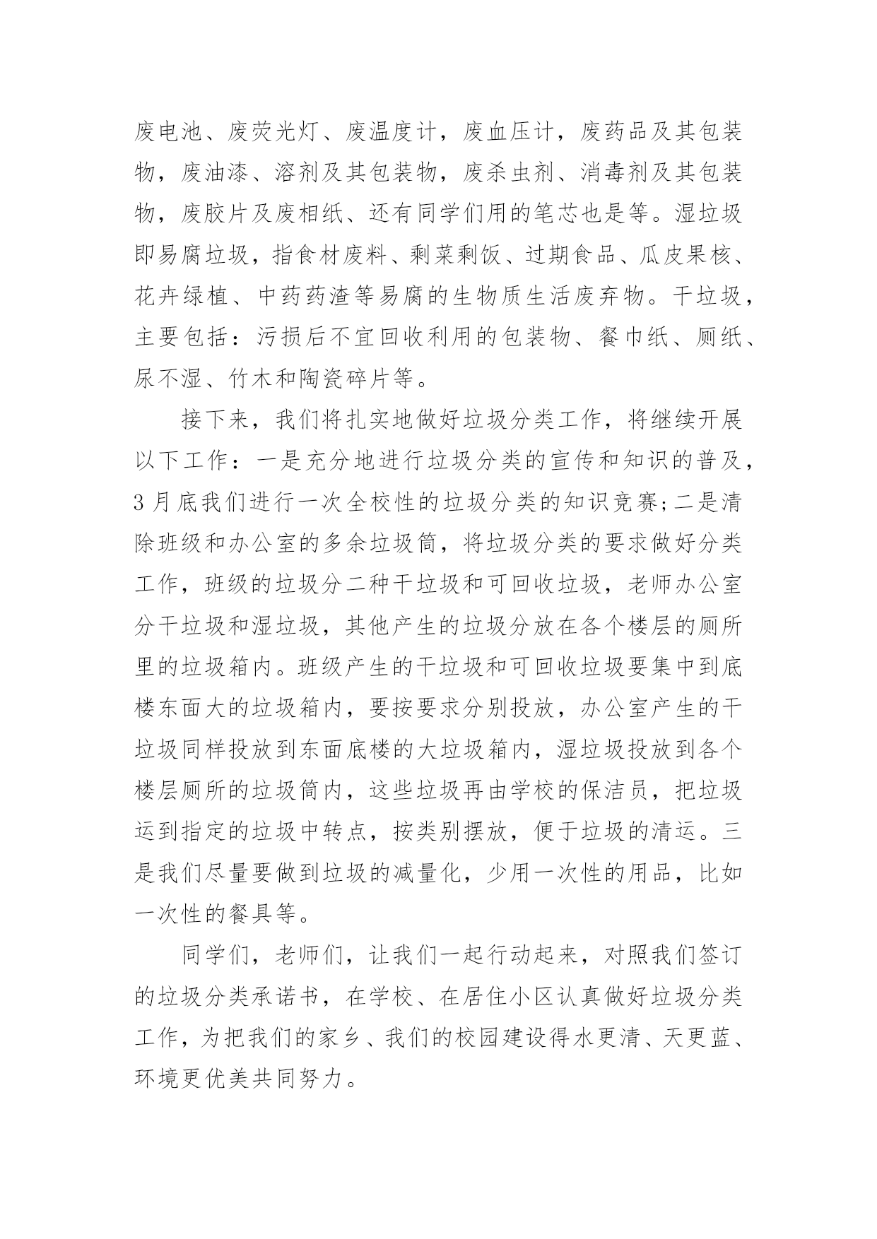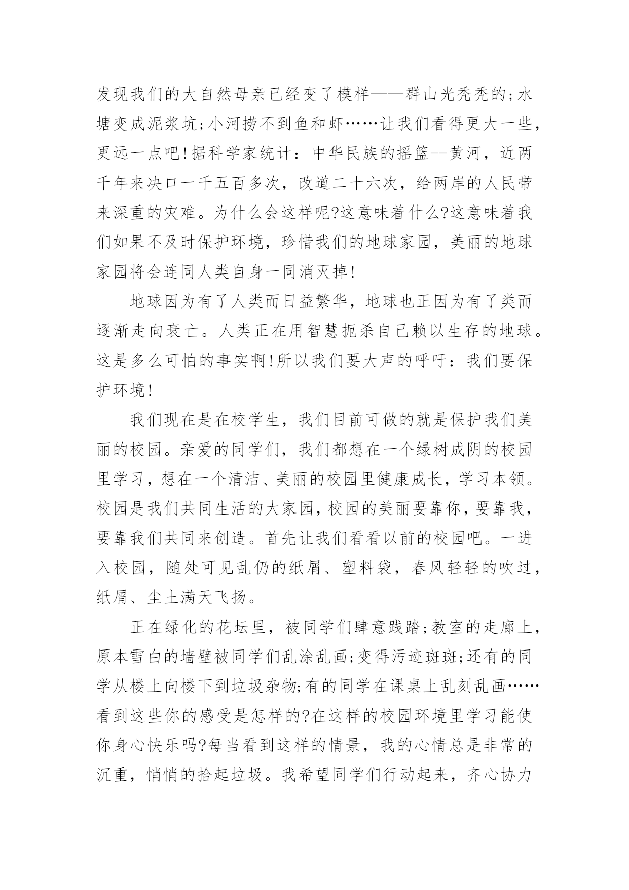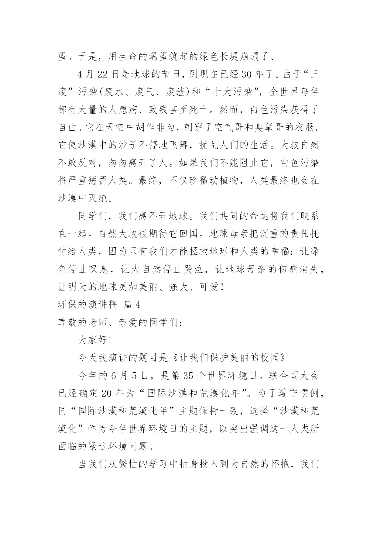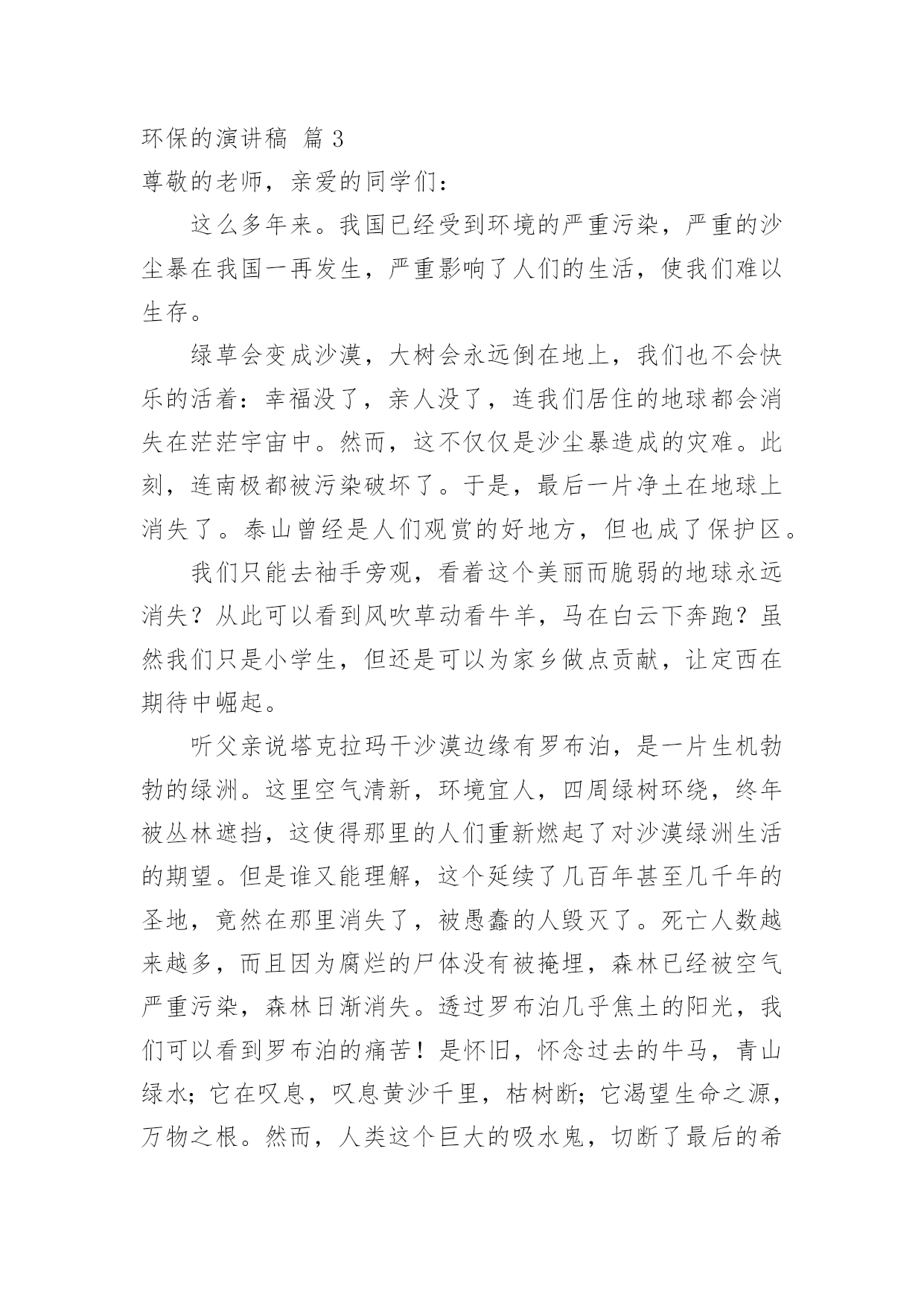 环保的演讲稿关于环保的演讲稿锦集八篇演讲稿在写作上具有一定的格式要求。随着社会一步步向前发展,越来越多人会去使用演讲稿,那么,怎么去写演讲稿呢?下面是小编为大家收集的环保的演讲稿10篇,仅供参考,欢迎大家阅读。环保的演讲稿篇1尊敬的老师们,亲爱的同学们:大家好!今天,在二区大门前的三色垃圾桶里,有两块被我扔掉的废电池静静的在红色箱里“安家”。我原来拿着这两块电池老是去做科学实验,这下可好,电用完了!我仔细的看着电池上的每一句话,啊呀,是电池过期了!我走到三色垃圾桶前,黄色的是“不可回收”的垃圾,蓝色的是“可回收”的垃圾,红色的是“有毒有害”的垃圾,我应该往哪扔呢?对了!我听妈妈说:“电池,是携带方便、人人都爱的东西,可他的坏处大着呢!有些人把电池直接扔在地上,结果,土壤发生变化。人们要是吃了废电池感染的土壤里种的东西,反映会越来越迟钝。最后,我把电池扔进了红色的箱内。因此,我想告诉同学们,现在的世界环境越来越恶化,所以,我们要保护环境。第一:首先要做到不要乱扔垃圾,见到绿地里有垃圾,我们要随手拣起每一个垃圾,不要干什么都乱扔,而且,不去拣,觉的脏,这样做是不对的。第二:就是要保护树木,保护花草,多种树,美化我们的小区!最后,还是请记住:保护环境,人人有责。环保的演讲稿篇2各位老师,同学们:大家上午好!最近在上海的各大媒体上,都在热点关注一个话题,这个话题就是垃圾分类。因为上海市人大刚刚通过了《上海市垃圾分类管理条例》,将从今年的7月1日起正式实施。将从法制的角度,对垃圾分类的要求作出规范。嘉定率先一步,从**年就启动了垃圾分类的三年行动计划。将通过三年的努力,使垃圾分类工作成为市民的自觉行为。我校从去年起就启动了垃圾分类工作,但和垃圾分类的终极目标和要求,存在很大的差距,所以还需要全体师生员工的共同努力,从每一天做起,从我们的校园扩展到我们居住的小区,延伸到我们的日常生活的全部。现在上海每天可以产生垃圾约2.4万吨,一年可以产生约900多万吨的垃圾。这么多的垃圾如不能妥善处理,就会污染环境,影响环境卫生,浪费资源,破坏生产生活安全,破坏社会和谐。为了让垃圾实现减量化、资源化、无害化的目标,垃圾分类是非常重要的一个环节。如何进行垃圾的分类,上海将生活垃圾分类标准为四大类:可回收物、有害垃圾、湿垃圾、干垃圾,可回收物,指废纸张、废塑料、废玻璃制品、废金属、废织物等适宜回收、可循环利用的生活废弃物;有害垃圾,主要包括:废硒鼓、废电池、废荧光灯、废温度计,废血压计,废药品及其包装物,废油漆、溶剂及其包装物,废杀虫剂、消毒剂及其包装物,废胶片及废相纸、还有同学们用的笔芯也是等。湿垃圾即易腐垃圾,指食材废料、剩菜剩饭、过期食品、瓜皮果核、花卉绿植、中药药渣等易腐的生物质生活废弃物。干垃圾,主要包括:污损后不宜回收利用的包装物、餐巾纸、厕纸、尿不湿、竹木和陶瓷碎片等。接下来,我们将扎实地做好垃圾分类工作,将继续开展以下工作:一是充分地进行垃圾分类的宣传和知识的普及,3月底我们进行一次全校性的垃圾分类的知识竞赛;二是清除班级和办公室的多余垃圾筒,将垃圾分类的要求做好分类工作,班级的垃圾分二种干垃圾和可回收垃圾,老师办公室分干垃圾和湿垃圾,其他产生的垃圾分放在各个楼层的厕所里的垃圾箱内。班级产生的干垃圾和可回收垃圾要集中到底楼东面大的垃圾箱内,要按要求分别投放,办公室产生的干垃圾同样投放到东面底楼的大垃圾箱内,湿垃圾投放到各个楼层厕所的垃圾筒内,这些垃圾再由学校的保洁员,把垃圾运到指定的垃圾中转点,按类别摆放,便于垃圾的清运。三是我们尽量要做到垃圾的减量化,少用一次性的用品,比如一次性的餐具等。同学们,老师们,让我们一起行动起来,对照我们签订的垃圾分类承诺书,在学校、在居住小区认真做好垃圾分类工作,为把我们的家乡、我们的校园建设得水更清、天更蓝、环境更优美共同努力。环保的演讲稿篇3尊敬的老师,亲爱的同学们:这么多年来。我国已经受到环境的严重污染,严重的沙尘暴在我国一再发生,严重影响了人们的生活,使我们难以生存。绿草会变成沙漠,大树会永远倒在地上,我们也不会快乐的活着:幸福没了,亲人没了,连我们居住的地球都会消失在茫茫宇宙中。然而,这不仅仅是沙尘暴造成的灾难。此刻,连南极都被污染破坏了。于是,最后一片净土在地球上消失了。泰山曾经是人们观赏的好地方,但也成了保护区。我们只能去袖手旁观,看着这个美丽而脆弱的地球永远消失?从此可以看到风吹草动看牛羊,马在白云下奔跑?虽然我们只是小学生,但还是可以为家乡做点贡献,让定西在期待中崛起。听父亲说塔克拉玛干沙漠边缘有罗布泊,是一片生机勃勃的绿洲。这里空气清新,环境宜人,四周绿树环绕,终年被丛林遮挡,这使得那里的人们重新燃起了对沙漠绿洲生活的期望。但是谁又能理解,这个延续了几百年甚至几千年的圣地,竟然在那里消