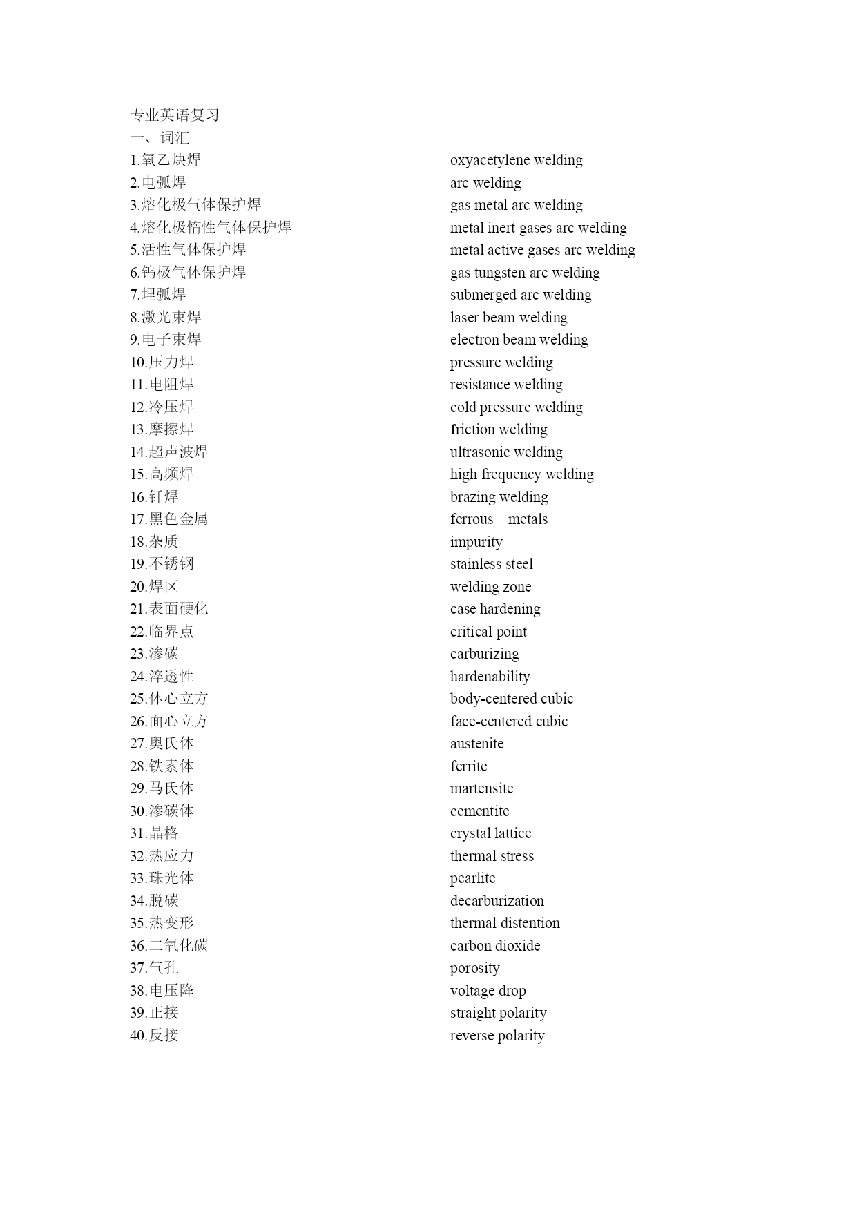 专业英语复习词汇1.氧乙炔焊oxyacetylenewelding2.电弧焊arcwelding3.熔化极气体保护焊gasmetalarcwelding4.熔化极惰性气体保护焊metalinertgasesarcwelding5.活性气体保护焊metalactivegasesarcwelding6.钨极气体保护焊gastungstenarcwelding7.埋弧焊submergedarcwelding8.激光束焊laserbeamwelding9.电子束焊electronbeamwelding10.压力焊pressurewelding11.电阻焊resistancewelding12.冷压焊coldpressurewelding13.摩擦焊frictionwelding14.超声波焊ultrasonicwelding15.高频焊highfrequencywelding16.钎焊brazingwelding17.黑色金属ferrousmetals18.杂质impurity19.不锈钢stainlesssteel20.焊区weldingzone21.表面硬化casehardening22.临界点criticalpoint23.渗碳carburizing24.淬透性hardenability25.体心立方body-centeredcubic26.面心立方face-centeredcubic27.奥氏体austenite28.铁素体ferrite29.马氏体martensite30.渗碳体cementite31.晶格crystallattice32.热应力thermalstress33.珠光体pearlite34.脱碳decarburization35.热变形thermaldistention36.二氧化碳carbondioxide37.气孔porosity38.电压降voltagedrop39.正接straightpolarity40.反接reversepolarity名词解释1.Welding:Weldingisthejoiningofmetalsandplasticsbymethodsthatdonotemployfasteningdevices.2.Ferrousmetals:Ferrousmetalsaremetalswhichcontainiron.3.Nonferrousmetals:Nonferrousmetalsaremetalswhichdonotcontainiron.However,somenonferrousmetalsmaycontainasmallamountofironasanimpurity.4.Manualwelding:Manualweldingisunderstoodbethatinwhichtheweldingvariablesarecontinuouslycontrolledbytheoperatorandmeansforweldingheldintheoperator’shand.5.Steel:Steelisanalloycontainingchieflyiron,carbon,andcertainotherelementsinvaryingamounts.6.Low-carbonsteel:Low-carbonsteeloftencalledsoftormildsteel,contains0.04to0.30percentcarbon.7.Heat-treatment:Heat-treatmentisatermappliedtoavarietyofproceduresforchangingthecharacteristicsofmetalbyheatingandcooling.8.Hardening:Hardeningisaprocessofheatingandcoolingsteeltoincreaseitshardnessandtensilestrength,toreduceitsductility,andtoobtainafinegrainstructure.9.Tempering:Temperingisaprocessofreducingthedegreeofhardnessandstrengthandincreasingthetoughness.10.Annealing:Annealingistheprocessofsofteningsteeltorelieveinternalstrain.11.Stressrelieving:Stressrelievingisame