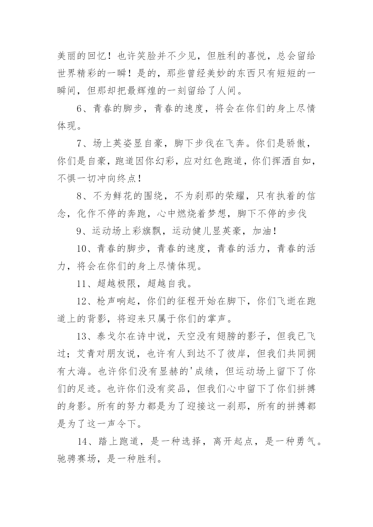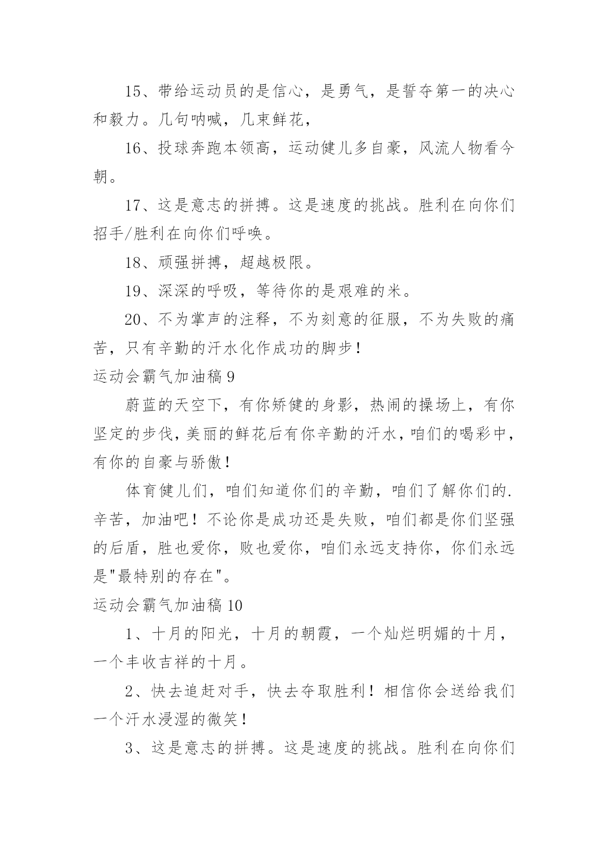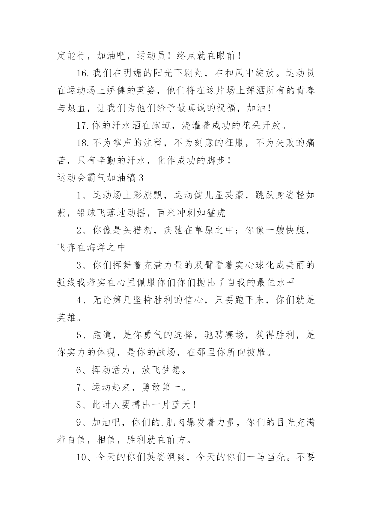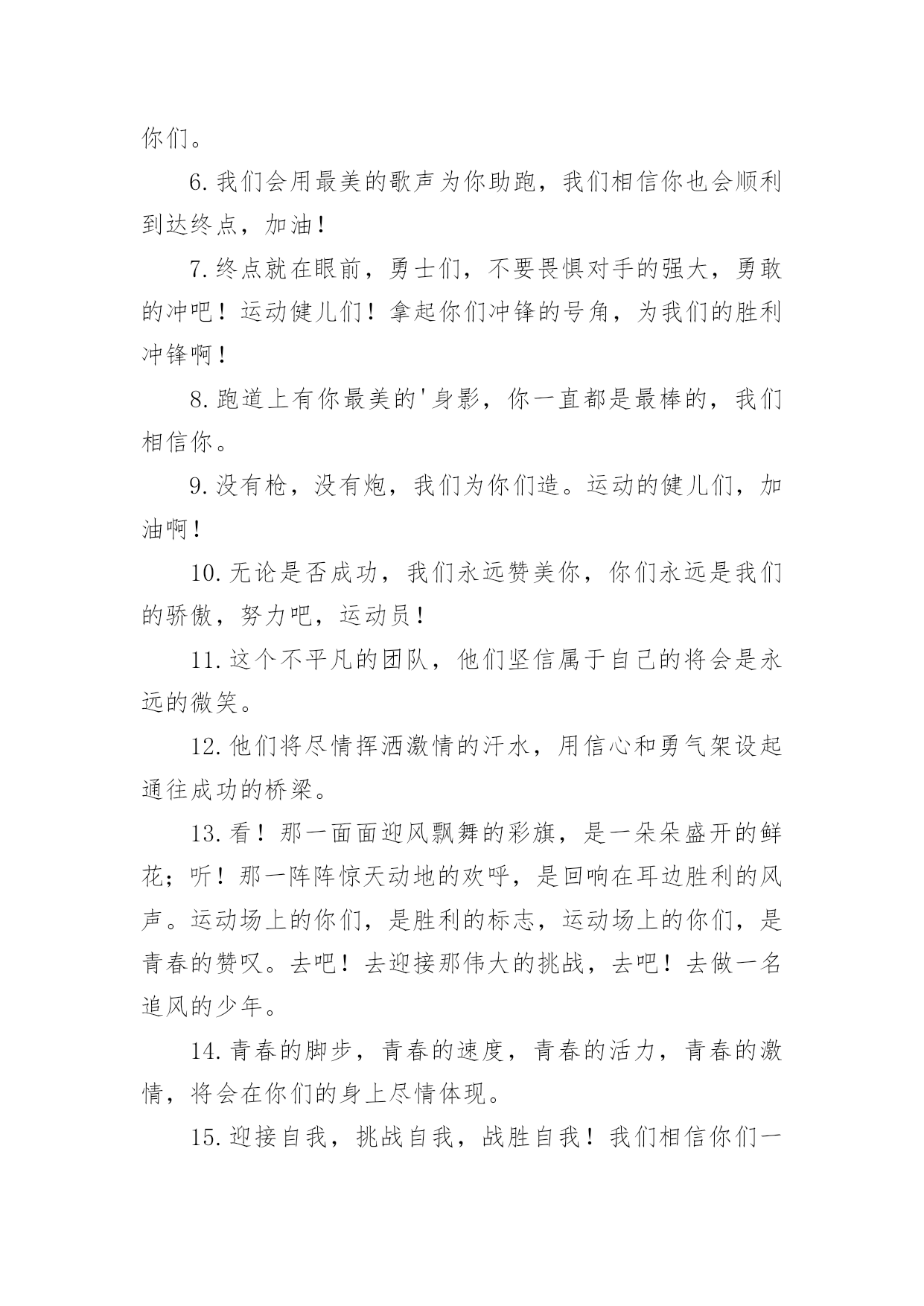 运动会霸气加油稿运动会霸气加油稿在学习、工作生活中,我们都跟加油稿有着直接或间接的联系,借助加油稿可以给对方传达鼓励。还是对加油稿一筹莫展吗?下面是小编收集整理的运动会霸气加油稿,仅供参考,希望能够帮助到大家。运动会霸气加油稿1冰冷的接力棒,被你们的手心暖热,被你们的激情点燃,这不仅是速度的考验,也是耐力的`竞争,每一次的接力都牵动人心,每一次的传递都伴随着我们的欢呼。默契的配合,紧密的团结,是取胜的关键。我们用力加油,把心中的希望和热情传递给你们,__的运动健儿们,我们与你们同在,冲刺吧,拼搏吧,你们是我们的骄傲。运动会霸气加油稿21.有多少次挥汗如雨,伤痛曾添满记忆,只因为始终相信,去拼搏才能胜利。2.奔跑吧,运动健儿,今天你们是最美的风景,我们爱你!加油!3.胜利就在前方,运动的健儿们,向前冲啊!4.看,终点就在眼前,听,同学为你呼喊。鼓起勇气奋力向前,用你的荣誉带给我们希望。5.加油吧,掌声为你们响起,加油吧,胜利和鲜花属于你们。6.我们会用最美的歌声为你助跑,我们相信你也会顺利到达终点,加油!7.终点就在眼前,勇士们,不要畏惧对手的强大,勇敢的冲吧!运动健儿们!拿起你们冲锋的号角,为我们的胜利冲锋啊!8.跑道上有你最美的'身影,你一直都是最棒的,我们相信你。9.没有枪,没有炮,我们为你们造。运动的健儿们,加油啊!10.无论是否成功,我们永远赞美你,你们永远是我们的骄傲,努力吧,运动员!11.这个不平凡的团队,他们坚信属于自己的将会是永远的微笑。12.他们将尽情挥洒激情的汗水,用信心和勇气架设起通往成功的桥梁。13.看!那一面面迎风飘舞的彩旗,是一朵朵盛开的鲜花;听!那一阵阵惊天动地的欢呼,是回响在耳边胜利的风声。运动场上的你们,是胜利的标志,运动场上的你们,是青春的赞叹。去吧!去迎接那伟大的挑战,去吧!去做一名追风的少年。14.青春的脚步,青春的速度,青春的活力,青春的激情,将会在你们的身上尽情体现。15.迎接自我,挑战自我,战胜自我!我们相信你们一定能行,加油吧,运动员!终点就在眼前!16.我们在明媚的阳光下翱翔,在和风中绽放。运动员在运动场上矫健的英姿,他们将在这片场上挥洒所有的青春与热血,让我们为他们给予最真诚的祝福,加油!17.你的汗水洒在跑道,浇灌着成功的花朵开放。18.不为掌声的注释,不为刻意的征服,不为失败的痛苦,只有辛勤的汗水,化作成功的脚步!运动会霸气加油稿31、运动场上彩旗飘,运动健儿显英豪,跳跃身姿轻如燕,铅球飞落地动摇,百米冲刺如猛虎2、你像是头猎豹,疾驰在草原之中;你像一艘快艇,飞奔在海洋之中3、你们挥舞着充满力量的双臂看着实心球化成美丽的弧线我着实在心里佩服你们你们抛出了自我的最佳水平4、无论第几坚持胜利的信心,只要跑下来,你们就是英雄。5、跑道,是你勇气的选择,驰骋赛场,获得胜利,是你实力的体现,是你的战场,在那里你所向披靡。6、挥动活力,放飞梦想。7、运动起来,勇敢第一。8、此时人要搏出一片蓝天!9、加油吧,你们的.肌肉爆发着力量,你们的目光充满着自信,相信,胜利就在前方。10、今天的你们英姿飒爽,今天的你们一马当先。不要放弃,不要气馁。相信自己,你是最棒的!你永远都是我们心中的体育健儿!加油!11、困难和胜利都在向你招手,去呀,快去呀,不要犹豫。12、人类需要体育,然而世界向往和和平!13、超越自我,此时秀出风采!14、时间在流逝,赛道在延伸,成功在你面前展现心脏的跳动,热血在沸腾,辉煌在你脚下铸就加油吧,健儿们15、让今天的成功谱写新的未来16、不为鲜花的围绕,不为刹那的荣耀,只有执着的信念,化作不停的奔跑,心中燃烧着梦想,脚下不停的步伐!17、坚定,执着,耐力与希望,在延伸的白色跑道中点点凝聚!力量,信念,拼搏与奋斗,在遥远的终点线上渐渐明亮!时代的强音正在你的脚下踏响。18、跑道,是你勇气的选择,驰骋赛场,获得胜利,是你实力的体现,是你的战场,在这里你所向披靡。19、发扬体育精神,此时提高师生素质!20、团结拼搏,永创辉煌。运动会霸气加油稿4你是运动场的心脏,跳动梦想;你是漫长路的精神,激励辉煌;你们是将上下求索的人!风为你加油,云为你助兴,坚定,执着,耐力与希望,在延伸的白色跑道中点点凝聚!力量,信念,拼搏与奋斗,在遥远的'终点线上渐渐明亮!时代的强音正在你的脚下踏响。运动会霸气加油稿5拼搏的永远是勇者,成功也永远属于勇于拼搏的.强者。接力棒传递的是一种精神,一种力量,更传递一种无畏、所向披靡的意志。每个健儿们都在拼,拼体力,拼意志。把自己青春活力尽情挥洒在长长短短的跑道上。拼搏吧,健儿们,用我们的精神去书写我们的青春风貌去展现我们的青春!为生命喝彩运动会霸气加油稿6奔跑、跳远、投掷、跨越,是谁的从前。喜欢在赛场上你胜利微笑的`画面。经过海格里斯身边,我以神的名义许愿,欢