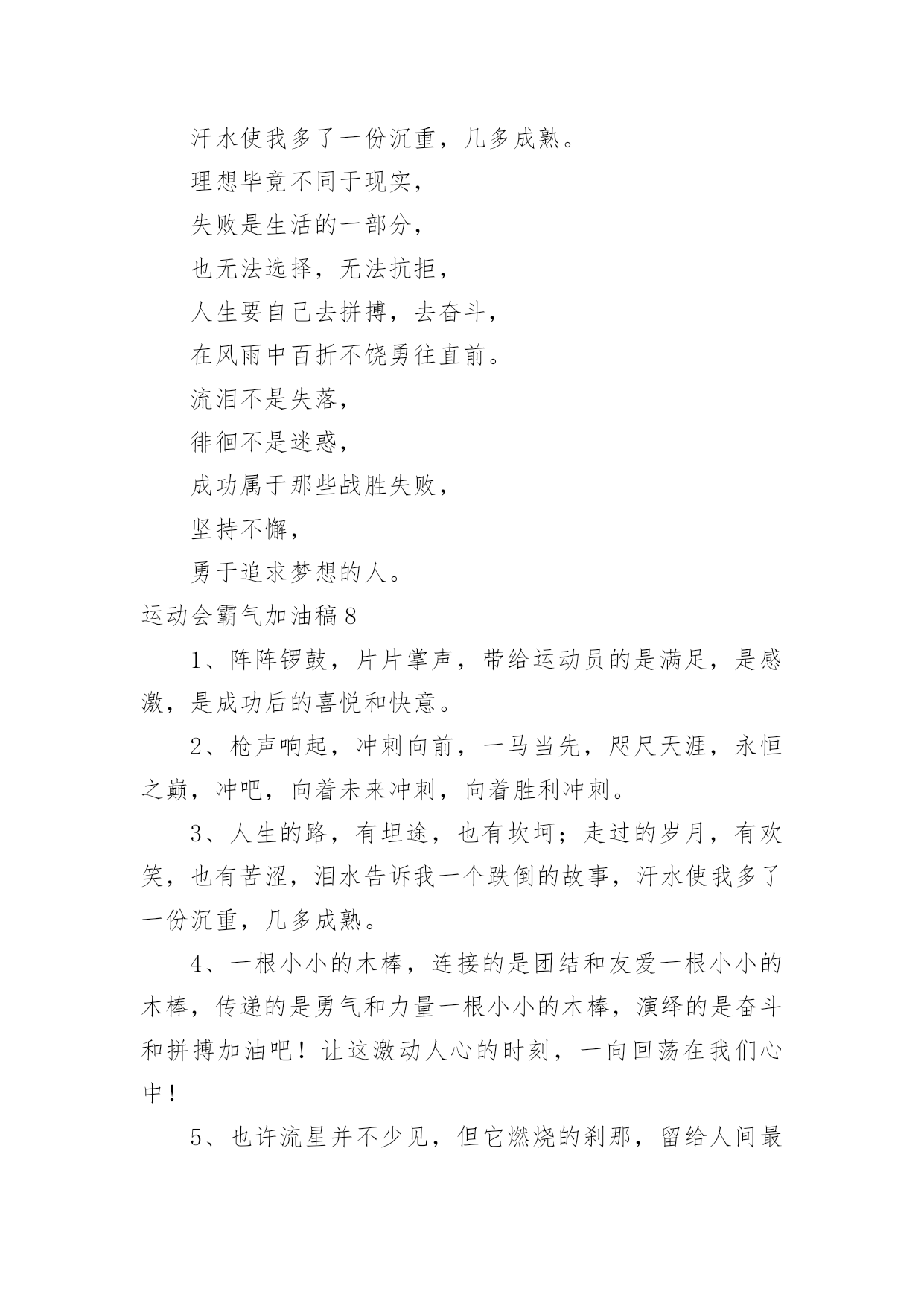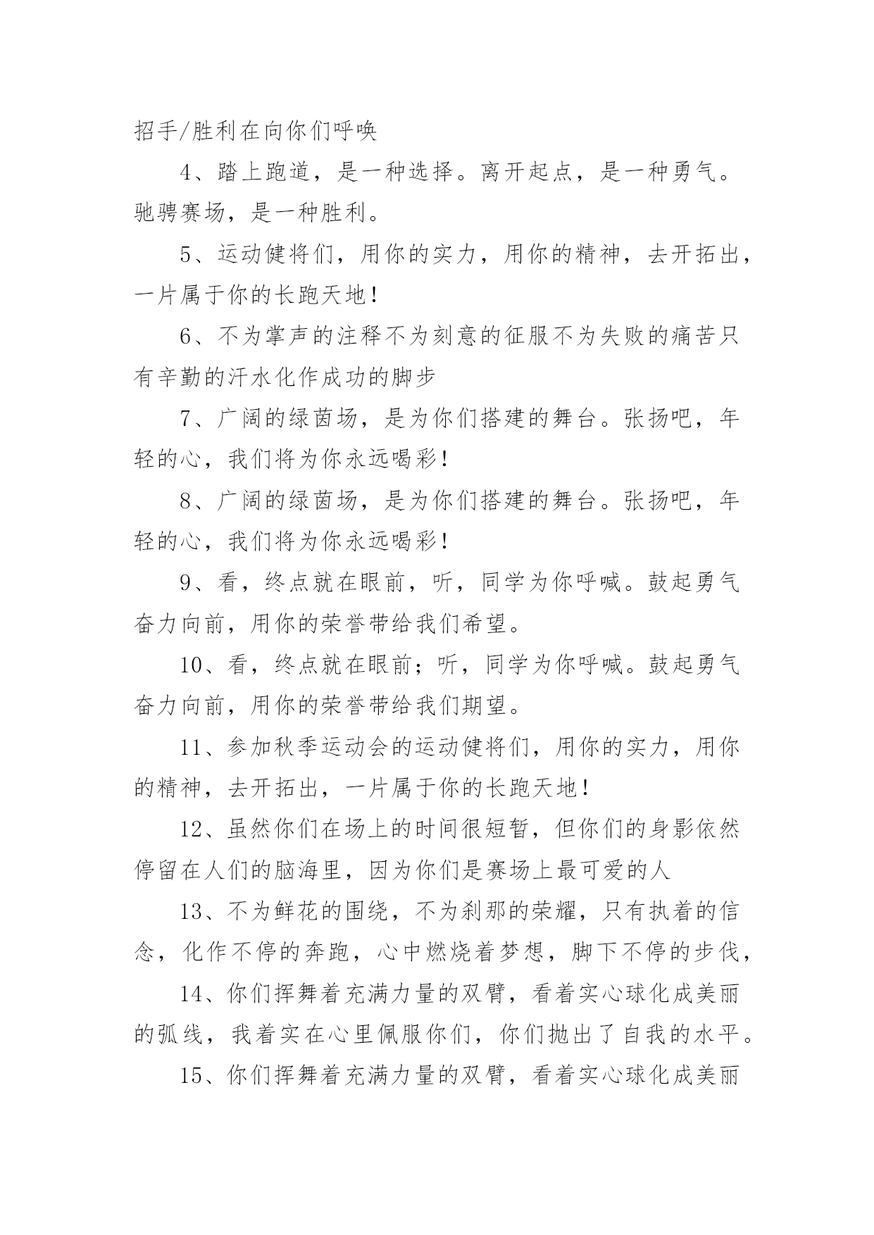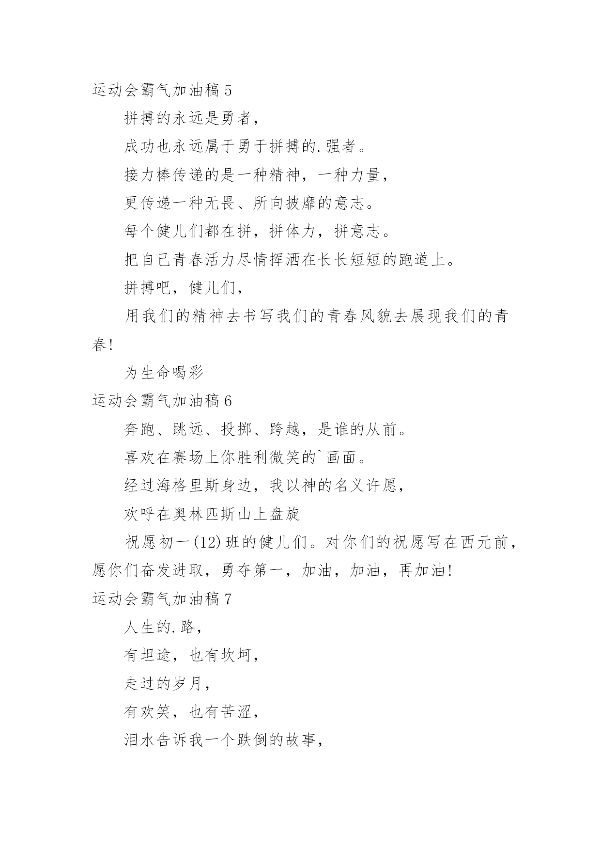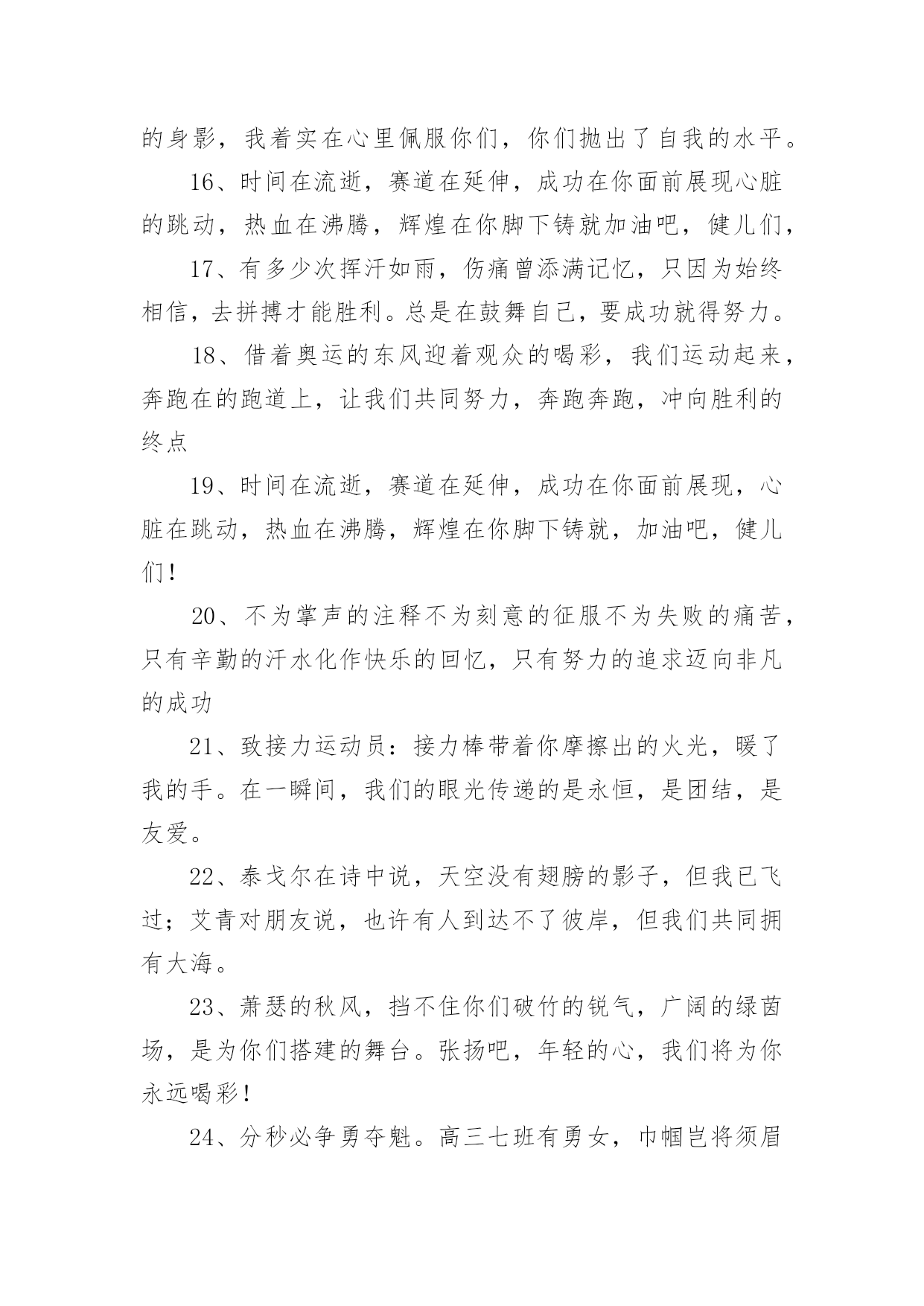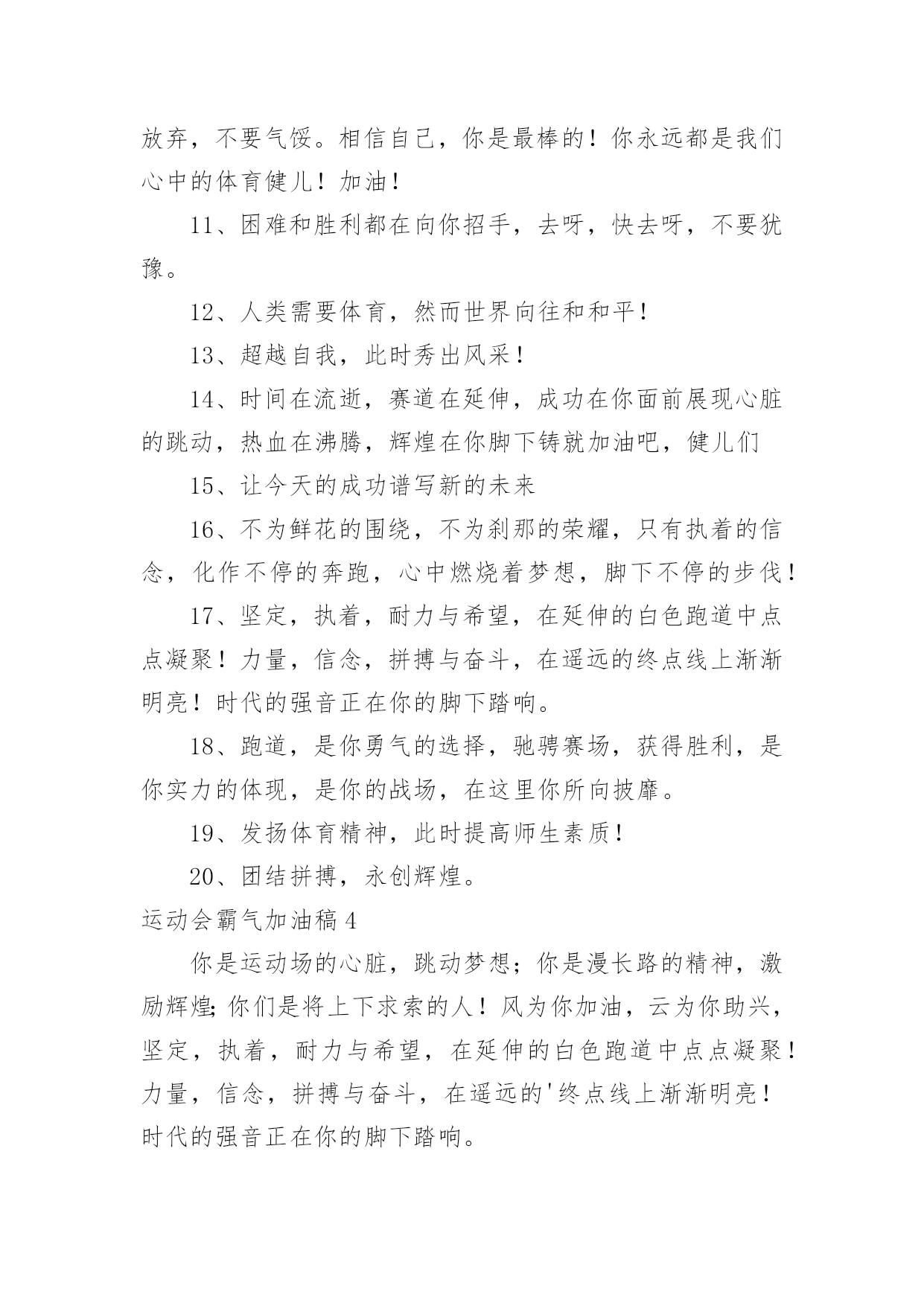 运动会霸气加油稿运动会霸气加油稿在学习、工作生活中,我们都跟加油稿有着直接或间接的联系,借助加油稿可以给对方传达鼓励。还是对加油稿一筹莫展吗?下面是小编收集整理的运动会霸气加油稿,仅供参考,希望能够帮助到大家。运动会霸气加油稿1冰冷的接力棒,被你们的手心暖热,被你们的激情点燃,这不仅是速度的考验,也是耐力的`竞争,每一次的接力都牵动人心,每一次的传递都伴随着我们的欢呼。默契的配合,紧密的团结,是取胜的关键。我们用力加油,把心中的希望和热情传递给你们,__的运动健儿们,我们与你们同在,冲刺吧,拼搏吧,你们是我们的骄傲。运动会霸气加油稿21.有多少次挥汗如雨,伤痛曾添满记忆,只因为始终相信,去拼搏才能胜利。2.奔跑吧,运动健儿,今天你们是最美的风景,我们爱你!加油!3.胜利就在前方,运动的健儿们,向前冲啊!4.看,终点就在眼前,听,同学为你呼喊。鼓起勇气奋力向前,用你的荣誉带给我们希望。5.加油吧,掌声为你们响起,加油吧,胜利和鲜花属于你们。6.我们会用最美的歌声为你助跑,我们相信你也会顺利到达终点,加油!7.终点就在眼前,勇士们,不要畏惧对手的强大,勇敢的冲吧!运动健儿们!拿起你们冲锋的号角,为我们的胜利冲锋啊!8.跑道上有你最美的'身影,你一直都是最棒的,我们相信你。9.没有枪,没有炮,我们为你们造。运动的健儿们,加油啊!10.无论是否成功,我们永远赞美你,你们永远是我们的骄傲,努力吧,运动员!11.这个不平凡的团队,他们坚信属于自己的将会是永远的微笑。12.他们将尽情挥洒激情的汗水,用信心和勇气架设起通往成功的桥梁。13.看!那一面面迎风飘舞的彩旗,是一朵朵盛开的鲜花;听!那一阵阵惊天动地的欢呼,是回响在耳边胜利的风声。运动场上的你们,是胜利的标志,运动场上的你们,是青春的赞叹。去吧!去迎接那伟大的挑战,去吧!去做一名追风的少年。14.青春的脚步,青春的速度,青春的活力,青春的激情,将会在你们的身上尽情体现。15.迎接自我,挑战自我,战胜自我!我们相信你们一定能行,加油吧,运动员!终点就在眼前!16.我们在明媚的阳光下翱翔,在和风中绽放。运动员在运动场上矫健的英姿,他们将在这片场上挥洒所有的青春与热血,让我们为他们给予最真诚的祝福,加油!17.你的汗水洒在跑道,浇灌着成功的花朵开放。18.不为掌声的注释,不为刻意的征服,不为失败的痛苦,只有辛勤的汗水,化作成功的脚步!运动会霸气加油稿31、运动场上彩旗飘,运动健儿显英豪,跳跃身姿轻如燕,铅球飞落地动摇,百米冲刺如猛虎2、你像是头猎豹,疾驰在草原之中;你像一艘快艇,飞奔在海洋之中3、你们挥舞着充满力量的双臂看着实心球化成美丽的弧线我着实在心里佩服你们你们抛出了自我的最佳水平4、无论第几坚持胜利的信心,只要跑下来,你们就是英雄。5、跑道,是你勇气的选择,驰骋赛场,获得胜利,是你实力的体现,是你的战场,在那里你所向披靡。6、挥动活力,放飞梦想。7、运动起来,勇敢第一。8、此时人要搏出一片蓝天!9、加油吧,你们的.肌肉爆发着力量,你们的目光充满着自信,相信,胜利就在前方。10、今天的你们英姿飒爽,今天的你们一马当先。不要放弃,不要气馁。相信自己,你是最棒的!你永远都是我们心中的体育健儿!加油!11、困难和胜利都在向你招手,去呀,快去呀,不要犹豫。12、人类需要体育,然而世界向往和和平!13、超越自我,此时秀出风采!14、时间在流逝,赛道在延伸,成功在你面前展现心脏的跳动,热血在沸腾,辉煌在你脚下铸就加油吧,健儿们15、让今天的成功谱写新的未来16、不为鲜花的围绕,不为刹那的荣耀,只有执着的信念,化作不停的奔跑,心中燃烧着梦想,脚下不停的步伐!17、坚定,执着,耐力与希望,在延伸的白色跑道中点点凝聚!力量,信念,拼搏与奋斗,在遥远的终点线上渐渐明亮!时代的强音正在你的脚下踏响。18、跑道,是你勇气的选择,驰骋赛场,获得胜利,是你实力的体现,是你的战场,在这里你所向披靡。19、发扬体育精神,此时提高师生素质!20、团结拼搏,永创辉煌。运动会霸气加油稿4你是运动场的心脏,跳动梦想;你是漫长路的精神,激励辉煌;你们是将上下求索的人!风为你加油,云为你助兴,坚定,执着,耐力与希望,在延伸的白色跑道中点点凝聚!力量,信念,拼搏与奋斗,在遥远的'终点线上渐渐明亮!时代的强音正在你的脚下踏响。运动会霸气加油稿5拼搏的永远是勇者,成功也永远属于勇于拼搏的.强者。接力棒传递的是一种精神,一种力量,更传递一种无畏、所向披靡的意志。每个健儿们都在拼,拼体力,拼意志。把自己青春活力尽情挥洒在长长短短的跑道上。拼搏吧,健儿们,用我们的精神去书写我们的青春风貌去展现我们的青春!为生命喝彩运动会霸气加油稿6奔跑、跳远、投掷、跨越,是谁的从前。喜欢在赛场上你胜利微笑的`画面。经过海格里斯身边,我以神的名义许愿,欢