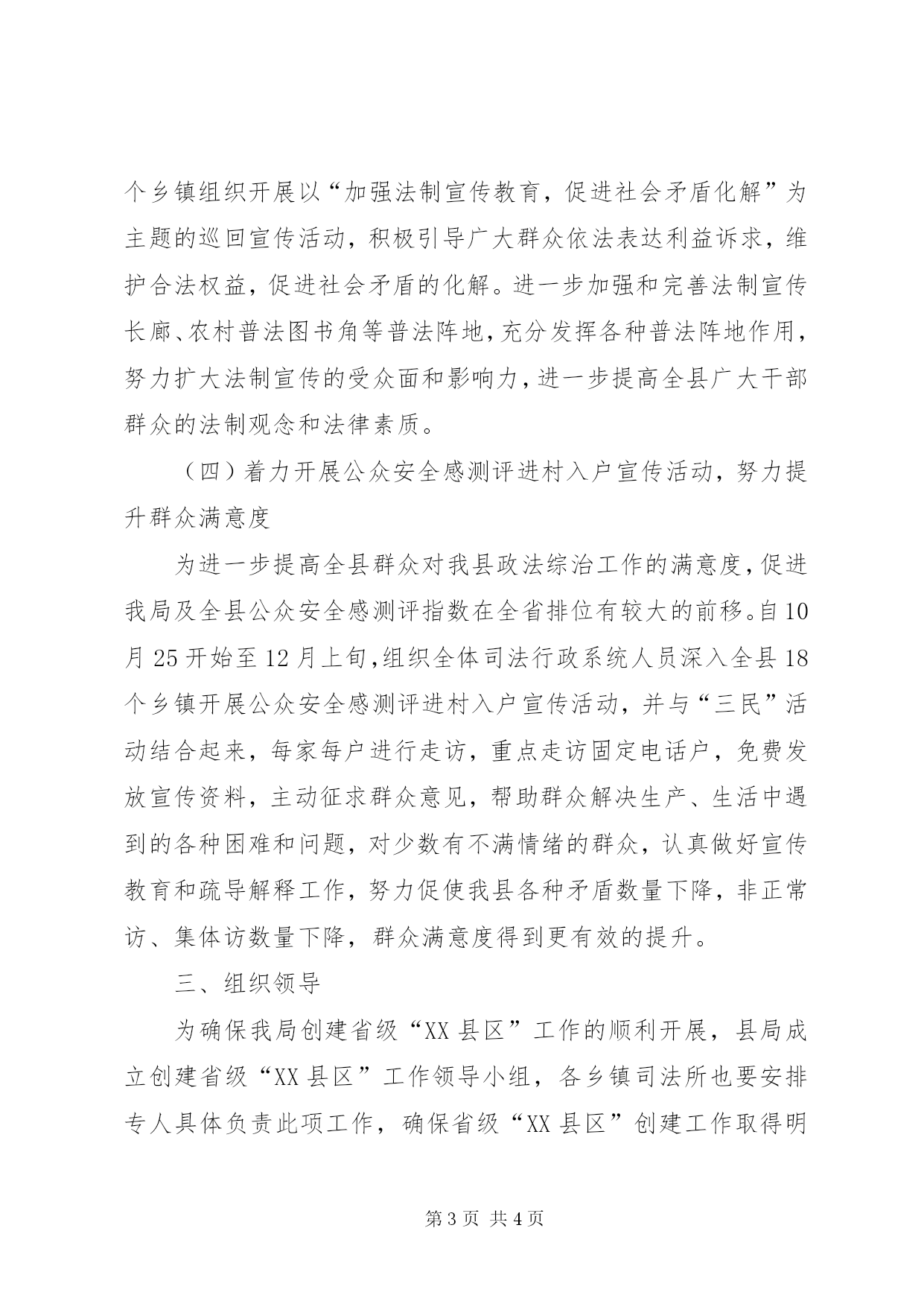 第PAGE\*Arabic\*MERGEFORMAT4页共NUMPAGES\*MERGEFORMAT4页司法局XX县区活动方案一、指导思想坚持以邓小平理论和“三个代表”重要思想为指导,全面落实科学发展观,按照市、县综治委提出的全面建设省级“XX县区”的要求,紧紧围绕县委、县政府的中心工作,充分发挥司法行政职能作用,以加强矛盾纠纷排查调处工作为重点,以提高公众安全感为目标,努力推进司法行政各项工作全面发展,为全县经济发展、社会和谐稳定提供优质高效的法律服务和法律保障。二、工作任务(一)坚持调解优先原则,努力预防化解矛盾纠纷牢固树立调解也是执法的理念,坚持调解优先原则,把矛盾纠纷排查化解的重心放在基层,努力做到“小事不出村,大事不出乡,矛盾不上交”。10月底至11月底,利用一个月的时间,县局组织司法所人员及乡、村人民调解员开展一次矛盾纠纷集中大排查大化解活动,集中人力物力化解一批多年积累及新发生的矛盾纠纷。进一步加强人民调解制度化、规范化、法制化建设,着力提高人民调解质量和公信力,努力构建完善人民、行政、司法三种调解相互衔接配合的大调解工作格局。县局及各乡镇司法所要积极参与全县性的重大矛盾纠纷和医患纠纷调处,积极协助县委、县政府及当地党委、政府妥善处置信访问题和群体性事件,努力把矛盾纠纷排查调处的各项工作落到实处,确保全县社会和谐稳定。(二)进一步加强社区矫正及“两劳”人员帮教安置工作,努力推进社会管理创新扎实开展帮教安置工作,进一步健全完善无缝对接机制,全面落实“两劳”人员衔接、管控、帮扶各环节工作,确保每位罪犯、劳教人员从入监开始到刑释解教后的整个帮教安置工作全程监管帮扶到位,真正实现“两劳”人员有人接、有人管、就业有人扶、创业有人帮、困难有人助的工作目标。继续开展与监所“结对子”活动,与、赣西、女子监狱结对子,做好监内服刑人员的思想稳定工作,努力实现“墙内”、“墙外”无缝对接。加强安置实体和基地建设,加快醪桥基地建设进度,确保11月底前正式运作。进一步抓好社区矫正工作,全面落实社区矫正对象的交接、建档、监管等各项工作,努力增强矫正对象认罪悔罪意识,促使其顺利回归和融入社会,防止其重新违法犯罪,努力减少社会不稳定因素。(三)着力丰富普法载体,努力增强法制宣传教育的实效性认真按照“五五”普法规划总要求,以“法律六进”为总抓手,积极开展以“创建法治”、“XX县区”为主题的法制宣传教育活动,在全县上下进一步营造依法行政、依法办事、依法诉求的良好氛围。结合全县开展的集中清理整治县城规划区内违法违规用地和违章建筑活动,利用12月份一个月的时间,在全县18个乡镇组织开展以“加强法制宣传教育,促进社会矛盾化解”为主题的巡回宣传活动,积极引导广大群众依法表达利益诉求,维护合法权益,促进社会矛盾的化解。进一步加强和完善法制宣传长廊、农村普法图书角等普法阵地,充分发挥各种普法阵地作用,努力扩大法制宣传的受众面和影响力,进一步提高全县广大干部群众的法制观念和法律素质。(四)着力开展公众安全感测评进村入户宣传活动,努力提升群众满意度为进一步提高全县群众对我县政法综治工作的满意度,促进我局及全县公众安全感测评指数在全省排位有较大的前移。自10月25开始至12月上旬,组织全体司法行政系统人员深入全县18个乡镇开展公众安全感测评进村入户宣传活动,并与“三民”活动结合起来,每家每户进行走访,重点走访固定电话户,免费发放宣传资料,主动征求群众意见,帮助群众解决生产、生活中遇到的各种困难和问题,对少数有不满情绪的群众,认真做好宣传教育和疏导解释工作,努力促使我县各种矛盾数量下降,非正常访、集体访数量下降,群众满意度得到更有效的提升。三、组织领导为确保我局创建省级“XX县区”工作的顺利开展,县局成立创建省级“XX县区”工作领导小组,各乡镇司法所也要安排专人具体负责此项工作,确保省级“XX县区”创建工作取得明显成效。