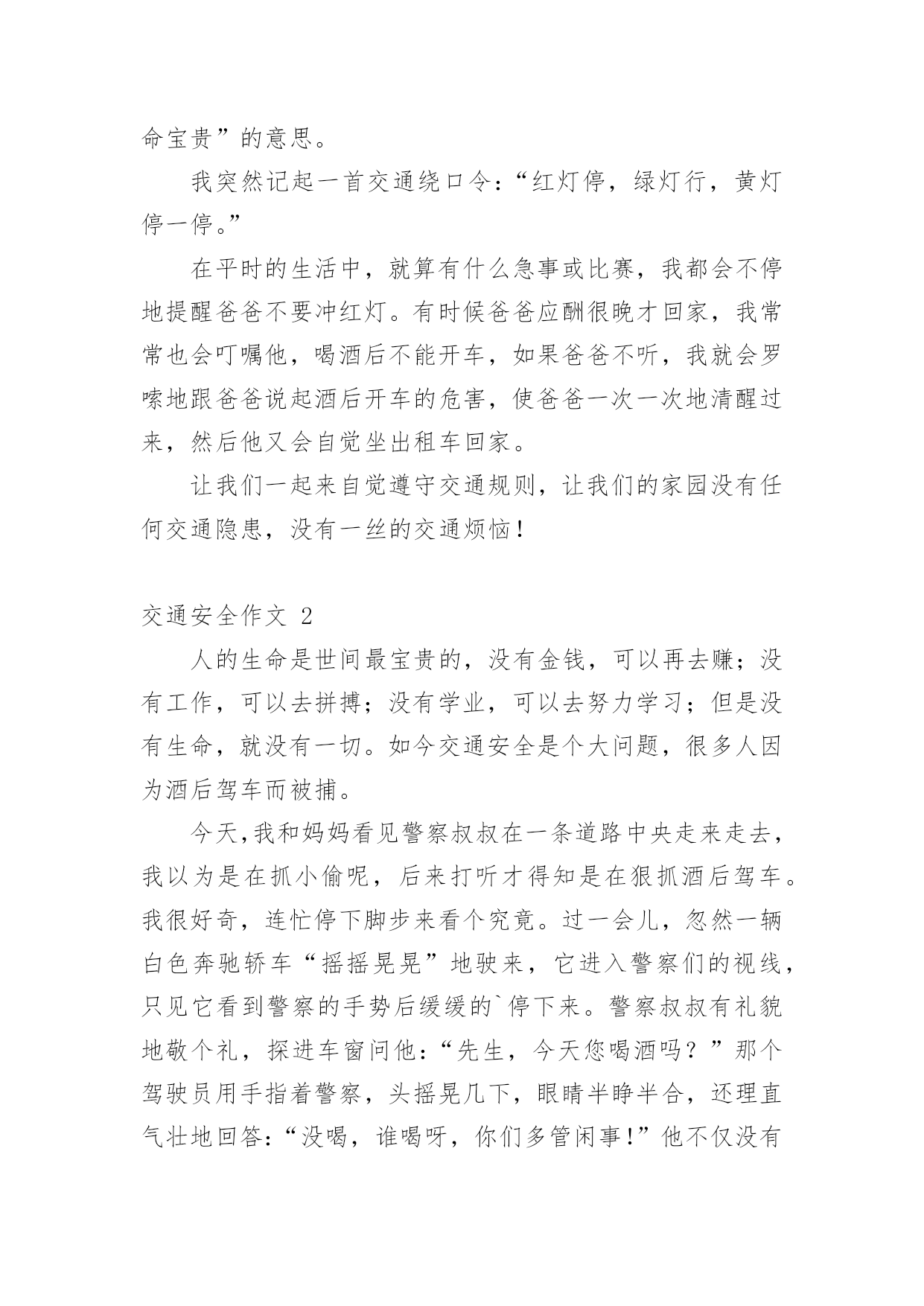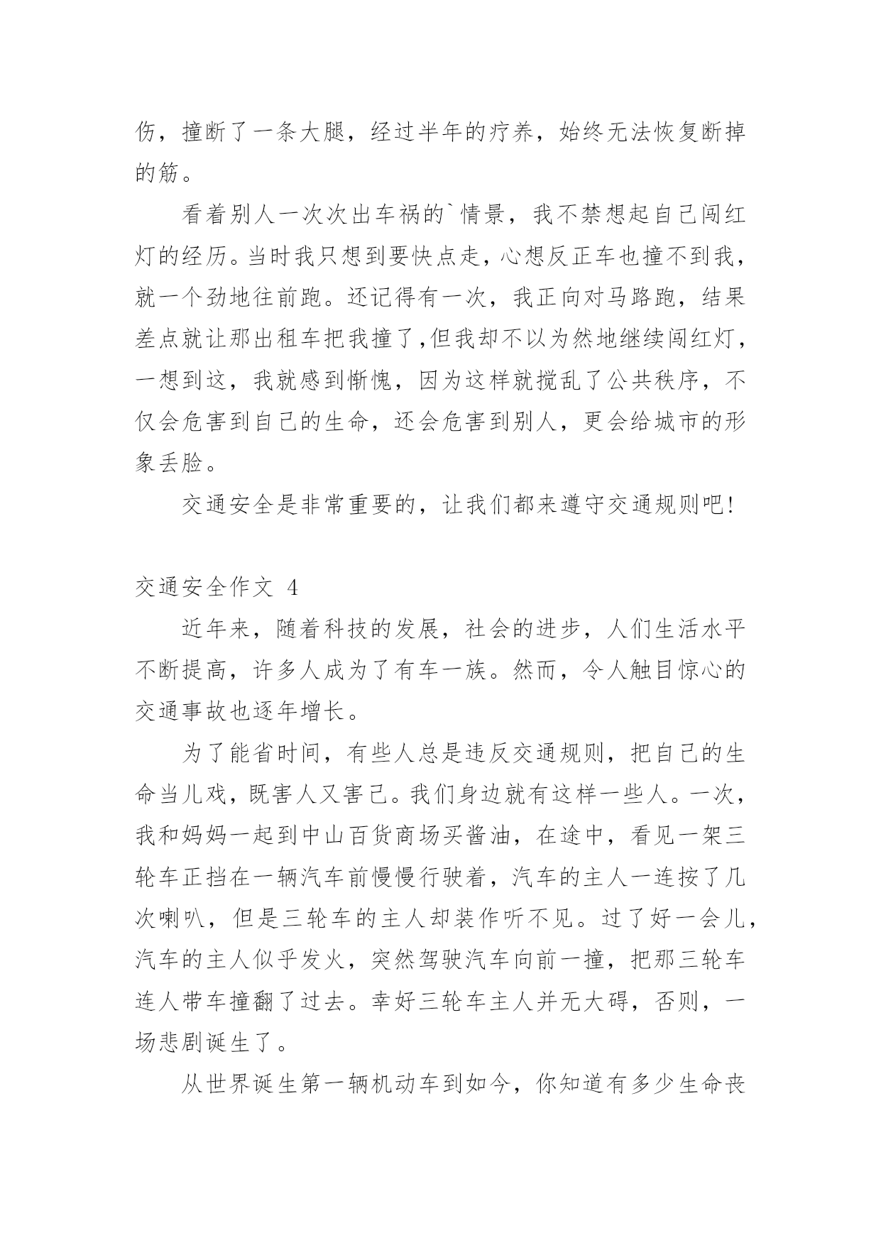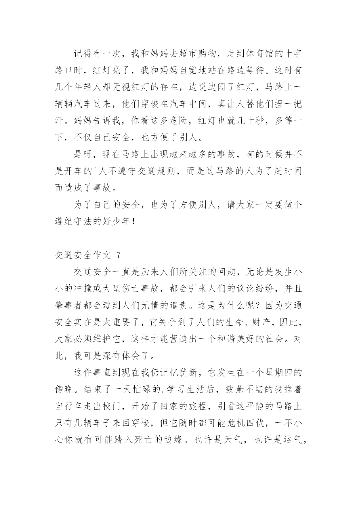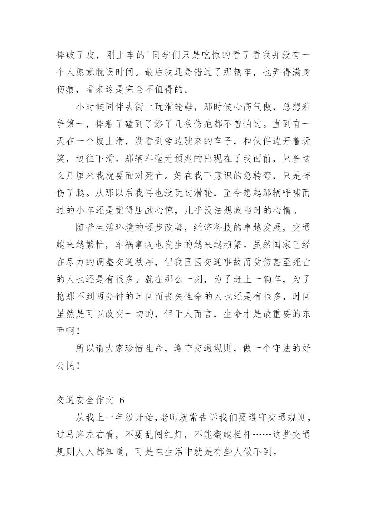 交通安全作文【精华】交通安全作文25篇在平平淡淡的日常中,说到作文,大家肯定都不陌生吧,作文根据体裁的不同可以分为记叙文、说明文、应用文、议论文。相信许多人会觉得作文很难写吧,下面是小编为大家整理的【精华】交通安全作文,欢迎阅读与收藏。交通安全作文1交通安全常常被人们忽略,其实交通安全就在我们的身边。尤其是针对那些不遵守交通规则的人。那是一个阴晴天,我和妈妈在大街上走着。路上几个骑自行车的初中生进入了我和妈妈的视线。我看见他们三五成群地围在一起,看起来很开心似的.。他们一边骑自行车,一边顾着聊天。他们骑到一个十字路口,不遵守交通规则,还当红绿灯是个杂物,不管你红灯还是绿灯也照样冲,这种冲红灯的行为为他们增添了几分安全隐患。我和妈妈没走多远,我一回头,果然不出我所料,在那个路口,一辆小汽车行驶过来,向初中生冲过来。撞垮了一辆自行车。我听见几个初中生尖叫起来,其中一个初中生受了伤。这一个事例怎能不让他们受到了教训呢?还有一次,我正坐着爸爸的小轿车上学。我看见一位叔叔为了自己孩子的上学,就冲红灯,超车,横冲直撞。虽然这位叔叔没有遇上什么交通事故,但我也深深的领悟到“生命宝贵”的意思。我突然记起一首交通绕口令:“红灯停,绿灯行,黄灯停一停。”在平时的生活中,就算有什么急事或比赛,我都会不停地提醒爸爸不要冲红灯。有时候爸爸应酬很晚才回家,我常常也会叮嘱他,喝酒后不能开车,如果爸爸不听,我就会罗嗦地跟爸爸说起酒后开车的危害,使爸爸一次一次地清醒过来,然后他又会自觉坐出租车回家。让我们一起来自觉遵守交通规则,让我们的家园没有任何交通隐患,没有一丝的交通烦恼!交通安全作文2人的生命是世间最宝贵的,没有金钱,可以再去赚;没有工作,可以去拼搏;没有学业,可以去努力学习;但是没有生命,就没有一切。如今交通安全是个大问题,很多人因为酒后驾车而被捕。今天,我和妈妈看见警察叔叔在一条道路中央走来走去,我以为是在抓小偷呢,后来打听才得知是在狠抓酒后驾车。我很好奇,连忙停下脚步来看个究竟。过一会儿,忽然一辆白色奔驰轿车“摇摇晃晃”地驶来,它进入警察们的视线,只见它看到警察的手势后缓缓的`停下来。警察叔叔有礼貌地敬个礼,探进车窗问他:“先生,今天您喝酒吗?”那个驾驶员用手指着警察,头摇晃几下,眼睛半睁半合,还理直气壮地回答:“没喝,谁喝呀,你们多管闲事!”他不仅没有承认,反倒骂警察几句。警察叔叔听着他愤愤不平的语气,闻着空中飘来的浓浓的白酒味,立刻给他做测量,结果酒精度远远超标!围观的群众越来越多,有的甚至还议论纷纷:“这驾驶员太不像话!居然拿自己的生命开玩笑!”不管他怎么反驳,警察叔叔还是把他押进公安车。就这样,一个,两个……这天晚上,他们抓获满满一车酒后驾车的人。茫茫深夜,警察叔叔为我们的交通安全而不辞辛苦地工作着,他们希望所有的驾驶员喝酒不开车,开车不喝酒。我们要牢记警察叔叔的话,交通安全时刻记在我们心中!交通安全作文3现在城市里的道路越来越宽了,汽车也越来越多了,但交通事故也是一年比一年多,多得让人吃惊。为什么会有这么多交通事故呢?原来人们的交通意识淡薄了。我家住在马路边,又是一个十字路口,每天都有数千辆汽车从十字路口通过,交通事故很是频繁。经过我的观察,我发现许多闯红灯的人都是摩托车司机。有一次,只听“吱——”的一声,接着又是一声“啪!”,我赶紧向那一看,一辆自行车倒着,旁边躺着一个人,还有一个人骑在已经停住的摩托车上。“嗨!”,又是摩托车闯的祸,不知什么时候摩托车司机们才能遵守交通规则啊!我又想起发生在我自己身边的交通事故:我大姨妈骑着摩托车,在慢车道里正常行驶着,突然一辆满载某单位员工的大客车飞驰而来,冲进了慢车道,将她逼入死角,把她撞伤,撞断了一条大腿,经过半年的疗养,始终无法恢复断掉的筋。看着别人一次次出车祸的`情景,我不禁想起自己闯红灯的经历。当时我只想到要快点走,心想反正车也撞不到我,就一个劲地往前跑。还记得有一次,我正向对马路跑,结果差点就让那出租车把我撞了,但我却不以为然地继续闯红灯,一想到这,我就感到惭愧,因为这样就搅乱了公共秩序,不仅会危害到自己的生命,还会危害到别人,更会给城市的形象丢脸。交通安全是非常重要的,让我们都来遵守交通规则吧!交通安全作文4近年来,随着科技的发展,社会的进步,人们生活水平不断提高,许多人成为了有车一族。然而,令人触目惊心的交通事故也逐年增长。为了能省时间,有些人总是违反交通规则,把自己的生命当儿戏,既害人又害己。我们身边就有这样一些人。一次,我和妈妈一起到中山百货商场买酱油,在途中,看见一架三轮车正挡在一辆汽车前慢慢行驶着,汽车的主人一连按了几次喇叭,但是三轮车的主人却装作听不见。过了好一会儿,汽车的主人似乎发火,突然驾驶汽车向前一撞,把那三轮车连人带车撞翻了过去。幸好三轮车主人并无大碍,否则,一场