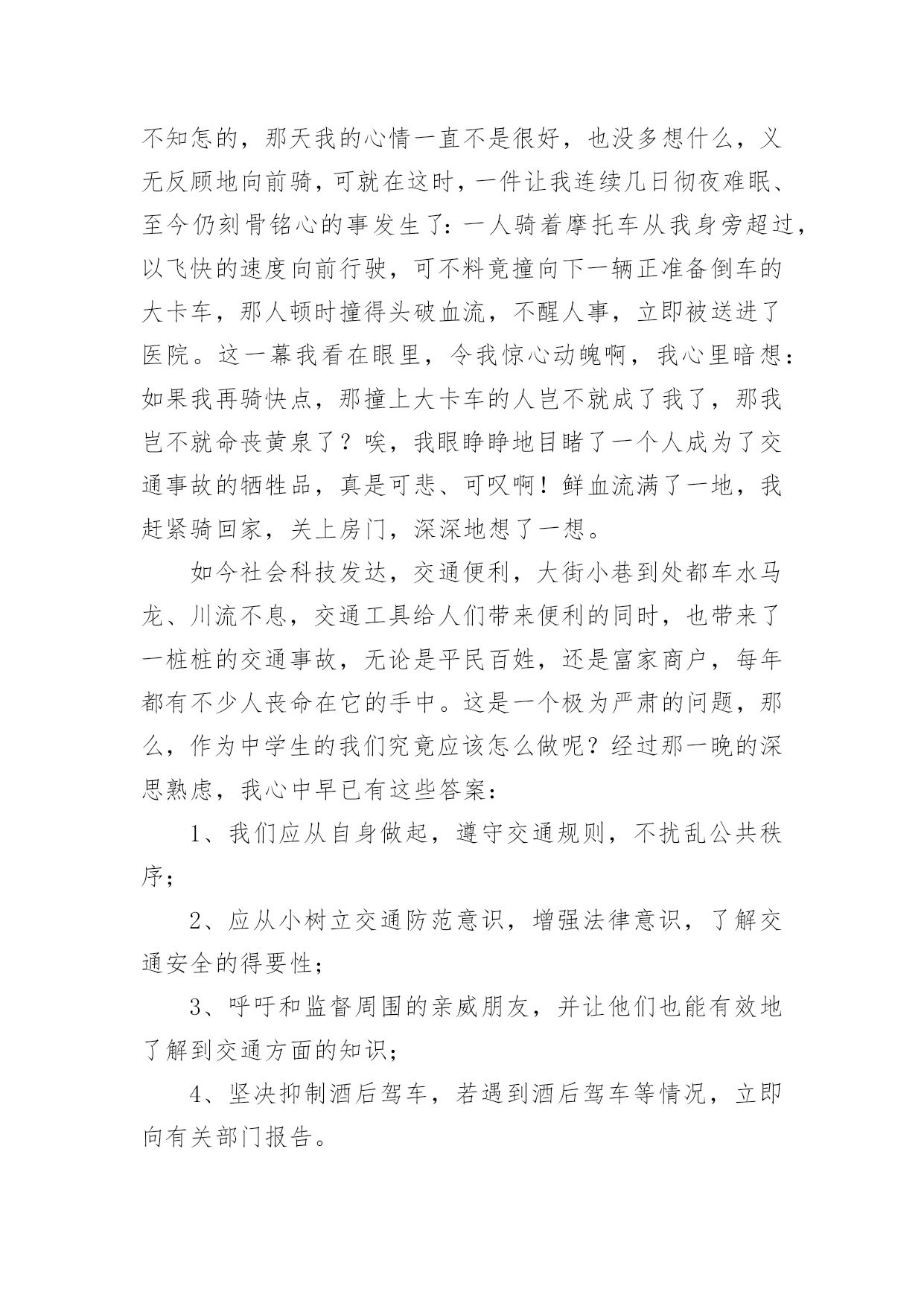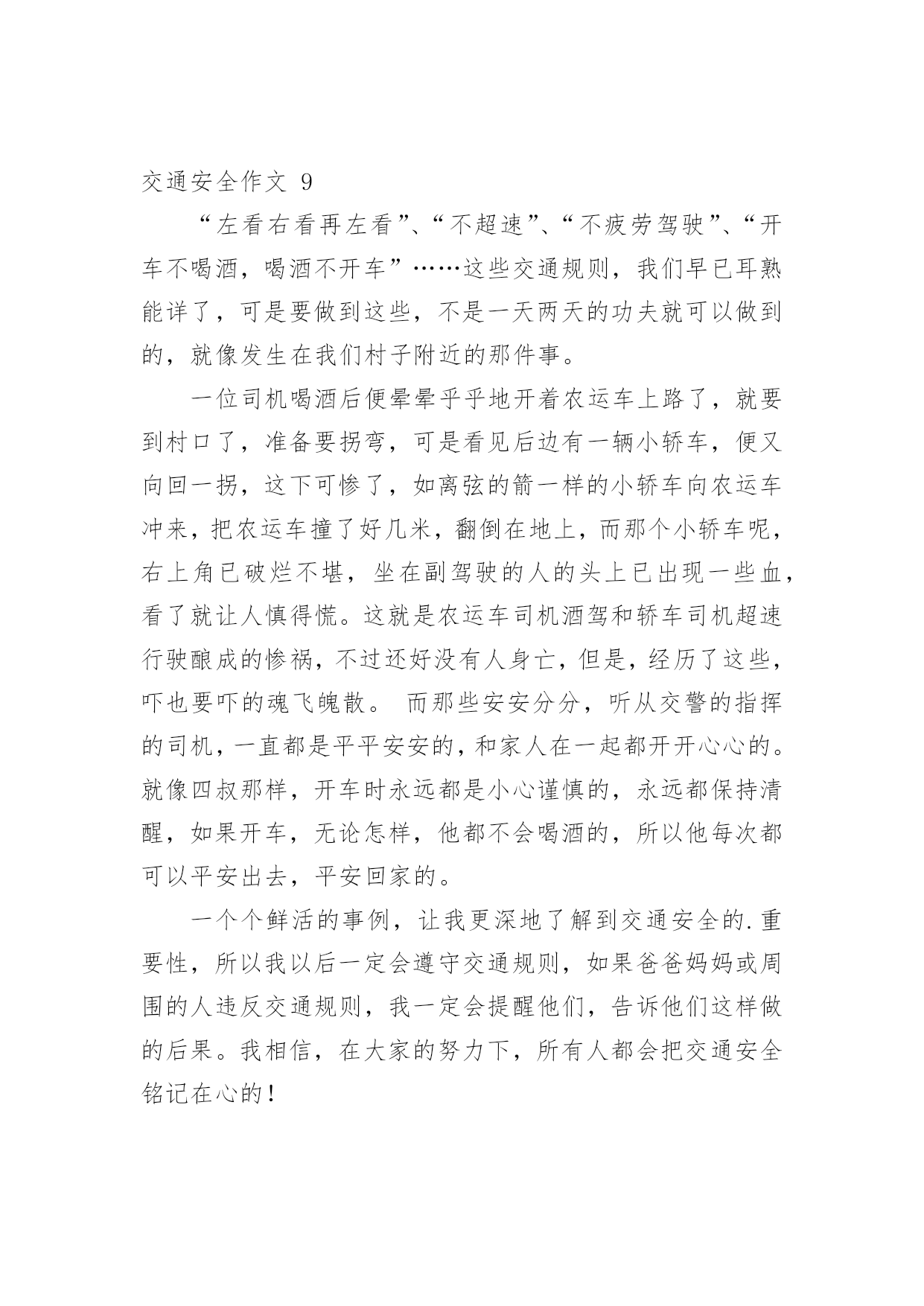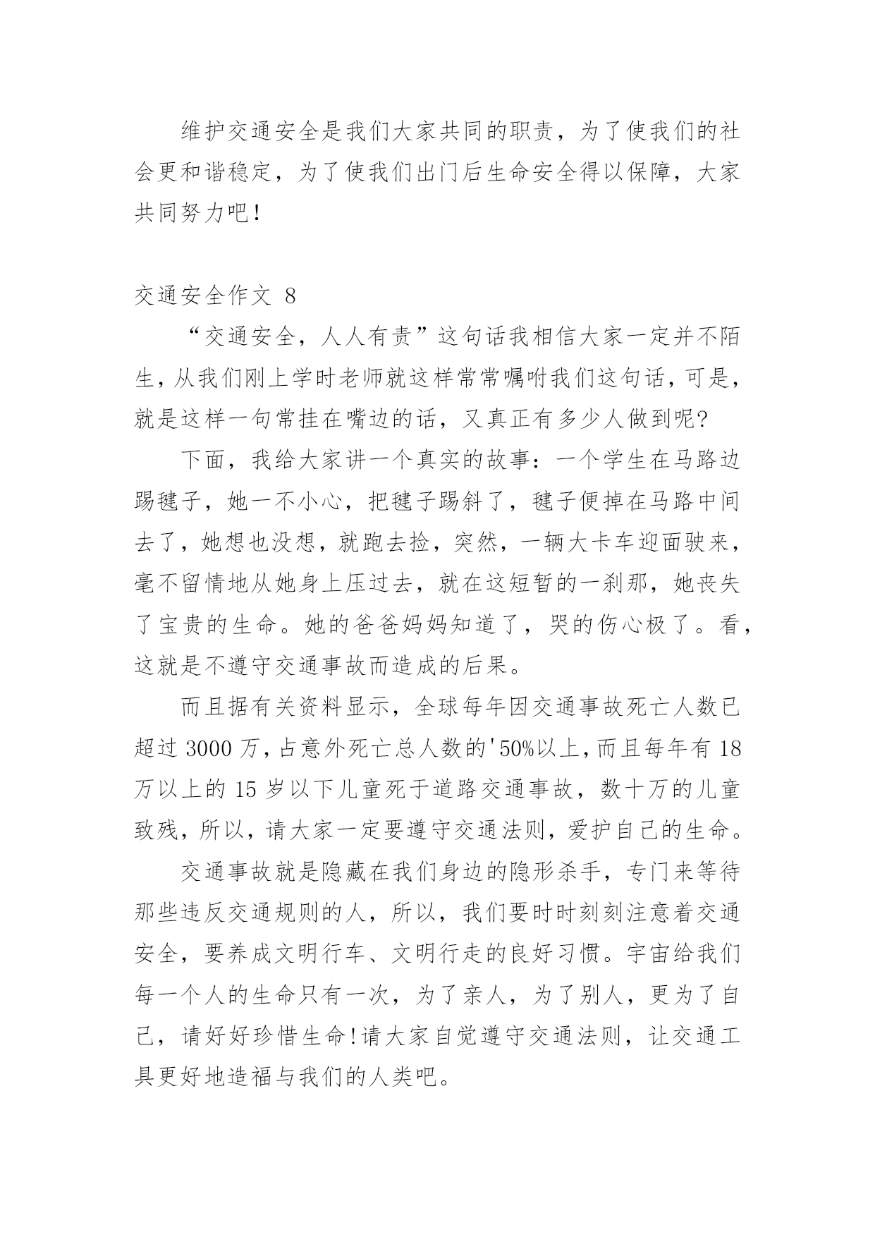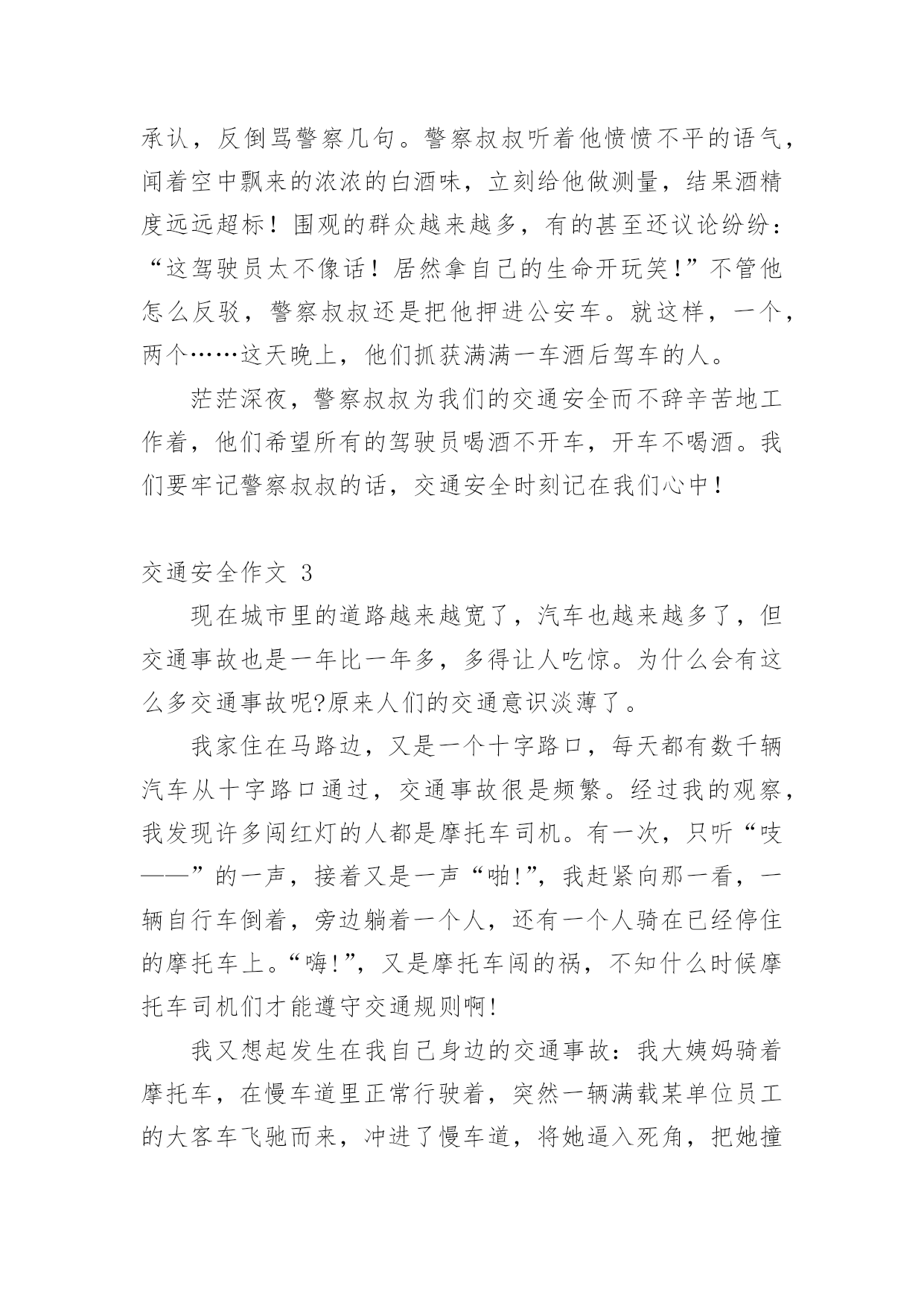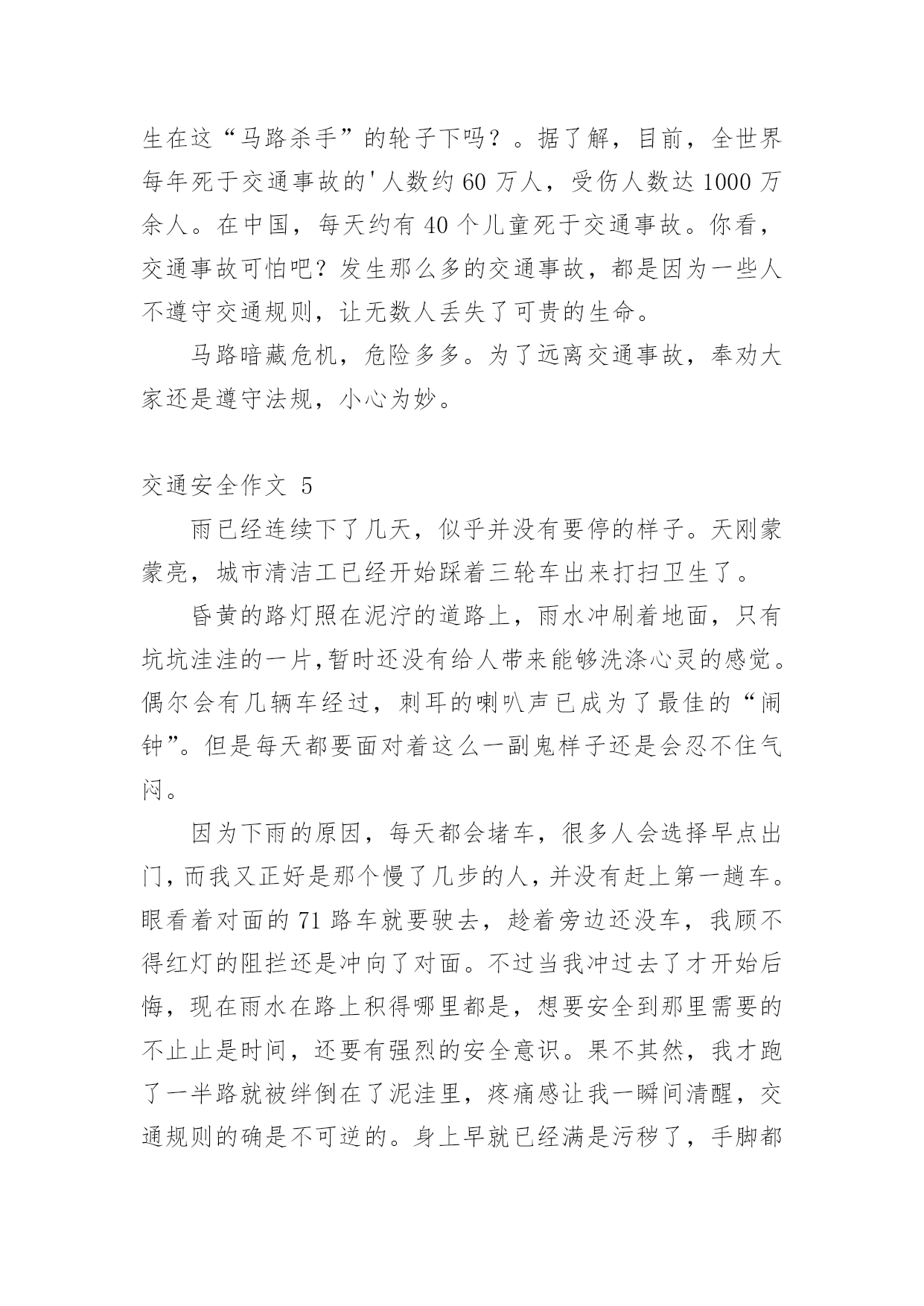 交通安全作文【精华】交通安全作文25篇在平平淡淡的日常中,说到作文,大家肯定都不陌生吧,作文根据体裁的不同可以分为记叙文、说明文、应用文、议论文。相信许多人会觉得作文很难写吧,下面是小编为大家整理的【精华】交通安全作文,欢迎阅读与收藏。交通安全作文1交通安全常常被人们忽略,其实交通安全就在我们的身边。尤其是针对那些不遵守交通规则的人。那是一个阴晴天,我和妈妈在大街上走着。路上几个骑自行车的初中生进入了我和妈妈的视线。我看见他们三五成群地围在一起,看起来很开心似的.。他们一边骑自行车,一边顾着聊天。他们骑到一个十字路口,不遵守交通规则,还当红绿灯是个杂物,不管你红灯还是绿灯也照样冲,这种冲红灯的行为为他们增添了几分安全隐患。我和妈妈没走多远,我一回头,果然不出我所料,在那个路口,一辆小汽车行驶过来,向初中生冲过来。撞垮了一辆自行车。我听见几个初中生尖叫起来,其中一个初中生受了伤。这一个事例怎能不让他们受到了教训呢?还有一次,我正坐着爸爸的小轿车上学。我看见一位叔叔为了自己孩子的上学,就冲红灯,超车,横冲直撞。虽然这位叔叔没有遇上什么交通事故,但我也深深的领悟到“生命宝贵”的意思。我突然记起一首交通绕口令:“红灯停,绿灯行,黄灯停一停。”在平时的生活中,就算有什么急事或比赛,我都会不停地提醒爸爸不要冲红灯。有时候爸爸应酬很晚才回家,我常常也会叮嘱他,喝酒后不能开车,如果爸爸不听,我就会罗嗦地跟爸爸说起酒后开车的危害,使爸爸一次一次地清醒过来,然后他又会自觉坐出租车回家。让我们一起来自觉遵守交通规则,让我们的家园没有任何交通隐患,没有一丝的交通烦恼!交通安全作文2人的生命是世间最宝贵的,没有金钱,可以再去赚;没有工作,可以去拼搏;没有学业,可以去努力学习;但是没有生命,就没有一切。如今交通安全是个大问题,很多人因为酒后驾车而被捕。今天,我和妈妈看见警察叔叔在一条道路中央走来走去,我以为是在抓小偷呢,后来打听才得知是在狠抓酒后驾车。我很好奇,连忙停下脚步来看个究竟。过一会儿,忽然一辆白色奔驰轿车“摇摇晃晃”地驶来,它进入警察们的视线,只见它看到警察的手势后缓缓的`停下来。警察叔叔有礼貌地敬个礼,探进车窗问他:“先生,今天您喝酒吗?”那个驾驶员用手指着警察,头摇晃几下,眼睛半睁半合,还理直气壮地回答:“没喝,谁喝呀,你们多管闲事!”他不仅没有承认,反倒骂警察几句。警察叔叔听着他愤愤不平的语气,闻着空中飘来的浓浓的白酒味,立刻给他做测量,结果酒精度远远超标!围观的群众越来越多,有的甚至还议论纷纷:“这驾驶员太不像话!居然拿自己的生命开玩笑!”不管他怎么反驳,警察叔叔还是把他押进公安车。就这样,一个,两个……这天晚上,他们抓获满满一车酒后驾车的人。茫茫深夜,警察叔叔为我们的交通安全而不辞辛苦地工作着,他们希望所有的驾驶员喝酒不开车,开车不喝酒。我们要牢记警察叔叔的话,交通安全时刻记在我们心中!交通安全作文3现在城市里的道路越来越宽了,汽车也越来越多了,但交通事故也是一年比一年多,多得让人吃惊。为什么会有这么多交通事故呢?原来人们的交通意识淡薄了。我家住在马路边,又是一个十字路口,每天都有数千辆汽车从十字路口通过,交通事故很是频繁。经过我的观察,我发现许多闯红灯的人都是摩托车司机。有一次,只听“吱——”的一声,接着又是一声“啪!”,我赶紧向那一看,一辆自行车倒着,旁边躺着一个人,还有一个人骑在已经停住的摩托车上。“嗨!”,又是摩托车闯的祸,不知什么时候摩托车司机们才能遵守交通规则啊!我又想起发生在我自己身边的交通事故:我大姨妈骑着摩托车,在慢车道里正常行驶着,突然一辆满载某单位员工的大客车飞驰而来,冲进了慢车道,将她逼入死角,把她撞伤,撞断了一条大腿,经过半年的疗养,始终无法恢复断掉的筋。看着别人一次次出车祸的`情景,我不禁想起自己闯红灯的经历。当时我只想到要快点走,心想反正车也撞不到我,就一个劲地往前跑。还记得有一次,我正向对马路跑,结果差点就让那出租车把我撞了,但我却不以为然地继续闯红灯,一想到这,我就感到惭愧,因为这样就搅乱了公共秩序,不仅会危害到自己的生命,还会危害到别人,更会给城市的形象丢脸。交通安全是非常重要的,让我们都来遵守交通规则吧!交通安全作文4近年来,随着科技的发展,社会的进步,人们生活水平不断提高,许多人成为了有车一族。然而,令人触目惊心的交通事故也逐年增长。为了能省时间,有些人总是违反交通规则,把自己的生命当儿戏,既害人又害己。我们身边就有这样一些人。一次,我和妈妈一起到中山百货商场买酱油,在途中,看见一架三轮车正挡在一辆汽车前慢慢行驶着,汽车的主人一连按了几次喇叭,但是三轮车的主人却装作听不见。过了好一会儿,汽车的主人似乎发火,突然驾驶汽车向前一撞,把那三轮车连人带车撞翻了过去。幸好三轮车主人并无大碍,否则,一场