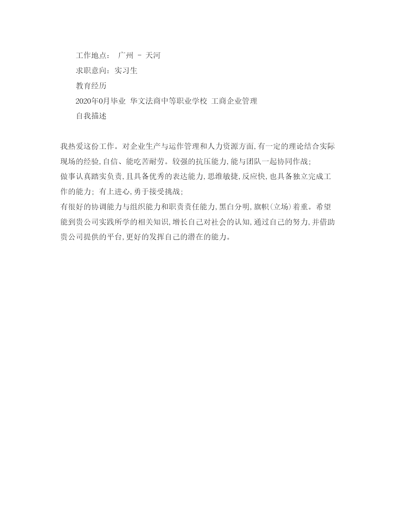 此资料由网络收集而来,如有侵权请告知上传者立即删除。资料共分享,我们负责传递知识。2020工商管理大专简历范文在制作个人简历之前就需要选择一份简历模板,好的简历模板能够增加简历内容的阅读性,并且能够在最大程度上吸引招聘人员的眼球。2020工商管理大专简历范文篇一XXX男26岁广东人学历:大专工作年限:应届毕业生期望薪资:1000-2000元工作地点:广州-海珠求职意向:其他销售职位自我描述实践经历2020年3月厚街家具展览会在厚街国际大酒店餐饮部当服务员2020年7月-8月在普宁市明辉制衣有限公司做暑假工教育经历毕业院校:广东创新科技职业学院学历专科专业工商企业管理个人简介本人性格外向大方,人缘广泛,在大学三年里,曾担任生活委员,辅导员助理,组织过多次活动,也参加了多次实践活动,爱好特长是打篮球、听音乐;有较好的交际能力。2020工商管理大专简历范文篇二XXX男26岁学历:大专工作年限:应届毕业生期望薪资:面议工作地点:广州-天河求职意向:实习生教育经历2020年0月毕业华文法商中等职业学校工商企业管理自我描述我热爱这份工作。对企业生产与运作管理和人力资源方面,有一定的理论结合实际现场的经验,自信、能吃苦耐劳。较强的抗压能力,能与团队一起协同作战;做事认真踏实负责,且具备优秀的表达能力,思维敏捷,反应快,也具备独立完成工作的能力;有上进心,勇于接受挑战;有很好的协调能力与组织能力和职责责任能力,黑白分明,旗帜(立场)着重。希望能到贵公司实践所学的相关知识,增长自己对社会的认知,通过自己的努力,并借助贵公司提供的平台,更好的发挥自己的潜在的能力。