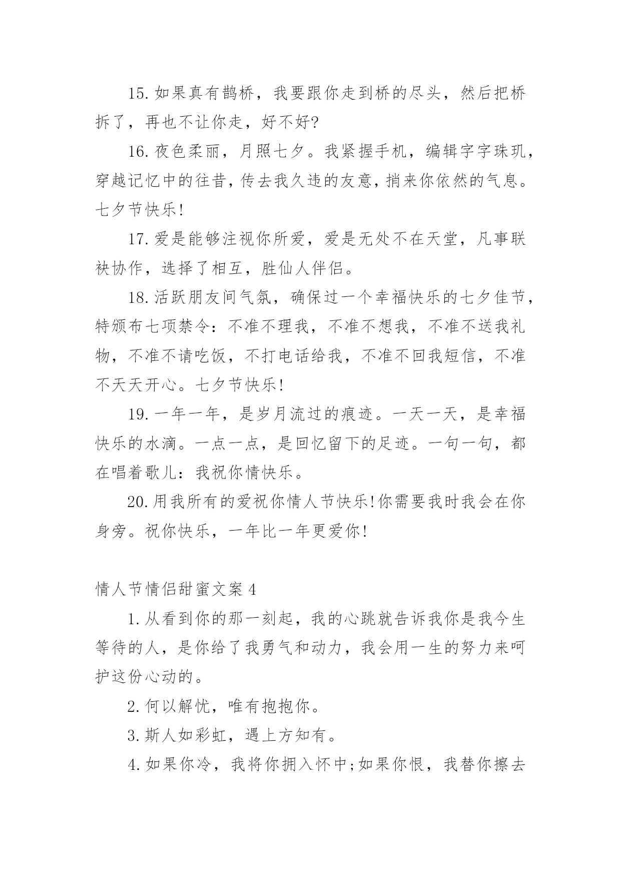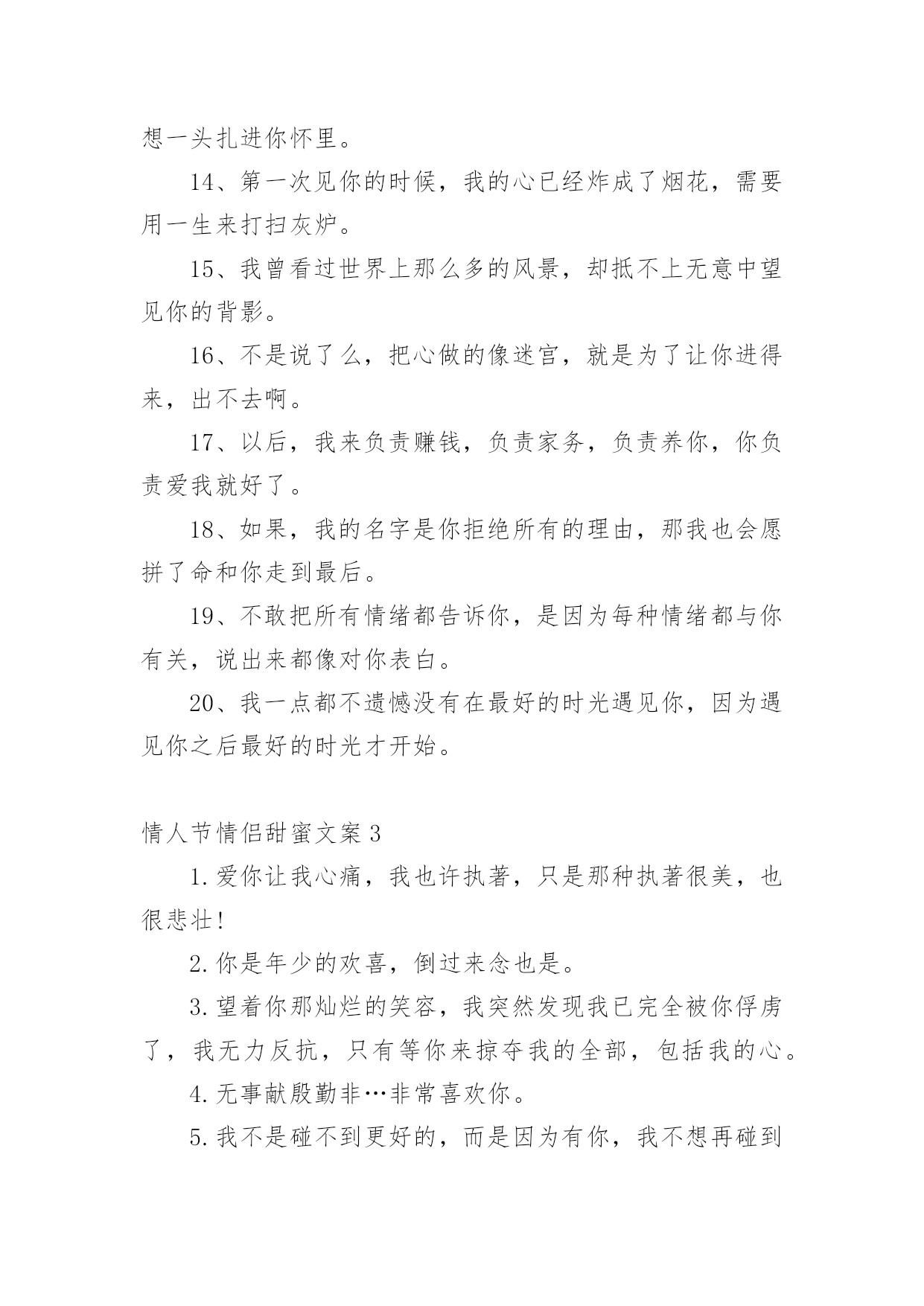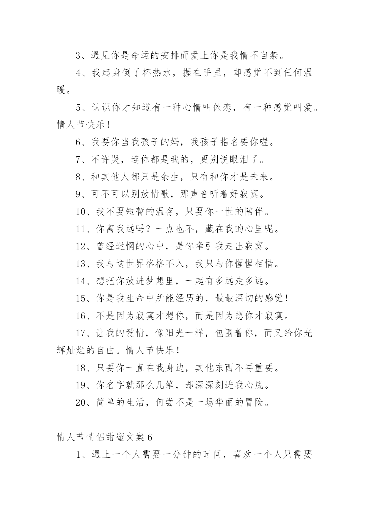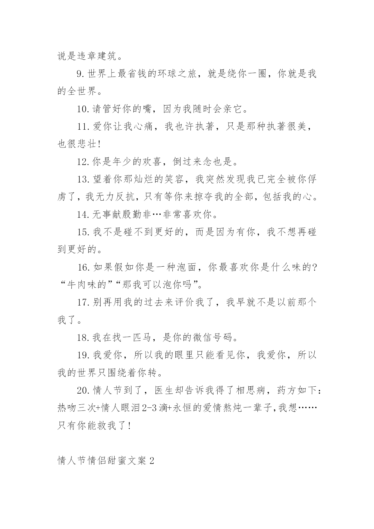 情人节情侣甜蜜文案情人节情侣甜蜜文案【热】随着社交网络开始流行,越来越多人热衷于在朋友圈发布文案,文案用以分享自己生活中值得纪念的小确幸。那些火遍朋友圈的文案都是什么样的呢?以下是小编收集整理的情人节情侣甜蜜文案,仅供参考,欢迎大家阅读。情人节情侣甜蜜文案11.突然很怕老去,很怕死亡,很怕意外的来临,如果有一天我不在你身边了,谁来护你周全,谁来陪你走过一生流年。2.不要那么相信回忆,里面的那个人,不一定会怀念你。3.你的犹豫期已经超过,不许三心二意了!从今天起,只许温柔体贴,不许横行霸道;只许爱,不许恨;只许笑,不许哭。4.别人都有二百零七根骨头,不知道为什么我看见你就有二百零八根。5.被你点赞过的朋友圈,叫做甜甜圈。6.总有那么一天,我习惯了你的直来直去,你也猜透了我的口是心非。我们相视一笑,执子之手,与子白头。7.爱情的扉页,用甜蜜浇灌;心灵的感悟,用幸福堆砌;动情的文字,用柔情写就;浪漫的篇幅,用温馨营造。8.允许我在你心里建一座美丽的小屋,千万别理会别人说是违章建筑。9.世界上最省钱的环球之旅,就是绕你一圈,你就是我的全世界。10.请管好你的嘴,因为我随时会亲它。11.爱你让我心痛,我也许执著,只是那种执著很美,也很悲壮!12.你是年少的欢喜,倒过来念也是。13.望着你那灿烂的笑容,我突然发现我已完全被你俘虏了,我无力反抗,只有等你来掠夺我的全部,包括我的心。14.无事献殷勤非…非常喜欢你。15.我不是碰不到更好的,而是因为有你,我不想再碰到更好的。16.如果假如你是一种泡面,你最喜欢你是什么味的?“牛肉味的”“那我可以泡你吗”。17.别再用我的过去来评价我了,我早就不是以前那个我了。18.我在找一匹马,是你的微信号码。19.我爱你,所以我的眼里只能看见你,我爱你,所以我的世界只围绕着你转。20.情人节到了,医生却告诉我得了相思病,药方如下:热吻三次+情人眼泪2-3滴+永恒的爱情熬炖一辈子,我想……只有你能救我了!情人节情侣甜蜜文案21、好笑吗?身边没你,好怪,陪我一生一世好吗?2、没用的东西,再便宜也不要买;不爱的人,再寂寞也不要依赖。3、世界变化不停,人潮川流不息。我只想每个落日,身边都有你。4、你帅得有点呆,你乖得太可爱,你对我最坏,让我只能把你爱。5、我们都是独一无二的我们,只是碰见一个缘字,此生便分不开了。6、你是世界,世界是你。我愿意用自己的心,好好的陪着你,爱着你。7、只要你心里有我,我心里有你,就算隔着天涯海角,那也不是距离。8、我若在你心上,情敌三千又何妨。你若在我身旁,负了天下又怎样。9、最遥远的距离不是生与死,而是我站在你面前,你却不知道我爱你。10、望眼欲穿,千里云烟的思念。面朝北方,想你,在春暖花开的季节。11、愿意跟我体验一下不单身的感觉吗?我骄傲了十几年看见你我就怂了。12、我曾经年少轻狂莽撞到视死如归,却因为遇到你我开始渴望长命百岁。13、特别想你,尤其是像现在这样,外面刮着大风,很想一头扎进你怀里。14、第一次见你的时候,我的心已经炸成了烟花,需要用一生来打扫灰炉。15、我曾看过世界上那么多的风景,却抵不上无意中望见你的背影。16、不是说了么,把心做的像迷宫,就是为了让你进得来,出不去啊。17、以后,我来负责赚钱,负责家务,负责养你,你负责爱我就好了。18、如果,我的名字是你拒绝所有的理由,那我也会愿拼了命和你走到最后。19、不敢把所有情绪都告诉你,是因为每种情绪都与你有关,说出来都像对你表白。20、我一点都不遗憾没有在最好的时光遇见你,因为遇见你之后最好的时光才开始。情人节情侣甜蜜文案31.爱你让我心痛,我也许执著,只是那种执著很美,也很悲壮!2.你是年少的欢喜,倒过来念也是。3.望着你那灿烂的笑容,我突然发现我已完全被你俘虏了,我无力反抗,只有等你来掠夺我的全部,包括我的心。4.无事献殷勤非…非常喜欢你。5.我不是碰不到更好的,而是因为有你,我不想再碰到更好的。6.如果假如你是一种泡面,你最喜欢你是什么味的?“牛肉味的”“那我可以泡你吗”。7.别再用我的过去来评价我了,我早就不是以前那个我了。8.我在找一匹马,是你的微信号码。9.我爱你,所以我的眼里只能看见你,我爱你,所以我的世界只围绕着你转。10.情人节到了,医生却告诉我得了相思病,药方如下:热吻三次+情人眼泪2-3滴+永恒的爱情熬炖一辈子,我想……只有你能救我了!11.星空中点点闪烁的荧光,环绕着缤纷的绮丽梦想,祝福你今年许下的心愿,都能一一实现在你眼前,祝你七夕温馨喜悦!12.七夕到了,我准备让你学会怎么去编制一个程序,首先把右手的拇指和小指伸出摆出六的样子,然后在把代表我的食指伸开,形成6+1的模式,这就是"我爱你"的模式,此模式只在7月7日有效,请勿模仿。13.趁七夕未到,甜言蜜语未醉你时,送上美丽的祝福润色这个美丽