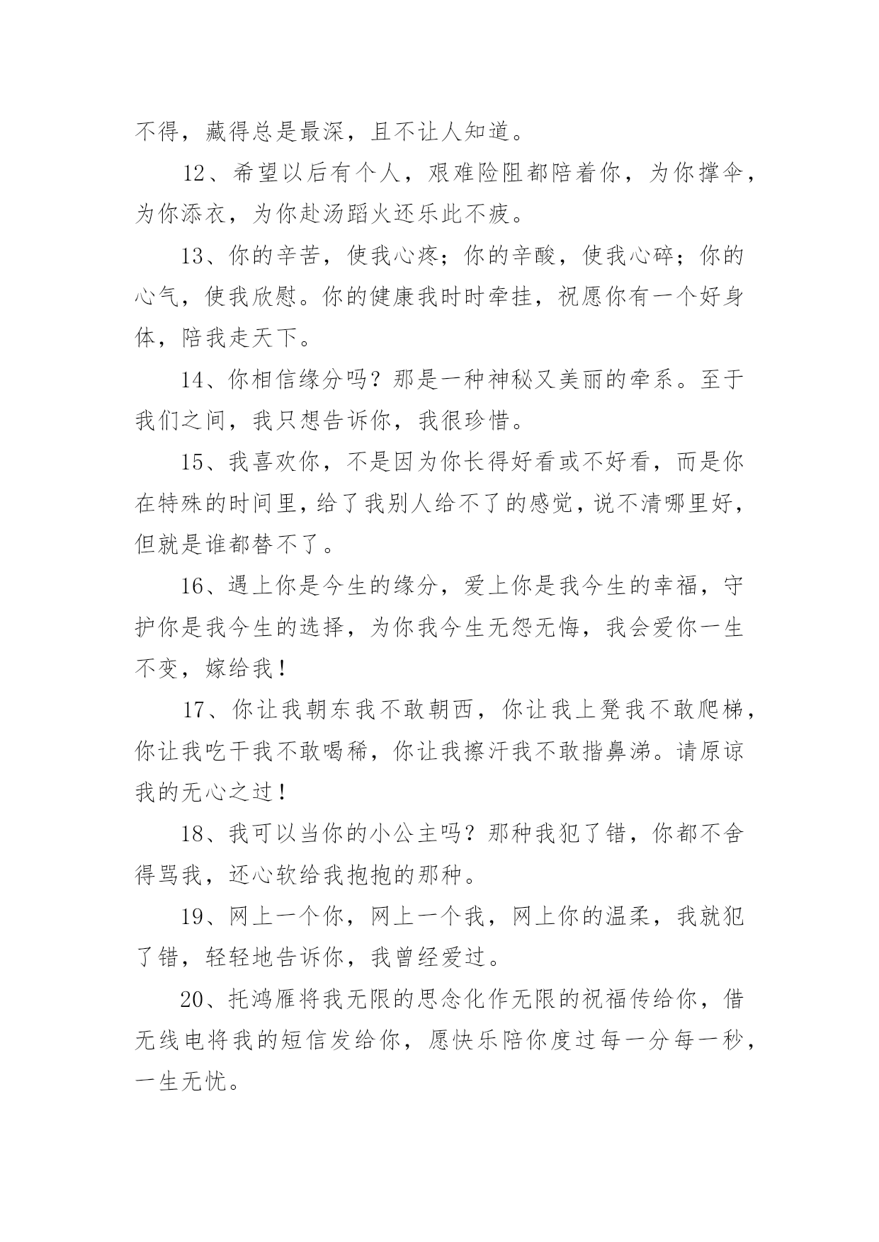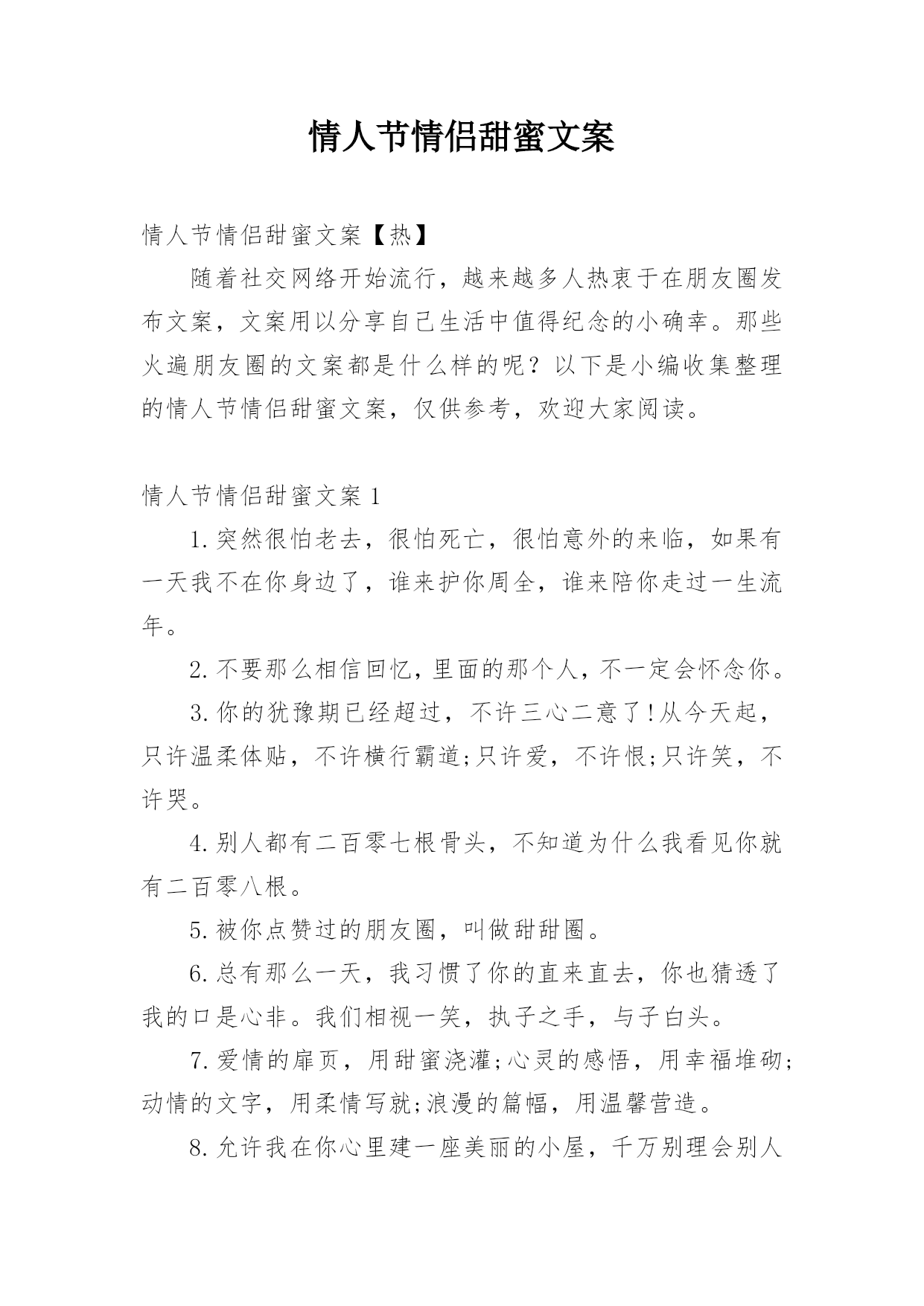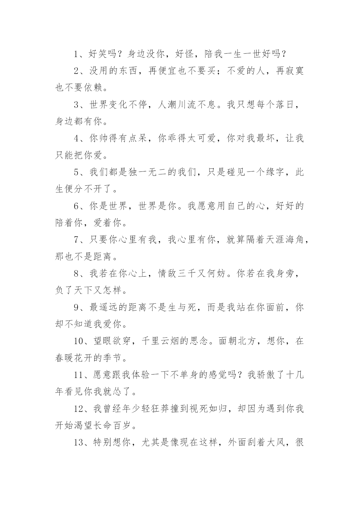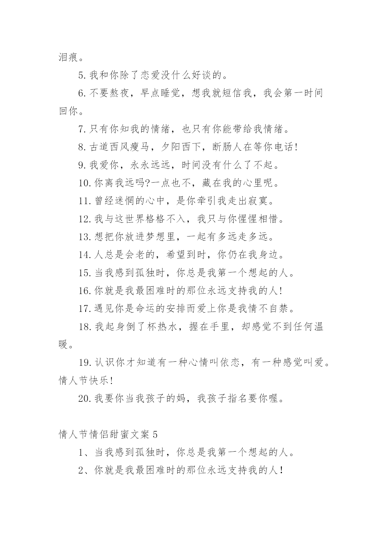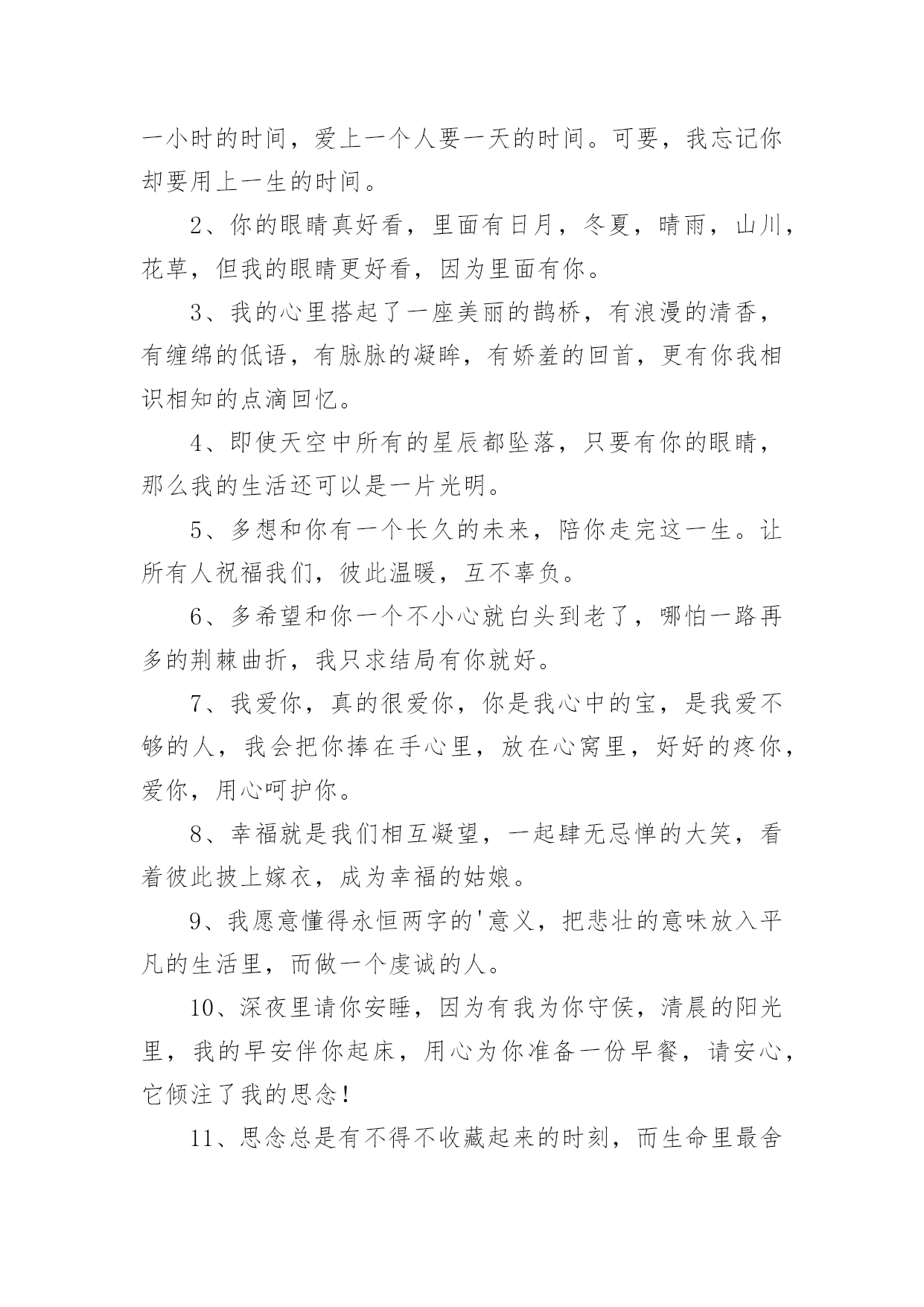 情人节情侣甜蜜文案情人节情侣甜蜜文案【热】随着社交网络开始流行,越来越多人热衷于在朋友圈发布文案,文案用以分享自己生活中值得纪念的小确幸。那些火遍朋友圈的文案都是什么样的呢?以下是小编收集整理的情人节情侣甜蜜文案,仅供参考,欢迎大家阅读。情人节情侣甜蜜文案11.突然很怕老去,很怕死亡,很怕意外的来临,如果有一天我不在你身边了,谁来护你周全,谁来陪你走过一生流年。2.不要那么相信回忆,里面的那个人,不一定会怀念你。3.你的犹豫期已经超过,不许三心二意了!从今天起,只许温柔体贴,不许横行霸道;只许爱,不许恨;只许笑,不许哭。4.别人都有二百零七根骨头,不知道为什么我看见你就有二百零八根。5.被你点赞过的朋友圈,叫做甜甜圈。6.总有那么一天,我习惯了你的直来直去,你也猜透了我的口是心非。我们相视一笑,执子之手,与子白头。7.爱情的扉页,用甜蜜浇灌;心灵的感悟,用幸福堆砌;动情的文字,用柔情写就;浪漫的篇幅,用温馨营造。8.允许我在你心里建一座美丽的小屋,千万别理会别人说是违章建筑。9.世界上最省钱的环球之旅,就是绕你一圈,你就是我的全世界。10.请管好你的嘴,因为我随时会亲它。11.爱你让我心痛,我也许执著,只是那种执著很美,也很悲壮!12.你是年少的欢喜,倒过来念也是。13.望着你那灿烂的笑容,我突然发现我已完全被你俘虏了,我无力反抗,只有等你来掠夺我的全部,包括我的心。14.无事献殷勤非…非常喜欢你。15.我不是碰不到更好的,而是因为有你,我不想再碰到更好的。16.如果假如你是一种泡面,你最喜欢你是什么味的?“牛肉味的”“那我可以泡你吗”。17.别再用我的过去来评价我了,我早就不是以前那个我了。18.我在找一匹马,是你的微信号码。19.我爱你,所以我的眼里只能看见你,我爱你,所以我的世界只围绕着你转。20.情人节到了,医生却告诉我得了相思病,药方如下:热吻三次+情人眼泪2-3滴+永恒的爱情熬炖一辈子,我想……只有你能救我了!情人节情侣甜蜜文案21、好笑吗?身边没你,好怪,陪我一生一世好吗?2、没用的东西,再便宜也不要买;不爱的人,再寂寞也不要依赖。3、世界变化不停,人潮川流不息。我只想每个落日,身边都有你。4、你帅得有点呆,你乖得太可爱,你对我最坏,让我只能把你爱。5、我们都是独一无二的我们,只是碰见一个缘字,此生便分不开了。6、你是世界,世界是你。我愿意用自己的心,好好的陪着你,爱着你。7、只要你心里有我,我心里有你,就算隔着天涯海角,那也不是距离。8、我若在你心上,情敌三千又何妨。你若在我身旁,负了天下又怎样。9、最遥远的距离不是生与死,而是我站在你面前,你却不知道我爱你。10、望眼欲穿,千里云烟的思念。面朝北方,想你,在春暖花开的季节。11、愿意跟我体验一下不单身的感觉吗?我骄傲了十几年看见你我就怂了。12、我曾经年少轻狂莽撞到视死如归,却因为遇到你我开始渴望长命百岁。13、特别想你,尤其是像现在这样,外面刮着大风,很想一头扎进你怀里。14、第一次见你的时候,我的心已经炸成了烟花,需要用一生来打扫灰炉。15、我曾看过世界上那么多的风景,却抵不上无意中望见你的背影。16、不是说了么,把心做的像迷宫,就是为了让你进得来,出不去啊。17、以后,我来负责赚钱,负责家务,负责养你,你负责爱我就好了。18、如果,我的名字是你拒绝所有的理由,那我也会愿拼了命和你走到最后。19、不敢把所有情绪都告诉你,是因为每种情绪都与你有关,说出来都像对你表白。20、我一点都不遗憾没有在最好的时光遇见你,因为遇见你之后最好的时光才开始。情人节情侣甜蜜文案31.爱你让我心痛,我也许执著,只是那种执著很美,也很悲壮!2.你是年少的欢喜,倒过来念也是。3.望着你那灿烂的笑容,我突然发现我已完全被你俘虏了,我无力反抗,只有等你来掠夺我的全部,包括我的心。4.无事献殷勤非…非常喜欢你。5.我不是碰不到更好的,而是因为有你,我不想再碰到更好的。6.如果假如你是一种泡面,你最喜欢你是什么味的?“牛肉味的”“那我可以泡你吗”。7.别再用我的过去来评价我了,我早就不是以前那个我了。8.我在找一匹马,是你的微信号码。9.我爱你,所以我的眼里只能看见你,我爱你,所以我的世界只围绕着你转。10.情人节到了,医生却告诉我得了相思病,药方如下:热吻三次+情人眼泪2-3滴+永恒的爱情熬炖一辈子,我想……只有你能救我了!11.星空中点点闪烁的荧光,环绕着缤纷的绮丽梦想,祝福你今年许下的心愿,都能一一实现在你眼前,祝你七夕温馨喜悦!12.七夕到了,我准备让你学会怎么去编制一个程序,首先把右手的拇指和小指伸出摆出六的样子,然后在把代表我的食指伸开,形成6+1的模式,这就是"我爱你"的模式,此模式只在7月7日有效,请勿模仿。13.趁七夕未到,甜言蜜语未醉你时,送上美丽的祝福润色这个美丽