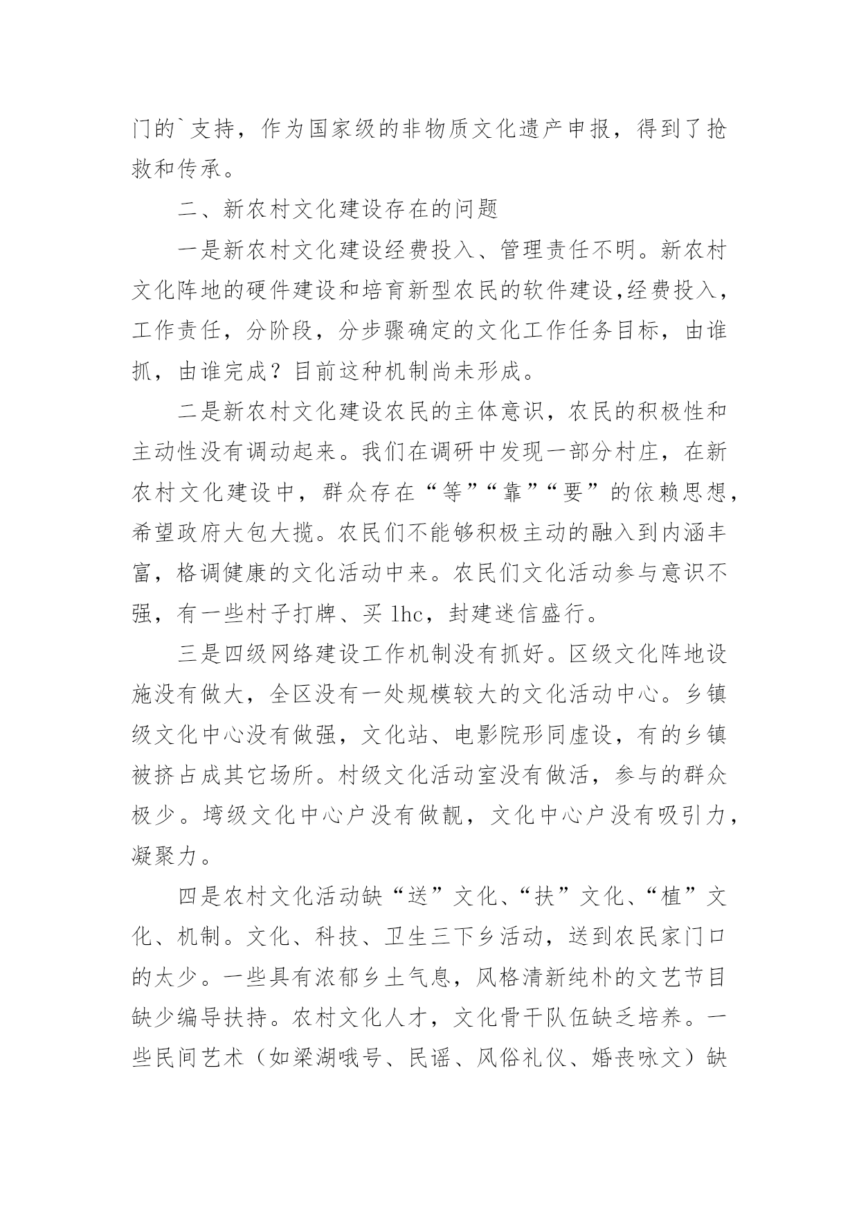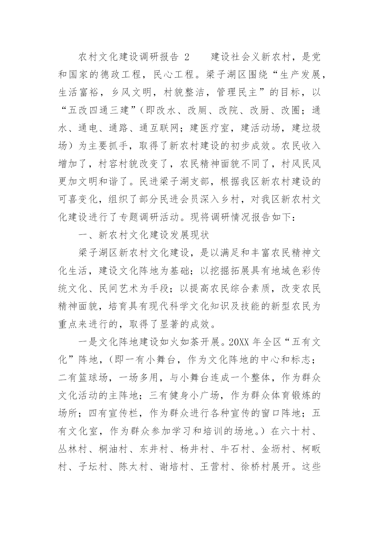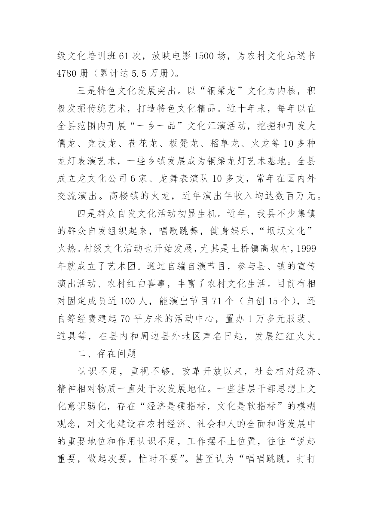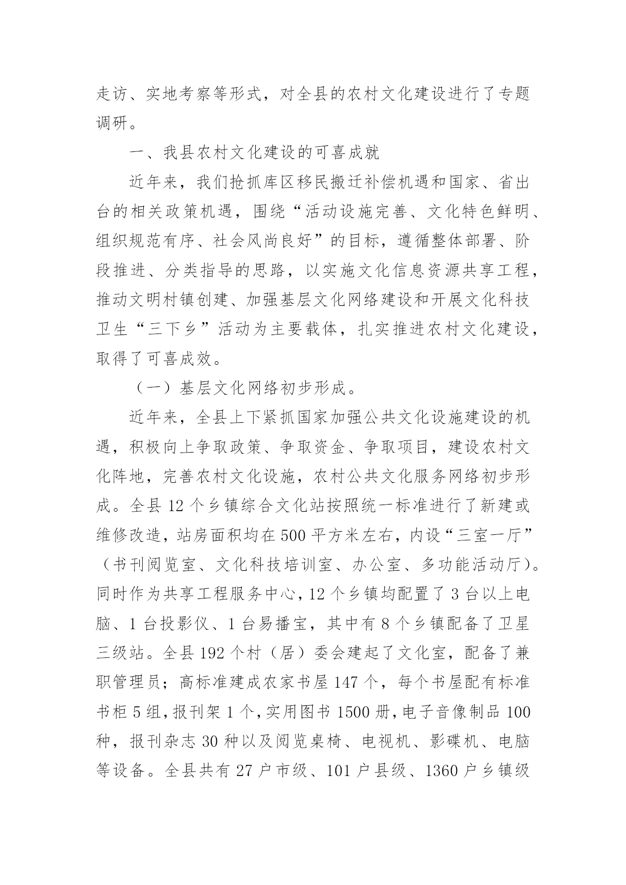 农村文化建设调研报告农村文化建设调研报告(精选16篇)随着社会一步步向前发展,报告使用的次数愈发增长,报告具有双向沟通性的特点。你还在对写报告感到一筹莫展吗?下面是小编收集整理的农村文化建设调研报告,欢迎大家分享。农村文化建设调研报告1实现全面小康奋斗目标,构建社会主义和谐社会,必须大力推进经济与社会、城市与农村协调发展。加强农村文化建设,对于丰富农村文化生活,促进农村文明进步,实现城乡共同发展具有重要的作用,也是当前农村需要重视和解决的问题。为此,县政协社会事业专委会就我县农村文化建设情况进行了调研。一、基本情况改革开放以来,我县农村文化建设得到较大发展。一是加强了基础建设。通过机构改革,全县33个乡镇均建立了文化体育服务中心,配备了专(兼)职文化干部35名,建村级文化活动室或阵地553个。各文体服务中心成立了比较稳定的文体协会、艺术团体,基本做到有组织,有活动。平滩镇、高楼镇近年还新建了文化综合楼,开办了图书室、电影院、文化茶园、文化娱乐室,添置了部分文化活动用品及体育健身器材,文化基础设施得到加强。二是文化活动开展较好。20xx年全县各乡镇共开展群众文体活动380场次,下基层(村、户)服务308场次,举办村级文化培训班61次,放映电影1500场,为农村文化站送书4780册(累计达5.5万册)。三是特色文化发展突出。以“铜梁龙”文化为内核,积极发掘传统艺术,打造特色文化精品。近十年来,每年以在全县范围内开展“一乡一品”文化汇演活动,挖掘和开发大儒龙、竞技龙、荷花龙、板凳龙、稻草龙、火龙等10多种龙灯表演艺术,一些乡镇发展成为铜梁龙灯艺术基地。全县成立龙文化公司6家、龙舞表演队10多支,常年在国内外交流演出。高楼镇的火龙,近年演出年收入均达数百万元。四是群众自发文化活动初显生机。近年,我县不少集镇的群众自发组织起来,唱歌跳舞,健身娱乐,“坝坝文化”火热。村级文化活动也开始发展,尤其是土桥镇高坡村,1999年就成立了艺术团。通过自编自演节目,参与县、镇的宣传演出活动、农村红白喜事,丰富了农村文化生活。目前有相对固定成员近100人,能演出节目71个(自创15个),还自筹经费建起70平方米的活动中心,置办1万多元服装、道具等,在县内和周边县外地区声名日起,发展红红火火。二、存在问题认识不足,重视不够。改革开放以来,社会相对经济、精神相对物质一直处于次发展地位。一些基层干部思想上文化意识弱化,存在“经济是硬指标,文化是软指标”的模糊观念,对文化建设在农村经济、社会和人的全面和谐发展中的重要地位和作用认识不足,工作摆不上位置,往往“说起重要,做起次要,忙时不要”。甚至认为“唱唱跳跳,打打闹闹”对“城市生活不可少,乡村可搞可不搞”。这是农村文化发展缓、不平衡的.重要原因。文化生活贫乏,难足群众之需。随着农村温饱线的跨越,以及科技对农业劳作的减轻,农民越来越不满足“日出而作、日落而息”的传统生活方式,渴望丰富多彩的精神文化生活,以满足娱乐、健身、求知、交流的需求。高坡村群众自发文化活动的勃兴就是很好的说明。但目前“高坡村”为数太少,多数农村的文化生活仍以看电视、打麻将、走庙子为主,不仅贫乏单调,还造成赌博、迷信等不良风气漫延,影响农村社会稳定和精神文明。投入太少,基础薄弱。目前农村文化建设投入主要以乡镇为主,而乡镇宥于捉襟见肘的财力和抓经济的压力,一是资金投入十分有限,处于“随意”状态。二是人力不足,尽管设有专兼职文化干部,但多数被统一调配做其它工作,并未专事文化。乡镇以上各级投入以“送”为主,送戏送书送电影等,群众看了则了,于基础建设不多。由此,导致农村文化设施严重不足。乡镇文化中心简陋,大多是一间房、几张桌椅、几本书,村文化室则挂牌而已,有名无实。群众文化活动缺场地,无器材,开展十分困难。同时现代传媒设施滞后,原有农村广播基本丧失、闭路电视覆盖户不足50%、网络更是一片空白,制约了农民对文化、科技的渴求,与市场、世界的联系。另一方面,文化工作缺人抓,组织开展的活动少,对群众自发的活动又扶持引导不力,发展基本处于“顺”其自然、良莠参杂、供不足需的状态。农村文化建设调研报告2建设社会义新农村,是党和国家的德政工程,民心工程。梁子湖区围绕“生产发展,生活富裕,乡风文明,村貌整洁,管理民主”的目标,以“五改四通三建”(即改水、改厕、改院、改厨、改圈;通水、通电、通路、通互联网;建医疗室,建活动场,建垃圾场)为主要抓手,取得了新农村建设的初步成效。农民收入增加了,村容村貌改变了,农民精神面貌不同了,村风民风更加文明和谐了。民进梁子湖支部,根据我区新农村建设的可喜变化,组织了部分民进会员深入乡村,对我区新农村文化建设进行了专题调研活动。现将调研情况报告如下:一、新农村文化建设发展现状梁子湖区新农村文化建设,是以满足和丰富农民精神文化生活,建设