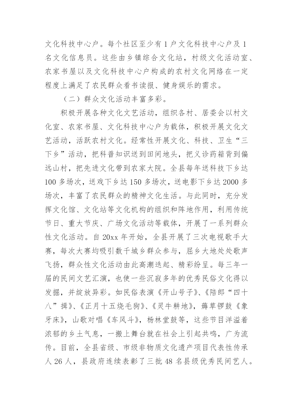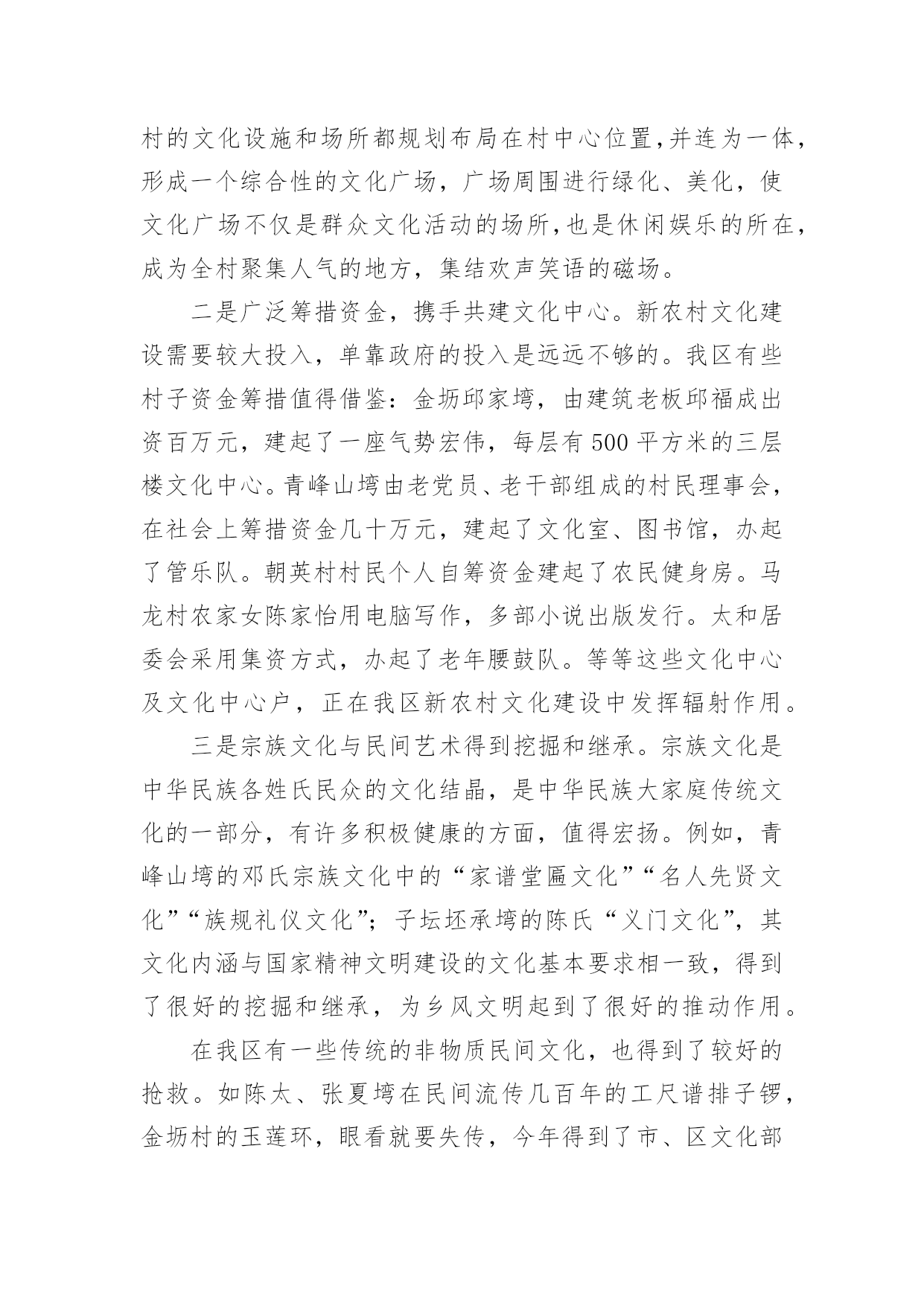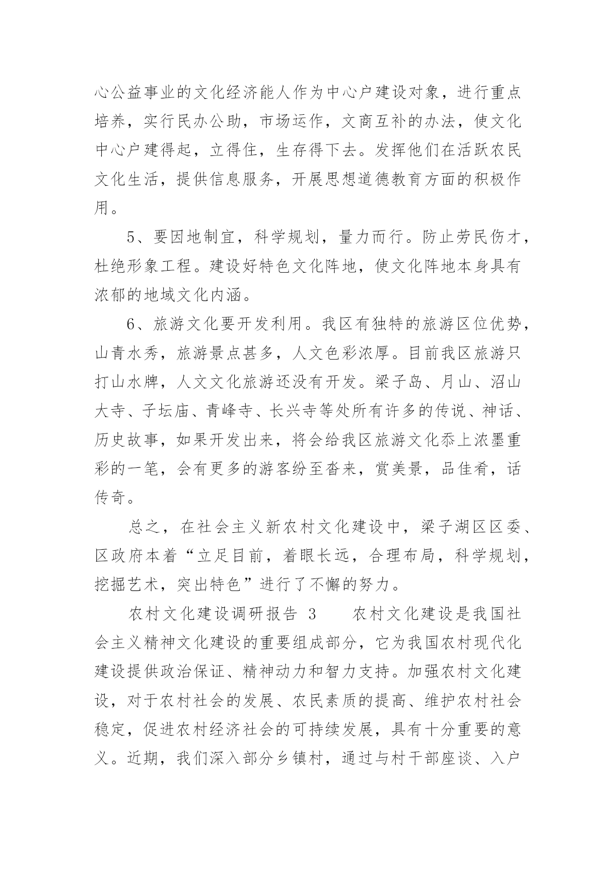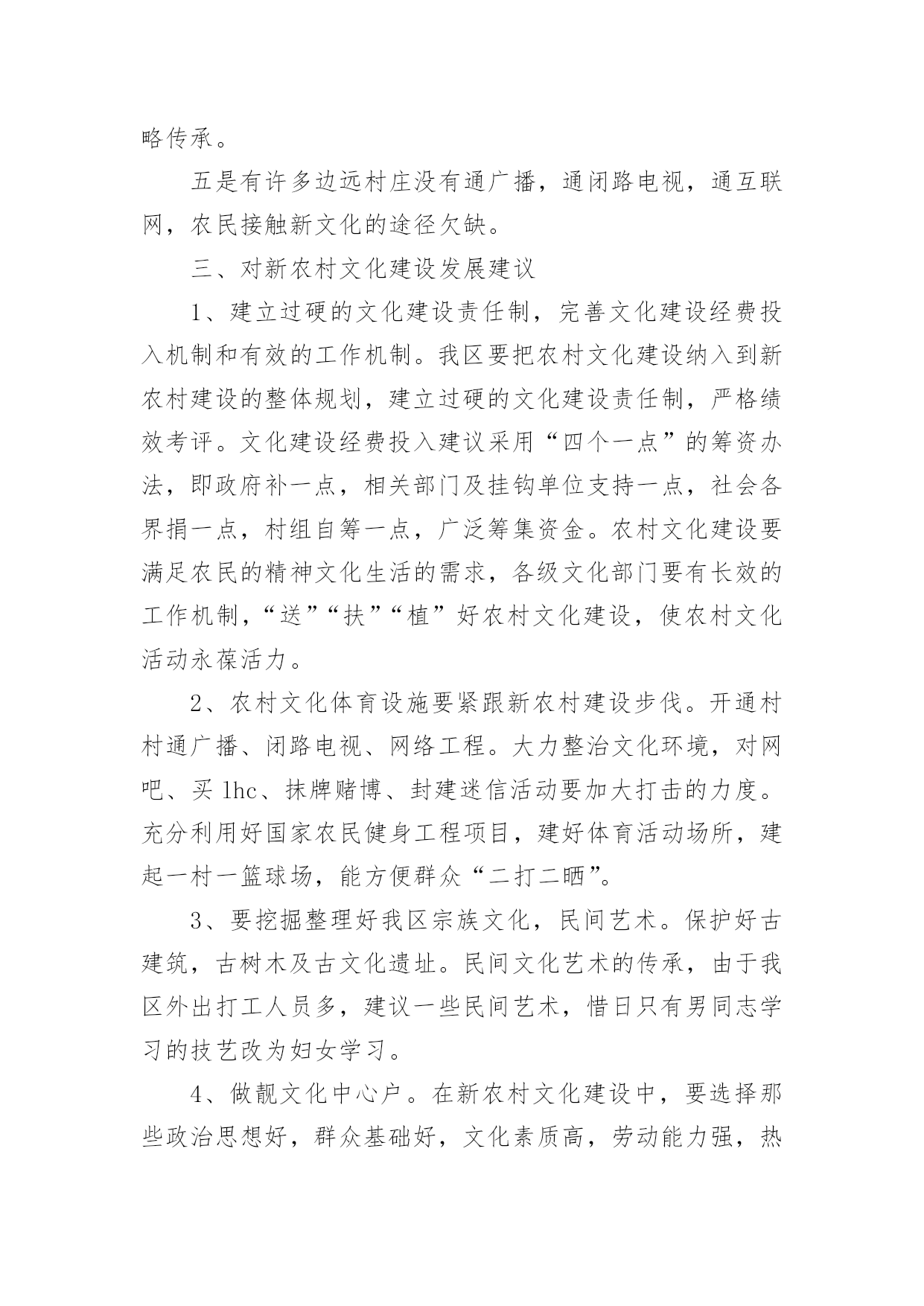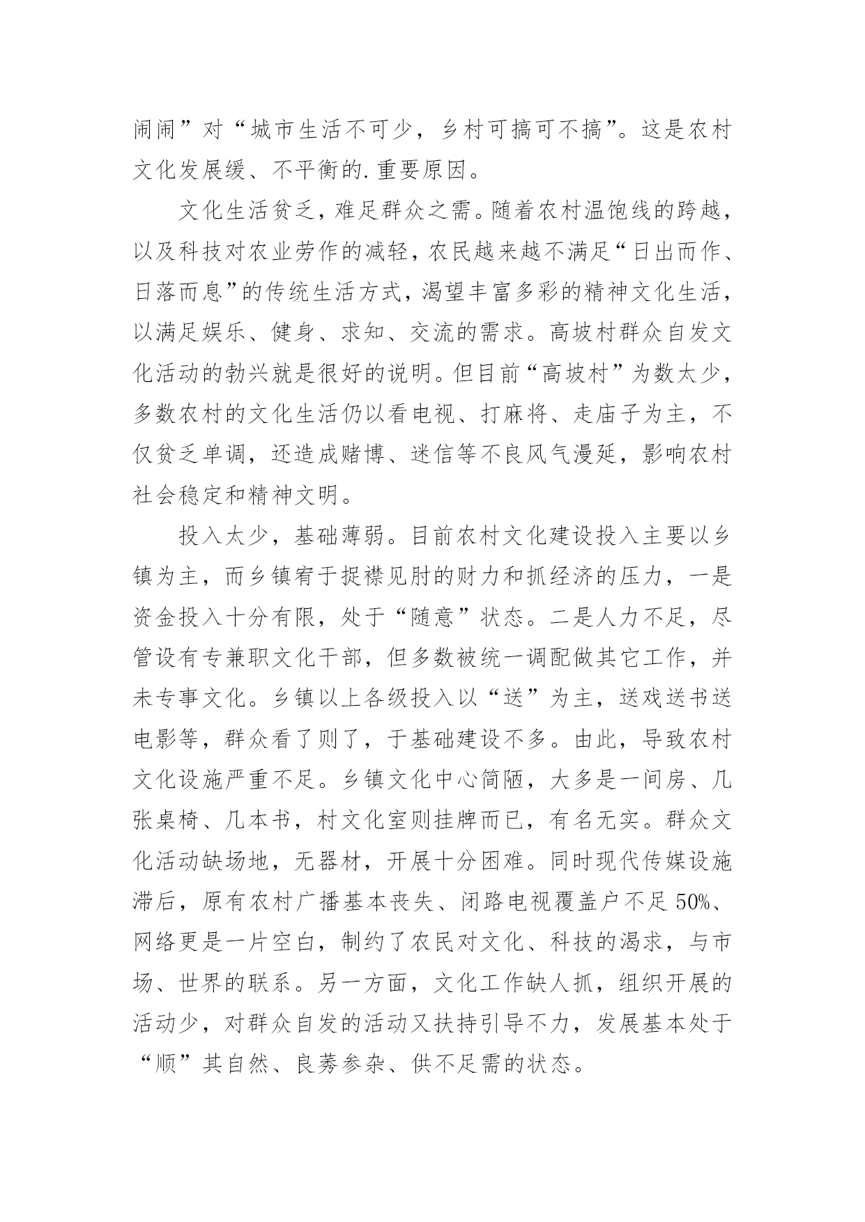 农村文化建设调研报告农村文化建设调研报告(精选16篇)随着社会一步步向前发展,报告使用的次数愈发增长,报告具有双向沟通性的特点。你还在对写报告感到一筹莫展吗?下面是小编收集整理的农村文化建设调研报告,欢迎大家分享。农村文化建设调研报告1实现全面小康奋斗目标,构建社会主义和谐社会,必须大力推进经济与社会、城市与农村协调发展。加强农村文化建设,对于丰富农村文化生活,促进农村文明进步,实现城乡共同发展具有重要的作用,也是当前农村需要重视和解决的问题。为此,县政协社会事业专委会就我县农村文化建设情况进行了调研。一、基本情况改革开放以来,我县农村文化建设得到较大发展。一是加强了基础建设。通过机构改革,全县33个乡镇均建立了文化体育服务中心,配备了专(兼)职文化干部35名,建村级文化活动室或阵地553个。各文体服务中心成立了比较稳定的文体协会、艺术团体,基本做到有组织,有活动。平滩镇、高楼镇近年还新建了文化综合楼,开办了图书室、电影院、文化茶园、文化娱乐室,添置了部分文化活动用品及体育健身器材,文化基础设施得到加强。二是文化活动开展较好。20xx年全县各乡镇共开展群众文体活动380场次,下基层(村、户)服务308场次,举办村级文化培训班61次,放映电影1500场,为农村文化站送书4780册(累计达5.5万册)。三是特色文化发展突出。以“铜梁龙”文化为内核,积极发掘传统艺术,打造特色文化精品。近十年来,每年以在全县范围内开展“一乡一品”文化汇演活动,挖掘和开发大儒龙、竞技龙、荷花龙、板凳龙、稻草龙、火龙等10多种龙灯表演艺术,一些乡镇发展成为铜梁龙灯艺术基地。全县成立龙文化公司6家、龙舞表演队10多支,常年在国内外交流演出。高楼镇的火龙,近年演出年收入均达数百万元。四是群众自发文化活动初显生机。近年,我县不少集镇的群众自发组织起来,唱歌跳舞,健身娱乐,“坝坝文化”火热。村级文化活动也开始发展,尤其是土桥镇高坡村,1999年就成立了艺术团。通过自编自演节目,参与县、镇的宣传演出活动、农村红白喜事,丰富了农村文化生活。目前有相对固定成员近100人,能演出节目71个(自创15个),还自筹经费建起70平方米的活动中心,置办1万多元服装、道具等,在县内和周边县外地区声名日起,发展红红火火。二、存在问题认识不足,重视不够。改革开放以来,社会相对经济、精神相对物质一直处于次发展地位。一些基层干部思想上文化意识弱化,存在“经济是硬指标,文化是软指标”的模糊观念,对文化建设在农村经济、社会和人的全面和谐发展中的重要地位和作用认识不足,工作摆不上位置,往往“说起重要,做起次要,忙时不要”。甚至认为“唱唱跳跳,打打闹闹”对“城市生活不可少,乡村可搞可不搞”。这是农村文化发展缓、不平衡的.重要原因。文化生活贫乏,难足群众之需。随着农村温饱线的跨越,以及科技对农业劳作的减轻,农民越来越不满足“日出而作、日落而息”的传统生活方式,渴望丰富多彩的精神文化生活,以满足娱乐、健身、求知、交流的需求。高坡村群众自发文化活动的勃兴就是很好的说明。但目前“高坡村”为数太少,多数农村的文化生活仍以看电视、打麻将、走庙子为主,不仅贫乏单调,还造成赌博、迷信等不良风气漫延,影响农村社会稳定和精神文明。投入太少,基础薄弱。目前农村文化建设投入主要以乡镇为主,而乡镇宥于捉襟见肘的财力和抓经济的压力,一是资金投入十分有限,处于“随意”状态。二是人力不足,尽管设有专兼职文化干部,但多数被统一调配做其它工作,并未专事文化。乡镇以上各级投入以“送”为主,送戏送书送电影等,群众看了则了,于基础建设不多。由此,导致农村文化设施严重不足。乡镇文化中心简陋,大多是一间房、几张桌椅、几本书,村文化室则挂牌而已,有名无实。群众文化活动缺场地,无器材,开展十分困难。同时现代传媒设施滞后,原有农村广播基本丧失、闭路电视覆盖户不足50%、网络更是一片空白,制约了农民对文化、科技的渴求,与市场、世界的联系。另一方面,文化工作缺人抓,组织开展的活动少,对群众自发的活动又扶持引导不力,发展基本处于“顺”其自然、良莠参杂、供不足需的状态。农村文化建设调研报告2建设社会义新农村,是党和国家的德政工程,民心工程。梁子湖区围绕“生产发展,生活富裕,乡风文明,村貌整洁,管理民主”的目标,以“五改四通三建”(即改水、改厕、改院、改厨、改圈;通水、通电、通路、通互联网;建医疗室,建活动场,建垃圾场)为主要抓手,取得了新农村建设的初步成效。农民收入增加了,村容村貌改变了,农民精神面貌不同了,村风民风更加文明和谐了。民进梁子湖支部,根据我区新农村建设的可喜变化,组织了部分民进会员深入乡村,对我区新农村文化建设进行了专题调研活动。现将调研情况报告如下:一、新农村文化建设发展现状梁子湖区新农村文化建设,是以满足和丰富农民精神文化生活,建设