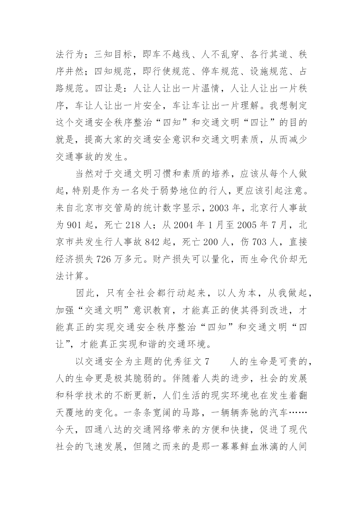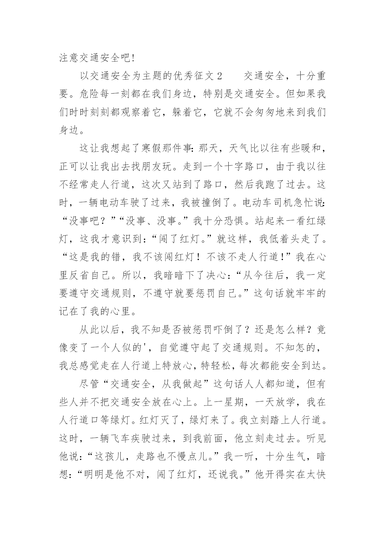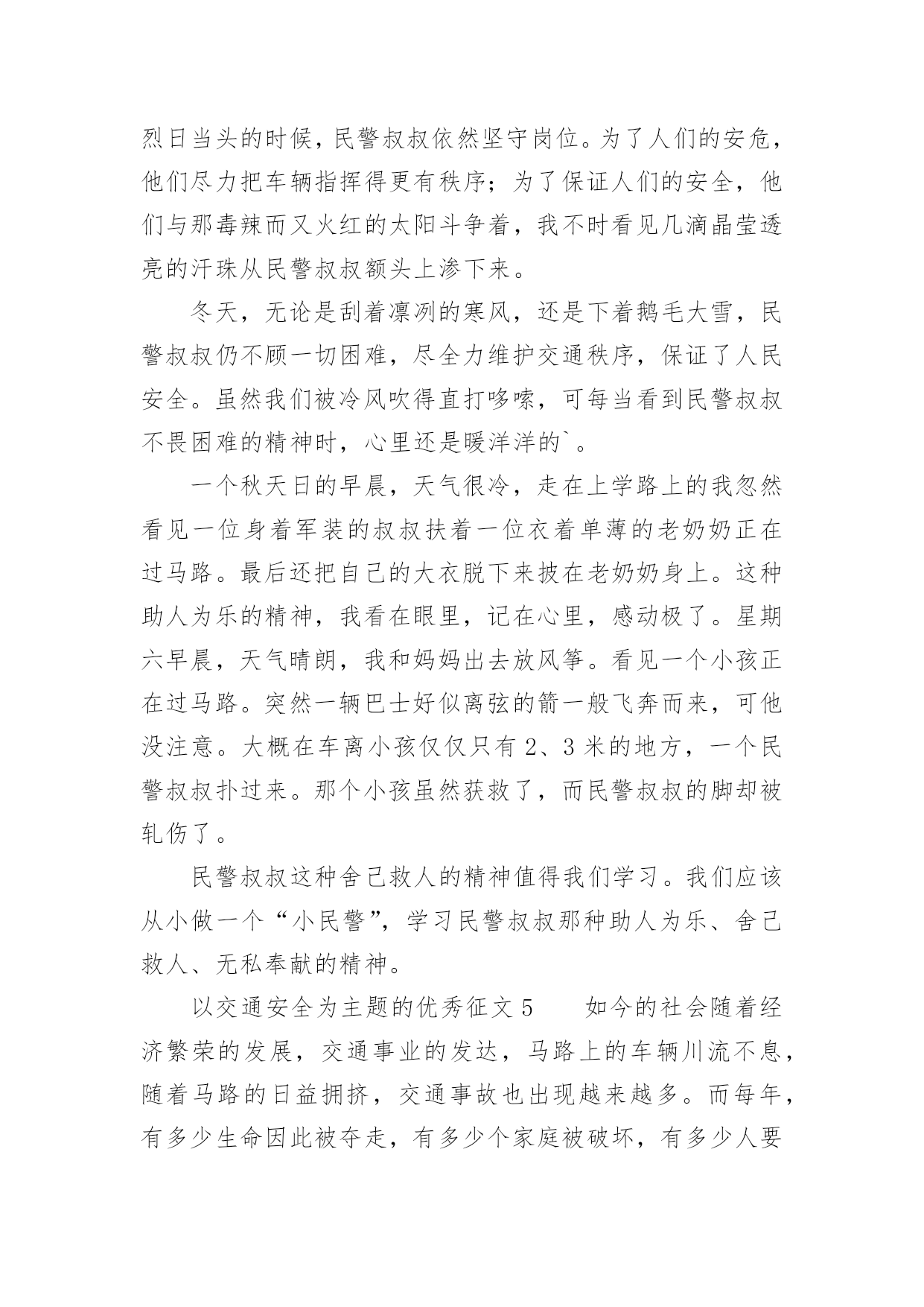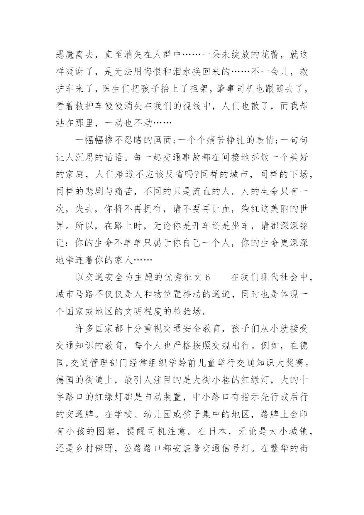 以交通安全为主题的优秀征文以交通安全为主题的优秀征文范文(精选23篇)在日常学习、工作或生活中,大家对征文都再熟悉不过了吧,征文一定要做到主题集中,围绕同一主题作深入阐述,切忌东拉西扯,主题涣散甚至无主题。那么一般征文是怎么写的呢?以下是小编整理的以交通安全为主题的优秀征文范文(精选23篇),欢迎大家分享。以交通安全为主题的优秀征文1交通事故,不仅给各个国家带来了巨大的损失,还给无数家庭带来无法弥补的巨大悲痛。去年的一个星期天,在学画画的路上,公共汽车开着开着,我不经意地向窗外一看,只见离我不远处的一个小十字路口,有一位和我差不多大的小孩倒在一片死气沉沉的血泊中,四周非常寂静,旁边一辆摔得破烂不堪的摩托车与小孩一样静静地躺在地上。这个小孩的脑袋一半都是鲜红的.血,连白色的头骨都能看得清清楚楚……这是多么严重的交通事故啊!可是周围没一个人愿意伸出他珍贵的援助之手,帮这位小孩一把,就连肇事司机也是居心叵测,一下子逃得无影无踪了。我想,这小孩长这么大花费了父母多少心血,寄托了父母多少希望。当他的父母看到原本活蹦乱跳的儿子,一瞬间变成一具冰冷的尸体,内心将是怎样的痛苦啊……出了交通事故,即使不失去宝贵的生命,也会让人遭受很大的创伤。在我们学校就发生了这样的一件事。今年10月11日,我们学校刚刚放学,有一位二年级的同学,他不排“路队”,独自一人大胆地跑过马路。突然,不幸的事发生了:一辆飞驰而来的摩托车“刷”地一声将这位同学撞飞了!只见他倒在地上,头上裂开了一个大口子,鲜血大滴大滴地流出来。他那被车压得破破烂烂的鞋子离他有五六米远,鞋上都是泥巴,而另一只却不知掉到哪儿去了。许多好心人围在旁边议论纷纷。这位小同学曲着身子,大口大口地喘着气。看着他这样的难受,我们是多么的同情啊,可是爱莫能助。过了一段时间,救护车将他送到了医院。后来,听说这位小同学手骨和脚骨都被摔断了。可以想象,这起事故不仅影响了他的学习,给他的家庭带来了巨大的经济损失,还给他幼小的心灵留下了一道多么深刻的疤痕啊!确实,交通危险时时存在,我们要处处小心。有一次,我和一位同学走在放学的路上,边走边说笑,正当我们讲得津津有味的时候,忽然,一辆大卡车疾驶过来,幸亏这位同学躲闪及时,大卡车也“哧”的一声转了个大弯,同学才安全。司机探出头,斥责我和这位同学:“不想活啦,小王八!”我对这位司机的话刻肌刻骨,永志不忘。现在我明白了,老师教导我们在上学和放学的路上,不能说说笑笑、追追打打、横冲直撞,这不是开玩笑的。小朋友们,为了让我们的生命得到保障,大家行动起来,注意交通安全吧!以交通安全为主题的优秀征文2交通安全,十分重要。危险每一刻都在我们身边,特别是交通安全。但如果我们时时刻刻都观察着它,躲着它,它就不会匆匆地来到我们身边。这让我想起了寒假那件事:那天,天气比以往有些暖和,正可以让我出去找朋友玩。走到一个十字路口,由于我以往不经常走人行道,这次又站到了路口,然后我跑了过去。这时,一辆电动车驶了过来,我被撞倒了。电动车司机急忙说:“没事吧?”“没事、没事。”我十分恐惧。站起来一看红绿灯,这我才意识到:“闯了红灯。”就这样,我低着头走了。“这是我的错,我不该闯红灯!不该不走人行道!”我在心里反省自己。所以,我暗暗下了决心:“从今往后,我一定要遵守交通规则,不遵守就要惩罚自己。”这句话就牢牢的记在了我的心里。从此以后,我不知是否被惩罚吓倒了?还是怎么样?竟像变了一个人似的',自觉遵守起了交通规则。不知怎的,我总感觉走在人行道上特放心,特轻松,每次都能安全到达。尽管“交通安全,从我做起”这句话人人都知道,但有些人并不把交通安全放在心上。上一星期,一天放学,我在人行道口等绿灯。红灯灭了,绿灯来了。我立刻踏上人行道。这时,一辆飞车疾驶过来,到我前面,他立刻走过去。听见他说:“这孩儿,走路也不慢点儿。”我一听,十分生气,暗想:“明明是他不对,闯了红灯,还说我。”他开得实在太快了,来不及刹车,还闯了红灯呢。交通安全,非常重要。只要遵守,生命就多了一次。以交通安全为主题的优秀征文3珍惜现在,珍惜所有,注重消防,远离危险。——题记在在这信息高度发展的时代,人们全身心地投入工作、学习、研究,对自身的安全与健康很容易忽视。电视新闻频频报道出的各种消防事故,真是骇人听闻啊!每每亲眼目睹大火肆虐那华丽的高楼,吞噬那可怜的人儿,心里不禁袭来一阵寒意,叹惋之情油然而生。每每听闻瓦斯爆炸、煤气中毒、触电身亡等悲剧时,浑身就不自觉得有点儿抽搐,仿佛自己即将遭受同等恶果……为何消防事故此起彼伏,无法平息?为何人们面对这一幕幕习以为常了的景状,仍会有强烈的反响呢?勿庸置疑的是,这些与我国公民不高的'素质,浅显的消防意识以及社会中不够完善的消防设施息息相关。因而,国家对消防问题的重视首先着手于提高公民的消防意识,完善公共场