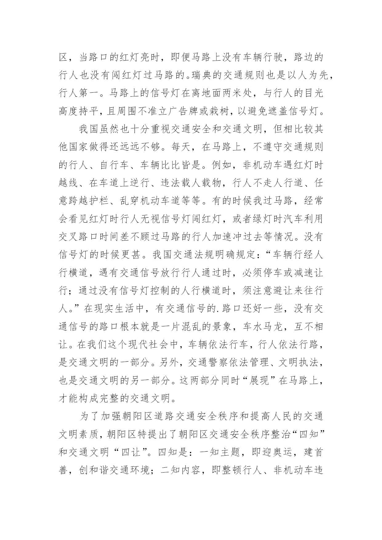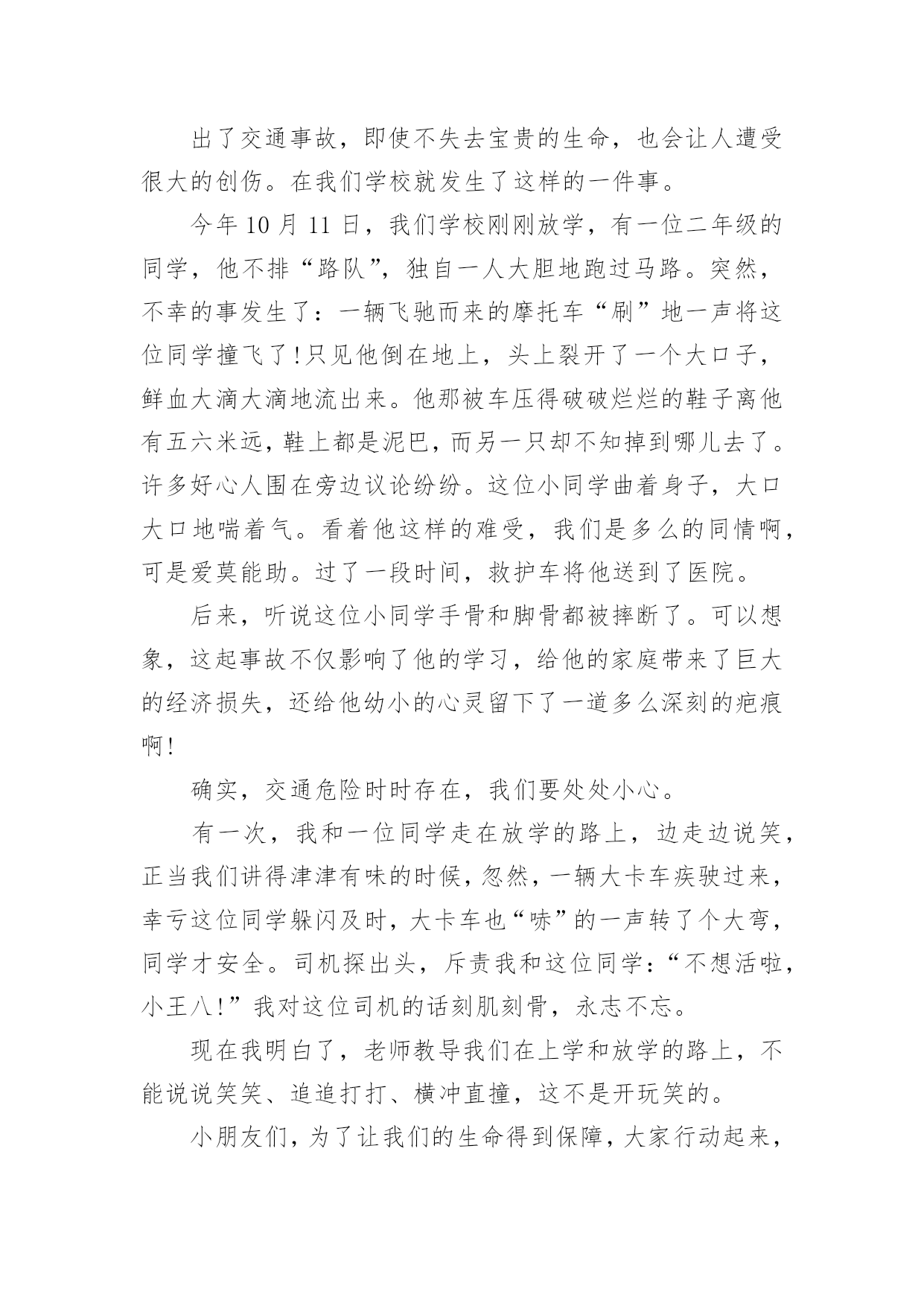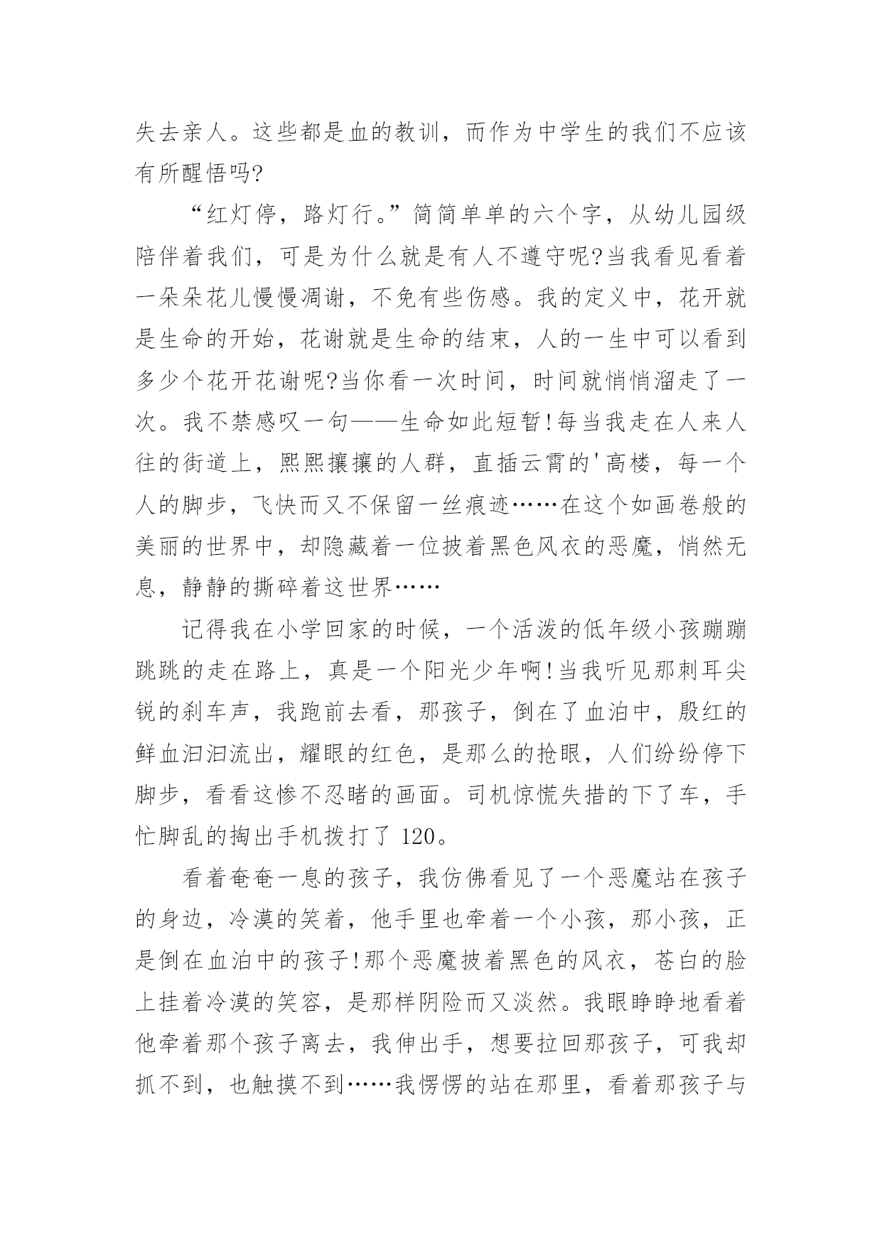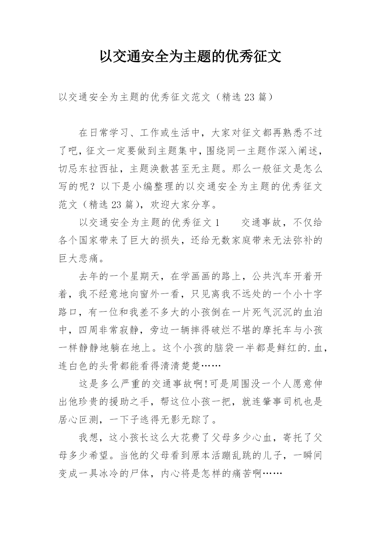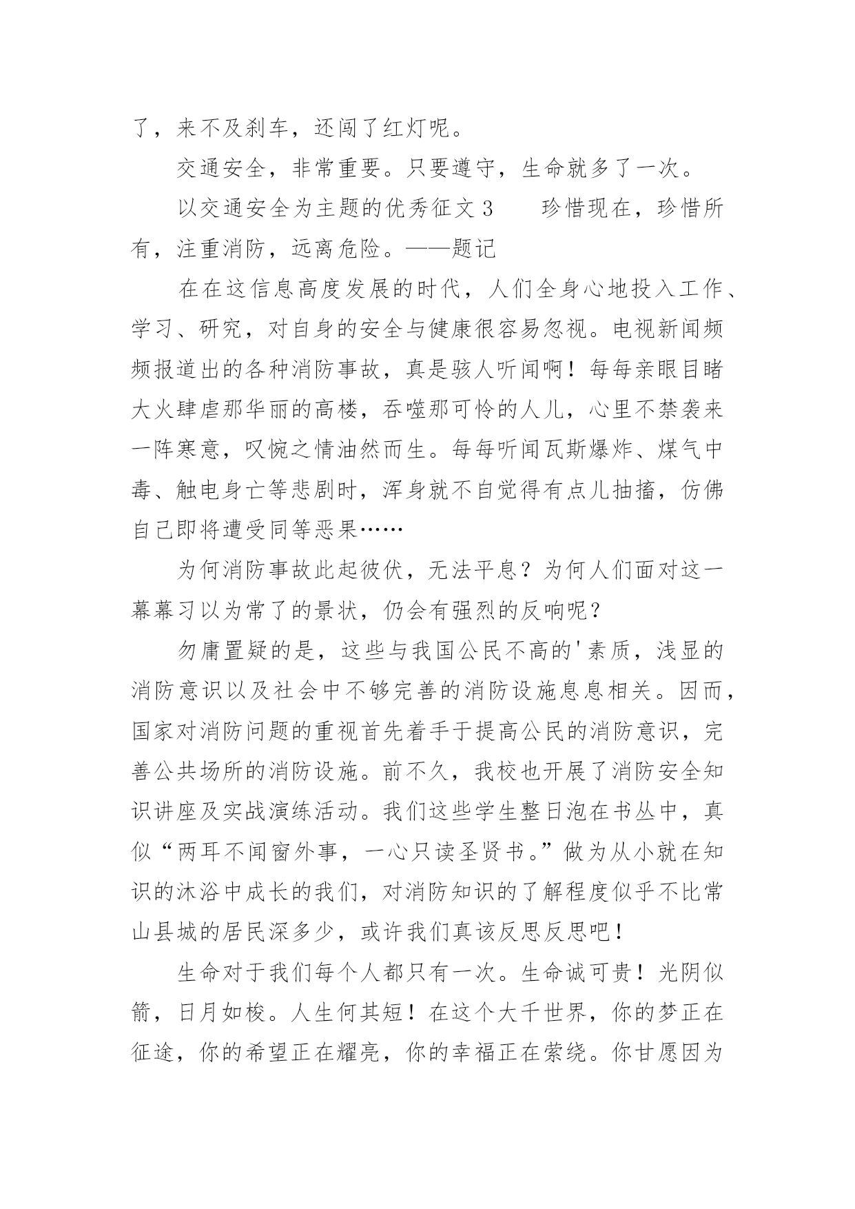 以交通安全为主题的优秀征文以交通安全为主题的优秀征文范文(精选23篇)在日常学习、工作或生活中,大家对征文都再熟悉不过了吧,征文一定要做到主题集中,围绕同一主题作深入阐述,切忌东拉西扯,主题涣散甚至无主题。那么一般征文是怎么写的呢?以下是小编整理的以交通安全为主题的优秀征文范文(精选23篇),欢迎大家分享。以交通安全为主题的优秀征文1交通事故,不仅给各个国家带来了巨大的损失,还给无数家庭带来无法弥补的巨大悲痛。去年的一个星期天,在学画画的路上,公共汽车开着开着,我不经意地向窗外一看,只见离我不远处的一个小十字路口,有一位和我差不多大的小孩倒在一片死气沉沉的血泊中,四周非常寂静,旁边一辆摔得破烂不堪的摩托车与小孩一样静静地躺在地上。这个小孩的脑袋一半都是鲜红的.血,连白色的头骨都能看得清清楚楚……这是多么严重的交通事故啊!可是周围没一个人愿意伸出他珍贵的援助之手,帮这位小孩一把,就连肇事司机也是居心叵测,一下子逃得无影无踪了。我想,这小孩长这么大花费了父母多少心血,寄托了父母多少希望。当他的父母看到原本活蹦乱跳的儿子,一瞬间变成一具冰冷的尸体,内心将是怎样的痛苦啊……出了交通事故,即使不失去宝贵的生命,也会让人遭受很大的创伤。在我们学校就发生了这样的一件事。今年10月11日,我们学校刚刚放学,有一位二年级的同学,他不排“路队”,独自一人大胆地跑过马路。突然,不幸的事发生了:一辆飞驰而来的摩托车“刷”地一声将这位同学撞飞了!只见他倒在地上,头上裂开了一个大口子,鲜血大滴大滴地流出来。他那被车压得破破烂烂的鞋子离他有五六米远,鞋上都是泥巴,而另一只却不知掉到哪儿去了。许多好心人围在旁边议论纷纷。这位小同学曲着身子,大口大口地喘着气。看着他这样的难受,我们是多么的同情啊,可是爱莫能助。过了一段时间,救护车将他送到了医院。后来,听说这位小同学手骨和脚骨都被摔断了。可以想象,这起事故不仅影响了他的学习,给他的家庭带来了巨大的经济损失,还给他幼小的心灵留下了一道多么深刻的疤痕啊!确实,交通危险时时存在,我们要处处小心。有一次,我和一位同学走在放学的路上,边走边说笑,正当我们讲得津津有味的时候,忽然,一辆大卡车疾驶过来,幸亏这位同学躲闪及时,大卡车也“哧”的一声转了个大弯,同学才安全。司机探出头,斥责我和这位同学:“不想活啦,小王八!”我对这位司机的话刻肌刻骨,永志不忘。现在我明白了,老师教导我们在上学和放学的路上,不能说说笑笑、追追打打、横冲直撞,这不是开玩笑的。小朋友们,为了让我们的生命得到保障,大家行动起来,注意交通安全吧!以交通安全为主题的优秀征文2交通安全,十分重要。危险每一刻都在我们身边,特别是交通安全。但如果我们时时刻刻都观察着它,躲着它,它就不会匆匆地来到我们身边。这让我想起了寒假那件事:那天,天气比以往有些暖和,正可以让我出去找朋友玩。走到一个十字路口,由于我以往不经常走人行道,这次又站到了路口,然后我跑了过去。这时,一辆电动车驶了过来,我被撞倒了。电动车司机急忙说:“没事吧?”“没事、没事。”我十分恐惧。站起来一看红绿灯,这我才意识到:“闯了红灯。”就这样,我低着头走了。“这是我的错,我不该闯红灯!不该不走人行道!”我在心里反省自己。所以,我暗暗下了决心:“从今往后,我一定要遵守交通规则,不遵守就要惩罚自己。”这句话就牢牢的记在了我的心里。从此以后,我不知是否被惩罚吓倒了?还是怎么样?竟像变了一个人似的',自觉遵守起了交通规则。不知怎的,我总感觉走在人行道上特放心,特轻松,每次都能安全到达。尽管“交通安全,从我做起”这句话人人都知道,但有些人并不把交通安全放在心上。上一星期,一天放学,我在人行道口等绿灯。红灯灭了,绿灯来了。我立刻踏上人行道。这时,一辆飞车疾驶过来,到我前面,他立刻走过去。听见他说:“这孩儿,走路也不慢点儿。”我一听,十分生气,暗想:“明明是他不对,闯了红灯,还说我。”他开得实在太快了,来不及刹车,还闯了红灯呢。交通安全,非常重要。只要遵守,生命就多了一次。以交通安全为主题的优秀征文3珍惜现在,珍惜所有,注重消防,远离危险。——题记在在这信息高度发展的时代,人们全身心地投入工作、学习、研究,对自身的安全与健康很容易忽视。电视新闻频频报道出的各种消防事故,真是骇人听闻啊!每每亲眼目睹大火肆虐那华丽的高楼,吞噬那可怜的人儿,心里不禁袭来一阵寒意,叹惋之情油然而生。每每听闻瓦斯爆炸、煤气中毒、触电身亡等悲剧时,浑身就不自觉得有点儿抽搐,仿佛自己即将遭受同等恶果……为何消防事故此起彼伏,无法平息?为何人们面对这一幕幕习以为常了的景状,仍会有强烈的反响呢?勿庸置疑的是,这些与我国公民不高的'素质,浅显的消防意识以及社会中不够完善的消防设施息息相关。因而,国家对消防问题的重视首先着手于提高公民的消防意识,完善公共场