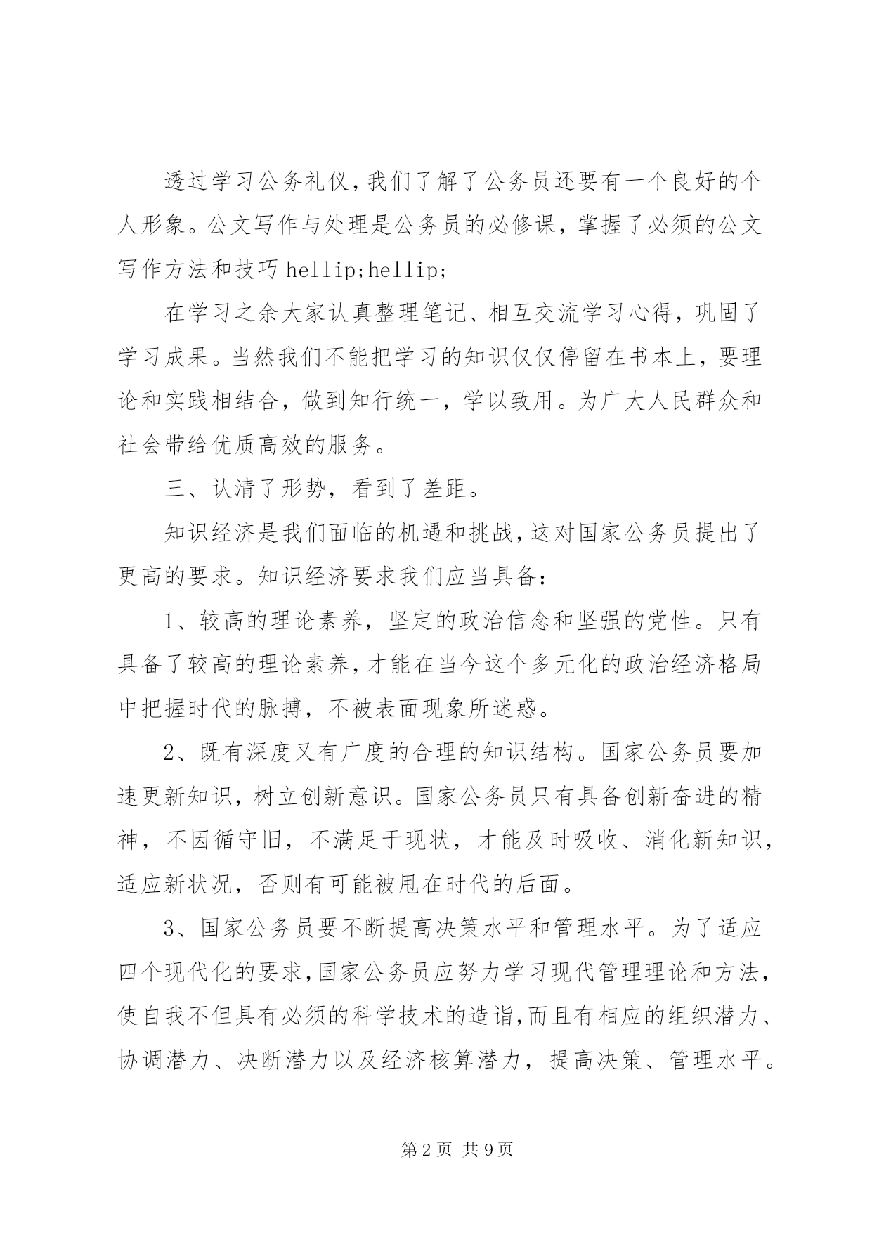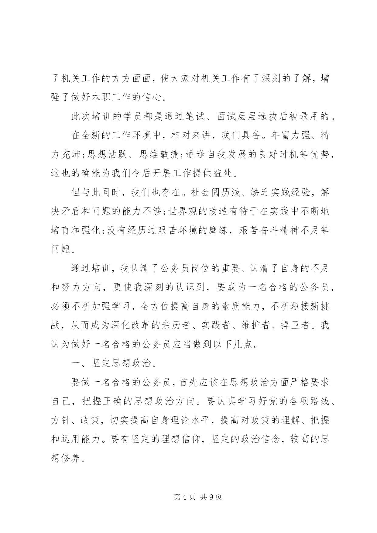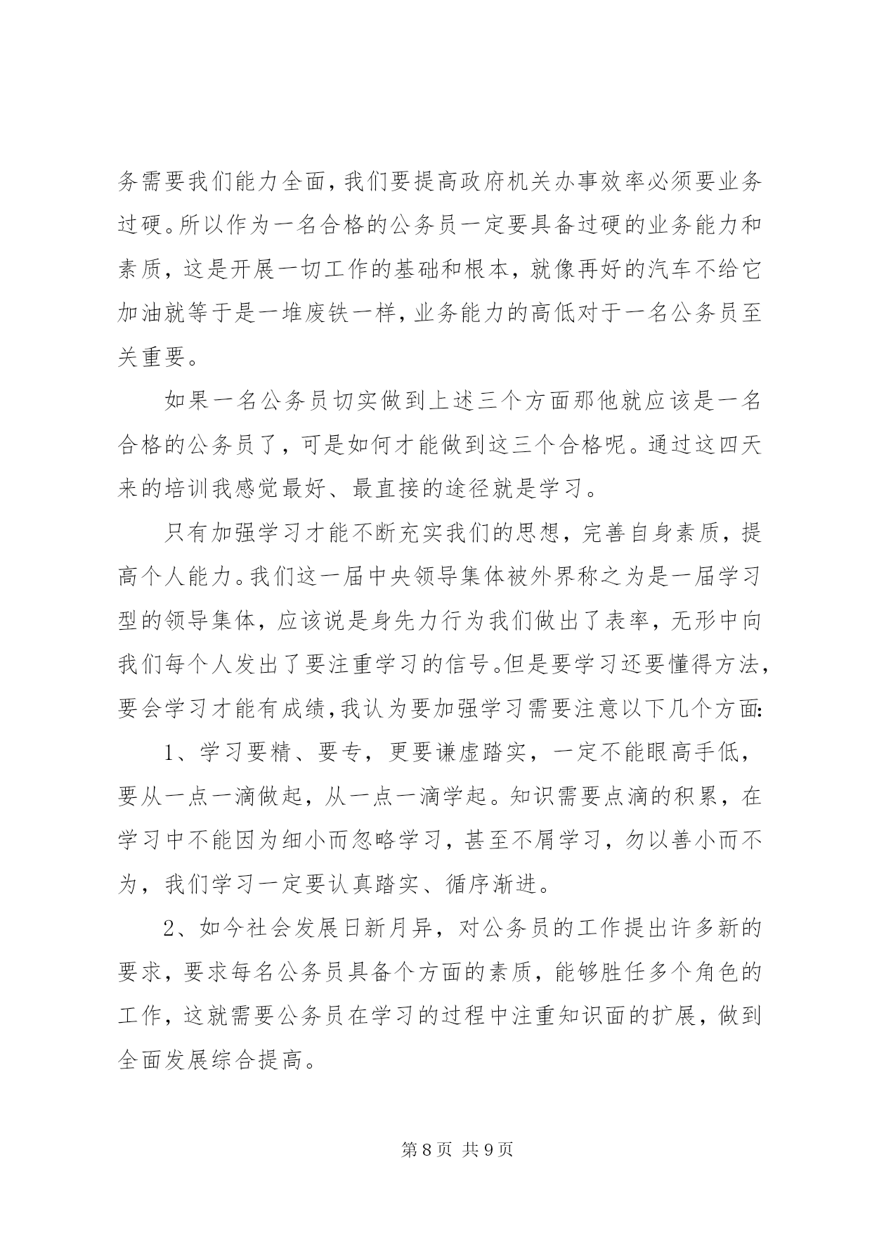 第PAGE\*Arabic\*MERGEFORMAT9页共NUMPAGES\*MERGEFORMAT9页初任公务员培训心得体会新录用公务员初任培训心得体会1在公务员初任培训这段时光里,在培训学校领导和老师的精心组织下,我始终以高昂的热情、严谨的态度全身心地投入到学习当中去,比较好的完成了培训任务,培训之后收获很多。一、明确了主角,提高了认识。透过学习培训,我深刻认识到作为一个国家公务员为人民服务并不是一件简单的事情,不仅仅要有主观上的热情和干劲,还要求有扎实的业务知识和作为公务员务必具备的潜力,才能到达为人民服务的要求才不会被人民淘汰。首先,公务员务必是人民的公仆,而不是凌驾于人民头上的官,我们最主要的目标就是为人民群众带给最大、最多、最好的服务。第二,公务员队伍务必是一个高效的团队。在高度的服从之下的同时,也要具有必须的能动决定潜力。高效还要求公务员精通业务知识和行政知识,具备较强的协调潜力,并且这些知识和潜力也要随时代的快速发展而不断更新。所以一名合格的公务员务必有较强的学习潜力和强劲的动力。二、增长了知识和见识,提高了潜力。为了让我们尽快地掌握为履行职责所务必的基本知识,为今后的工作做好准备。透过学习公务员法,我们了解了公务员的权利和义务。透过学习公务礼仪,我们了解了公务员还要有一个良好的个人形象。公文写作与处理是公务员的必修课,掌握了必须的公文写作方法和技巧hellip;hellip;在学习之余大家认真整理笔记、相互交流学习心得,巩固了学习成果。当然我们不能把学习的知识仅仅停留在书本上,要理论和实践相结合,做到知行统一,学以致用。为广大人民群众和社会带给优质高效的服务。三、认清了形势,看到了差距。知识经济是我们面临的机遇和挑战,这对国家公务员提出了更高的要求。知识经济要求我们应当具备:1、较高的理论素养,坚定的政治信念和坚强的党性。只有具备了较高的理论素养,才能在当今这个多元化的政治经济格局中把握时代的脉搏,不被表面现象所迷惑。2、既有深度又有广度的合理的知识结构。国家公务员要加速更新知识,树立创新意识。国家公务员只有具备创新奋进的精神,不因循守旧,不满足于现状,才能及时吸收、消化新知识,适应新状况,否则有可能被甩在时代的后面。3、国家公务员要不断提高决策水平和管理水平。为了适应四个现代化的要求,国家公务员应努力学习现代管理理论和方法,使自我不但具有必须的科学技术的造诣,而且有相应的组织潜力、协调潜力、决断潜力以及经济核算潜力,提高决策、管理水平。四、学员之间增进了了解,建立了深厚的友谊。我们这些学员有的是市里的各部门、有的是镇乡街道,大家来自各个不一样的单位和岗位,这次培训是难得的沟通和交流的机会。在这十多天的时光里,我们互相关心,互相帮忙,互相学习,大家增进了了解建立了深厚的友谊。本次初任培训虽然时光短暂,却有着重要的好处。初任培训只是打下了一个理论基础,今后工作中将遇到的各种问题和各种复杂状况我将用心做到:一是要加强学习,坚持谦虚谨慎的作风。不断加强政治理论的学习,加强法律知识的学习和行政管理等知识的学习,提高自我的理论素养、知识水平和实践潜力。二是要增强为人民服务的意识。时刻牢记为人民服务的宗旨。要牢固树立立党为公,执政为民的观念,树立正确的权力观,增强廉政意识,严格自律。努力成为贴合人民不断提高的要求的国家公务员,为社会主义建设事业做出应有的贡献。新录用公务员初任培训心得体会2作为20xx新录用公务员,有幸参加了新录用公务员初任培训学习,认真系统地学习了由市人社局有关领导和党校老师就十x届x中全会关于全面深化改革的相关精神、公务员职业道德建设、公务员公文写作、公务员行为规范与政务礼仪、公务员党风廉政建设及应对突发事件知识等各方面领域理论知识,内容涵盖了机关工作的方方面面,使大家对机关工作有了深刻的了解,增强了做好本职工作的信心。此次培训的学员都是通过笔试、面试层层选拔后被录用的。在全新的工作环境中,相对来讲,我们具备。年富力强、精力充沛;思想活跃、思维敏捷;适逢自我发展的良好时机等优势,这也的确能为我们今后开展工作提供益处。但与此同时,我们也存在。社会阅历浅、缺乏实践经验,解决矛盾和问题的能力不够;世界观的改造有待于在实践中不断地培育和强化;没有经历过艰苦环境的磨练,艰苦奋斗精神不足等问题。通过培训,我认清了公务员岗位的重要、认清了自身的不足和努力方向,更使我深刻的认识到,要成为一名合格的公务员,必须不断加强学习,全方位提高自身的素质能力,不断迎接新挑战,从而成为深化改革的亲历者、实践者、维护者、捍卫者。我认为做好一名合格的公务员应当做到以下几点。一、坚定思想政治。要做一名合格的公务员,首先应该在思想政治方面严格要求自己,把握正确的思想政治方向。要认真学习好党的各项路线、方针、政策,