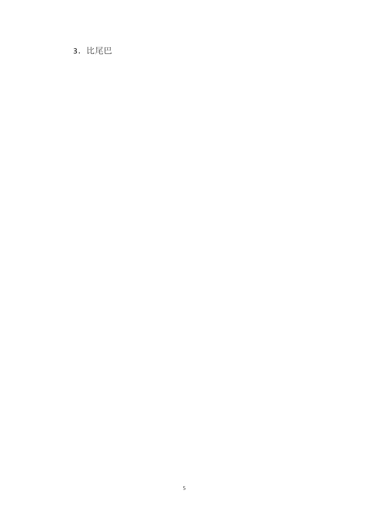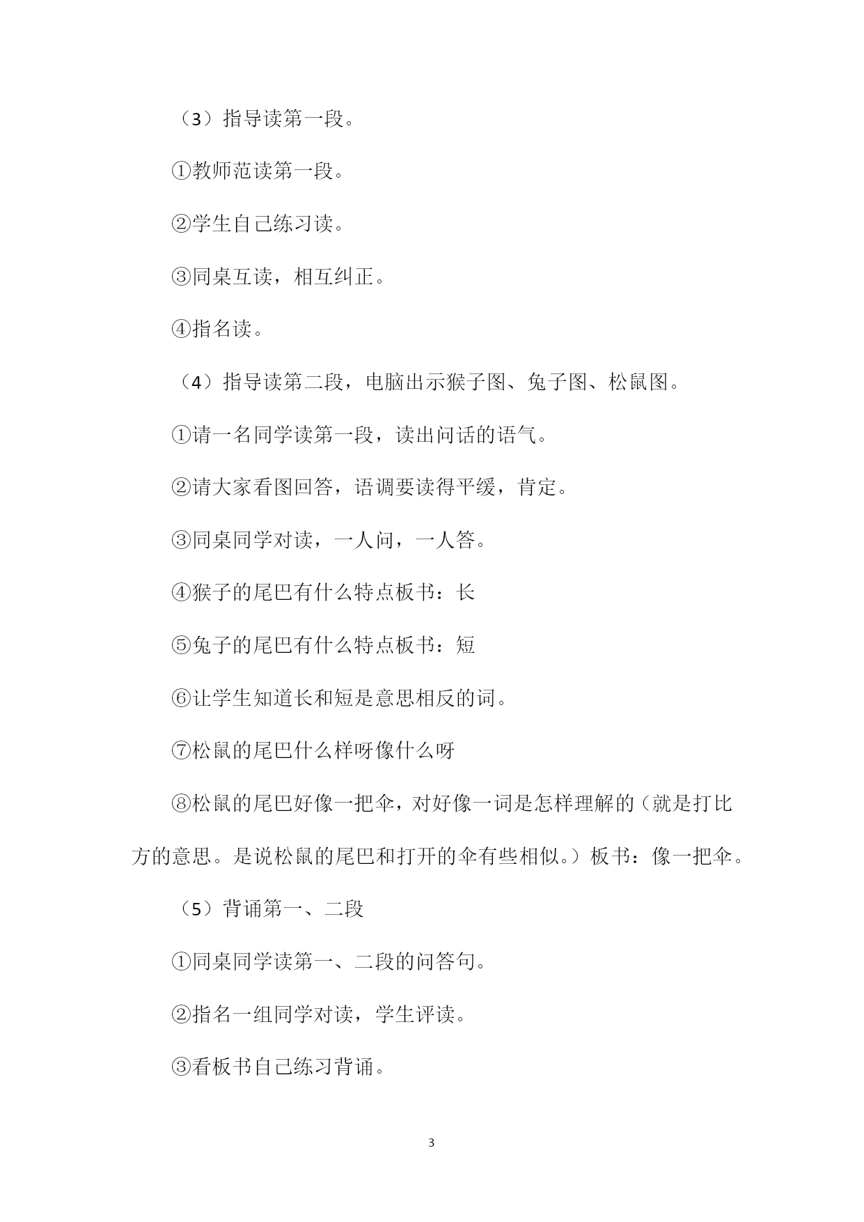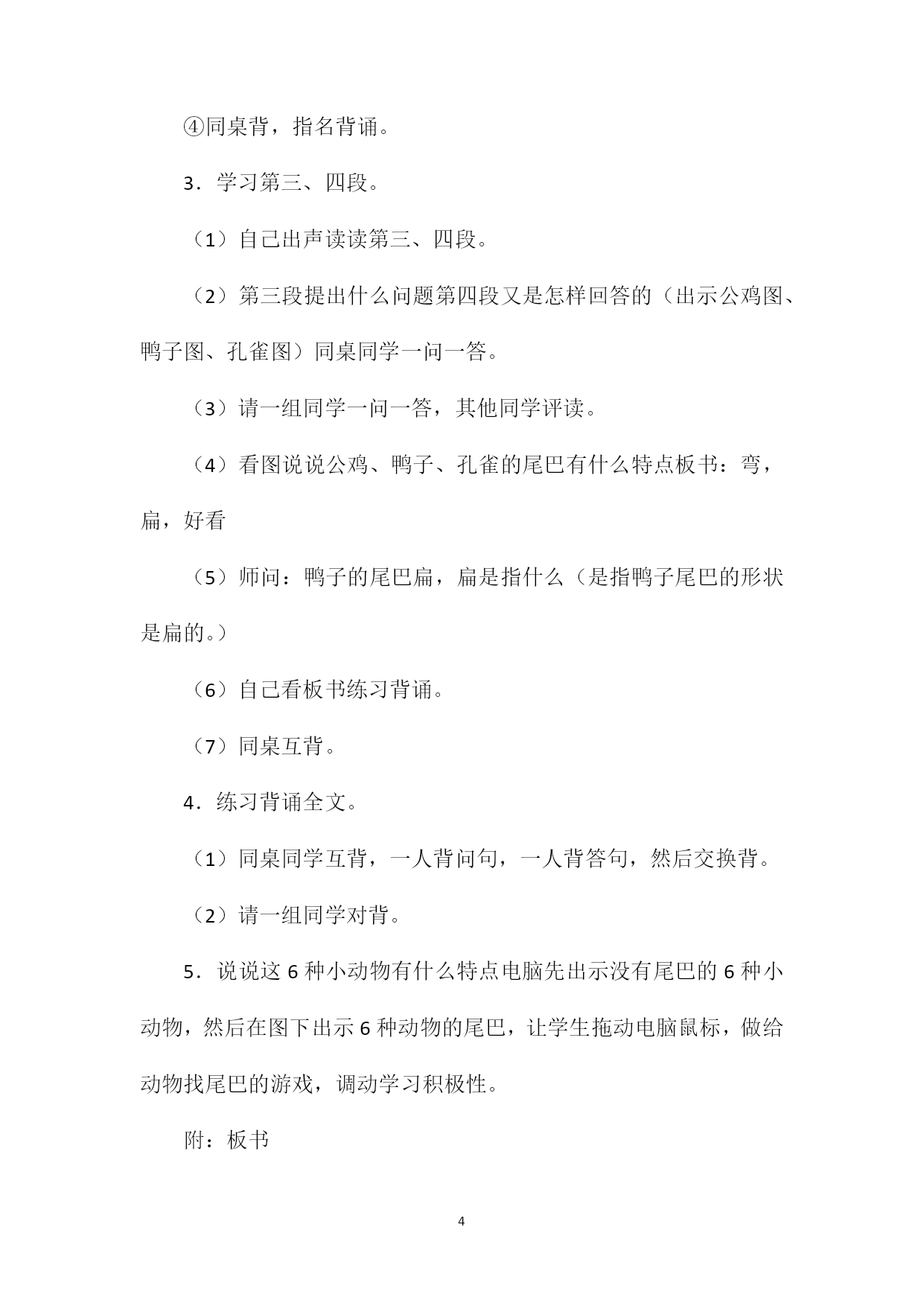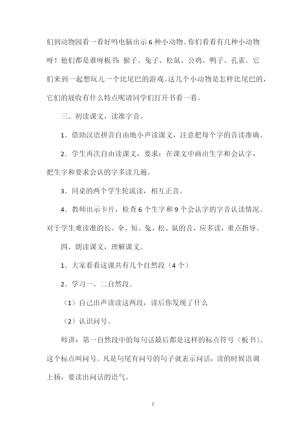 PAGEPAGE5《比尾巴》教学设计一第一课时教学目标:1.认识6个生字和9个认读字。2.正确地朗读课文,学会朗读疑问语气的句子,背诵课文。3.知道课文写了哪几种小动物,并了解它们尾巴的特点。教学重点:1.正确地朗读课文,学会朗读疑问语气的句子,背诵课文。2.知道课文写了哪几种小动物,并了解它们尾巴的特点。教学难点:1.学会朗读疑问语气的句子。2.了解动物尾巴的特点。教学过程:一、复习检查1.出示音节:shu0du3nxi4ngbi3nqu8zu@2.读字卡片:子二、谈话导入电脑出示北京动物园门口图。你们看这是哪儿呀!老师今天带你们到动物园看一看好吗电脑出示6种小动物。你们看看有几种小动物呀!他们都是谁呀板书:猴子、兔子、松鼠、公鸡、鸭子、孔雀。它们来到一起想玩儿一个比尾巴的游戏。这几个小动物是怎样比尾巴的,它们的屐收有什么特点呢请同学们打开书看一看。三、初读课文,读准字音。1.借助汉语拼音自由地小声读课文,注意把每个字的音读准确。2.学生再次自由读课文,要求:在课文中画出生字和会认字,把生字和要求会认的字多读几遍。3.同桌的两个学生轮流读,相互正音。4.教师出示卡片,检查6个生字和9个会认字的字音认读情况。对于学生难读准的长、伞、短、兔、松、鼠的音,应多读,重点指导。四、朗读课文,理解课文。1.大家看看这课共有几个自然段(4个)2.学习一、二自然段。(1)自己出声读读这两段,读后你发现了什么(2)认识问号。师讲:第一自然段中的每句话最后都是这样的标点符号(板书)。这个标点叫问号。凡是句尾有问号的句子就表示问话,读的时候语调上扬,要读出问话的语气。(3)指导读第一段。①教师范读第一段。②学生自己练习读。③同桌互读,相互纠正。④指名读。(4)指导读第二段,电脑出示猴子图、兔子图、松鼠图。①请一名同学读第一段,读出问话的语气。②请大家看图回答,语调要读得平缓,肯定。③同桌同学对读,一人问,一人答。④猴子的尾巴有什么特点板书:长⑤兔子的尾巴有什么特点板书:短⑥让学生知道长和短是意思相反的词。⑦松鼠的尾巴什么样呀像什么呀⑧松鼠的尾巴好像一把伞,对好像一词是怎样理解的(就是打比方的意思。是说松鼠的尾巴和打开的伞有些相似。)板书:像一把伞。(5)背诵第一、二段①同桌同学读第一、二段的问答句。②指名一组同学对读,学生评读。③看板书自己练习背诵。④同桌背,指名背诵。3.学习第三、四段。(1)自己出声读读第三、四段。(2)第三段提出什么问题第四段又是怎样回答的(出示公鸡图、鸭子图、孔雀图)同桌同学一问一答。(3)请一组同学一问一答,其他同学评读。(4)看图说说公鸡、鸭子、孔雀的尾巴有什么特点板书:弯,扁,好看(5)师问:鸭子的尾巴扁,扁是指什么(是指鸭子尾巴的形状是扁的。)(6)自己看板书练习背诵。(7)同桌互背。4.练习背诵全文。(1)同桌同学互背,一人背问句,一人背答句,然后交换背。(2)请一组同学对背。5.说说这6种小动物有什么特点电脑先出示没有尾巴的6种小动物,然后在图下出示6种动物的尾巴,让学生拖动电脑鼠标,做给动物找尾巴的游戏,调动学习积极性。附:板书3.比尾巴