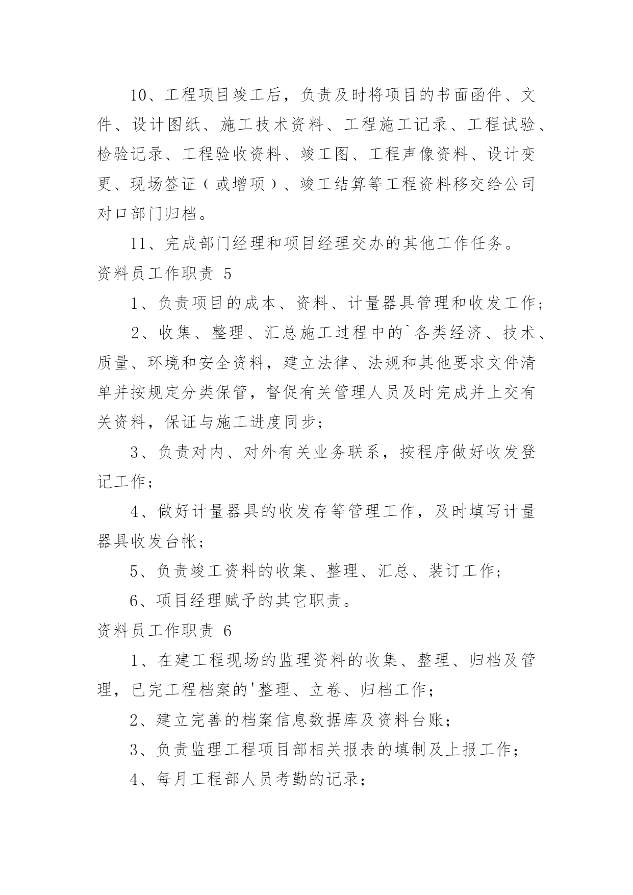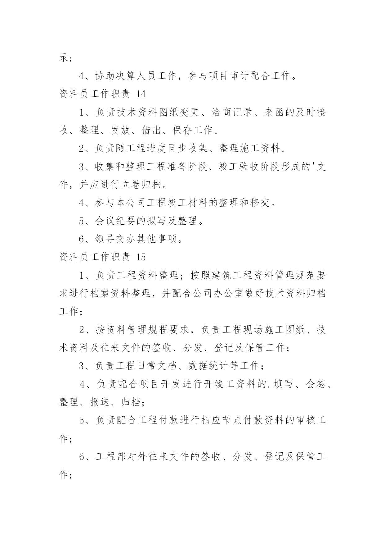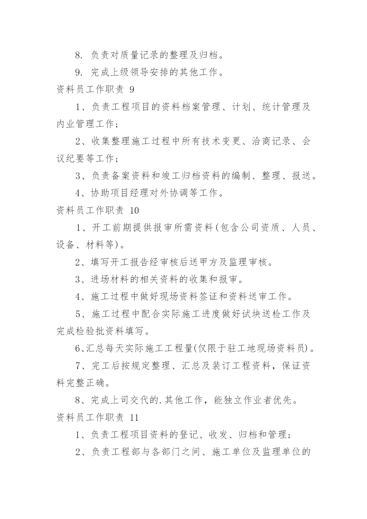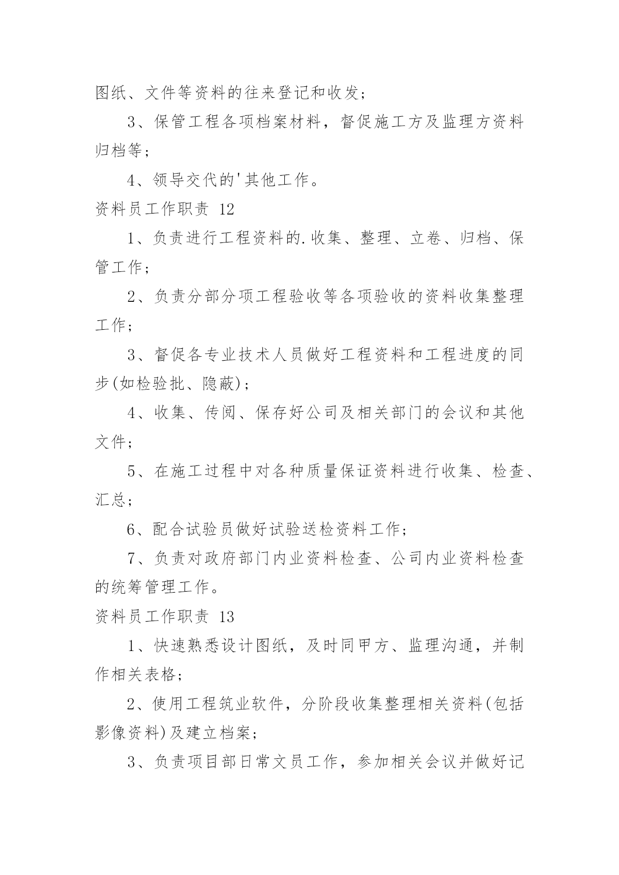 资料员工作职责资料员工作职责15篇资料员工作职责11、工程资料编制及收发递送,做好资料签收、建档及保管工作;2、负责施工图纸、设计变更、洽商及各种技术文件的收发、标识、存档等管理;3、负责公司项目对外来往函件、邮件、文件的`编制及有效送达;4、完成竣工资料,按档案馆和当地资料管理规定要求进行提交;5、与图纸会审,编制工程资料对接递交监理单位;6、与公司内各部门及相关单位保持良好的沟通,做到对资料的有效控制。资料员工作职责21、负责施工工程资料收集,编制,整理,归档工作2、整理施工过程中所有图纸会审记录,会议纪要等文件归档流程3、负责项目管理资料,技术资料,物资资料,质量验收等资料的完整性4、熟悉工程资料编制及档案馆归档流程,2年以上工程行业资料工作经验5、能独立完成项目全过程的资料管理;6、积极、主动、善于沟通;有团队意识;资料员工作职责3一、做好工程资料(图纸、安全、技术、劳务)的收集、整理、立卷、归档、保管工作二、做好施工过程中各种质量保证资料的收集、检查、汇总等工作三、做好施工中各种会议的记录、整理、汇总等工作。四、做好施工中各种试块、试件的取样、送检、结果回索、上报、分美保管等工作五、做好施工后工程量清单的'核对六、各施工合同的签订与归档七、规范工程项目开发施工期间的各类图纸变更通知、工程合同及其它工程项目方面文件料的保管。八、负责管理好有关工程技术经料的归档保存,并按有关工程技术料的重要性进行分美九、收集、检查、核对建设工程竣工姿料。十、负责备案资料的填写、会签、整理、报送、归档:负责工程备案管理,实现对竣工验收相关指标(包括质量资料审查记录、单位工程综合验收记最)作备案处理十一、在工程竣工后,负责将文件资料、工程料立巻移交公司,负责向市城建档案馆的栏案移交工作。十二、负责定期清理工程档案,合同和建设、规划、国士等主管部门审批原件,及时移交公司档案室存档。资料员工作职责41、在项目经理领导下,负责工程项目从开工准备至竣工验收及质保期结束全过程中资料的收集、整理、保管,并按国家规定分门别类进行归档、编目、登记成册。2、负责往来函件、施工图纸、设计变更、现场签证﹙或增项﹚的收发、保管、借阅、传递、立卷、归档工作,并建立工程资料管理台帐。3、严格按照《档案管理规范》的要求和技术资料与工程进度同步的要求,确保技术资料的真实、准确、及时、内容齐全、完整,整理系统化、表格化、字迹工整,并分类装订成册。严禁擅自修改、伪造和事后补做。4、建立健全文件和资料有效控制和各种记录,防止文件和资料损坏、丢失。5、对设计院或甲方送出的'施工图纸及变更、函件等,要检查是否有责任人签字盖章、编号及日期,以免出现无效的图纸、变更、函件等。6、各类合同、工程变更、现场签证﹙或增项﹚等资料要检查其完整性,签名、盖章是否齐全,避免竣工后责任不明或引起歧义。7、有关技术资料必须通过项目经理审核合格后,才能交资料员处归档。8、所有的质量保证资料及检验批质量验收记录均要通过质检员核定之后,交资料员处归档。9、负责工程竣工后竣工资料的编制、整理、归档工作。10、工程项目竣工后,负责及时将项目的书面函件、文件、设计图纸、施工技术资料、工程施工记录、工程试验、检验记录、工程验收资料、竣工图、工程声像资料、设计变更、现场签证﹙或增项﹚、竣工结算等工程资料移交给公司对口部门归档。11、完成部门经理和项目经理交办的其他工作任务。资料员工作职责51、负责项目的成本、资料、计量器具管理和收发工作;2、收集、整理、汇总施工过程中的`各类经济、技术、质量、环境和安全资料,建立法律、法规和其他要求文件清单并按规定分类保管,督促有关管理人员及时完成并上交有关资料,保证与施工进度同步;3、负责对内、对外有关业务联系,按程序做好收发登记工作;4、做好计量器具的收发存等管理工作,及时填写计量器具收发台帐;5、负责竣工资料的收集、整理、汇总、装订工作;6、项目经理赋予的其它职责。资料员工作职责61、在建工程现场的监理资料的收集、整理、归档及管理,已完工程档案的'整理、立卷、归档工作;2、建立完善的档案信息数据库及资料台账;3、负责监理工程项目部相关报表的填制及上报工作;4、每月工程部人员考勤的记录;5、日常办公性事物的申报和执行;资料员工作职责71、资料收集、审查、整理归档;2、建立资料台账,进行资料交底;3、负责资料的.往来传递、追溯及借阅管理;4、负责提供管理数据、信息资料;5、负责施工资料的验收与移交;6、工程进度款审批流程跟进及付款台账建立;7、领导交办的其它事务。资料员工作职责81.负责管理处的客户接待、办公接待及其他一些会务接待;负责客服中心前台的秩序及资料整理。2.入住(更户)手续办理、登记等各种手续,并及时更新业户资料;住户报修接待安排,装修备案手续办理。3.负责接听服务