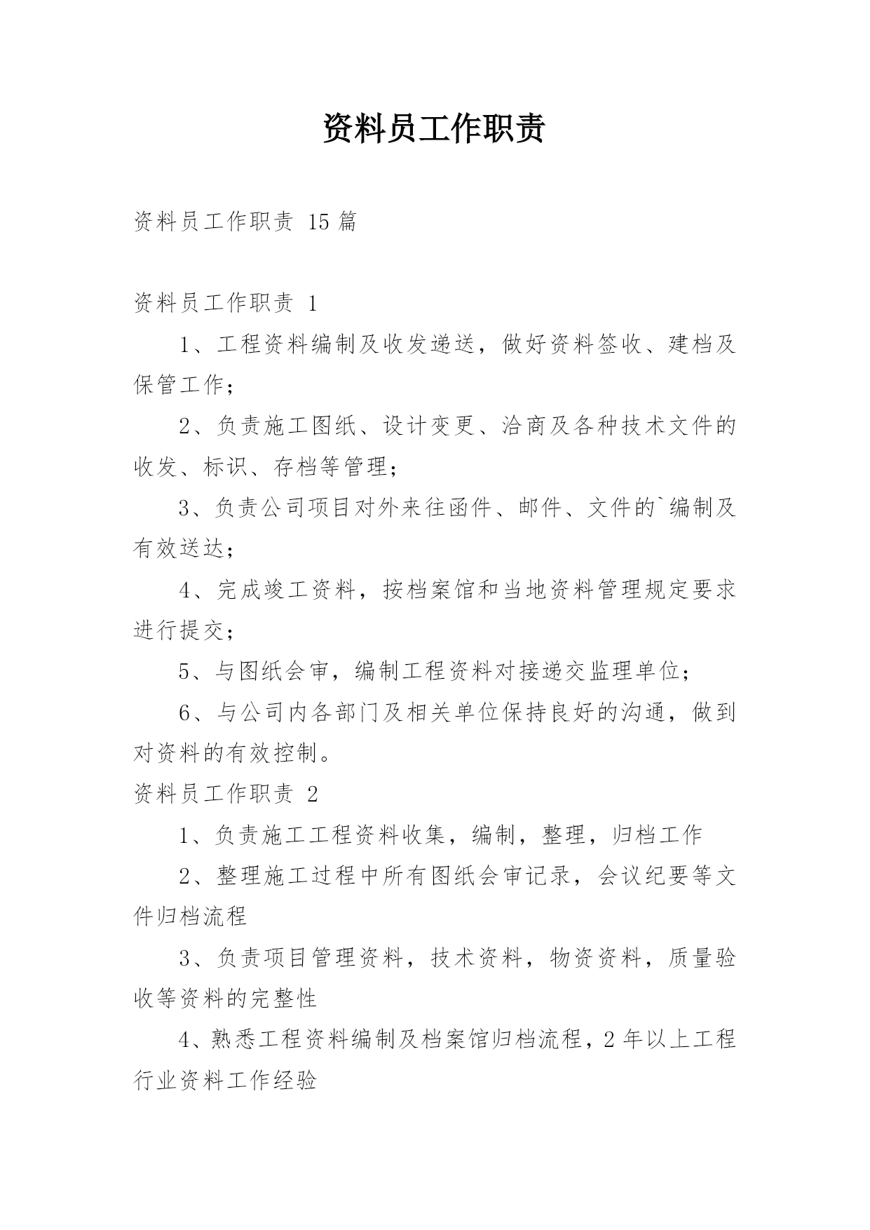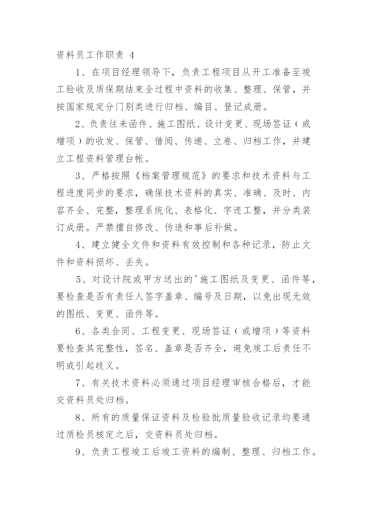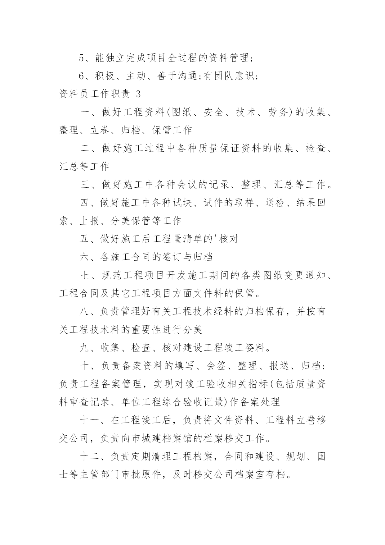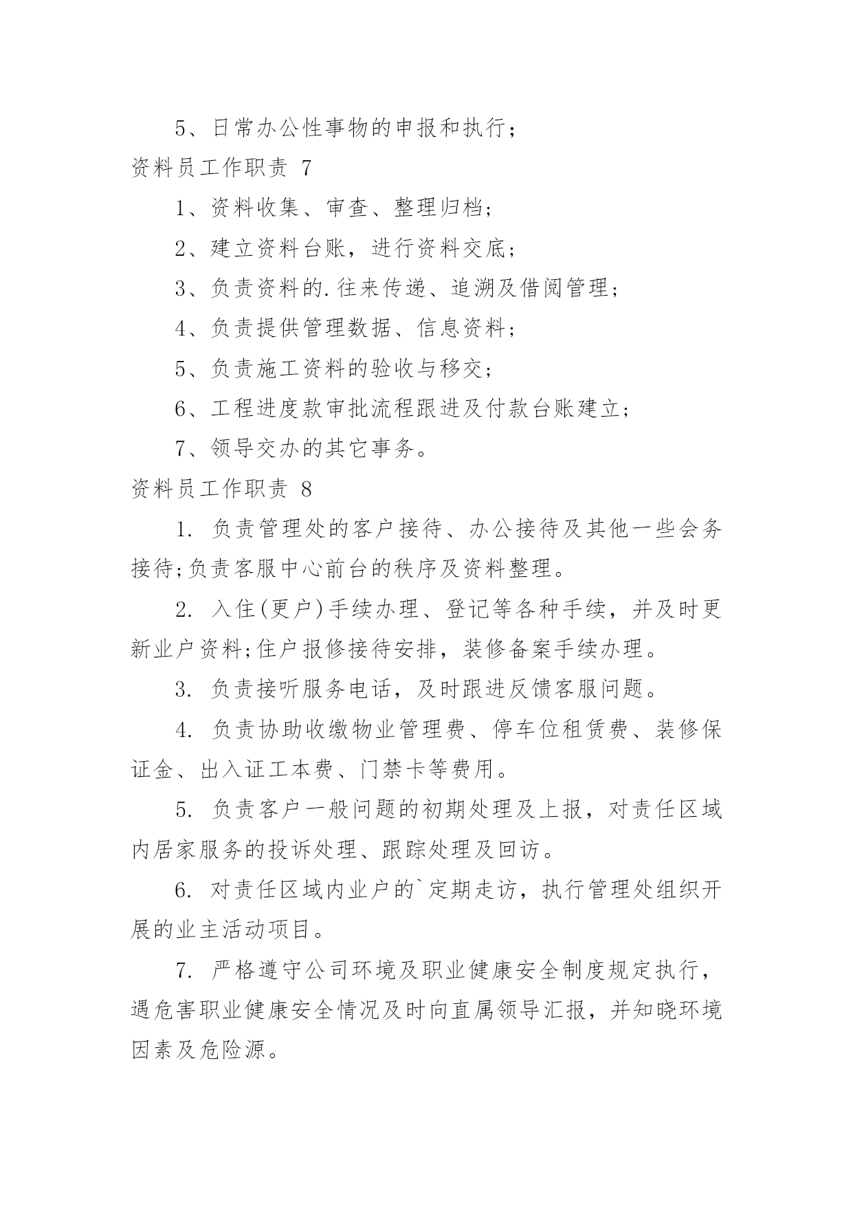 资料员工作职责资料员工作职责15篇资料员工作职责11、工程资料编制及收发递送,做好资料签收、建档及保管工作;2、负责施工图纸、设计变更、洽商及各种技术文件的收发、标识、存档等管理;3、负责公司项目对外来往函件、邮件、文件的`编制及有效送达;4、完成竣工资料,按档案馆和当地资料管理规定要求进行提交;5、与图纸会审,编制工程资料对接递交监理单位;6、与公司内各部门及相关单位保持良好的沟通,做到对资料的有效控制。资料员工作职责21、负责施工工程资料收集,编制,整理,归档工作2、整理施工过程中所有图纸会审记录,会议纪要等文件归档流程3、负责项目管理资料,技术资料,物资资料,质量验收等资料的完整性4、熟悉工程资料编制及档案馆归档流程,2年以上工程行业资料工作经验5、能独立完成项目全过程的资料管理;6、积极、主动、善于沟通;有团队意识;资料员工作职责3一、做好工程资料(图纸、安全、技术、劳务)的收集、整理、立卷、归档、保管工作二、做好施工过程中各种质量保证资料的收集、检查、汇总等工作三、做好施工中各种会议的记录、整理、汇总等工作。四、做好施工中各种试块、试件的取样、送检、结果回索、上报、分美保管等工作五、做好施工后工程量清单的'核对六、各施工合同的签订与归档七、规范工程项目开发施工期间的各类图纸变更通知、工程合同及其它工程项目方面文件料的保管。八、负责管理好有关工程技术经料的归档保存,并按有关工程技术料的重要性进行分美九、收集、检查、核对建设工程竣工姿料。十、负责备案资料的填写、会签、整理、报送、归档:负责工程备案管理,实现对竣工验收相关指标(包括质量资料审查记录、单位工程综合验收记最)作备案处理十一、在工程竣工后,负责将文件资料、工程料立巻移交公司,负责向市城建档案馆的栏案移交工作。十二、负责定期清理工程档案,合同和建设、规划、国士等主管部门审批原件,及时移交公司档案室存档。资料员工作职责41、在项目经理领导下,负责工程项目从开工准备至竣工验收及质保期结束全过程中资料的收集、整理、保管,并按国家规定分门别类进行归档、编目、登记成册。2、负责往来函件、施工图纸、设计变更、现场签证﹙或增项﹚的收发、保管、借阅、传递、立卷、归档工作,并建立工程资料管理台帐。3、严格按照《档案管理规范》的要求和技术资料与工程进度同步的要求,确保技术资料的真实、准确、及时、内容齐全、完整,整理系统化、表格化、字迹工整,并分类装订成册。严禁擅自修改、伪造和事后补做。4、建立健全文件和资料有效控制和各种记录,防止文件和资料损坏、丢失。5、对设计院或甲方送出的'施工图纸及变更、函件等,要检查是否有责任人签字盖章、编号及日期,以免出现无效的图纸、变更、函件等。6、各类合同、工程变更、现场签证﹙或增项﹚等资料要检查其完整性,签名、盖章是否齐全,避免竣工后责任不明或引起歧义。7、有关技术资料必须通过项目经理审核合格后,才能交资料员处归档。8、所有的质量保证资料及检验批质量验收记录均要通过质检员核定之后,交资料员处归档。9、负责工程竣工后竣工资料的编制、整理、归档工作。10、工程项目竣工后,负责及时将项目的书面函件、文件、设计图纸、施工技术资料、工程施工记录、工程试验、检验记录、工程验收资料、竣工图、工程声像资料、设计变更、现场签证﹙或增项﹚、竣工结算等工程资料移交给公司对口部门归档。11、完成部门经理和项目经理交办的其他工作任务。资料员工作职责51、负责项目的成本、资料、计量器具管理和收发工作;2、收集、整理、汇总施工过程中的`各类经济、技术、质量、环境和安全资料,建立法律、法规和其他要求文件清单并按规定分类保管,督促有关管理人员及时完成并上交有关资料,保证与施工进度同步;3、负责对内、对外有关业务联系,按程序做好收发登记工作;4、做好计量器具的收发存等管理工作,及时填写计量器具收发台帐;5、负责竣工资料的收集、整理、汇总、装订工作;6、项目经理赋予的其它职责。资料员工作职责61、在建工程现场的监理资料的收集、整理、归档及管理,已完工程档案的'整理、立卷、归档工作;2、建立完善的档案信息数据库及资料台账;3、负责监理工程项目部相关报表的填制及上报工作;4、每月工程部人员考勤的记录;5、日常办公性事物的申报和执行;资料员工作职责71、资料收集、审查、整理归档;2、建立资料台账,进行资料交底;3、负责资料的.往来传递、追溯及借阅管理;4、负责提供管理数据、信息资料;5、负责施工资料的验收与移交;6、工程进度款审批流程跟进及付款台账建立;7、领导交办的其它事务。资料员工作职责81.负责管理处的客户接待、办公接待及其他一些会务接待;负责客服中心前台的秩序及资料整理。2.入住(更户)手续办理、登记等各种手续,并及时更新业户资料;住户报修接待安排,装修备案手续办理。3.负责接听服务