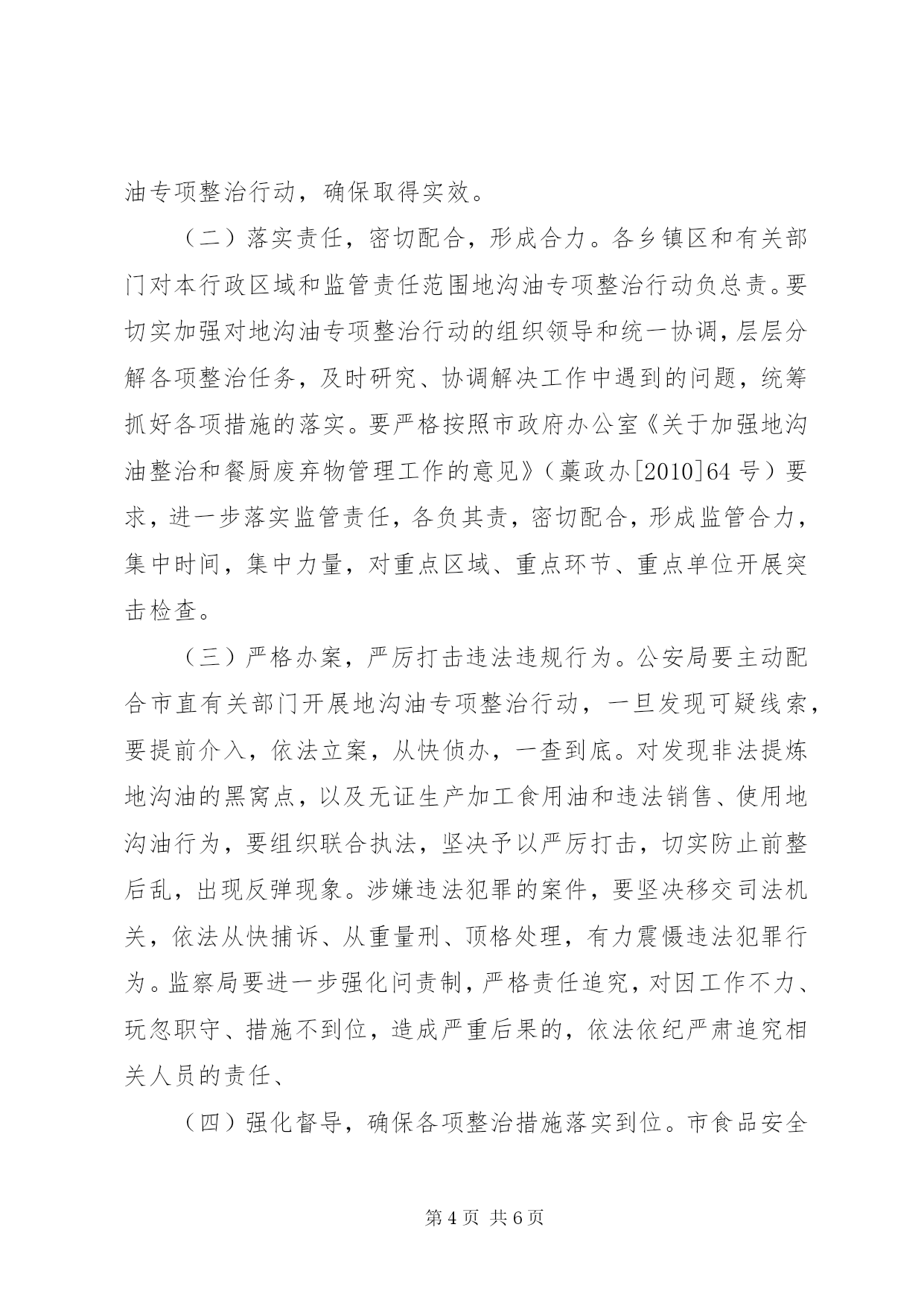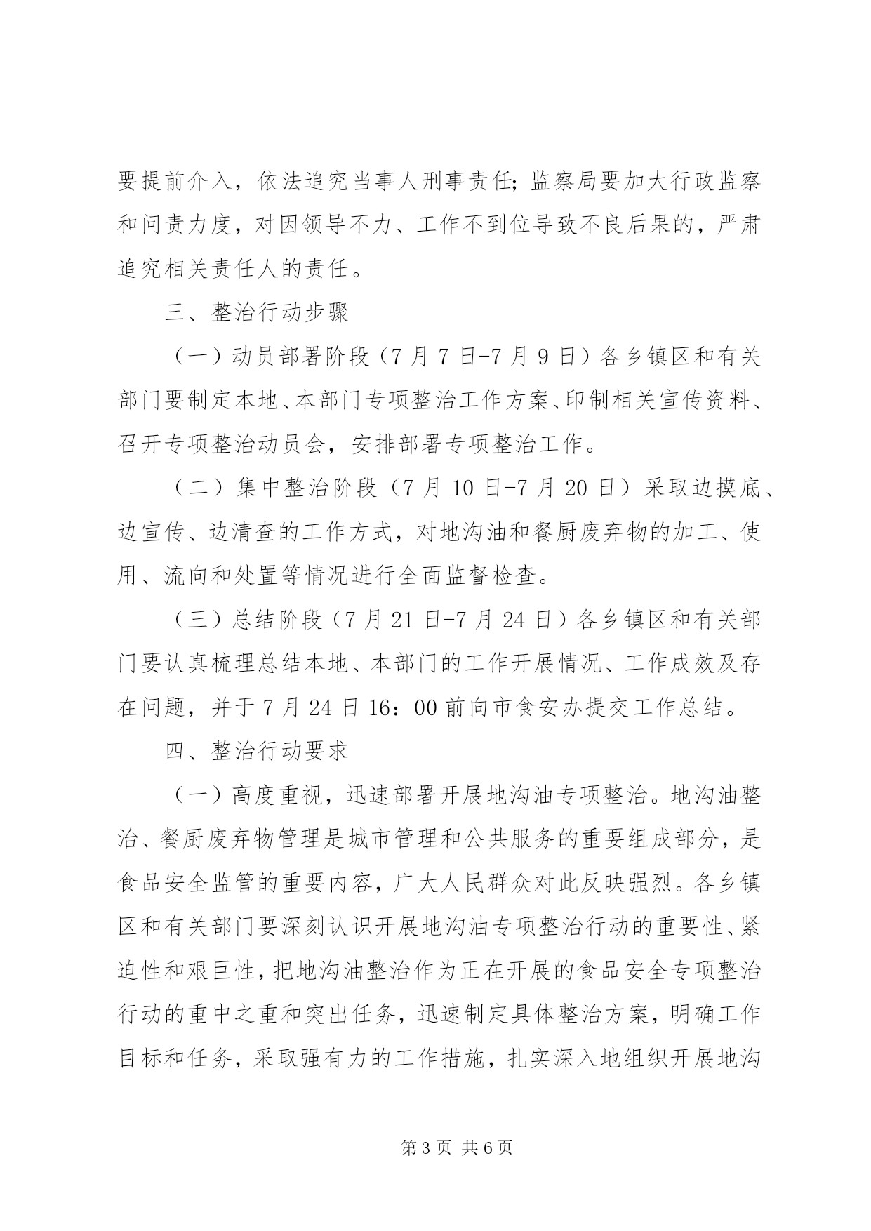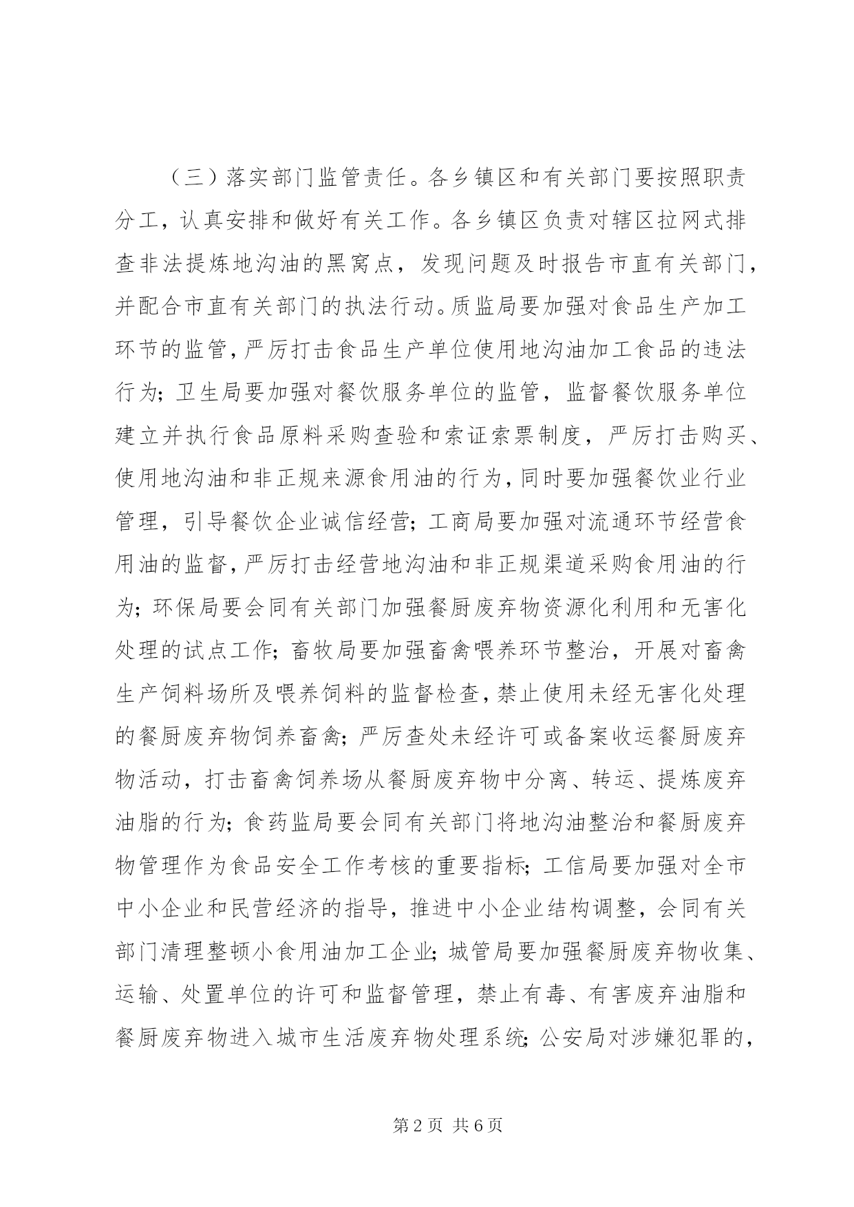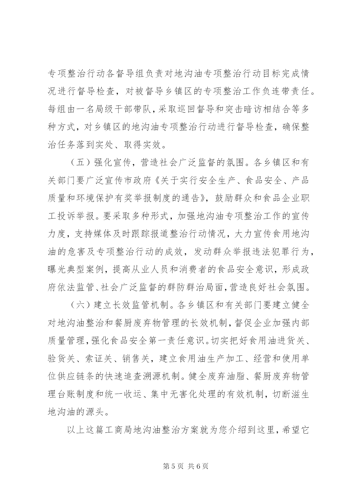 第PAGE\*Arabic\*MERGEFORMAT6页共NUMPAGES\*MERGEFORMAT6页工商局地沟油整治方案一、整治行动目标通过加强地沟油专项整治,控制生产源头,有效监控餐厨废弃物产生、收运和处置过程,进一步规范食用油市场销售行为,严厉打击非法生产、销售、使用地沟油行为,坚决取缔非法加工地沟油的黑窝点,依法查处从非法渠道购进食用油和使用地沟油加工食品行为,追溯源头,切断非法供应链,严防地沟油流入流通和餐饮环节。二、整治行动重点及责任(一)明确整治重点,深入开展拉网式排查。各乡镇区和有关部门要以城乡结合部和农村地区为重点,对辖区食用油生产加工企业、食品生产加工企业、小作坊、小食品厂、食用油销售者、集贸市场、批发市场、小餐馆、餐饮摊点、火锅店和学校(托幼机构)、企事业单位、工地食堂以及闲置院落厂房等进行一次全面排查,确保不留死角、不落环节、不留盲区。对发现的地沟油黑窝点,摸清原料来源和销售渠道,对发现的问题追查到底,对黑窝点一律取缔。(二)严防地沟油流入食品生产经营单位。加强对食用油购货记录和票证检查,依法查处从非法渠道购进食用油和使用地沟油加工食品的行为。对使用地沟油的食品生产经营单位依法责令停产停业整顿,直至吊销许可证;涉嫌犯罪的依法移送司法机关,追究刑事责任。(三)落实部门监管责任。各乡镇区和有关部门要按照职责分工,认真安排和做好有关工作。各乡镇区负责对辖区拉网式排查非法提炼地沟油的黑窝点,发现问题及时报告市直有关部门,并配合市直有关部门的执法行动。质监局要加强对食品生产加工环节的监管,严厉打击食品生产单位使用地沟油加工食品的违法行为;卫生局要加强对餐饮服务单位的监管,监督餐饮服务单位建立并执行食品原料采购查验和索证索票制度,严厉打击购买、使用地沟油和非正规来源食用油的行为,同时要加强餐饮业行业管理,引导餐饮企业诚信经营;工商局要加强对流通环节经营食用油的监督,严厉打击经营地沟油和非正规渠道采购食用油的行为;环保局要会同有关部门加强餐厨废弃物资源化利用和无害化处理的试点工作;畜牧局要加强畜禽喂养环节整治,开展对畜禽生产饲料场所及喂养饲料的监督检查,禁止使用未经无害化处理的餐厨废弃物饲养畜禽;严厉查处未经许可或备案收运餐厨废弃物活动,打击畜禽饲养场从餐厨废弃物中分离、转运、提炼废弃油脂的行为;食药监局要会同有关部门将地沟油整治和餐厨废弃物管理作为食品安全工作考核的重要指标;工信局要加强对全市中小企业和民营经济的指导,推进中小企业结构调整,会同有关部门清理整顿小食用油加工企业;城管局要加强餐厨废弃物收集、运输、处置单位的许可和监督管理,禁止有毒、有害废弃油脂和餐厨废弃物进入城市生活废弃物处理系统;公安局对涉嫌犯罪的,要提前介入,依法追究当事人刑事责任;监察局要加大行政监察和问责力度,对因领导不力、工作不到位导致不良后果的,严肃追究相关责任人的责任。三、整治行动步骤(一)动员部署阶段(7月7日-7月9日)各乡镇区和有关部门要制定本地、本部门专项整治工作方案、印制相关宣传资料、召开专项整治动员会,安排部署专项整治工作。(二)集中整治阶段(7月10日-7月20日)采取边摸底、边宣传、边清查的工作方式,对地沟油和餐厨废弃物的加工、使用、流向和处置等情况进行全面监督检查。(三)总结阶段(7月21日-7月24日)各乡镇区和有关部门要认真梳理总结本地、本部门的工作开展情况、工作成效及存在问题,并于7月24日16:00前向市食安办提交工作总结。四、整治行动要求(一)高度重视,迅速部署开展地沟油专项整治。地沟油整治、餐厨废弃物管理是城市管理和公共服务的重要组成部分,是食品安全监管的重要内容,广大人民群众对此反映强烈。各乡镇区和有关部门要深刻认识开展地沟油专项整治行动的重要性、紧迫性和艰巨性,把地沟油整治作为正在开展的食品安全专项整治行动的重中之重和突出任务,迅速制定具体整治方案,明确工作目标和任务,采取强有力的工作措施,扎实深入地组织开展地沟油专项整治行动,确保取得实效。(二)落实责任,密切配合,形成合力。各乡镇区和有关部门对本行政区域和监管责任范围地沟油专项整治行动负总责。要切实加强对地沟油专项整治行动的组织领导和统一协调,层层分解各项整治任务,及时研究、协调解决工作中遇到的问题,统筹抓好各项措施的落实。要严格按照市政府办公室《关于加强地沟油整治和餐厨废弃物管理工作的意见》(藁政办[2010]64号)要求,进一步落实监管责任,各负其责,密切配合,形成监管合力,集中时间,集中力量,对重点区域、重点环节、重点单位开展突击检查。(三)严格办案,严厉打击违法违规行为。公安局要主动配合市直有关部门开展地沟油专项整治行动,一旦发现可疑线索,要提前介入,依法立案,从快侦办,一查到底。对发现非法提炼地沟油的黑窝点,以及