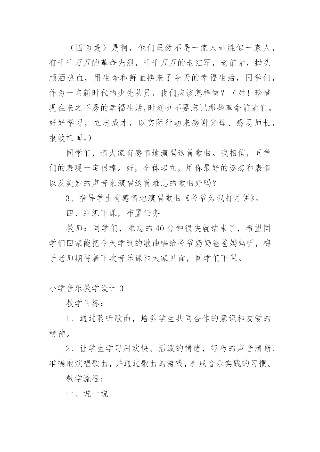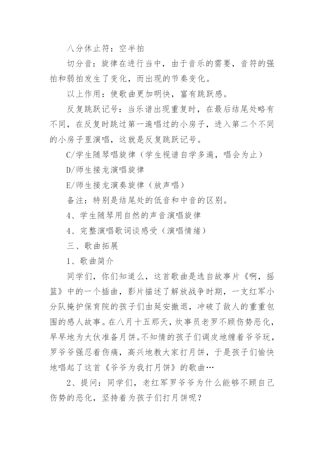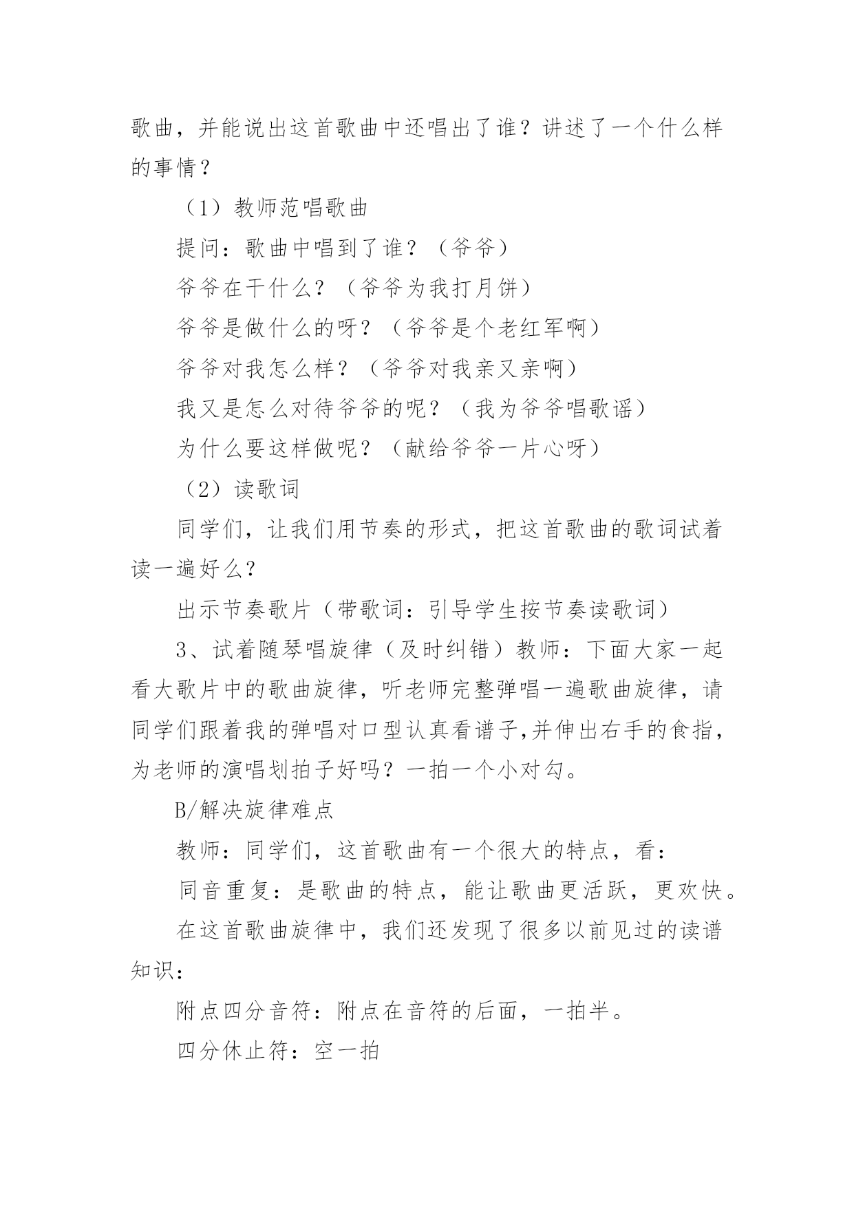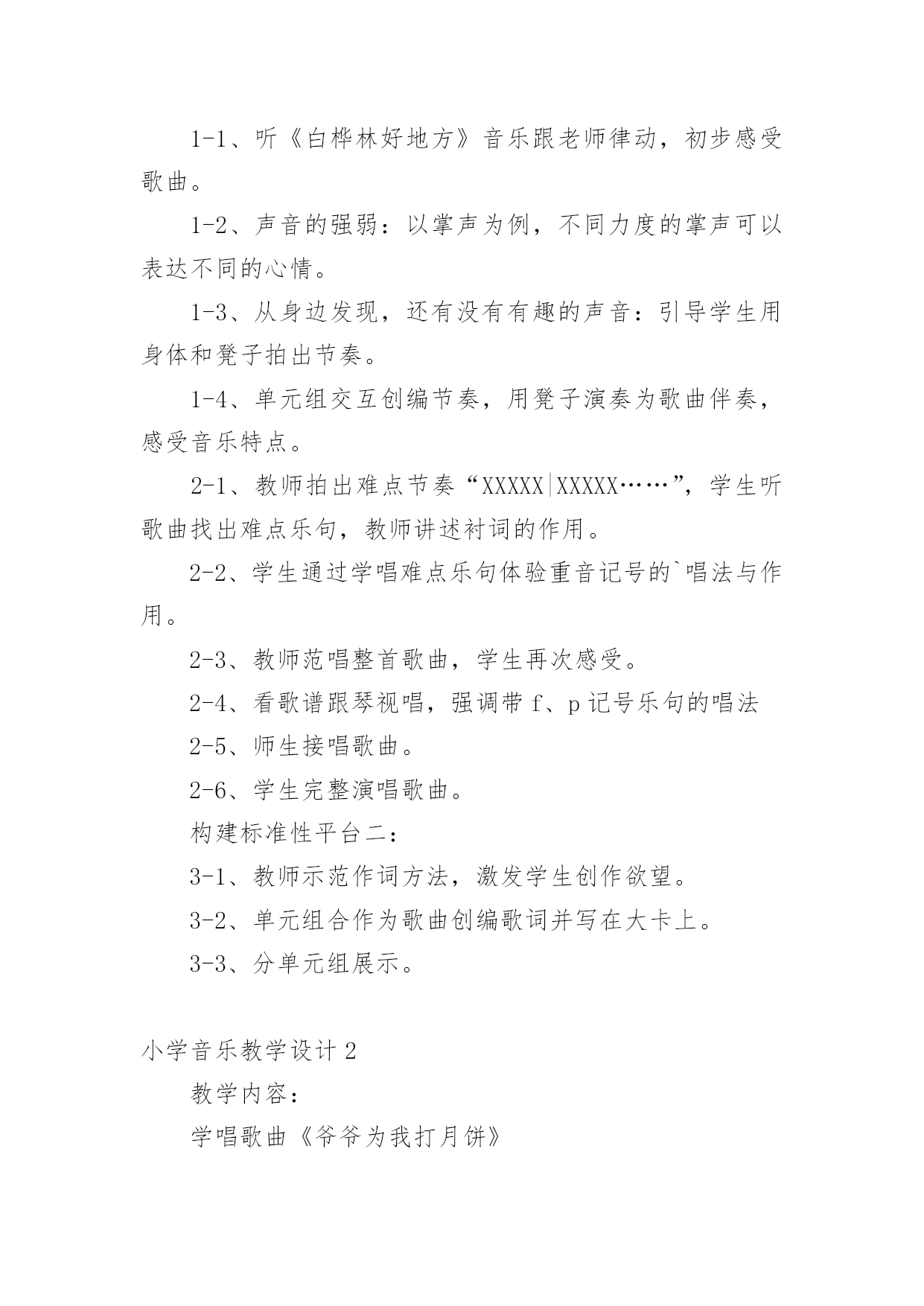 小学音乐教学设计小学音乐教学设计合集15篇作为一名无私奉献的老师,往往需要进行教学设计编写工作,教学设计是教育技术的组成部分,它的功能在于运用系统方法设计教学过程,使之成为一种具有操作性的程序。那么优秀的教学设计是什么样的呢?以下是小编收集整理的小学音乐教学设计,仅供参考,大家一起来看看吧。小学音乐教学设计1课题:白桦林好地方课型方式:平台互动式备课方式:板块结构-I目标1、感受音乐特点,完整演唱歌曲。2、掌握(重音记号)的唱法,并编创赞美自己家乡的歌词唱一唱。一、创设情境、善于发现。学生通过音乐律动、拍击节奏,感受音乐特点。二、掌握关健项、完整演唱歌曲听歌曲找出难点,完整演唱歌曲。三、创编歌词、表演歌曲。构建标准性平台一:1-1、听《白桦林好地方》音乐跟老师律动,初步感受歌曲。1-2、声音的强弱:以掌声为例,不同力度的掌声可以表达不同的心情。1-3、从身边发现,还有没有有趣的声音:引导学生用身体和凳子拍出节奏。1-4、单元组交互创编节奏,用凳子演奏为歌曲伴奏,感受音乐特点。2-1、教师拍出难点节奏“XXXXX|XXXXX……”,学生听歌曲找出难点乐句,教师讲述衬词的作用。2-2、学生通过学唱难点乐句体验重音记号的`唱法与作用。2-3、教师范唱整首歌曲,学生再次感受。2-4、看歌谱跟琴视唱,强调带f、p记号乐句的唱法2-5、师生接唱歌曲。2-6、学生完整演唱歌曲。构建标准性平台二:3-1、教师示范作词方法,激发学生创作欲望。3-2、单元组合作为歌曲创编歌词并写在大卡上。3-3、分单元组展示。小学音乐教学设计2教学内容:学唱歌曲《爷爷为我打月饼》教学目标:1、引导学生能用欢快活泼的情绪演唱歌曲《爷爷为我打月饼》。2、指导学生正确运用附点音符、切分音及休止符演唱歌曲,并明确它们在作品中的作用。(作用:使歌曲更加明快,富有跳跃性。)3、能为歌曲配上简单的动作并进行表演,用打击乐器为歌曲伴奏。在活动中提高音乐表现力和创造力,增强合作意识。教学重点:能有感情的的演唱歌曲并表演歌曲,体会歌曲的情绪。教学难点:附点音符、切分音节奏的掌握和运用。教具准备:录音机、教学磁带、电钢琴、歌曲挂图、月饼道具、红五角星等教学过程:一、导入1、请学生听歌曲录音《我们的祖国是花园》按节奏进教室。2、师生互唱问好歌。3、谜语:教师:同学们,相处这么多日子,我感受到咱班同学都可聪明了,今天我想出个谜语考考大家,有没有信心猜出来?请听好:有圆有方,又甜又香;平时少见,中秋能吃上。(教师出示月饼道具)二、新授教师:同学们你们真棒,一下子就猜出来了。是什么呀?Xxx月饼(eng),瞧,他是什么形状的呀?xx圆圆的他又是什么味道的呀?Xxxx甜又香啊看,老师把月饼的特点都加上节奏了,大家一起按节奏读一读xxxxx︳Xxxx‖月饼(eng)圆圆甜又香啊大家喜欢这个大月饼么?嗯。下面咱们一起玩个游戏,听着音乐按节奏传递这个大月饼,老师相信每位同学的表现一定都很棒,开始!2、范唱歌曲。教师:同学们,你们今天的表现真是太精彩了,今天梅子老师带来了一首和月饼有关的歌曲,大家想不想听呀?(想)歌曲的.名字叫《爷爷为我打月饼》下面,请同学们坐姿端正,看谁能够独自认真聆听这首歌曲,并能说出这首歌曲中还唱出了谁?讲述了一个什么样的事情?(1)教师范唱歌曲提问:歌曲中唱到了谁?(爷爷)爷爷在干什么?(爷爷为我打月饼)爷爷是做什么的呀?(爷爷是个老红军啊)爷爷对我怎么样?(爷爷对我亲又亲啊)我又是怎么对待爷爷的呢?(我为爷爷唱歌谣)为什么要这样做呢?(献给爷爷一片心呀)(2)读歌词同学们,让我们用节奏的形式,把这首歌曲的歌词试着读一遍好么?出示节奏歌片(带歌词:引导学生按节奏读歌词)3、试着随琴唱旋律(及时纠错)教师:下面大家一起看大歌片中的歌曲旋律,听老师完整弹唱一遍歌曲旋律,请同学们跟着我的弹唱对口型认真看谱子,并伸出右手的食指,为老师的演唱划拍子好吗?一拍一个小对勾。B/解决旋律难点教师:同学们,这首歌曲有一个很大的特点,看:同音重复:是歌曲的特点,能让歌曲更活跃,更欢快。在这首歌曲旋律中,我们还发现了很多以前见过的读谱知识:附点四分音符:附点在音符的后面,一拍半。四分休止符:空一拍八分休止符:空半拍切分音:旋律在进行当中,由于音乐的需要,音符的强拍和弱拍发生了变化,而出现的节奏变化。以上作用:使歌曲更加明快,富有跳跃感。反复跳跃记号:当乐谱出现重复时,在最后结尾处略有不同,在反复时跳过第一遍唱过的小房子,进入第二个不同的小房子里演唱,这就是反复跳跃记号。C/学生随琴唱旋律(学生视谱自学多遍,唱会为止)D/师生接龙演唱旋律E/师生接龙演奏旋律(放声唱)备注:特别是结尾处的低音和中音的区别。4、学生随琴用自然的声音演唱旋律4、完整演唱歌词谈感受(演唱情绪)三、歌曲拓展1、歌曲简介同