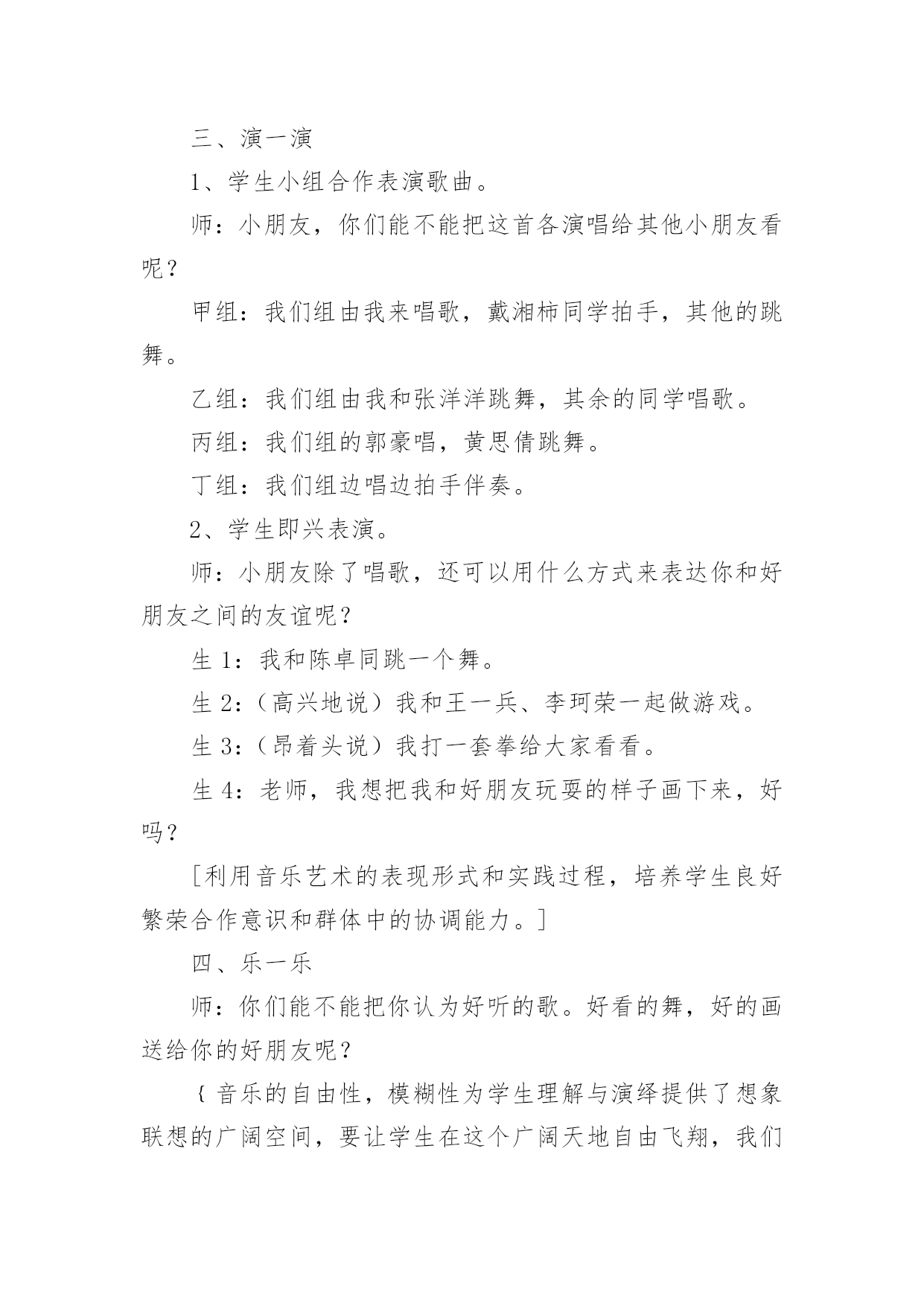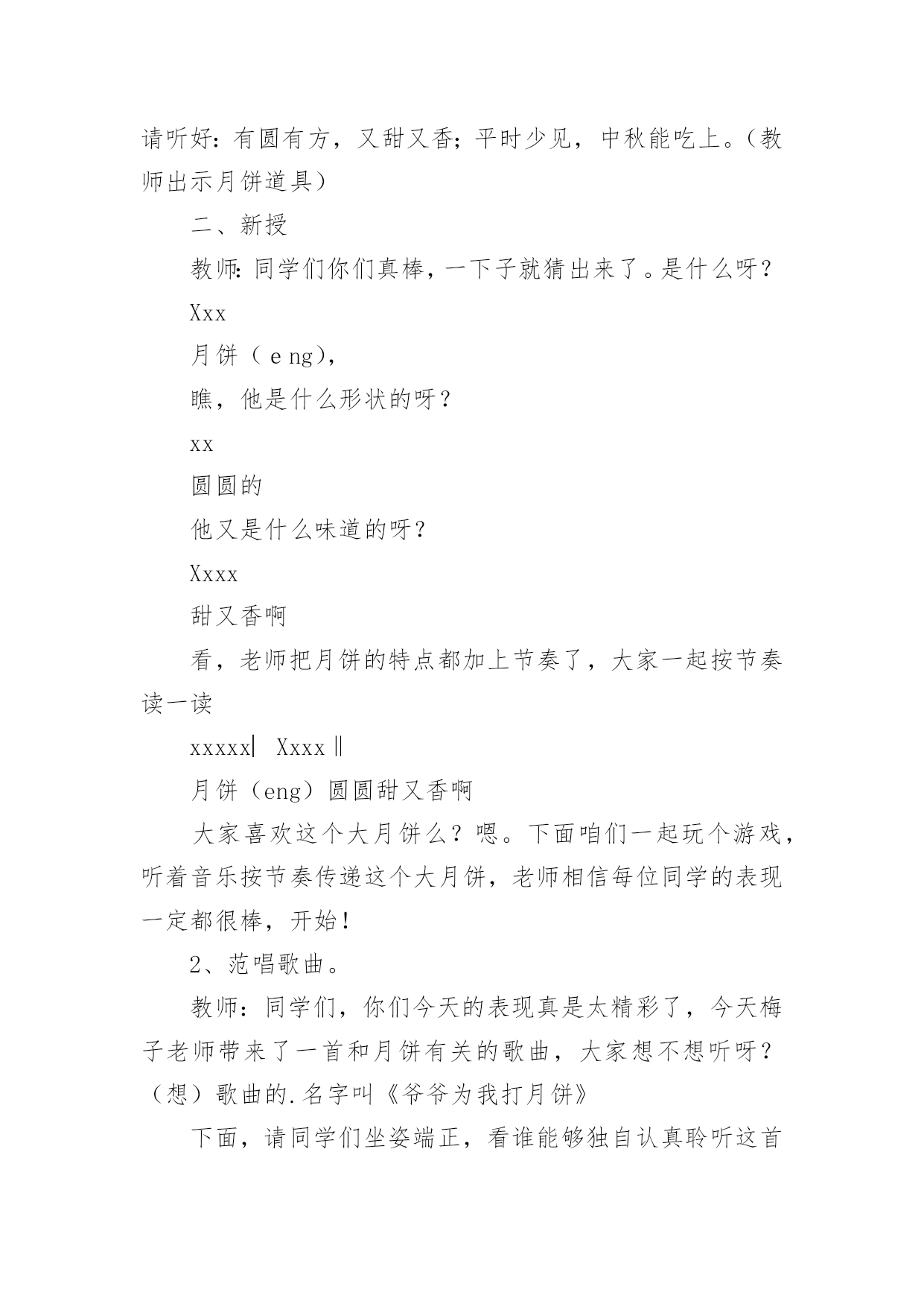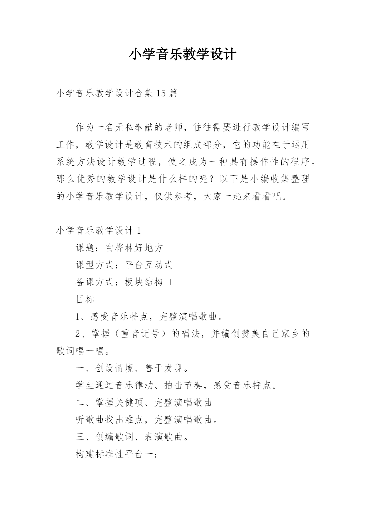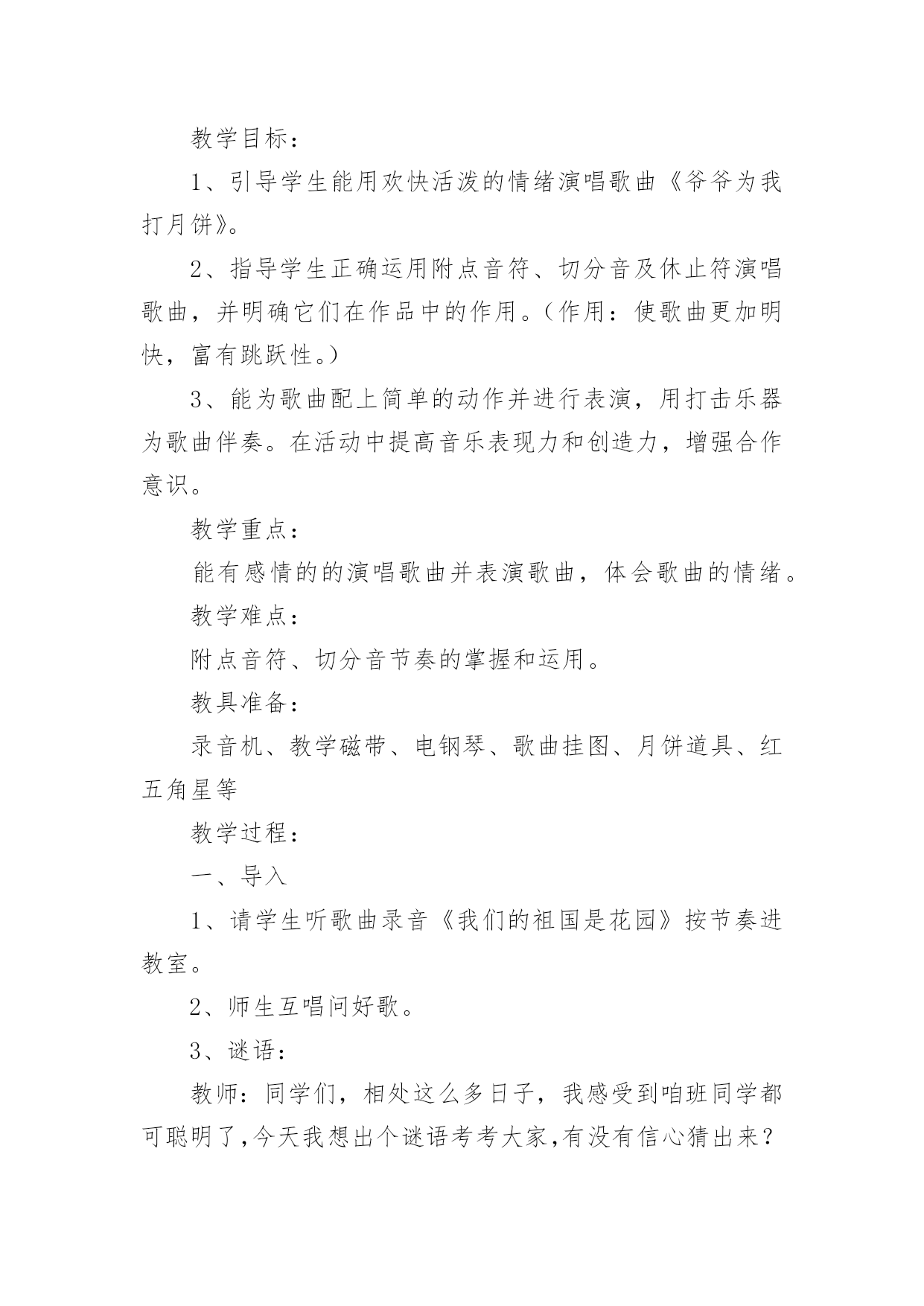 小学音乐教学设计小学音乐教学设计合集15篇作为一名无私奉献的老师,往往需要进行教学设计编写工作,教学设计是教育技术的组成部分,它的功能在于运用系统方法设计教学过程,使之成为一种具有操作性的程序。那么优秀的教学设计是什么样的呢?以下是小编收集整理的小学音乐教学设计,仅供参考,大家一起来看看吧。小学音乐教学设计1课题:白桦林好地方课型方式:平台互动式备课方式:板块结构-I目标1、感受音乐特点,完整演唱歌曲。2、掌握(重音记号)的唱法,并编创赞美自己家乡的歌词唱一唱。一、创设情境、善于发现。学生通过音乐律动、拍击节奏,感受音乐特点。二、掌握关健项、完整演唱歌曲听歌曲找出难点,完整演唱歌曲。三、创编歌词、表演歌曲。构建标准性平台一:1-1、听《白桦林好地方》音乐跟老师律动,初步感受歌曲。1-2、声音的强弱:以掌声为例,不同力度的掌声可以表达不同的心情。1-3、从身边发现,还有没有有趣的声音:引导学生用身体和凳子拍出节奏。1-4、单元组交互创编节奏,用凳子演奏为歌曲伴奏,感受音乐特点。2-1、教师拍出难点节奏“XXXXX|XXXXX……”,学生听歌曲找出难点乐句,教师讲述衬词的作用。2-2、学生通过学唱难点乐句体验重音记号的`唱法与作用。2-3、教师范唱整首歌曲,学生再次感受。2-4、看歌谱跟琴视唱,强调带f、p记号乐句的唱法2-5、师生接唱歌曲。2-6、学生完整演唱歌曲。构建标准性平台二:3-1、教师示范作词方法,激发学生创作欲望。3-2、单元组合作为歌曲创编歌词并写在大卡上。3-3、分单元组展示。小学音乐教学设计2教学内容:学唱歌曲《爷爷为我打月饼》教学目标:1、引导学生能用欢快活泼的情绪演唱歌曲《爷爷为我打月饼》。2、指导学生正确运用附点音符、切分音及休止符演唱歌曲,并明确它们在作品中的作用。(作用:使歌曲更加明快,富有跳跃性。)3、能为歌曲配上简单的动作并进行表演,用打击乐器为歌曲伴奏。在活动中提高音乐表现力和创造力,增强合作意识。教学重点:能有感情的的演唱歌曲并表演歌曲,体会歌曲的情绪。教学难点:附点音符、切分音节奏的掌握和运用。教具准备:录音机、教学磁带、电钢琴、歌曲挂图、月饼道具、红五角星等教学过程:一、导入1、请学生听歌曲录音《我们的祖国是花园》按节奏进教室。2、师生互唱问好歌。3、谜语:教师:同学们,相处这么多日子,我感受到咱班同学都可聪明了,今天我想出个谜语考考大家,有没有信心猜出来?请听好:有圆有方,又甜又香;平时少见,中秋能吃上。(教师出示月饼道具)二、新授教师:同学们你们真棒,一下子就猜出来了。是什么呀?Xxx月饼(eng),瞧,他是什么形状的呀?xx圆圆的他又是什么味道的呀?Xxxx甜又香啊看,老师把月饼的特点都加上节奏了,大家一起按节奏读一读xxxxx︳Xxxx‖月饼(eng)圆圆甜又香啊大家喜欢这个大月饼么?嗯。下面咱们一起玩个游戏,听着音乐按节奏传递这个大月饼,老师相信每位同学的表现一定都很棒,开始!2、范唱歌曲。教师:同学们,你们今天的表现真是太精彩了,今天梅子老师带来了一首和月饼有关的歌曲,大家想不想听呀?(想)歌曲的.名字叫《爷爷为我打月饼》下面,请同学们坐姿端正,看谁能够独自认真聆听这首歌曲,并能说出这首歌曲中还唱出了谁?讲述了一个什么样的事情?(1)教师范唱歌曲提问:歌曲中唱到了谁?(爷爷)爷爷在干什么?(爷爷为我打月饼)爷爷是做什么的呀?(爷爷是个老红军啊)爷爷对我怎么样?(爷爷对我亲又亲啊)我又是怎么对待爷爷的呢?(我为爷爷唱歌谣)为什么要这样做呢?(献给爷爷一片心呀)(2)读歌词同学们,让我们用节奏的形式,把这首歌曲的歌词试着读一遍好么?出示节奏歌片(带歌词:引导学生按节奏读歌词)3、试着随琴唱旋律(及时纠错)教师:下面大家一起看大歌片中的歌曲旋律,听老师完整弹唱一遍歌曲旋律,请同学们跟着我的弹唱对口型认真看谱子,并伸出右手的食指,为老师的演唱划拍子好吗?一拍一个小对勾。B/解决旋律难点教师:同学们,这首歌曲有一个很大的特点,看:同音重复:是歌曲的特点,能让歌曲更活跃,更欢快。在这首歌曲旋律中,我们还发现了很多以前见过的读谱知识:附点四分音符:附点在音符的后面,一拍半。四分休止符:空一拍八分休止符:空半拍切分音:旋律在进行当中,由于音乐的需要,音符的强拍和弱拍发生了变化,而出现的节奏变化。以上作用:使歌曲更加明快,富有跳跃感。反复跳跃记号:当乐谱出现重复时,在最后结尾处略有不同,在反复时跳过第一遍唱过的小房子,进入第二个不同的小房子里演唱,这就是反复跳跃记号。C/学生随琴唱旋律(学生视谱自学多遍,唱会为止)D/师生接龙演唱旋律E/师生接龙演奏旋律(放声唱)备注:特别是结尾处的低音和中音的区别。4、学生随琴用自然的声音演唱旋律4、完整演唱歌词谈感受(演唱情绪)三、歌曲拓展1、歌曲简介同