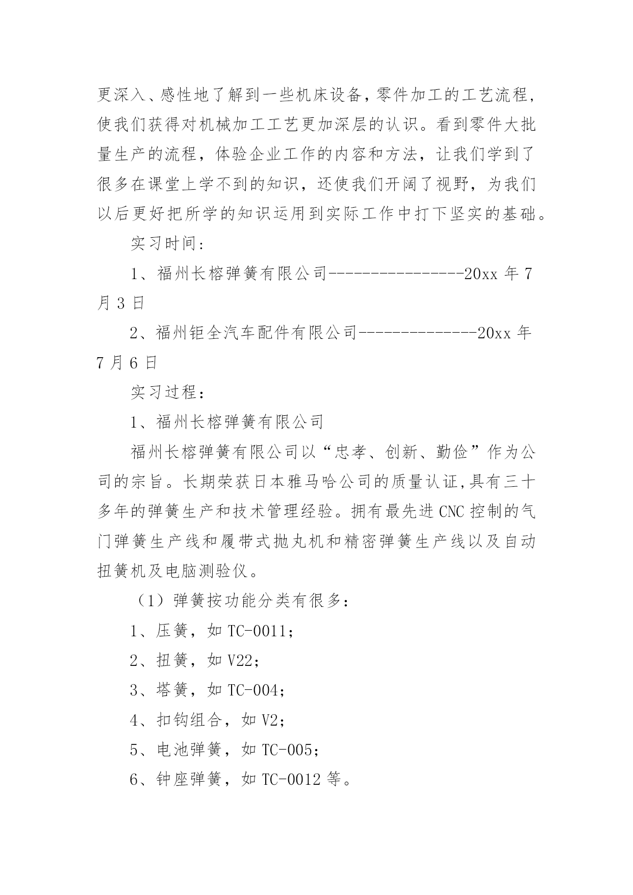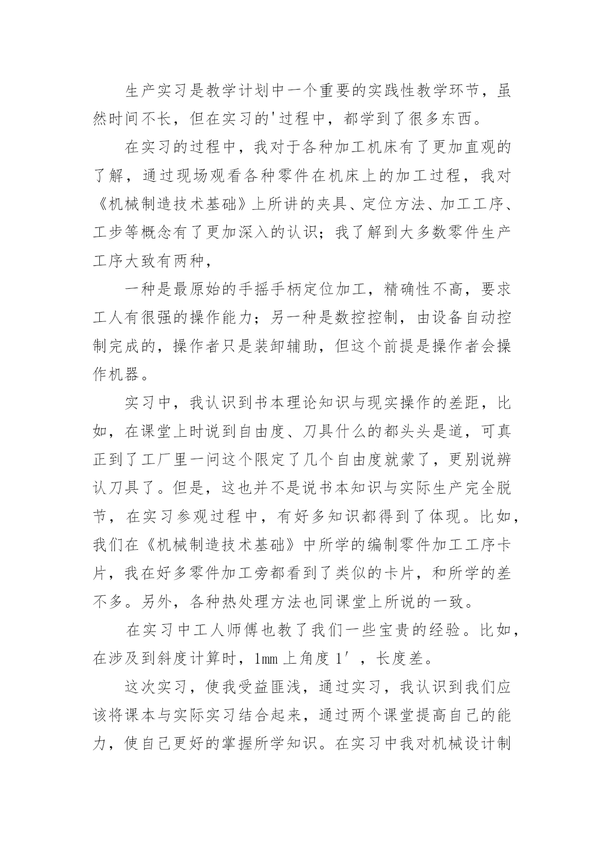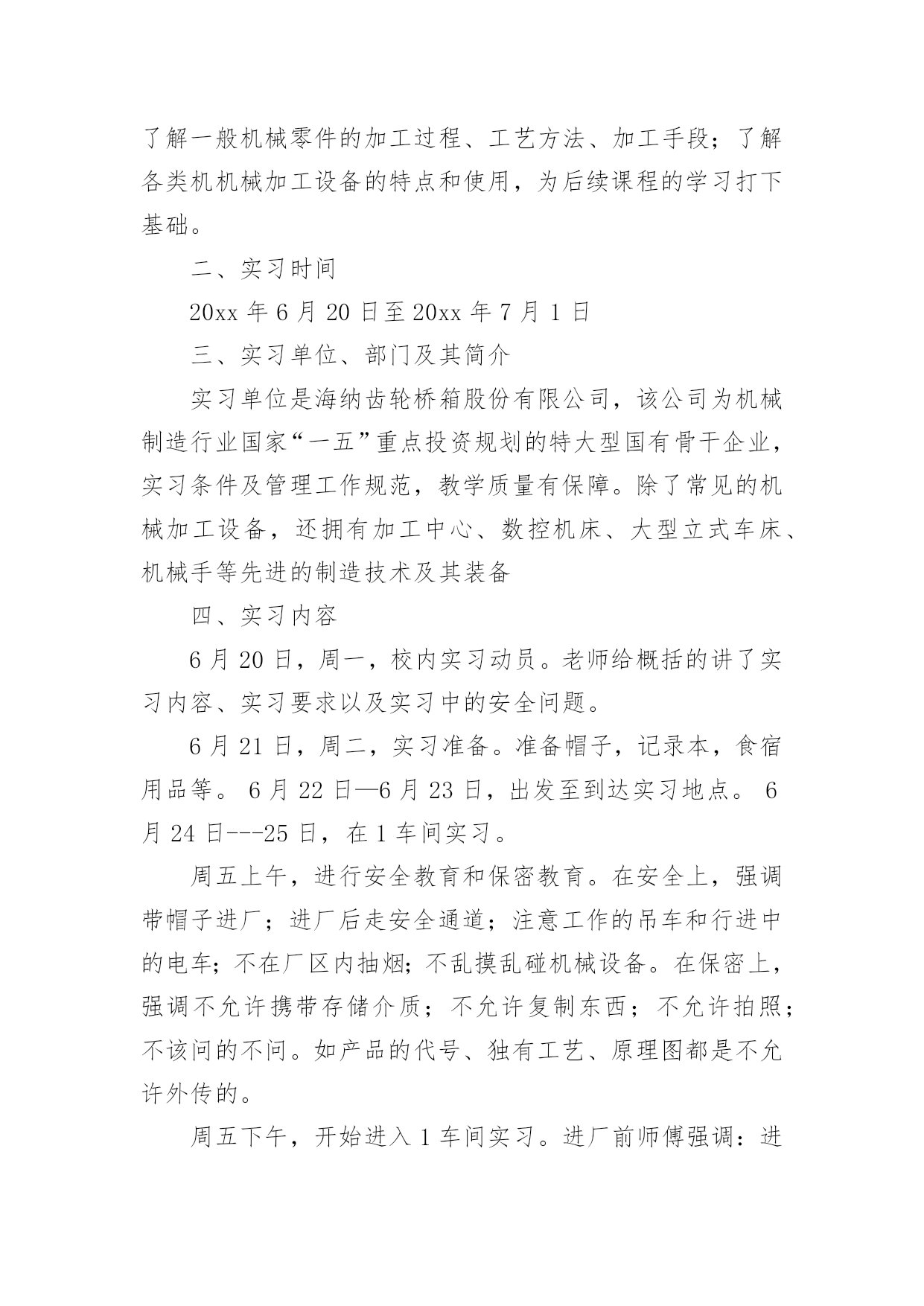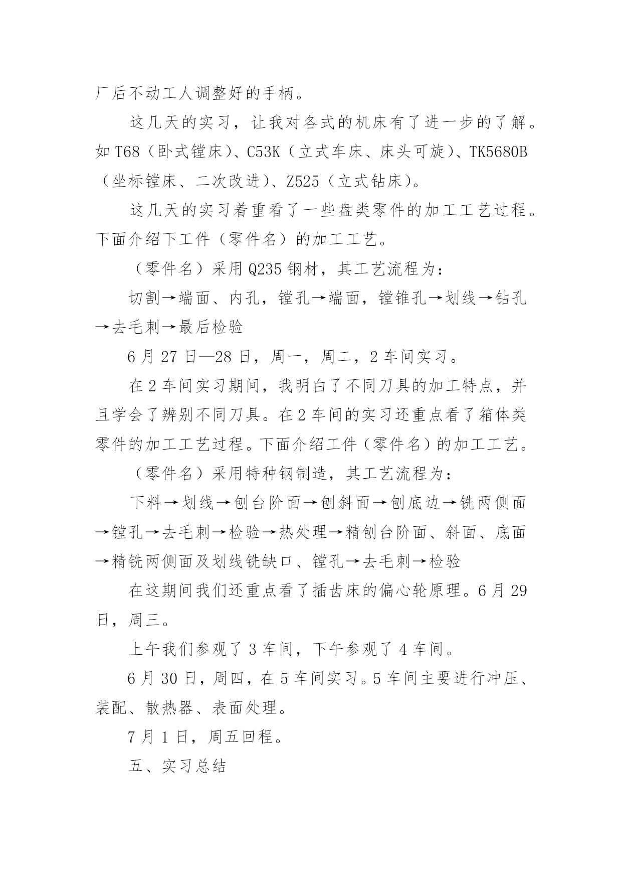 机械实习报告(精华)机械实习报告随着社会一步步向前发展,报告的适用范围越来越广泛,我们在写报告的时候要避免篇幅过长。一起来参考报告是怎么写的吧,下面是小编精心整理的机械实习报告,仅供参考,欢迎大家阅读。机械实习报告篇1一、前言经过近三年的学习,我们迎来了大学专业课程学习中的一个重要实践环节---生产实习。老师给我们班上的全体同学做了实习动员,老师给我们布置了实习中要用心学习和了解的各项内容,出发前的准备工作,还有一些注意事项。我们要认真刻苦,多观察多思考,完成老师布置的生产实习任务,我个人也把这次实习看作是对我大学三年来所学知识的一个检验,我想实习现场的一些设备和加工方法也许会用到我们从前学到的一些基本理论,我会认真地去理解和思考,按老师提供的一些知识点和要求内容去发现问题和寻找答案,认真学习工人师傅的爱岗敬业精神。通过这次生产实习,使我有机会接触和了解机械制造行业的一些实际知识,通过实习,也使我对机械装备和制造过程有了充分的了解和认识。本次实习是面向生产实际,通过走向社会和生产第一线,了解一般机械零件的加工过程、工艺方法、加工手段;了解各类机机械加工设备的特点和使用,为后续课程的学习打下基础。二、实习时间20xx年6月20日至20xx年7月1日三、实习单位、部门及其简介实习单位是海纳齿轮桥箱股份有限公司,该公司为机械制造行业国家“一五”重点投资规划的特大型国有骨干企业,实习条件及管理工作规范,教学质量有保障。除了常见的机械加工设备,还拥有加工中心、数控机床、大型立式车床、机械手等先进的制造技术及其装备四、实习内容6月20日,周一,校内实习动员。老师给概括的讲了实习内容、实习要求以及实习中的安全问题。6月21日,周二,实习准备。准备帽子,记录本,食宿用品等。6月22日—6月23日,出发至到达实习地点。6月24日---25日,在1车间实习。周五上午,进行安全教育和保密教育。在安全上,强调带帽子进厂;进厂后走安全通道;注意工作的吊车和行进中的电车;不在厂区内抽烟;不乱摸乱碰机械设备。在保密上,强调不允许携带存储介质;不允许复制东西;不允许拍照;不该问的不问。如产品的代号、独有工艺、原理图都是不允许外传的。周五下午,开始进入1车间实习。进厂前师傅强调:进厂后不动工人调整好的手柄。这几天的实习,让我对各式的机床有了进一步的了解。如T68(卧式镗床)、C53K(立式车床、床头可旋)、TK5680B(坐标镗床、二次改进)、Z525(立式钻床)。这几天的实习着重看了一些盘类零件的加工工艺过程。下面介绍下工件(零件名)的加工工艺。(零件名)采用Q235钢材,其工艺流程为:切割→端面、内孔,镗孔→端面,镗锥孔→划线→钻孔→去毛刺→最后检验6月27日—28日,周一,周二,2车间实习。在2车间实习期间,我明白了不同刀具的加工特点,并且学会了辨别不同刀具。在2车间的实习还重点看了箱体类零件的加工工艺过程。下面介绍工件(零件名)的加工工艺。(零件名)采用特种钢制造,其工艺流程为:下料→划线→刨台阶面→刨斜面→刨底边→铣两侧面→镗孔→去毛刺→检验→热处理→精刨台阶面、斜面、底面→精铣两侧面及划线铣缺口、镗孔→去毛刺→检验在这期间我们还重点看了插齿床的偏心轮原理。6月29日,周三。上午我们参观了3车间,下午参观了4车间。6月30日,周四,在5车间实习。5车间主要进行冲压、装配、散热器、表面处理。7月1日,周五回程。五、实习总结生产实习是教学计划中一个重要的实践性教学环节,虽然时间不长,但在实习的'过程中,都学到了很多东西。在实习的过程中,我对于各种加工机床有了更加直观的了解,通过现场观看各种零件在机床上的加工过程,我对《机械制造技术基础》上所讲的夹具、定位方法、加工工序、工步等概念有了更加深入的认识;我了解到大多数零件生产工序大致有两种,一种是最原始的手摇手柄定位加工,精确性不高,要求工人有很强的操作能力;另一种是数控控制,由设备自动控制完成的,操作者只是装卸辅助,但这个前提是操作者会操作机器。实习中,我认识到书本理论知识与现实操作的差距,比如,在课堂上时说到自由度、刀具什么的都头头是道,可真正到了工厂里一问这个限定了几个自由度就蒙了,更别说辨认刀具了。但是,这也并不是说书本知识与实际生产完全脱节,在实习参观过程中,有好多知识都得到了体现。比如,我们在《机械制造技术基础》中所学的编制零件加工工序卡片,我在好多零件加工旁都看到了类似的卡片,和所学的差不多。另外,各种热处理方法也同课堂上所说的一致。在实习中工人师傅也教了我们一些宝贵的经验。比如,在涉及到斜度计算时,1mm上角度1′,长度差。这次实习,使我受益匪浅,通过实习,我认识到我们应该将课本与实际实习结合起来,通过两个课堂提高自己的能力,使自己更好的掌握所学知识。在实习中我对机械设计制造及其自动化全过