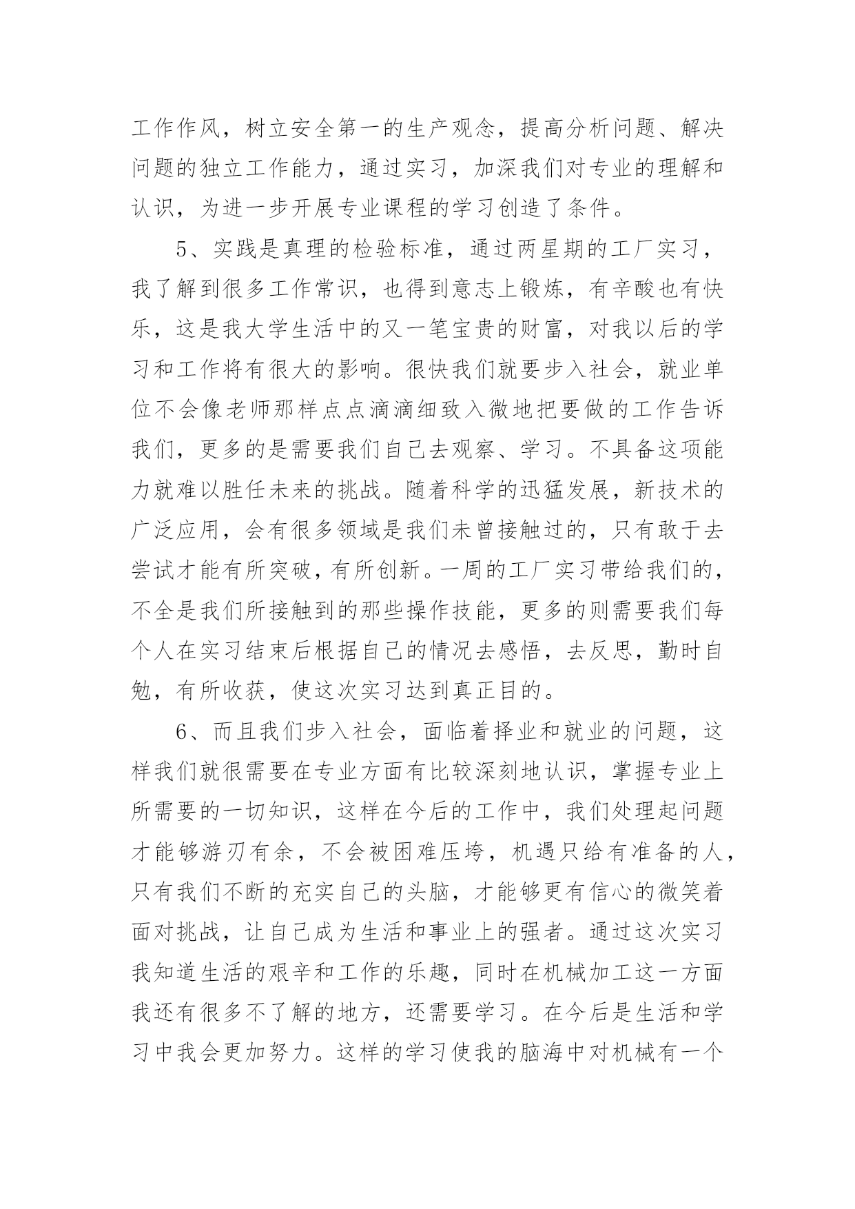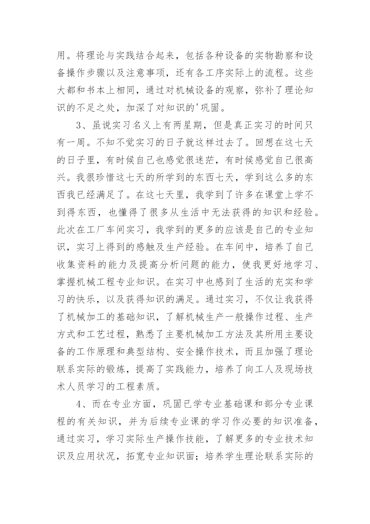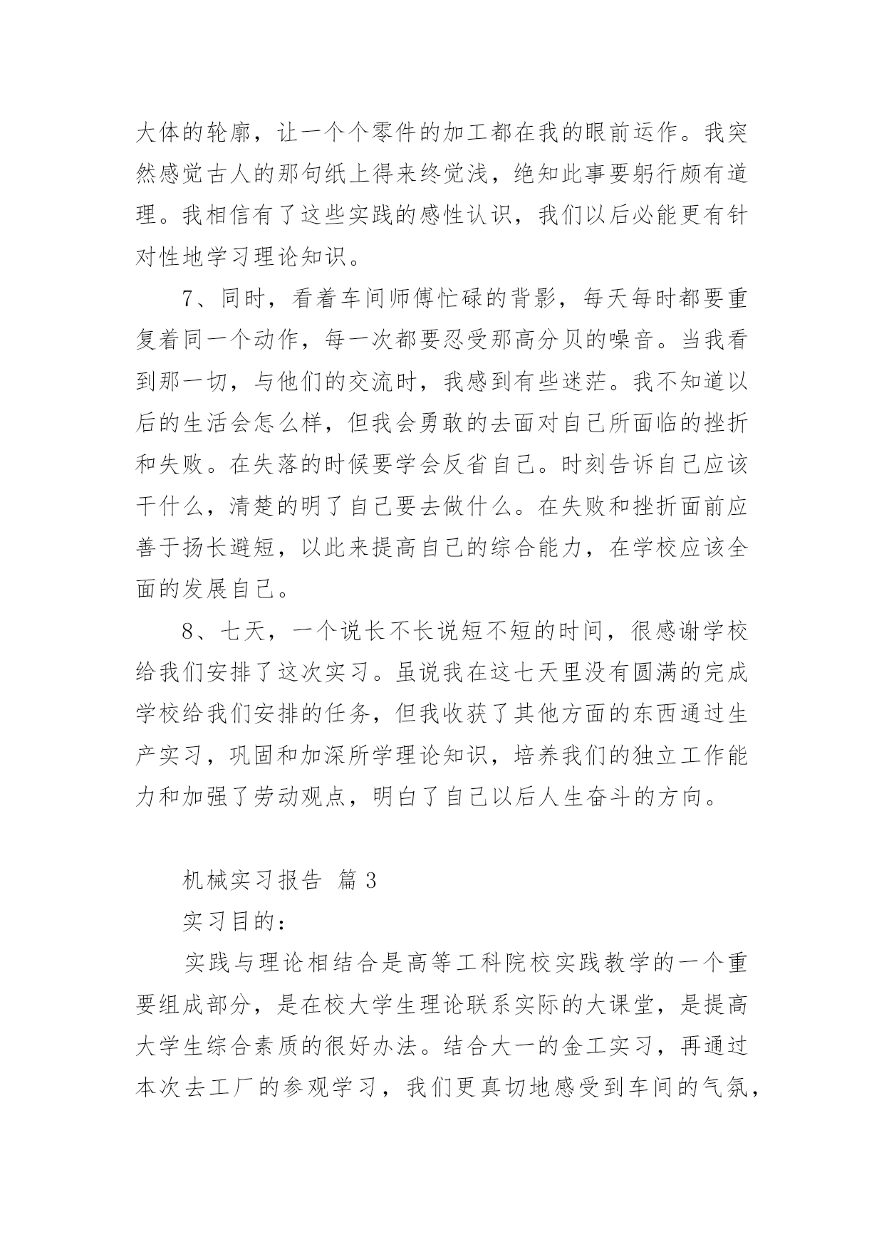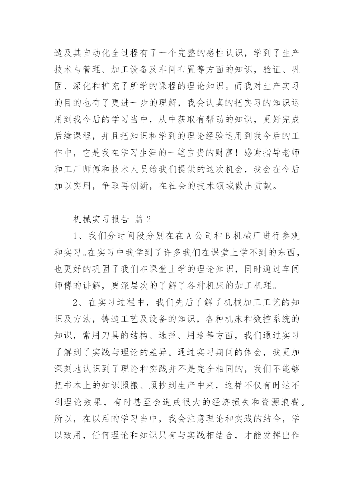 机械实习报告(精华)机械实习报告随着社会一步步向前发展,报告的适用范围越来越广泛,我们在写报告的时候要避免篇幅过长。一起来参考报告是怎么写的吧,下面是小编精心整理的机械实习报告,仅供参考,欢迎大家阅读。机械实习报告篇1一、前言经过近三年的学习,我们迎来了大学专业课程学习中的一个重要实践环节---生产实习。老师给我们班上的全体同学做了实习动员,老师给我们布置了实习中要用心学习和了解的各项内容,出发前的准备工作,还有一些注意事项。我们要认真刻苦,多观察多思考,完成老师布置的生产实习任务,我个人也把这次实习看作是对我大学三年来所学知识的一个检验,我想实习现场的一些设备和加工方法也许会用到我们从前学到的一些基本理论,我会认真地去理解和思考,按老师提供的一些知识点和要求内容去发现问题和寻找答案,认真学习工人师傅的爱岗敬业精神。通过这次生产实习,使我有机会接触和了解机械制造行业的一些实际知识,通过实习,也使我对机械装备和制造过程有了充分的了解和认识。本次实习是面向生产实际,通过走向社会和生产第一线,了解一般机械零件的加工过程、工艺方法、加工手段;了解各类机机械加工设备的特点和使用,为后续课程的学习打下基础。二、实习时间20xx年6月20日至20xx年7月1日三、实习单位、部门及其简介实习单位是海纳齿轮桥箱股份有限公司,该公司为机械制造行业国家“一五”重点投资规划的特大型国有骨干企业,实习条件及管理工作规范,教学质量有保障。除了常见的机械加工设备,还拥有加工中心、数控机床、大型立式车床、机械手等先进的制造技术及其装备四、实习内容6月20日,周一,校内实习动员。老师给概括的讲了实习内容、实习要求以及实习中的安全问题。6月21日,周二,实习准备。准备帽子,记录本,食宿用品等。6月22日—6月23日,出发至到达实习地点。6月24日---25日,在1车间实习。周五上午,进行安全教育和保密教育。在安全上,强调带帽子进厂;进厂后走安全通道;注意工作的吊车和行进中的电车;不在厂区内抽烟;不乱摸乱碰机械设备。在保密上,强调不允许携带存储介质;不允许复制东西;不允许拍照;不该问的不问。如产品的代号、独有工艺、原理图都是不允许外传的。周五下午,开始进入1车间实习。进厂前师傅强调:进厂后不动工人调整好的手柄。这几天的实习,让我对各式的机床有了进一步的了解。如T68(卧式镗床)、C53K(立式车床、床头可旋)、TK5680B(坐标镗床、二次改进)、Z525(立式钻床)。这几天的实习着重看了一些盘类零件的加工工艺过程。下面介绍下工件(零件名)的加工工艺。(零件名)采用Q235钢材,其工艺流程为:切割→端面、内孔,镗孔→端面,镗锥孔→划线→钻孔→去毛刺→最后检验6月27日—28日,周一,周二,2车间实习。在2车间实习期间,我明白了不同刀具的加工特点,并且学会了辨别不同刀具。在2车间的实习还重点看了箱体类零件的加工工艺过程。下面介绍工件(零件名)的加工工艺。(零件名)采用特种钢制造,其工艺流程为:下料→划线→刨台阶面→刨斜面→刨底边→铣两侧面→镗孔→去毛刺→检验→热处理→精刨台阶面、斜面、底面→精铣两侧面及划线铣缺口、镗孔→去毛刺→检验在这期间我们还重点看了插齿床的偏心轮原理。6月29日,周三。上午我们参观了3车间,下午参观了4车间。6月30日,周四,在5车间实习。5车间主要进行冲压、装配、散热器、表面处理。7月1日,周五回程。五、实习总结生产实习是教学计划中一个重要的实践性教学环节,虽然时间不长,但在实习的'过程中,都学到了很多东西。在实习的过程中,我对于各种加工机床有了更加直观的了解,通过现场观看各种零件在机床上的加工过程,我对《机械制造技术基础》上所讲的夹具、定位方法、加工工序、工步等概念有了更加深入的认识;我了解到大多数零件生产工序大致有两种,一种是最原始的手摇手柄定位加工,精确性不高,要求工人有很强的操作能力;另一种是数控控制,由设备自动控制完成的,操作者只是装卸辅助,但这个前提是操作者会操作机器。实习中,我认识到书本理论知识与现实操作的差距,比如,在课堂上时说到自由度、刀具什么的都头头是道,可真正到了工厂里一问这个限定了几个自由度就蒙了,更别说辨认刀具了。但是,这也并不是说书本知识与实际生产完全脱节,在实习参观过程中,有好多知识都得到了体现。比如,我们在《机械制造技术基础》中所学的编制零件加工工序卡片,我在好多零件加工旁都看到了类似的卡片,和所学的差不多。另外,各种热处理方法也同课堂上所说的一致。在实习中工人师傅也教了我们一些宝贵的经验。比如,在涉及到斜度计算时,1mm上角度1′,长度差。这次实习,使我受益匪浅,通过实习,我认识到我们应该将课本与实际实习结合起来,通过两个课堂提高自己的能力,使自己更好的掌握所学知识。在实习中我对机械设计制造及其自动化全过