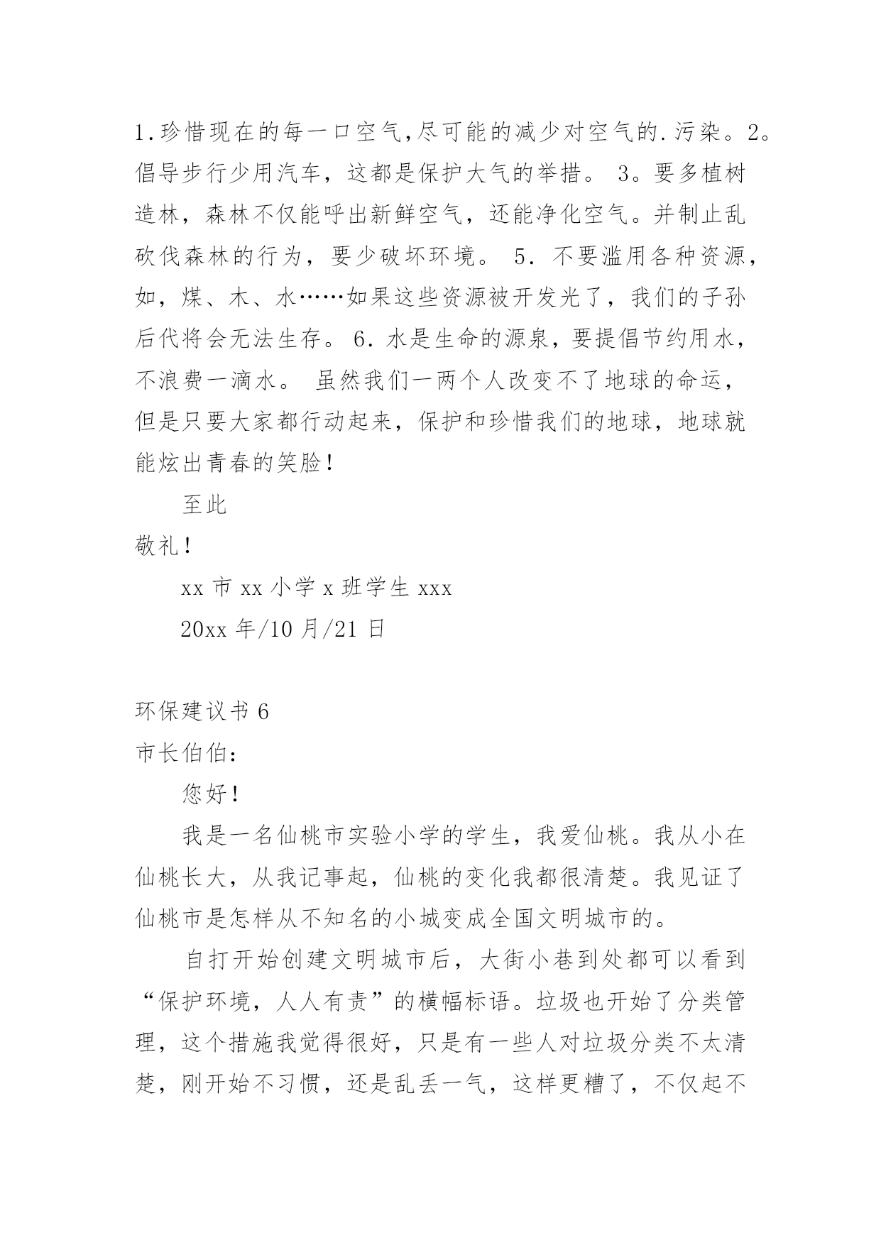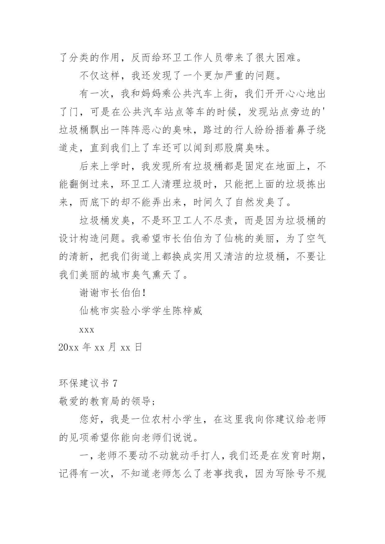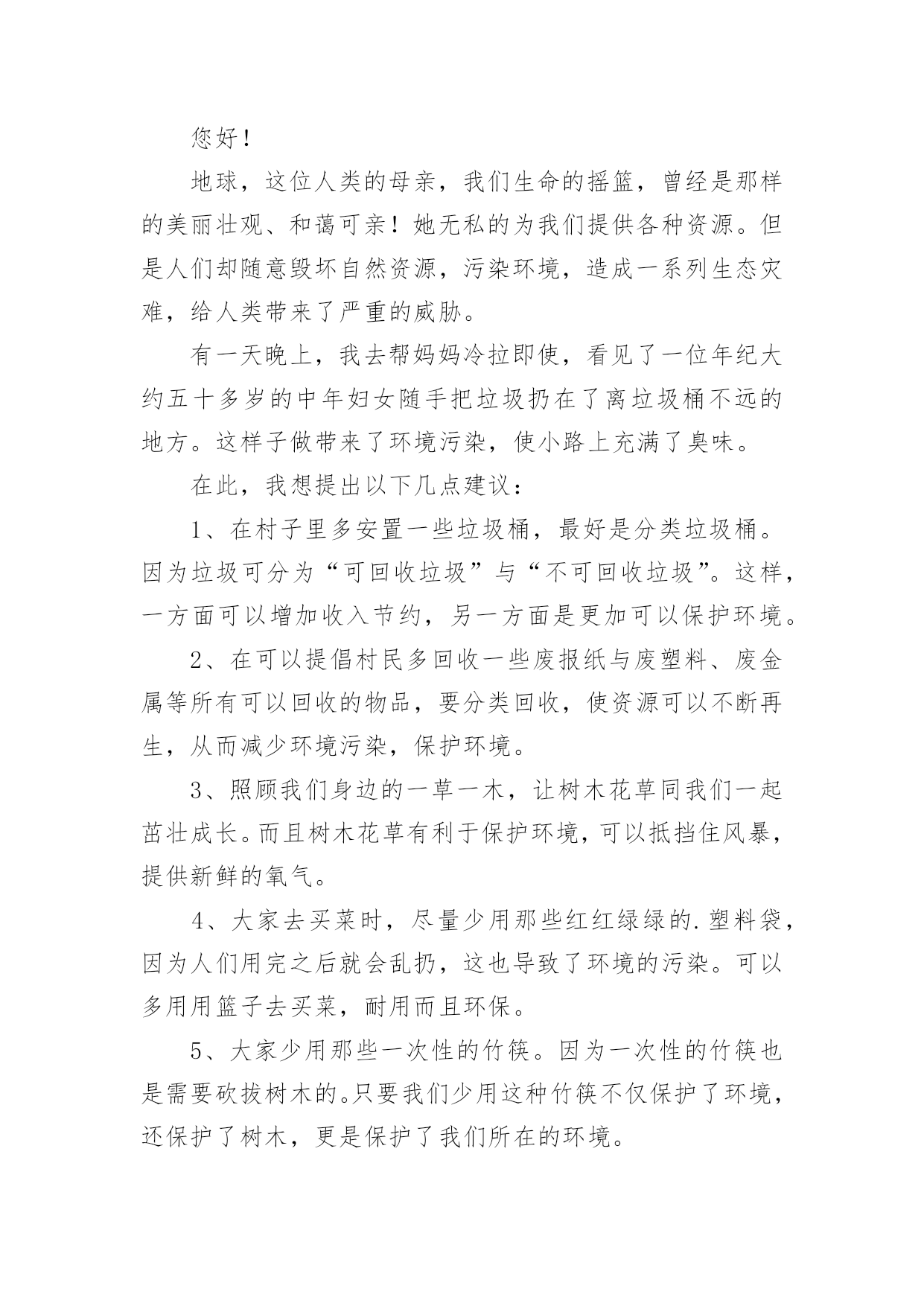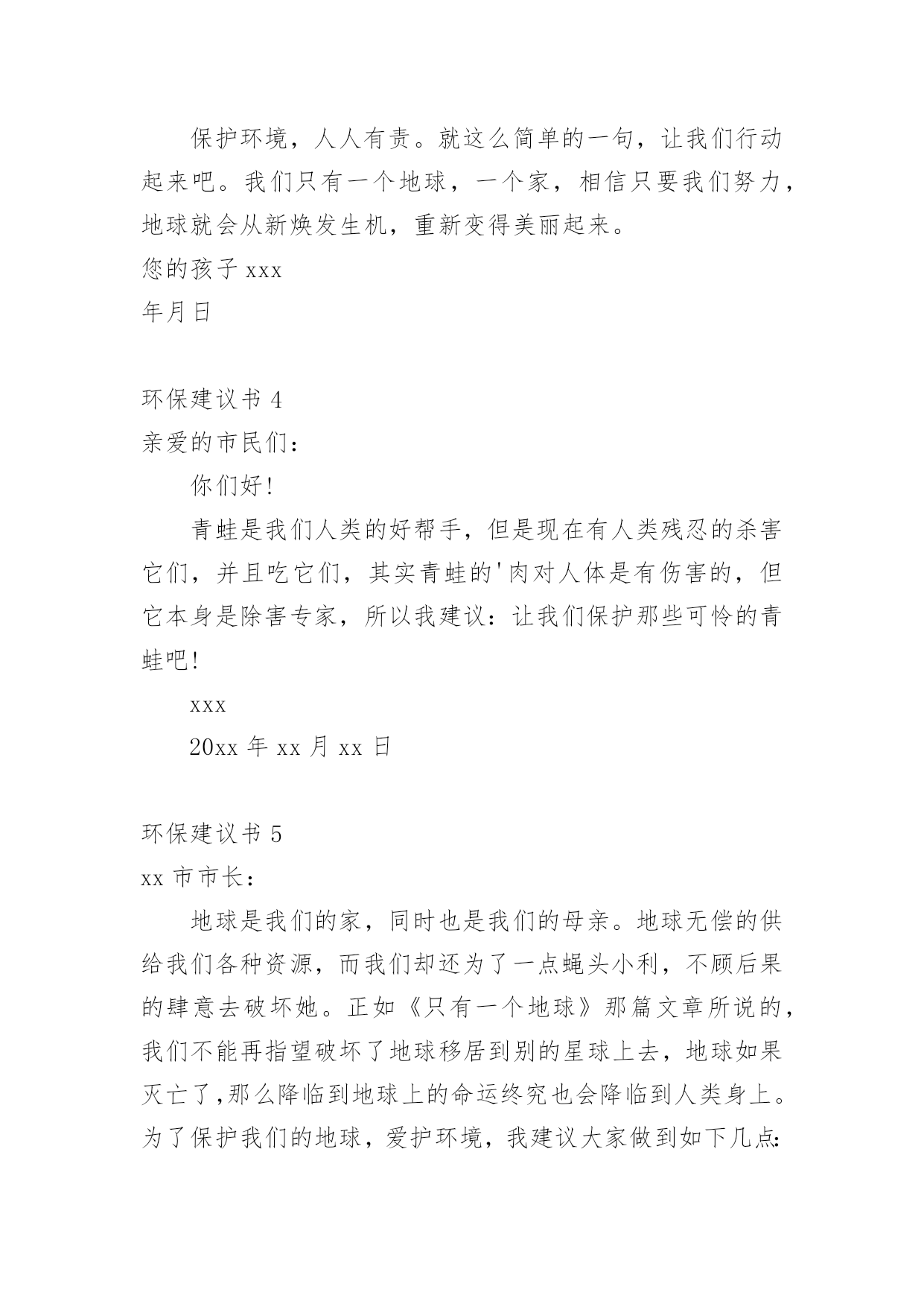 环保建议书环保建议书[荐]在我们平凡的日常里,用到建议书的地方越来越多,当建议书是面对领导和有关部门时,可以中肯地提出自己对对方工作的意见和自己的建议。那么你有了解过建议书吗?以下是小编为大家收集的环保建议书,仅供参考,大家一起来看看吧。环保建议书1市长叔叔:我是统一路小学的一名小学生。我从小就在威海长大,南宁是怎么变化的,我都看到了。从一个不知名的城市变成了一个中国绿色城市,开展了民歌节.……现在在威海,到处可以看到“环境保护,人人有责。”等字样。在马路边上,各种各样的垃圾桶美丽极了。最近,大家都提倡把可回收和不可回收的垃圾桶分开。可是,我觉得光有分类是不行的,要在垃圾桶上写一些可回收一类的`垃圾和不可回收的一类垃圾的种类,不是每个人都想我们一样接受知识多,知道什么是可回收和不回收的垃圾是什么,想那些民工,他们不知道,就会乱丢一气,这样反而不好。不仅起不到环保和垃圾分类的作用,反而会给那些垃圾场的工作人员带来工作的困扰。此外,我还发现一个蛮严重的问题。有一天,我和妈妈还有姥姥一起去坐公共汽车,想要去威海公园。开始我们是开开心心的出门啊,可是当我们去公共汽车车站等车的时候,发现旁边有一个垃圾桶,里面的垃圾已经发臭了,路过的行人纷纷五着鼻子绕到走,我们走过的时候一会闻见一股很大的腐臭味。后来,我在去过的地方,凡是有垃圾桶的,我就仔细观察有没有臭味。经过一段时间的观察,我发现,现在的垃圾桶都是固定的,不像以前那种可以把垃圾倒出来,可是为什么会发臭呢??后来我才知道,原来是因为垃圾桶是固定的,那些环卫工人早晨清垃圾桶的时候,只是简单的把表面的垃圾捡出来,并没有清理到底部。有一次,我就去问他们为什么不把垃圾清理干净?他们说不是不想,是因为垃圾桶是固定的,所以手不能伸到底部,垃圾又不能倒出来,所以就只能把垃圾留在里面了。由此可见,垃圾桶发臭,不是因为环卫工人不尽责,而是因为垃圾桶的设计有问题。我在此希望,为了威海的美丽,为了空气的清新,请市长叔叔再叫人设计过一些既实用,有好看的垃圾桶,不要再让那些臭味来污染我们清新的空气。环保建议书2关系到了我们生活的空气质量,关系到了我们生活在这个社会里的形象,关系到了自己的身体健康。环保问题对于我们来说是个最大的问题,影响着我们的生活,影响了我们的工作,影响我们的生活空间。环保问题必须要严格要求。人的身体是最重要的,人的生活的空间也是最重要的,重要的生活环境,能给人们带来最好的生活的和工作的情绪,能让人们有奋斗的精神,能让人们的生活有活力,生活里我们就应给用这样的最好的生活环境,要让这样的'生活环境给我们一个好的身体,要这样的一个美好的空间带给我们欢乐,让我们的工作顺心,让我们能有高亢的奋斗情绪,生活的环境影响了生活里的人,影响了我们对生活的态度,空气的好坏直接影响到了我们自己的身体健康,我们的身体健康是用我们自己的行为换来的,我们要用我们自己的努力来争取能有一个更好的生活的环境,让我们能有一个给自己生活最美好的未来,这样的生活能让我们生活质量提高,能让我们在这样的环境里有自己的奋斗的目标,环保就是我们的目标,是我们为了自己身体健康,和为了能有个更好的生活的目标来奋斗的目标,这样的目标是针对我们自己的,是关心到我们自己的。环保在生活里真的是太重要了,环保对我们真的是最让人感觉到一个未来空间的形象的了,环保关系到的是我们整个人类,关系到的是我们生活里的所有人。环保对于我们来说是个首要问题,是让我们能有个最好的身体的必要条件。环保建议书3敬爱的村长:您好!地球,这位人类的母亲,我们生命的摇篮,曾经是那样的美丽壮观、和蔼可亲!她无私的为我们提供各种资源。但是人们却随意毁坏自然资源,污染环境,造成一系列生态灾难,给人类带来了严重的威胁。有一天晚上,我去帮妈妈冷拉即使,看见了一位年纪大约五十多岁的中年妇女随手把垃圾扔在了离垃圾桶不远的地方。这样子做带来了环境污染,使小路上充满了臭味。在此,我想提出以下几点建议:1、在村子里多安置一些垃圾桶,最好是分类垃圾桶。因为垃圾可分为“可回收垃圾”与“不可回收垃圾”。这样,一方面可以增加收入节约,另一方面是更加可以保护环境。2、在可以提倡村民多回收一些废报纸与废塑料、废金属等所有可以回收的物品,要分类回收,使资源可以不断再生,从而减少环境污染,保护环境。3、照顾我们身边的一草一木,让树木花草同我们一起茁壮成长。而且树木花草有利于保护环境,可以抵挡住风暴,提供新鲜的氧气。4、大家去买菜时,尽量少用那些红红绿绿的.塑料袋,因为人们用完之后就会乱扔,这也导致了环境的污染。可以多用用篮子去买菜,耐用而且环保。5、大家少用那些一次性的竹筷。因为一次性的竹筷也是需要砍拔树木的。只要我们少用这种竹筷不仅保护了环境,还保护了树木,更是保护了我们所在的环境。保护环境,人人有责。就这么简