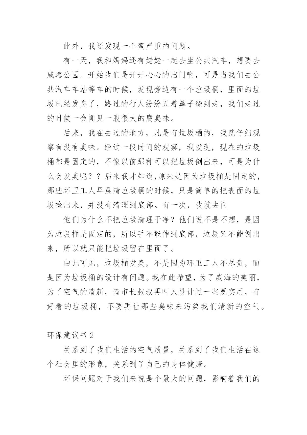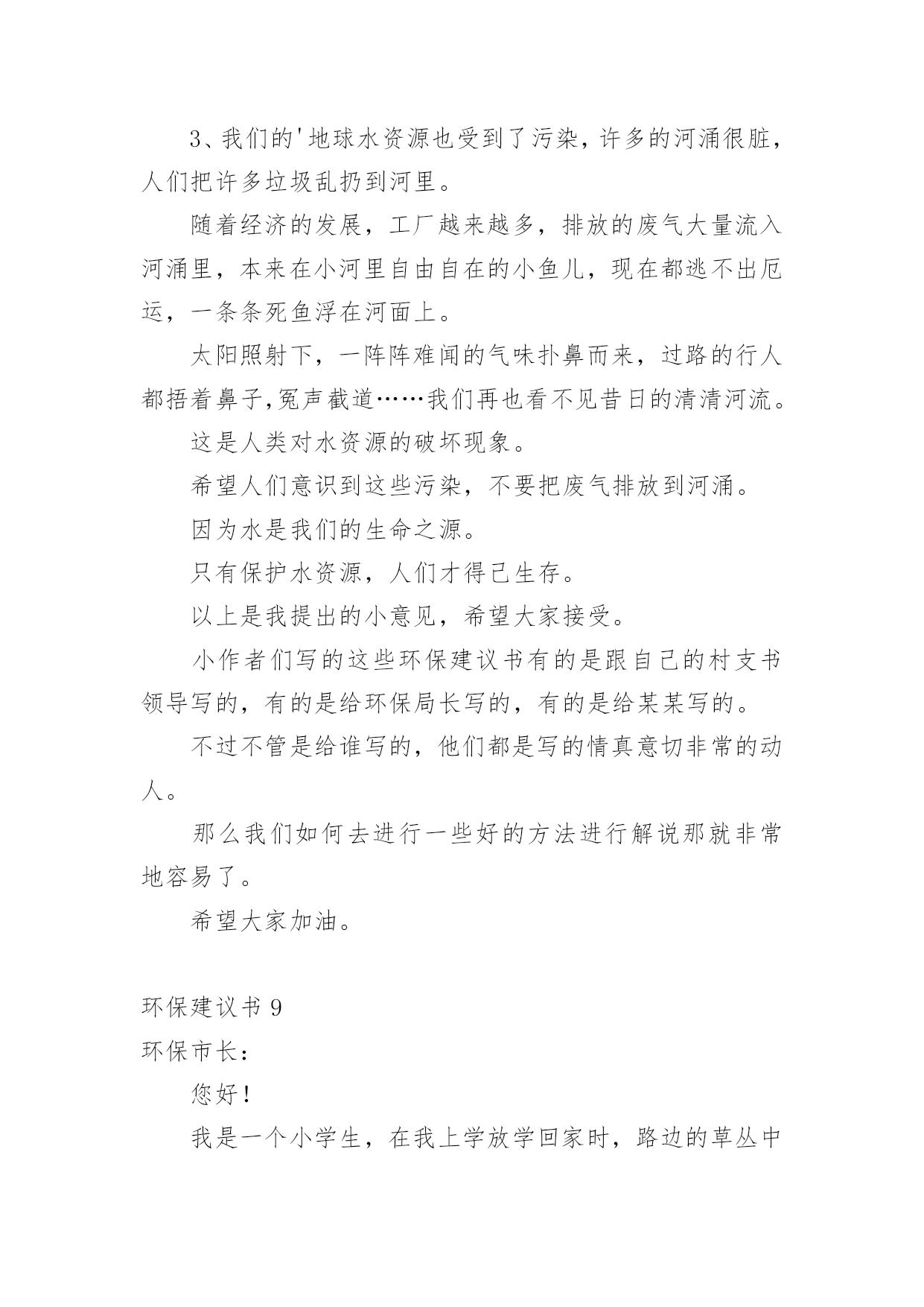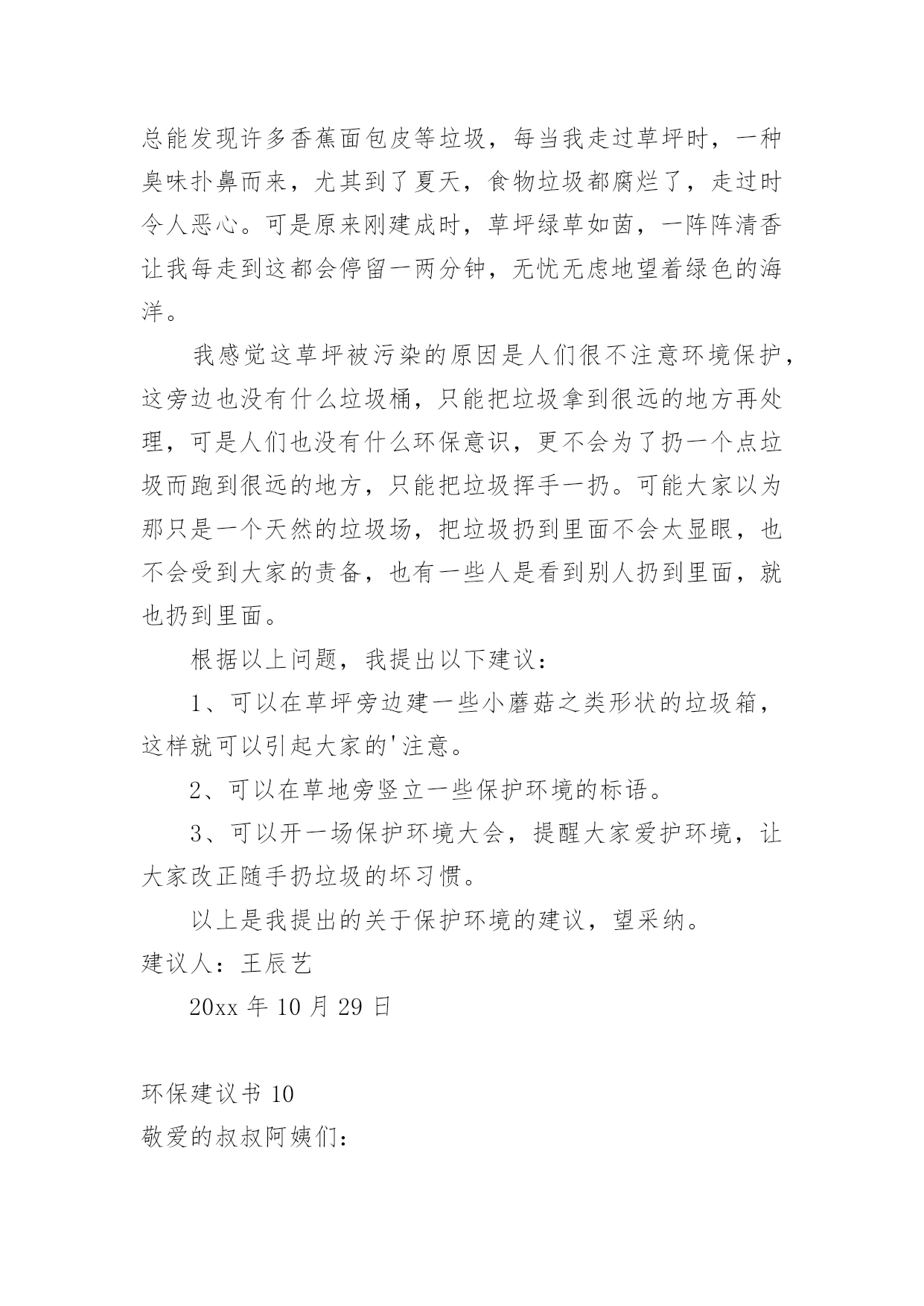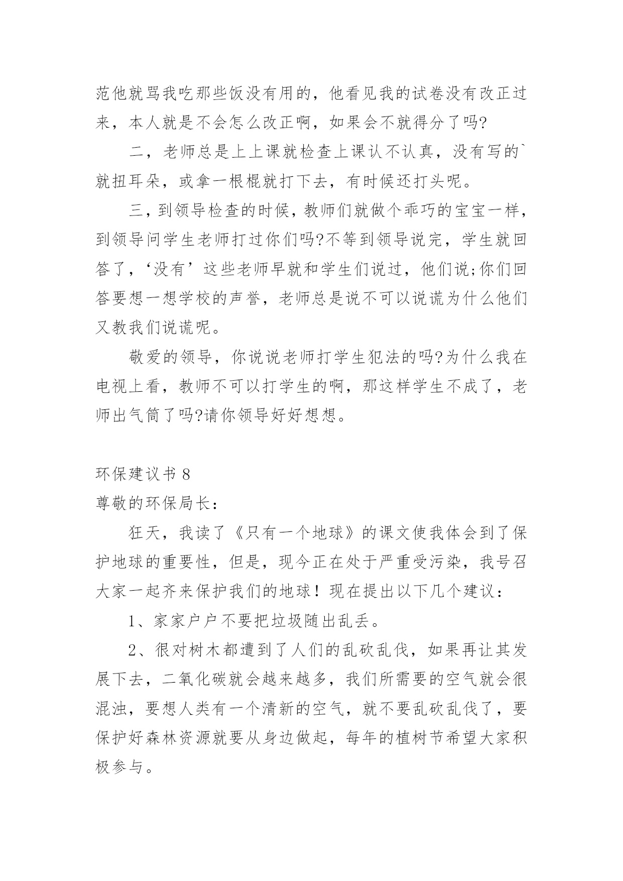 环保建议书环保建议书[荐]在我们平凡的日常里,用到建议书的地方越来越多,当建议书是面对领导和有关部门时,可以中肯地提出自己对对方工作的意见和自己的建议。那么你有了解过建议书吗?以下是小编为大家收集的环保建议书,仅供参考,大家一起来看看吧。环保建议书1市长叔叔:我是统一路小学的一名小学生。我从小就在威海长大,南宁是怎么变化的,我都看到了。从一个不知名的城市变成了一个中国绿色城市,开展了民歌节.……现在在威海,到处可以看到“环境保护,人人有责。”等字样。在马路边上,各种各样的垃圾桶美丽极了。最近,大家都提倡把可回收和不可回收的垃圾桶分开。可是,我觉得光有分类是不行的,要在垃圾桶上写一些可回收一类的`垃圾和不可回收的一类垃圾的种类,不是每个人都想我们一样接受知识多,知道什么是可回收和不回收的垃圾是什么,想那些民工,他们不知道,就会乱丢一气,这样反而不好。不仅起不到环保和垃圾分类的作用,反而会给那些垃圾场的工作人员带来工作的困扰。此外,我还发现一个蛮严重的问题。有一天,我和妈妈还有姥姥一起去坐公共汽车,想要去威海公园。开始我们是开开心心的出门啊,可是当我们去公共汽车车站等车的时候,发现旁边有一个垃圾桶,里面的垃圾已经发臭了,路过的行人纷纷五着鼻子绕到走,我们走过的时候一会闻见一股很大的腐臭味。后来,我在去过的地方,凡是有垃圾桶的,我就仔细观察有没有臭味。经过一段时间的观察,我发现,现在的垃圾桶都是固定的,不像以前那种可以把垃圾倒出来,可是为什么会发臭呢??后来我才知道,原来是因为垃圾桶是固定的,那些环卫工人早晨清垃圾桶的时候,只是简单的把表面的垃圾捡出来,并没有清理到底部。有一次,我就去问他们为什么不把垃圾清理干净?他们说不是不想,是因为垃圾桶是固定的,所以手不能伸到底部,垃圾又不能倒出来,所以就只能把垃圾留在里面了。由此可见,垃圾桶发臭,不是因为环卫工人不尽责,而是因为垃圾桶的设计有问题。我在此希望,为了威海的美丽,为了空气的清新,请市长叔叔再叫人设计过一些既实用,有好看的垃圾桶,不要再让那些臭味来污染我们清新的空气。环保建议书2关系到了我们生活的空气质量,关系到了我们生活在这个社会里的形象,关系到了自己的身体健康。环保问题对于我们来说是个最大的问题,影响着我们的生活,影响了我们的工作,影响我们的生活空间。环保问题必须要严格要求。人的身体是最重要的,人的生活的空间也是最重要的,重要的生活环境,能给人们带来最好的生活的和工作的情绪,能让人们有奋斗的精神,能让人们的生活有活力,生活里我们就应给用这样的最好的生活环境,要让这样的'生活环境给我们一个好的身体,要这样的一个美好的空间带给我们欢乐,让我们的工作顺心,让我们能有高亢的奋斗情绪,生活的环境影响了生活里的人,影响了我们对生活的态度,空气的好坏直接影响到了我们自己的身体健康,我们的身体健康是用我们自己的行为换来的,我们要用我们自己的努力来争取能有一个更好的生活的环境,让我们能有一个给自己生活最美好的未来,这样的生活能让我们生活质量提高,能让我们在这样的环境里有自己的奋斗的目标,环保就是我们的目标,是我们为了自己身体健康,和为了能有个更好的生活的目标来奋斗的目标,这样的目标是针对我们自己的,是关心到我们自己的。环保在生活里真的是太重要了,环保对我们真的是最让人感觉到一个未来空间的形象的了,环保关系到的是我们整个人类,关系到的是我们生活里的所有人。环保对于我们来说是个首要问题,是让我们能有个最好的身体的必要条件。环保建议书3敬爱的村长:您好!地球,这位人类的母亲,我们生命的摇篮,曾经是那样的美丽壮观、和蔼可亲!她无私的为我们提供各种资源。但是人们却随意毁坏自然资源,污染环境,造成一系列生态灾难,给人类带来了严重的威胁。有一天晚上,我去帮妈妈冷拉即使,看见了一位年纪大约五十多岁的中年妇女随手把垃圾扔在了离垃圾桶不远的地方。这样子做带来了环境污染,使小路上充满了臭味。在此,我想提出以下几点建议:1、在村子里多安置一些垃圾桶,最好是分类垃圾桶。因为垃圾可分为“可回收垃圾”与“不可回收垃圾”。这样,一方面可以增加收入节约,另一方面是更加可以保护环境。2、在可以提倡村民多回收一些废报纸与废塑料、废金属等所有可以回收的物品,要分类回收,使资源可以不断再生,从而减少环境污染,保护环境。3、照顾我们身边的一草一木,让树木花草同我们一起茁壮成长。而且树木花草有利于保护环境,可以抵挡住风暴,提供新鲜的氧气。4、大家去买菜时,尽量少用那些红红绿绿的.塑料袋,因为人们用完之后就会乱扔,这也导致了环境的污染。可以多用用篮子去买菜,耐用而且环保。5、大家少用那些一次性的竹筷。因为一次性的竹筷也是需要砍拔树木的。只要我们少用这种竹筷不仅保护了环境,还保护了树木,更是保护了我们所在的环境。保护环境,人人有责。就这么简