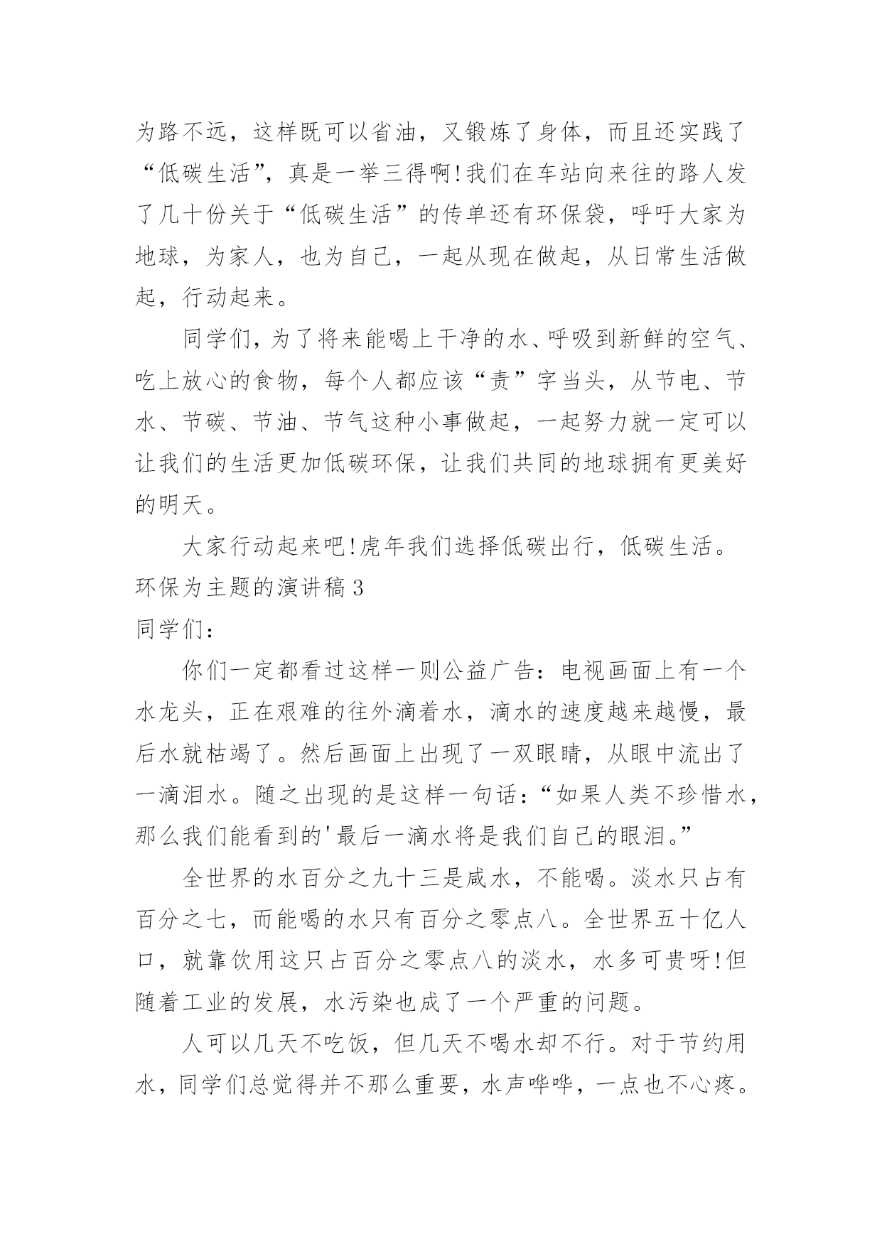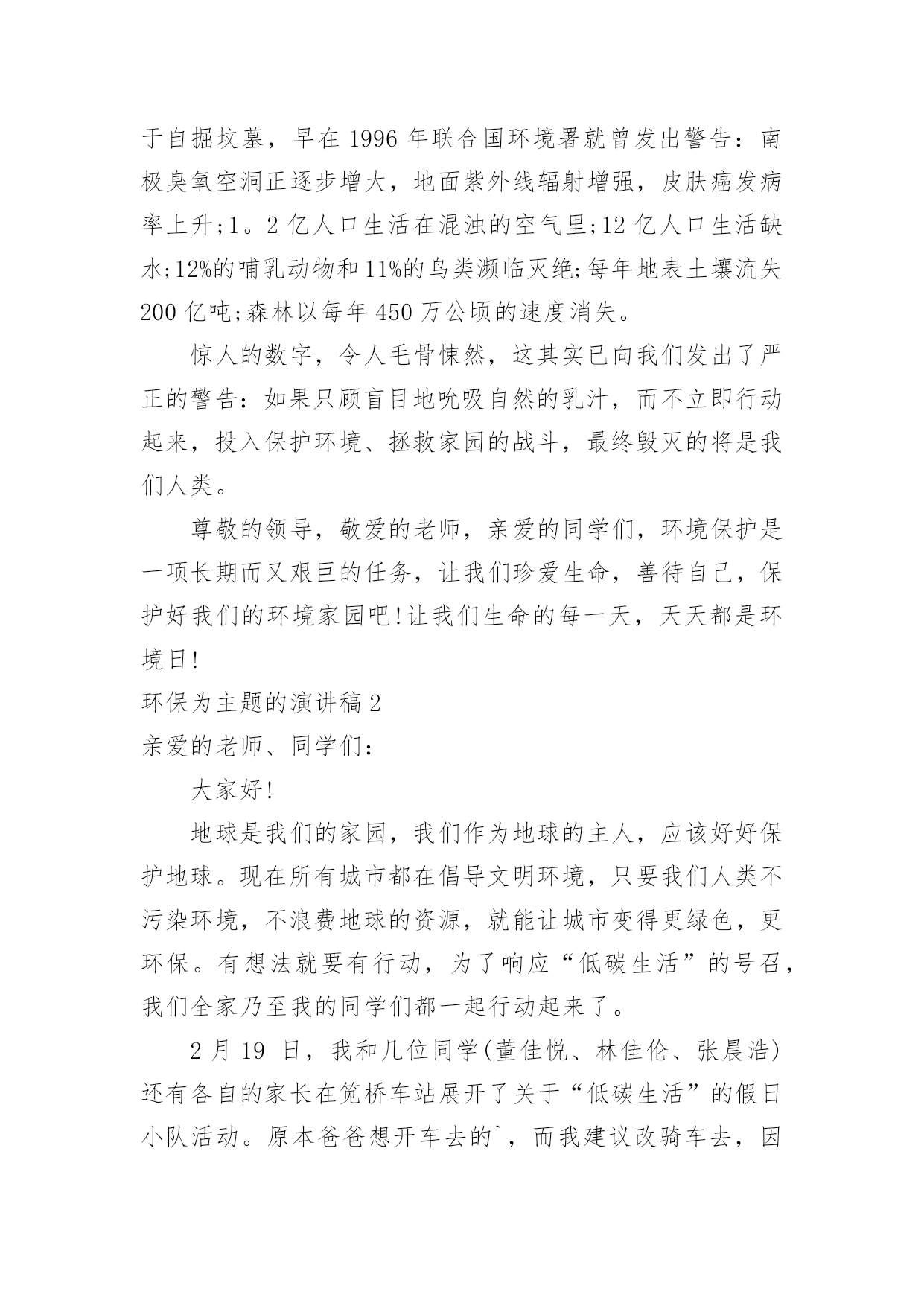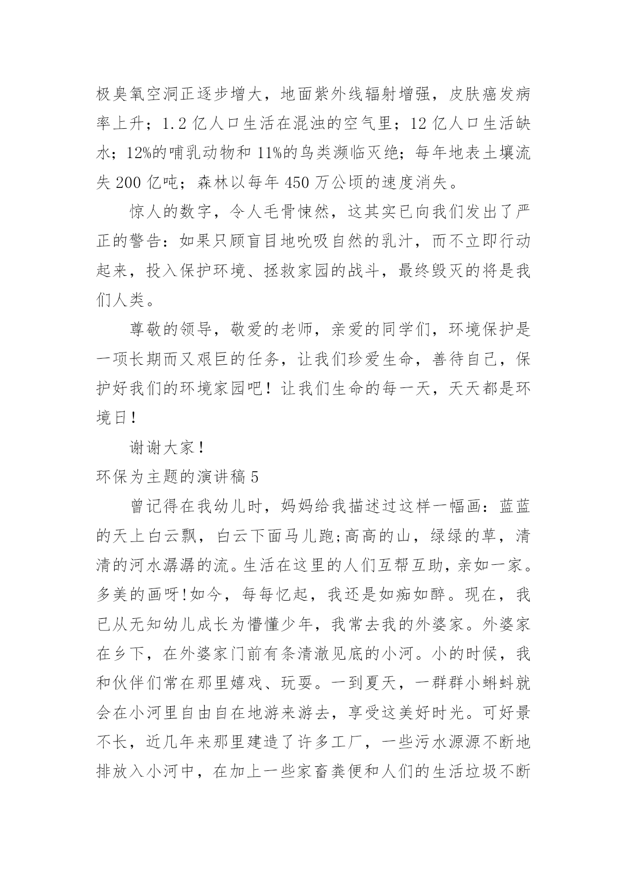 环保为主题的演讲稿环保为主题的演讲稿通过对演讲稿语言的推究可以提高语言的表现力,增强语言的感染力。在快速变化和不断变革的新时代,我们可以使用演讲稿的机会越来越多,写起演讲稿来就毫无头绪?下面是小编帮大家整理的环保为主题的演讲稿,仅供参考,大家一起来看看吧。环保为主题的演讲稿1尊敬的各位领导,敬爱的老师,亲爱的同学们:早上好!21世纪可谓挑战与机遇并同在,希望与困难共存。它在给我们带来许多美好憧憬的同时,也给我们带来了许多难题,其中首要的就是环境问题。环境与我们的生活极为密切,与我们的生存息息相关。很久以来,我们赖以生存的环境就引起了许多有识之士的极大关注。1972年6月5日,人类环境会议在斯德哥尔摩开幕,会上通过了著名的《人类环境宣言》。同年10月,第27届联合国大会通过决议,将以后每年的6月5日定为世界环境日。今年的环境日已过去两天了,但人们对环境的思考和保护永远不会停止,在我们的生命历程里,应该天天都是环境日。伟大的`无产阶级革命导师恩格斯说过:"我们连同我们的血、肉、头脑一起都属于自然界,存在于自然界。"自然界作为一种客观存在,它为人类提供了各种物质和能量,是人类存在和延续的基础。优美和谐的自然环境,必然为我们带来身心的愉悦和无限的乐趣。"明月松间照,清泉石上流",让我们感受清幽;"大漠孤烟直,长河落日圆",让我们触摸壮丽;"流连戏蝶时时舞,自在娇莺恰恰啼",让我们聆听喧闹;"春水碧如天,画船听雨眠",让我们亲近悠闲;"棠梨叶落胭脂色,荠麦花开白雪香",让我们体味斑澜。碧海蓝天,看海鸥飞翔;冰封雪飘,听松涛轰鸣;莺飞草长,闻鸟语、嗅花香。清晨,观赏大海分娩太阳;夜晚,清数广宇闪烁星辰;雨天,让雨点亲吻面颊;雪天,让雪花栖挂眉梢;喂蚂蚁美餐,浇花草甘露;问候晨曦"你好",道别月色"晚安"。美丽的自然带来美丽的心境,美丽的心境带来了美丽的生活。千百年来,人类在不断地认识自然,利用自然,改造自然中造福着自己。世界文学大师雨果说:"大自然既是善良的慈母,同时也是冷酷的屠夫。"近年来,人类由于对环境不够珍惜,随心所欲,滥伐林木,滥建厂房,生存环境遭到了严重破坏,各种环境问题接踵而至:森林退化,沙尘暴扬,水土流失,洪水肆虐,火灾频发,噪音刺耳,臭气熏天,酸雨赤潮,臭氧空洞……空中烟囱林立,浓烟滚滚,河中死鱼漂荡,污水滔滔;地上垃圾遍布,废渣成堆……人为地破坏环境,无异于自掘坟墓,早在1996年联合国环境署就曾发出警告:南极臭氧空洞正逐步增大,地面紫外线辐射增强,皮肤癌发病率上升;1。2亿人口生活在混浊的空气里;12亿人口生活缺水;12%的哺乳动物和11%的鸟类濒临灭绝;每年地表土壤流失200亿吨;森林以每年450万公顷的速度消失。惊人的数字,令人毛骨悚然,这其实已向我们发出了严正的警告:如果只顾盲目地吮吸自然的乳汁,而不立即行动起来,投入保护环境、拯救家园的战斗,最终毁灭的将是我们人类。尊敬的领导,敬爱的老师,亲爱的同学们,环境保护是一项长期而又艰巨的任务,让我们珍爱生命,善待自己,保护好我们的环境家园吧!让我们生命的每一天,天天都是环境日!环保为主题的演讲稿2亲爱的老师、同学们:大家好!地球是我们的家园,我们作为地球的主人,应该好好保护地球。现在所有城市都在倡导文明环境,只要我们人类不污染环境,不浪费地球的资源,就能让城市变得更绿色,更环保。有想法就要有行动,为了响应“低碳生活”的号召,我们全家乃至我的同学们都一起行动起来了。2月19日,我和几位同学(董佳悦、林佳伦、张晨浩)还有各自的家长在笕桥车站展开了关于“低碳生活”的假日小队活动。原本爸爸想开车去的`,而我建议改骑车去,因为路不远,这样既可以省油,又锻炼了身体,而且还实践了“低碳生活”,真是一举三得啊!我们在车站向来往的路人发了几十份关于“低碳生活”的传单还有环保袋,呼吁大家为地球,为家人,也为自己,一起从现在做起,从日常生活做起,行动起来。同学们,为了将来能喝上干净的水、呼吸到新鲜的空气、吃上放心的食物,每个人都应该“责”字当头,从节电、节水、节碳、节油、节气这种小事做起,一起努力就一定可以让我们的生活更加低碳环保,让我们共同的地球拥有更美好的明天。大家行动起来吧!虎年我们选择低碳出行,低碳生活。环保为主题的演讲稿3同学们:你们一定都看过这样一则公益广告:电视画面上有一个水龙头,正在艰难的往外滴着水,滴水的速度越来越慢,最后水就枯竭了。然后画面上出现了一双眼睛,从眼中流出了一滴泪水。随之出现的是这样一句话:“如果人类不珍惜水,那么我们能看到的'最后一滴水将是我们自己的眼泪。”全世界的水百分之九十三是咸水,不能喝。淡水只占有百分之七,而能喝的水只有百分之零点八。全世界五十亿人口,就靠饮用这只占百分之零点八的淡水,水多可贵呀!但随着工业的发展,水污染也成了一个严重的问题。人