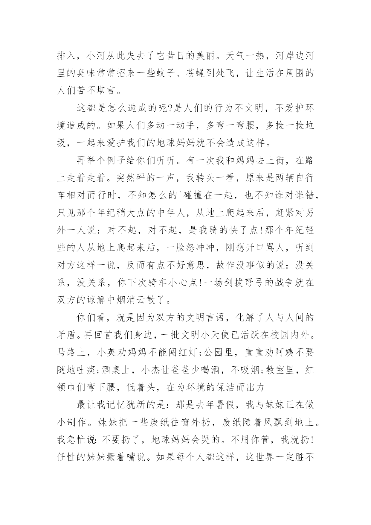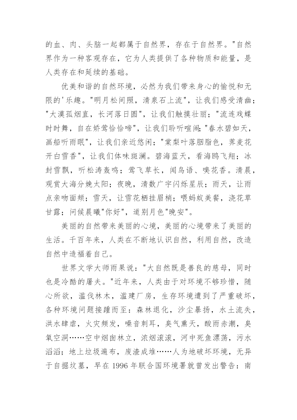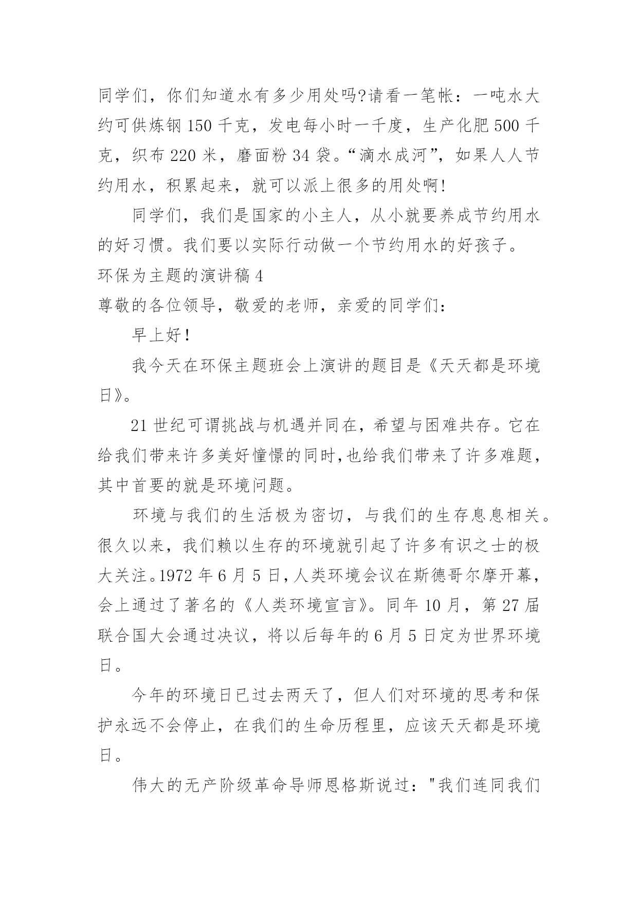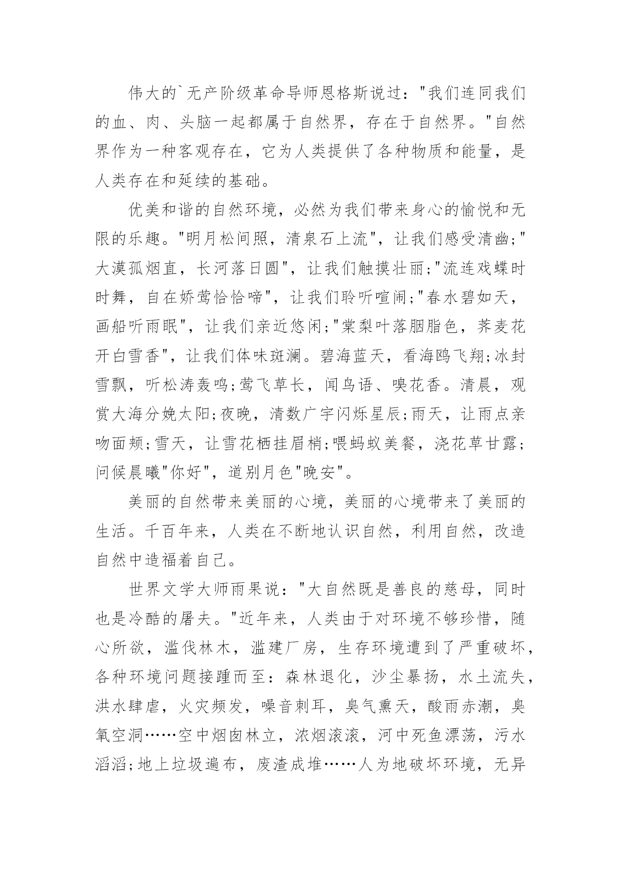 环保为主题的演讲稿环保为主题的演讲稿通过对演讲稿语言的推究可以提高语言的表现力,增强语言的感染力。在快速变化和不断变革的新时代,我们可以使用演讲稿的机会越来越多,写起演讲稿来就毫无头绪?下面是小编帮大家整理的环保为主题的演讲稿,仅供参考,大家一起来看看吧。环保为主题的演讲稿1尊敬的各位领导,敬爱的老师,亲爱的同学们:早上好!21世纪可谓挑战与机遇并同在,希望与困难共存。它在给我们带来许多美好憧憬的同时,也给我们带来了许多难题,其中首要的就是环境问题。环境与我们的生活极为密切,与我们的生存息息相关。很久以来,我们赖以生存的环境就引起了许多有识之士的极大关注。1972年6月5日,人类环境会议在斯德哥尔摩开幕,会上通过了著名的《人类环境宣言》。同年10月,第27届联合国大会通过决议,将以后每年的6月5日定为世界环境日。今年的环境日已过去两天了,但人们对环境的思考和保护永远不会停止,在我们的生命历程里,应该天天都是环境日。伟大的`无产阶级革命导师恩格斯说过:"我们连同我们的血、肉、头脑一起都属于自然界,存在于自然界。"自然界作为一种客观存在,它为人类提供了各种物质和能量,是人类存在和延续的基础。优美和谐的自然环境,必然为我们带来身心的愉悦和无限的乐趣。"明月松间照,清泉石上流",让我们感受清幽;"大漠孤烟直,长河落日圆",让我们触摸壮丽;"流连戏蝶时时舞,自在娇莺恰恰啼",让我们聆听喧闹;"春水碧如天,画船听雨眠",让我们亲近悠闲;"棠梨叶落胭脂色,荠麦花开白雪香",让我们体味斑澜。碧海蓝天,看海鸥飞翔;冰封雪飘,听松涛轰鸣;莺飞草长,闻鸟语、嗅花香。清晨,观赏大海分娩太阳;夜晚,清数广宇闪烁星辰;雨天,让雨点亲吻面颊;雪天,让雪花栖挂眉梢;喂蚂蚁美餐,浇花草甘露;问候晨曦"你好",道别月色"晚安"。美丽的自然带来美丽的心境,美丽的心境带来了美丽的生活。千百年来,人类在不断地认识自然,利用自然,改造自然中造福着自己。世界文学大师雨果说:"大自然既是善良的慈母,同时也是冷酷的屠夫。"近年来,人类由于对环境不够珍惜,随心所欲,滥伐林木,滥建厂房,生存环境遭到了严重破坏,各种环境问题接踵而至:森林退化,沙尘暴扬,水土流失,洪水肆虐,火灾频发,噪音刺耳,臭气熏天,酸雨赤潮,臭氧空洞……空中烟囱林立,浓烟滚滚,河中死鱼漂荡,污水滔滔;地上垃圾遍布,废渣成堆……人为地破坏环境,无异于自掘坟墓,早在1996年联合国环境署就曾发出警告:南极臭氧空洞正逐步增大,地面紫外线辐射增强,皮肤癌发病率上升;1。2亿人口生活在混浊的空气里;12亿人口生活缺水;12%的哺乳动物和11%的鸟类濒临灭绝;每年地表土壤流失200亿吨;森林以每年450万公顷的速度消失。惊人的数字,令人毛骨悚然,这其实已向我们发出了严正的警告:如果只顾盲目地吮吸自然的乳汁,而不立即行动起来,投入保护环境、拯救家园的战斗,最终毁灭的将是我们人类。尊敬的领导,敬爱的老师,亲爱的同学们,环境保护是一项长期而又艰巨的任务,让我们珍爱生命,善待自己,保护好我们的环境家园吧!让我们生命的每一天,天天都是环境日!环保为主题的演讲稿2亲爱的老师、同学们:大家好!地球是我们的家园,我们作为地球的主人,应该好好保护地球。现在所有城市都在倡导文明环境,只要我们人类不污染环境,不浪费地球的资源,就能让城市变得更绿色,更环保。有想法就要有行动,为了响应“低碳生活”的号召,我们全家乃至我的同学们都一起行动起来了。2月19日,我和几位同学(董佳悦、林佳伦、张晨浩)还有各自的家长在笕桥车站展开了关于“低碳生活”的假日小队活动。原本爸爸想开车去的`,而我建议改骑车去,因为路不远,这样既可以省油,又锻炼了身体,而且还实践了“低碳生活”,真是一举三得啊!我们在车站向来往的路人发了几十份关于“低碳生活”的传单还有环保袋,呼吁大家为地球,为家人,也为自己,一起从现在做起,从日常生活做起,行动起来。同学们,为了将来能喝上干净的水、呼吸到新鲜的空气、吃上放心的食物,每个人都应该“责”字当头,从节电、节水、节碳、节油、节气这种小事做起,一起努力就一定可以让我们的生活更加低碳环保,让我们共同的地球拥有更美好的明天。大家行动起来吧!虎年我们选择低碳出行,低碳生活。环保为主题的演讲稿3同学们:你们一定都看过这样一则公益广告:电视画面上有一个水龙头,正在艰难的往外滴着水,滴水的速度越来越慢,最后水就枯竭了。然后画面上出现了一双眼睛,从眼中流出了一滴泪水。随之出现的是这样一句话:“如果人类不珍惜水,那么我们能看到的'最后一滴水将是我们自己的眼泪。”全世界的水百分之九十三是咸水,不能喝。淡水只占有百分之七,而能喝的水只有百分之零点八。全世界五十亿人口,就靠饮用这只占百分之零点八的淡水,水多可贵呀!但随着工业的发展,水污染也成了一个严重的问题。人