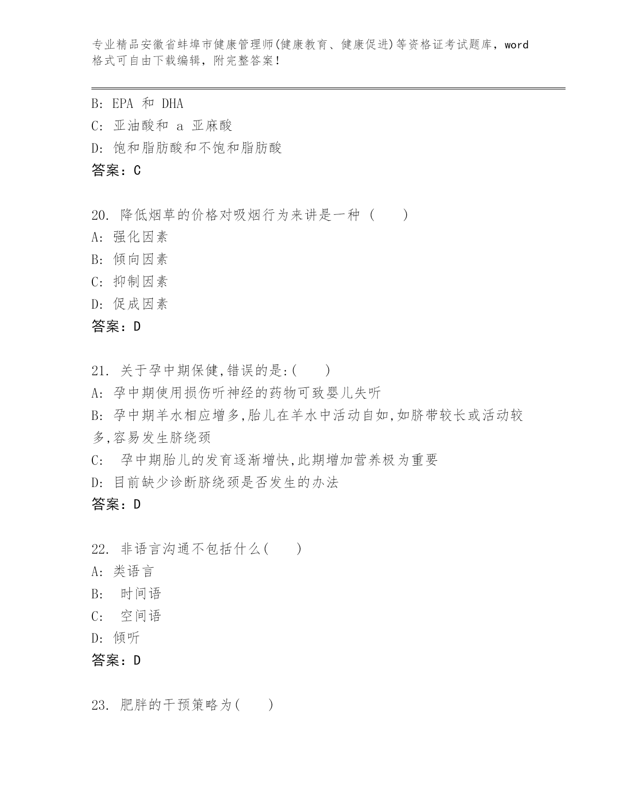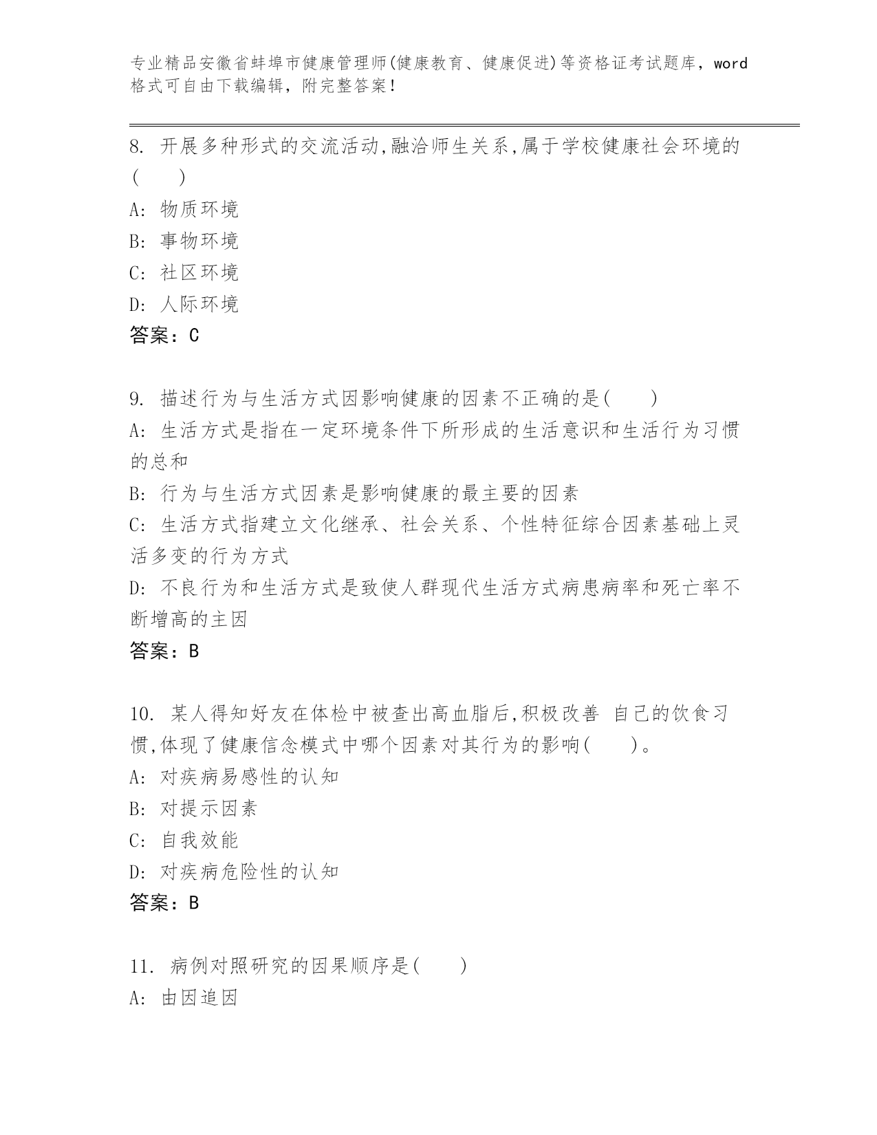 历年安徽省蚌埠市健康管理师(健康教育、健康促进)等资格证考试通用题库【易错题】