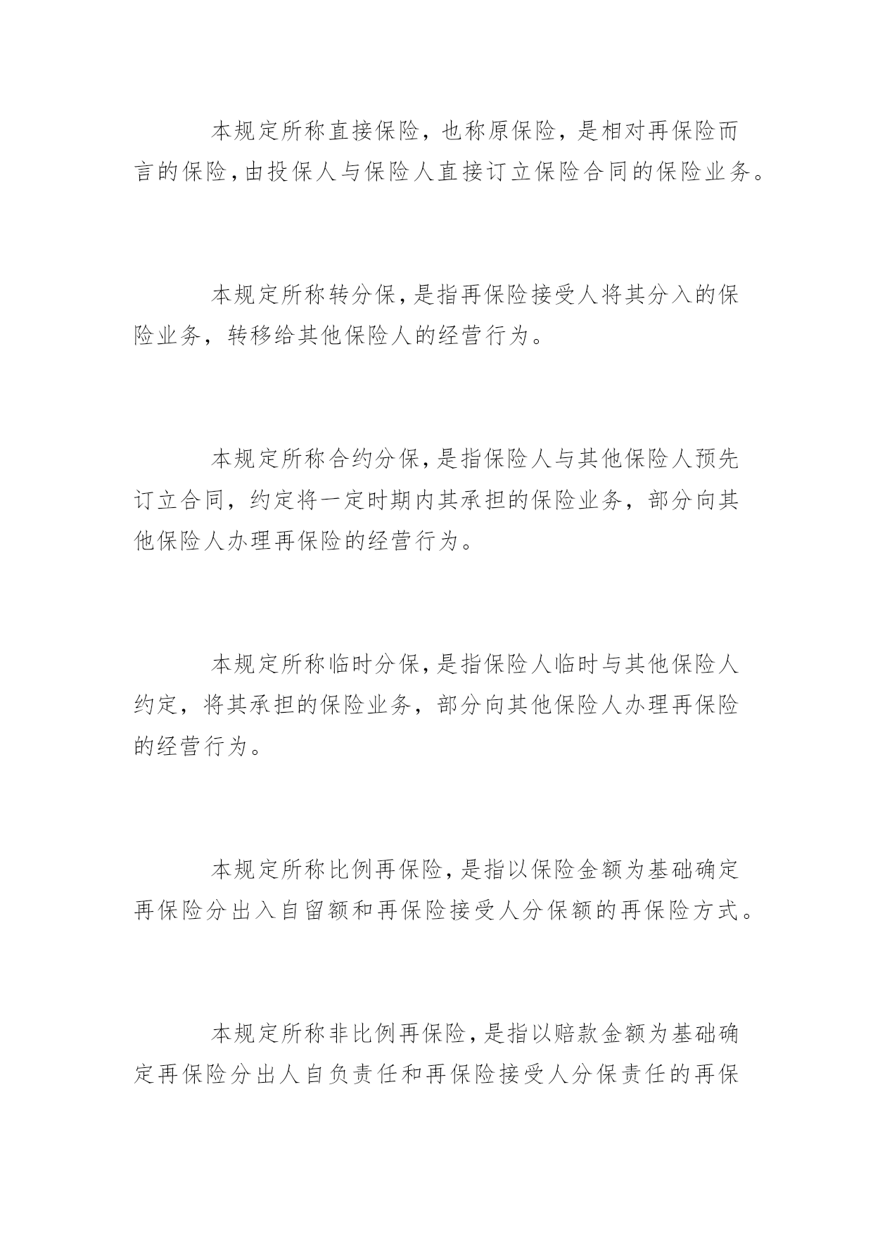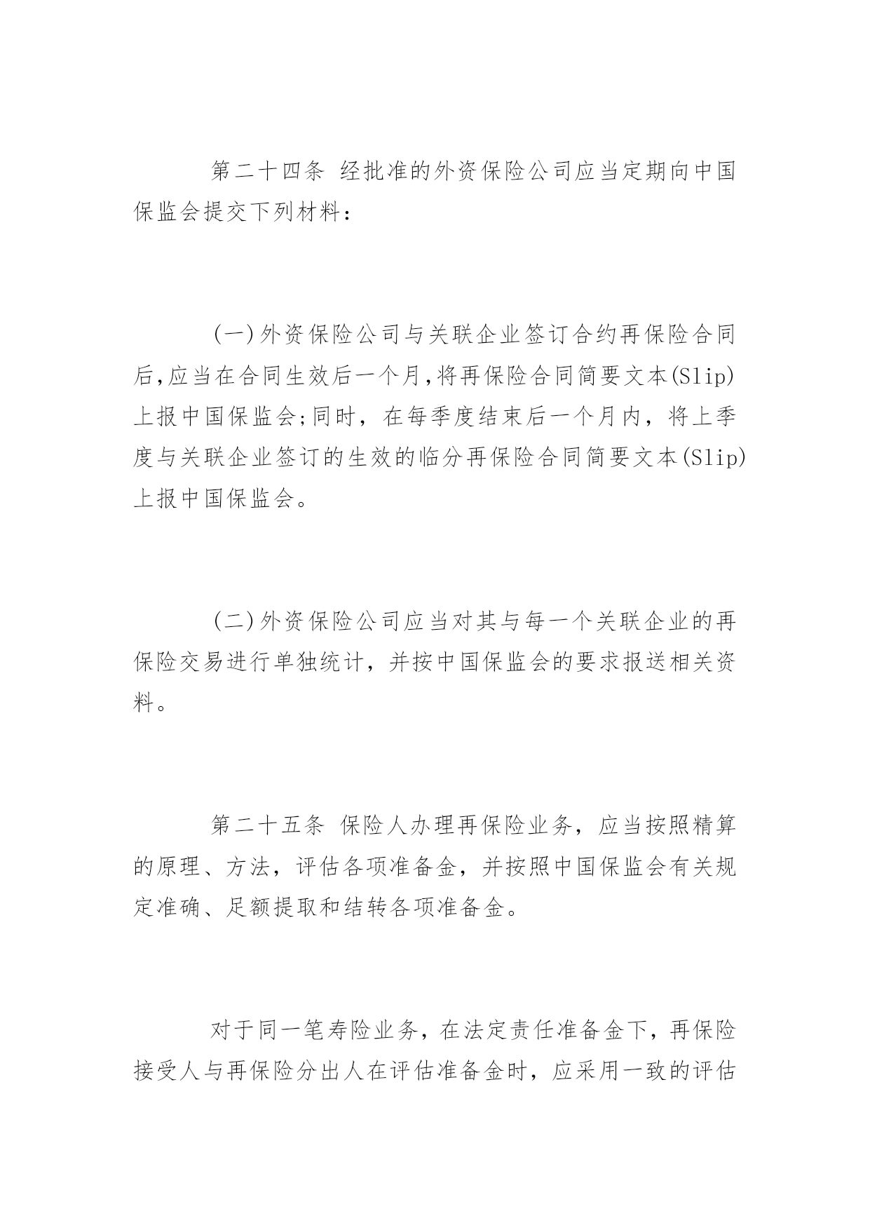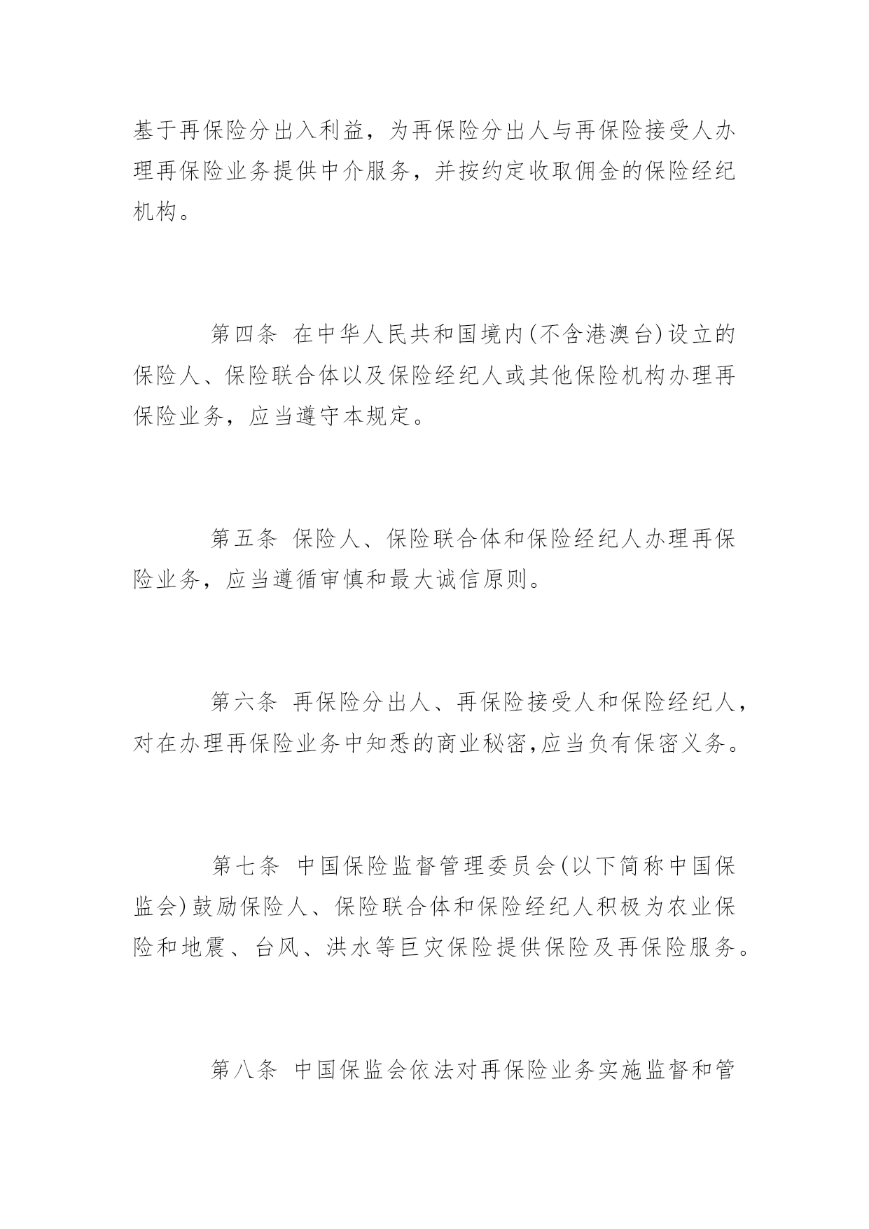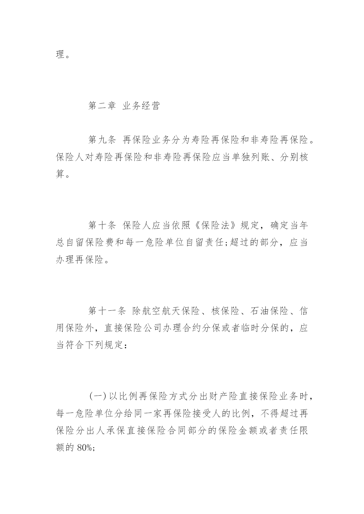 再保险业务管理规定关于再保险业务管理规定2010年5月21日中国保险监督管理委员会令2010年第8号公布自2010年7月1日起施行,下面是小编为您精心整理的关于再保险业务管理规定全文内容,仅供大家参考。第一章总则第一条为了规范和发展再保险市场,加强对再保险业务的管理,实现保险业健康协调可持续发展,依据《中华人民共和国保险法》(以下简称《保险法》)、《中华人民共和国外资保险公司管理条例》以及有关法律、行政法规,制定本规定。第二条本规定所称再保险,是指保险人将其承担的保险业务,部分转移给其他保险人的经营行为。本规定所称直接保险,也称原保险,是相对再保险而言的保险,由投保人与保险人直接订立保险合同的保险业务。本规定所称转分保,是指再保险接受人将其分入的保险业务,转移给其他保险人的经营行为。本规定所称合约分保,是指保险人与其他保险人预先订立合同,约定将一定时期内其承担的保险业务,部分向其他保险人办理再保险的经营行为。本规定所称临时分保,是指保险人临时与其他保险人约定,将其承担的保险业务,部分向其他保险人办理再保险的经营行为。本规定所称比例再保险,是指以保险金额为基础确定再保险分出入自留额和再保险接受人分保额的再保险方式。本规定所称非比例再保险,是指以赔款金额为基础确定再保险分出人自负责任和再保险接受人分保责任的再保险方式。第三条本规定所称再保险分出人,是指将其承担的保险业务,部分转移给其他保险人的保险人;本规定所称再保险接受人,是指承接其他保险人转移的保险业务的保险人。本规定所称分出业务,是指再保险分出人转移出的保险业务;本规定所称分入业务,是指再保险接受人接受分入的保险业务。本规定所称直接保险公司,也称原保险公司,是相对再保险人而言,是指直接与投保人订立保险合同的保险人。本规定所称保险联合体,是指为了处理单个保险人无法承担的特殊风险或者巨额保险业务,或者按照国际惯例,由两个或两个以上保险人联合组成、按照其章程约定共同经营保险业务的组织。本规定所称保险经纪人,是指接受再保险分出人委托,基于再保险分出入利益,为再保险分出人与再保险接受人办理再保险业务提供中介服务,并按约定收取佣金的保险经纪机构。第四条在中华人民共和国境内(不含港澳台)设立的保险人、保险联合体以及保险经纪人或其他保险机构办理再保险业务,应当遵守本规定。第五条保险人、保险联合体和保险经纪人办理再保险业务,应当遵循审慎和最大诚信原则。第六条再保险分出人、再保险接受人和保险经纪人,对在办理再保险业务中知悉的商业秘密,应当负有保密义务。第七条中国保险监督管理委员会(以下简称中国保监会)鼓励保险人、保险联合体和保险经纪人积极为农业保险和地震、台风、洪水等巨灾保险提供保险及再保险服务。第八条中国保监会依法对再保险业务实施监督和管理。第二章业务经营第九条再保险业务分为寿险再保险和非寿险再保险。保险人对寿险再保险和非寿险再保险应当单独列账、分别核算。第十条保险人应当依照《保险法》规定,确定当年总自留保险费和每一危险单位自留责任;超过的部分,应当办理再保险。第十一条除航空航天保险、核保险、石油保险、信用保险外,直接保险公司办理合约分保或者临时分保的,应当符合下列规定:(一)以比例再保险方式分出财产险直接保险业务时,每一危险单位分给同一家再保险接受人的比例,不得超过再保险分出人承保直接保险合同部分的保险金额或者责任限额的80%;(二)每一临时分保合同分给投保人关联企业的保险金额或者责任限额,不得超过直接保险业务保险金额或者责任限额的20%。第十二条保险人对危险单位的划分应当符合中国保监会的相关规定,并于每年3月31日之前,将危险单位的划分方法报中国保监会备案。第十三条保险人应当根据实际情况,科学、合理安排巨灾再保险,并于每年6月30日之前,将巨灾风险安排方案报中国保监会备案。第十四条保险人应当按照中国保监会的规定办理再保险,并审慎选择再保险接受人,选择再保险接受人应当符合中国保监会的有关规定。第十五条再保险分出人应当将影响再保险定价和分保条件的'重要信息向再保险接受人书面告知。再保险合同成立后,再保险分出人应及时向再保险接受人提供重大赔案信息、赔款准备金等对再保险接受人的准备金建立及预期赔付有重大影响的信息。第十六条保险人和保险经纪人可以利用金融工具开发设计新型风险转移产品。保险人应当按照有关规定向中国保监会报告。第十七条中国境内的专业再保险接受人,应当配备在中国境内有住所的专职再保险核保人和再保险核赔人。第三章再保险经纪业务第十八条保险经纪人从事再保险经纪业务,不得损害保险人的信誉和合法权益。第十九条保险经纪人可以根据业务需要引进或者设计再保险合同。第二十条保险经纪人应当按照与再保险分出人的约定,及时寄送账单、结算
