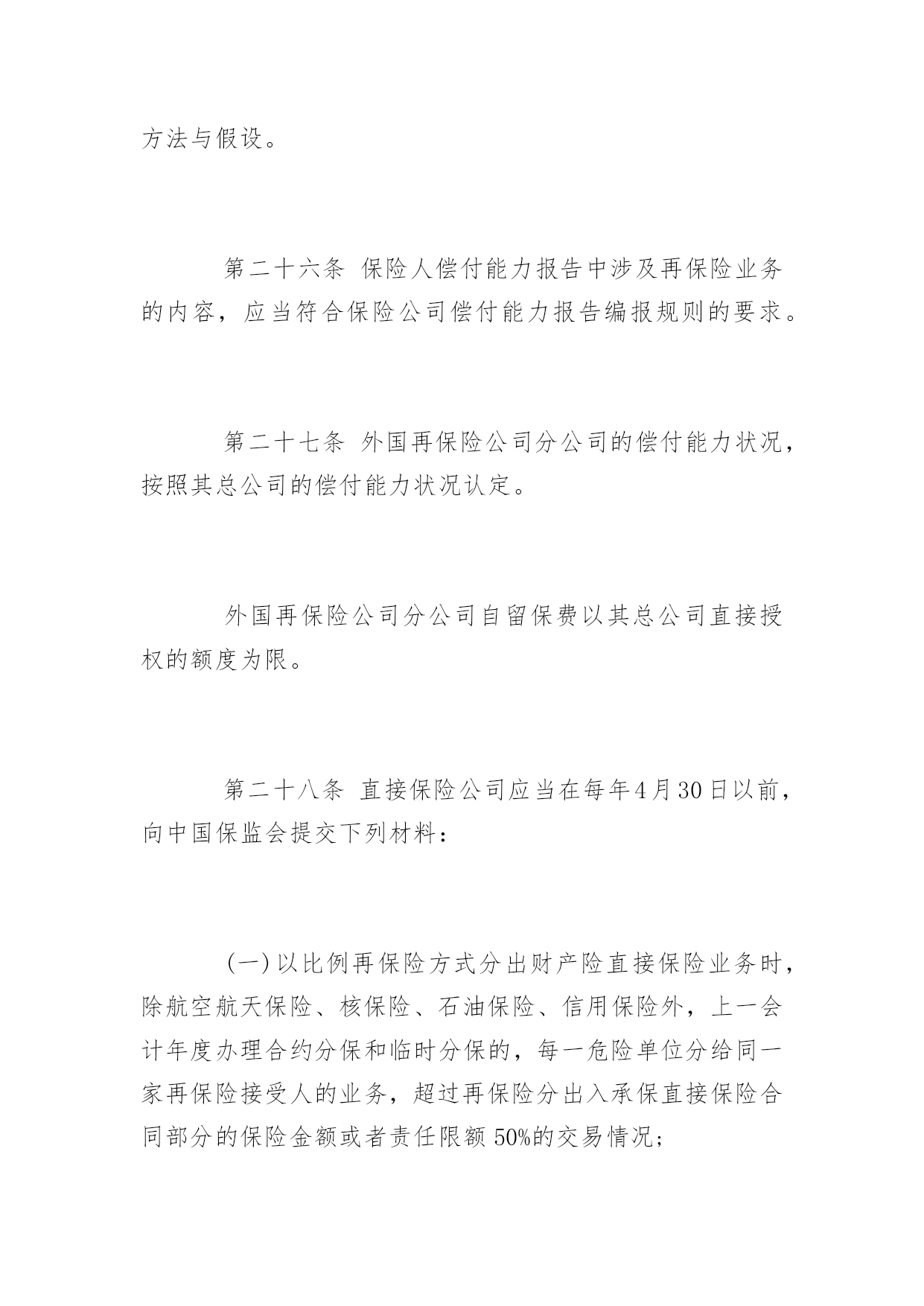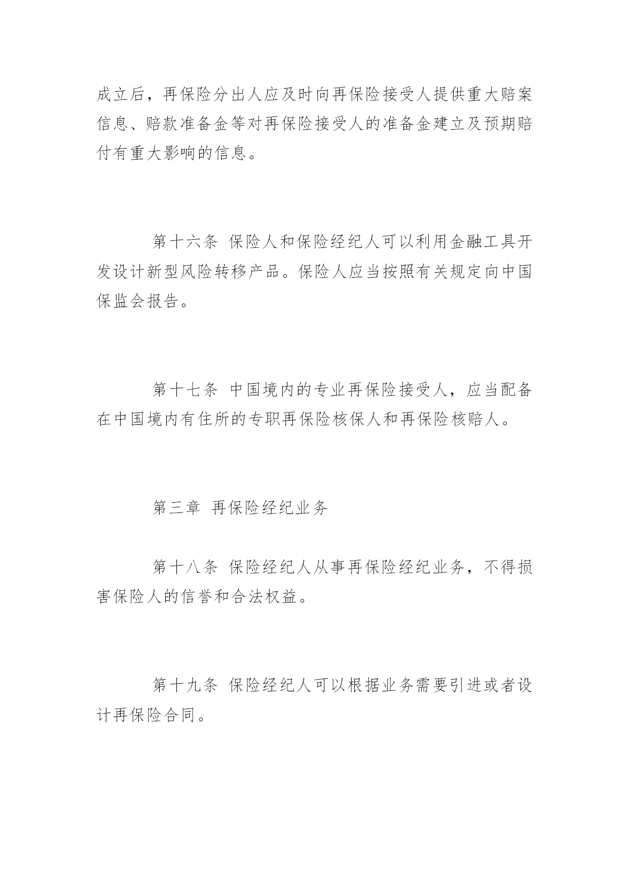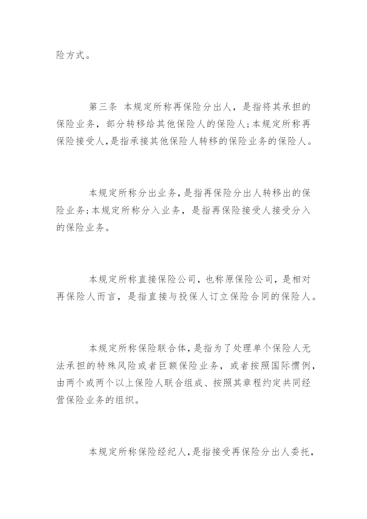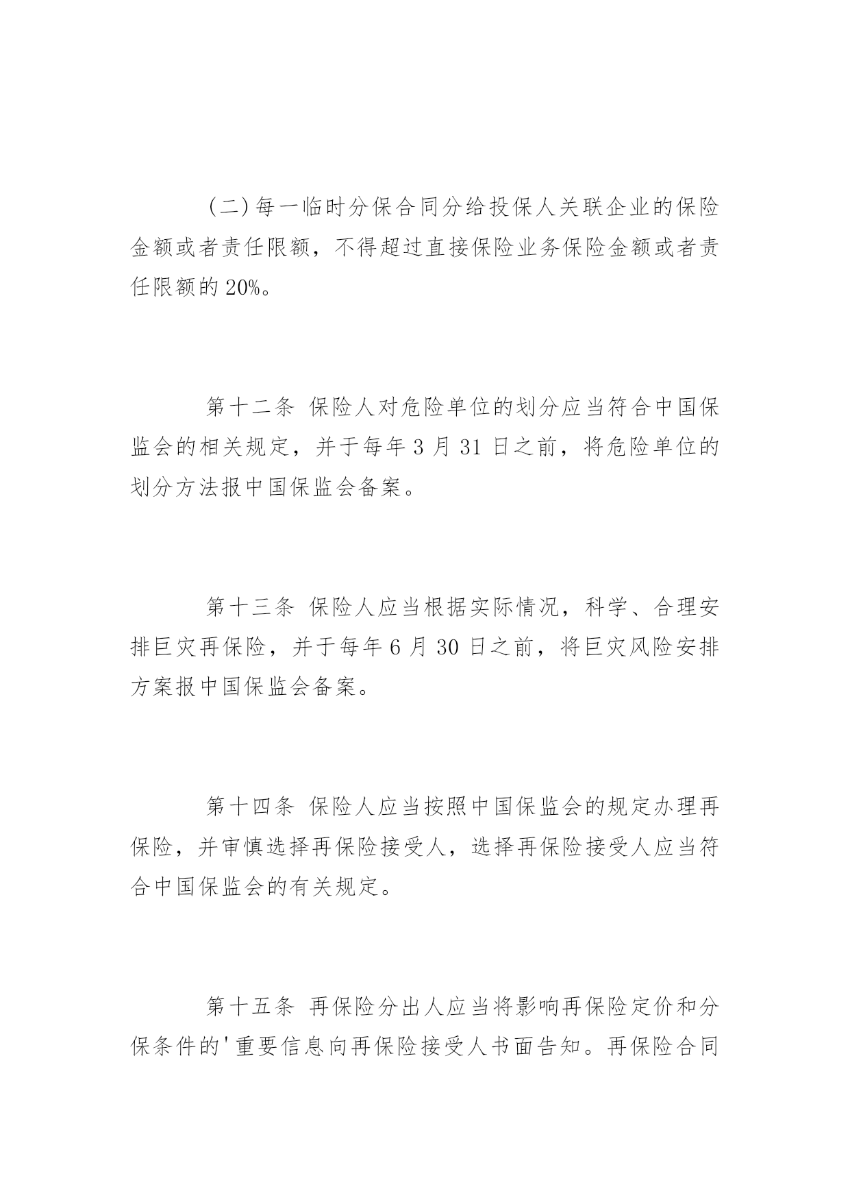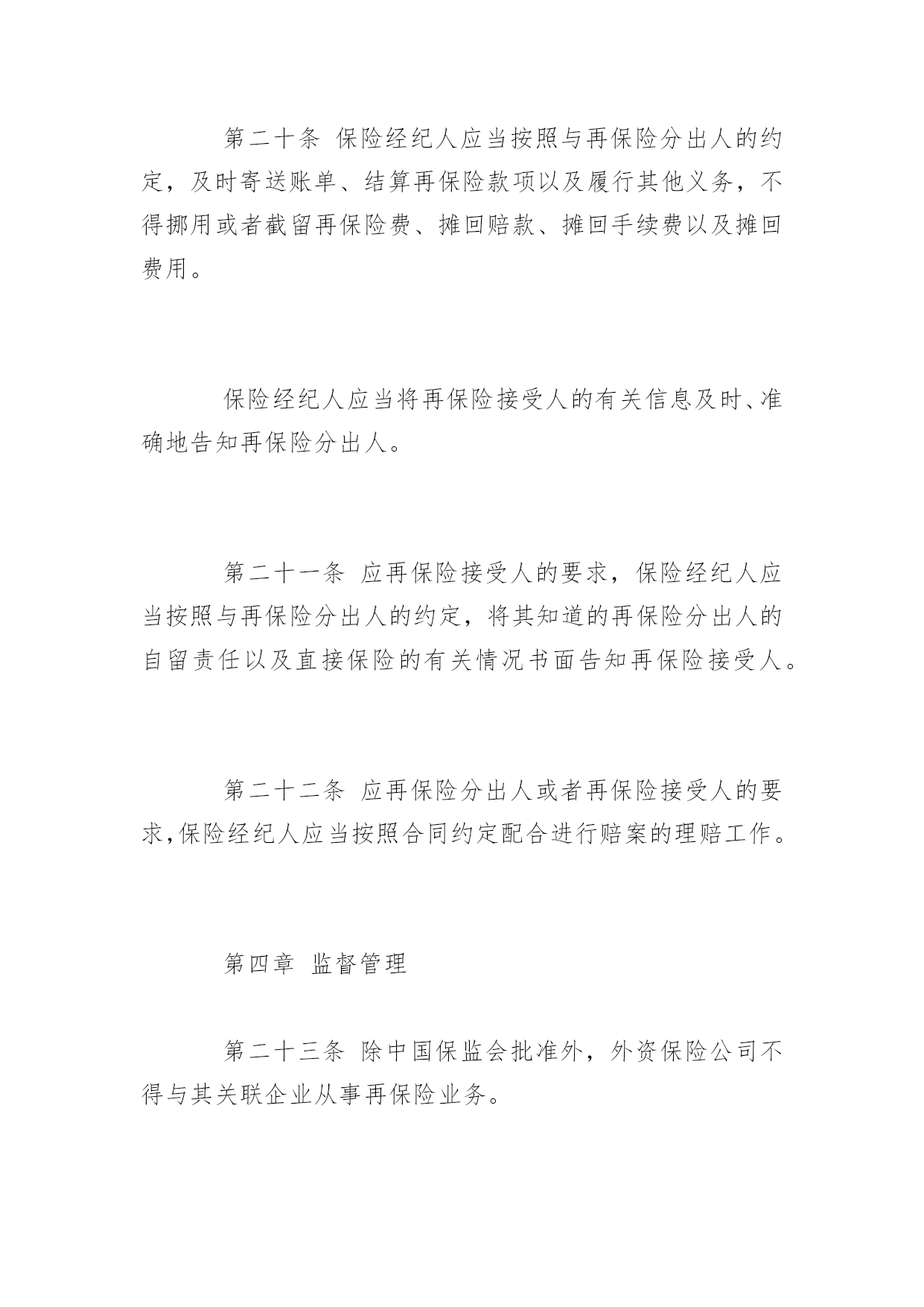 再保险业务管理规定关于再保险业务管理规定2010年5月21日中国保险监督管理委员会令2010年第8号公布自2010年7月1日起施行,下面是小编为您精心整理的关于再保险业务管理规定全文内容,仅供大家参考。第一章总则第一条为了规范和发展再保险市场,加强对再保险业务的管理,实现保险业健康协调可持续发展,依据《中华人民共和国保险法》(以下简称《保险法》)、《中华人民共和国外资保险公司管理条例》以及有关法律、行政法规,制定本规定。第二条本规定所称再保险,是指保险人将其承担的保险业务,部分转移给其他保险人的经营行为。本规定所称直接保险,也称原保险,是相对再保险而言的保险,由投保人与保险人直接订立保险合同的保险业务。本规定所称转分保,是指再保险接受人将其分入的保险业务,转移给其他保险人的经营行为。本规定所称合约分保,是指保险人与其他保险人预先订立合同,约定将一定时期内其承担的保险业务,部分向其他保险人办理再保险的经营行为。本规定所称临时分保,是指保险人临时与其他保险人约定,将其承担的保险业务,部分向其他保险人办理再保险的经营行为。本规定所称比例再保险,是指以保险金额为基础确定再保险分出入自留额和再保险接受人分保额的再保险方式。本规定所称非比例再保险,是指以赔款金额为基础确定再保险分出人自负责任和再保险接受人分保责任的再保险方式。第三条本规定所称再保险分出人,是指将其承担的保险业务,部分转移给其他保险人的保险人;本规定所称再保险接受人,是指承接其他保险人转移的保险业务的保险人。本规定所称分出业务,是指再保险分出人转移出的保险业务;本规定所称分入业务,是指再保险接受人接受分入的保险业务。本规定所称直接保险公司,也称原保险公司,是相对再保险人而言,是指直接与投保人订立保险合同的保险人。本规定所称保险联合体,是指为了处理单个保险人无法承担的特殊风险或者巨额保险业务,或者按照国际惯例,由两个或两个以上保险人联合组成、按照其章程约定共同经营保险业务的组织。本规定所称保险经纪人,是指接受再保险分出人委托,基于再保险分出入利益,为再保险分出人与再保险接受人办理再保险业务提供中介服务,并按约定收取佣金的保险经纪机构。第四条在中华人民共和国境内(不含港澳台)设立的保险人、保险联合体以及保险经纪人或其他保险机构办理再保险业务,应当遵守本规定。第五条保险人、保险联合体和保险经纪人办理再保险业务,应当遵循审慎和最大诚信原则。第六条再保险分出人、再保险接受人和保险经纪人,对在办理再保险业务中知悉的商业秘密,应当负有保密义务。第七条中国保险监督管理委员会(以下简称中国保监会)鼓励保险人、保险联合体和保险经纪人积极为农业保险和地震、台风、洪水等巨灾保险提供保险及再保险服务。第八条中国保监会依法对再保险业务实施监督和管理。第二章业务经营第九条再保险业务分为寿险再保险和非寿险再保险。保险人对寿险再保险和非寿险再保险应当单独列账、分别核算。第十条保险人应当依照《保险法》规定,确定当年总自留保险费和每一危险单位自留责任;超过的部分,应当办理再保险。第十一条除航空航天保险、核保险、石油保险、信用保险外,直接保险公司办理合约分保或者临时分保的,应当符合下列规定:(一)以比例再保险方式分出财产险直接保险业务时,每一危险单位分给同一家再保险接受人的比例,不得超过再保险分出人承保直接保险合同部分的保险金额或者责任限额的80%;(二)每一临时分保合同分给投保人关联企业的保险金额或者责任限额,不得超过直接保险业务保险金额或者责任限额的20%。第十二条保险人对危险单位的划分应当符合中国保监会的相关规定,并于每年3月31日之前,将危险单位的划分方法报中国保监会备案。第十三条保险人应当根据实际情况,科学、合理安排巨灾再保险,并于每年6月30日之前,将巨灾风险安排方案报中国保监会备案。第十四条保险人应当按照中国保监会的规定办理再保险,并审慎选择再保险接受人,选择再保险接受人应当符合中国保监会的有关规定。第十五条再保险分出人应当将影响再保险定价和分保条件的'重要信息向再保险接受人书面告知。再保险合同成立后,再保险分出人应及时向再保险接受人提供重大赔案信息、赔款准备金等对再保险接受人的准备金建立及预期赔付有重大影响的信息。第十六条保险人和保险经纪人可以利用金融工具开发设计新型风险转移产品。保险人应当按照有关规定向中国保监会报告。第十七条中国境内的专业再保险接受人,应当配备在中国境内有住所的专职再保险核保人和再保险核赔人。第三章再保险经纪业务第十八条保险经纪人从事再保险经纪业务,不得损害保险人的信誉和合法权益。第十九条保险经纪人可以根据业务需要引进或者设计再保险合同。第二十条保险经纪人应当按照与再保险分出人的约定,及时寄送账单、结算