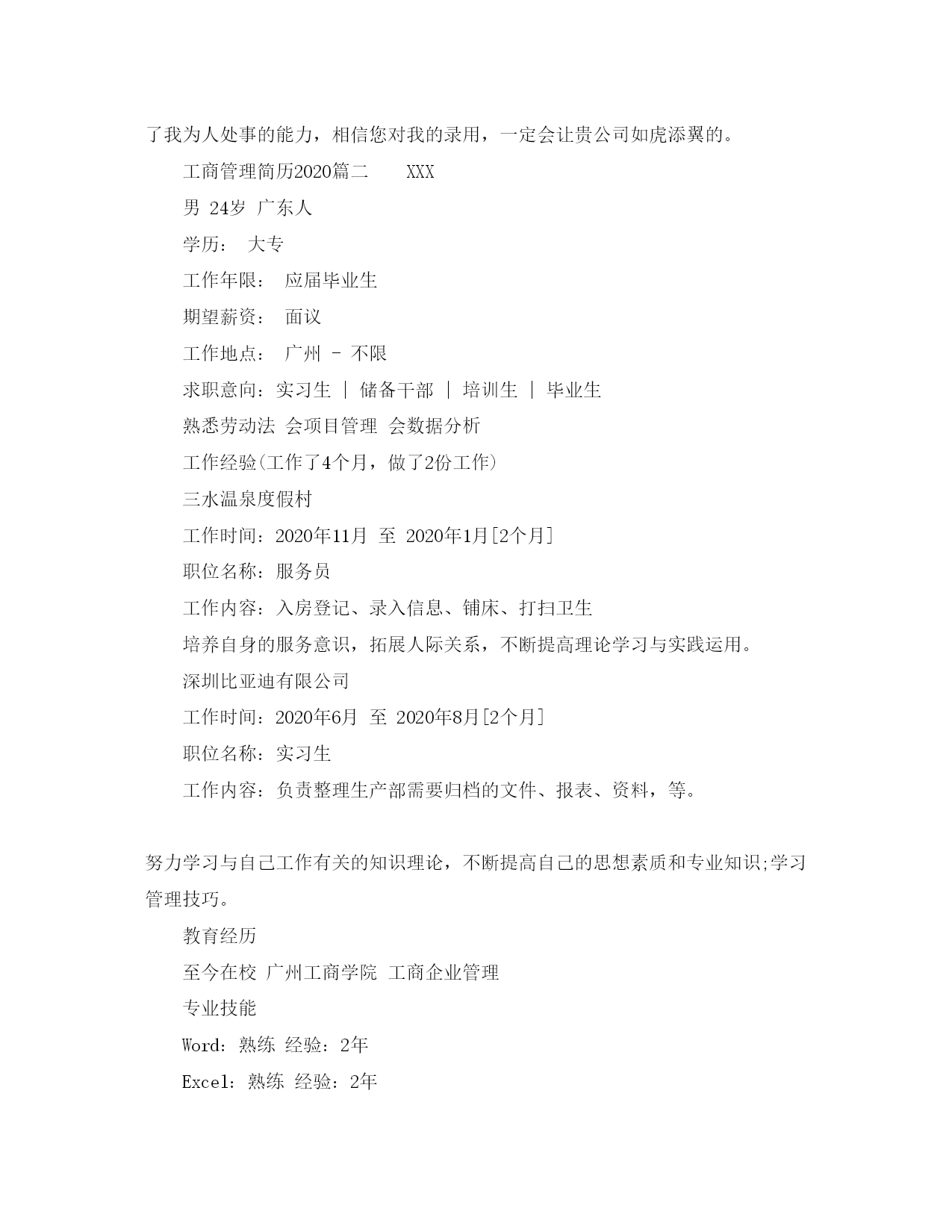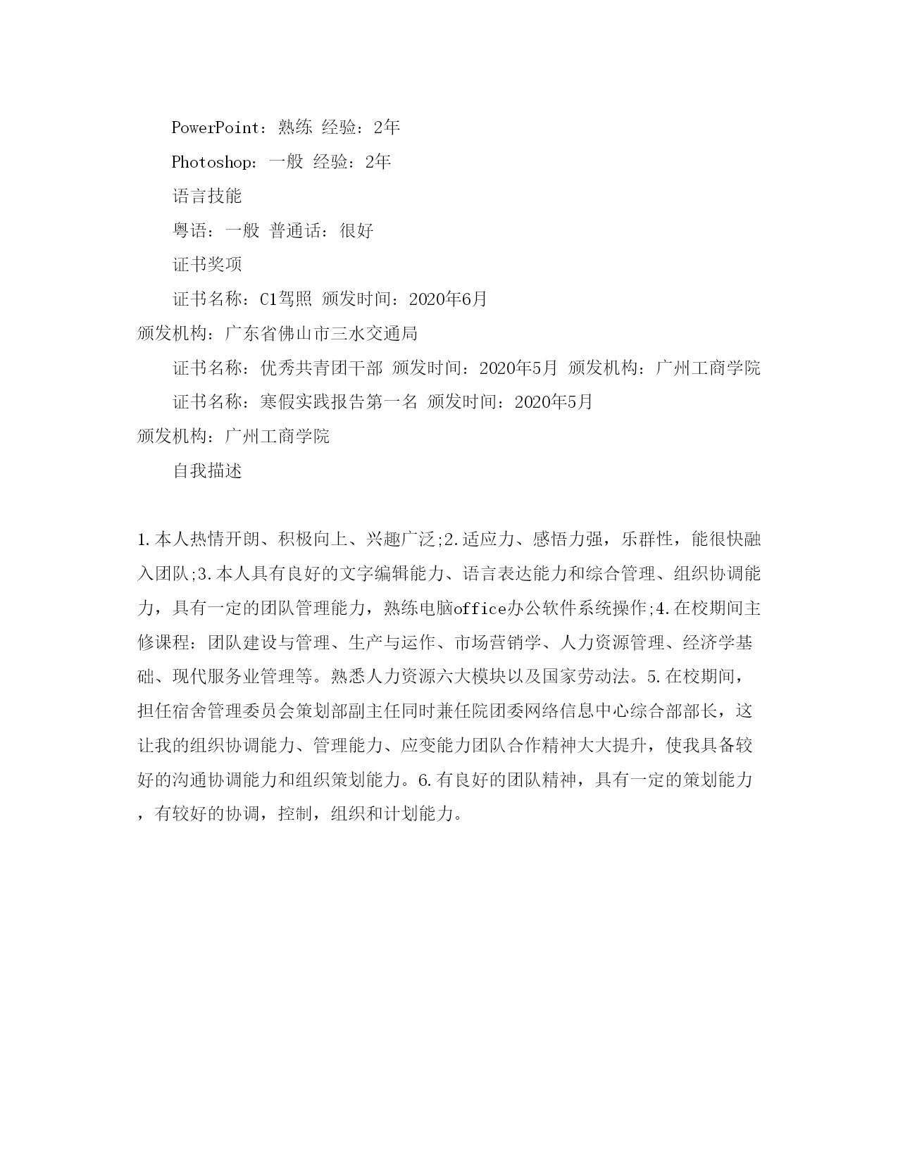 此资料由网络收集而来,如有侵权请告知上传者立即删除。资料共分享,我们负责传递知识。工商管理简历2020>女24岁学历:本科工作年限:应届毕业生期望薪资:面议工作地点:广州-越秀-不限求职意向:行政专员/助理心思缜密待人热情条理性强教育经历2020年6月毕业郑州大学西亚斯国际学院国际经济与贸易专业技能Word:熟练经验:5年Excel:熟练经验:5年语言技能英语:较好证书奖项证书名称:大学英语四级颁发时间:2020年6月颁发机构:教育部高等教育司证书名称:雅思颁发时间:2020年10月颁发机构:英国剑桥大学考试委员会证书名称:普通话二级甲等颁发时间:2020年6月颁发机构:河南省培训测试中心证书名称:美国密歇根九级英语考试颁发时间:2020年6月颁发机构:美国密执安大学英语学院自我描述我是一名毕业的大学生,四年的大学生活,不仅培养了我的学习能力,更是锻炼了我为人处事的能力,相信您对我的录用,一定会让贵公司如虎添翼的。工商管理简历2020篇二XXX男24岁广东人学历:大专工作年限:应届毕业生期望薪资:面议工作地点:广州-不限求职意向:实习生|储备干部|培训生|毕业生熟悉劳动法会项目管理会数据分析工作经验(工作了4个月,做了2份工作)三水温泉度假村工作时间:2020年11月至2020年1月[2个月]职位名称:服务员工作内容:入房登记、录入信息、铺床、打扫卫生培养自身的服务意识,拓展人际关系,不断提高理论学习与实践运用。深圳比亚迪有限公司工作时间:2020年6月至2020年8月[2个月]职位名称:实习生工作内容:负责整理生产部需要归档的文件、报表、资料,等。努力学习与自己工作有关的知识理论,不断提高自己的思想素质和专业知识;学习管理技巧。教育经历至今在校广州工商学院工商企业管理专业技能Word:熟练经验:2年Excel:熟练经验:2年PowerPoint:熟练经验:2年Photoshop:一般经验:2年语言技能粤语:一般普通话:很好证书奖项证书名称:C1驾照颁发时间:2020年6月颁发机构:广东省佛山市三水交通局证书名称:优秀共青团干部颁发时间:2020年5月颁发机构:广州工商学院证书名称:寒假实践报告第一名颁发时间:2020年5月颁发机构:广州工商学院自我描述1.本人热情开朗、积极向上、兴趣广泛;2.适应力、感悟力强,乐群性,能很快融入团队;3.本人具有良好的文字编辑能力、语言表达能力和综合管理、组织协调能力,具有一定的团队管理能力,熟练电脑office办公软件系统操作;4.在校期间主修课程:团队建设与管理、生产与运作、市场营销学、人力资源管理、经济学基础、现代服务业管理等。熟悉人力资源六大模块以及国家劳动法。5.在校期间,担任宿舍管理委员会策划部副主任同时兼任院团委网络信息中心综合部部长,这让我的组织协调能力、管理能力、应变能力团队合作精神大大提升,使我具备较好的沟通协调能力和组织策划能力。6.有良好的团队精神,具有一定的策划能力,有较好的协调,控制,组织和计划能力。