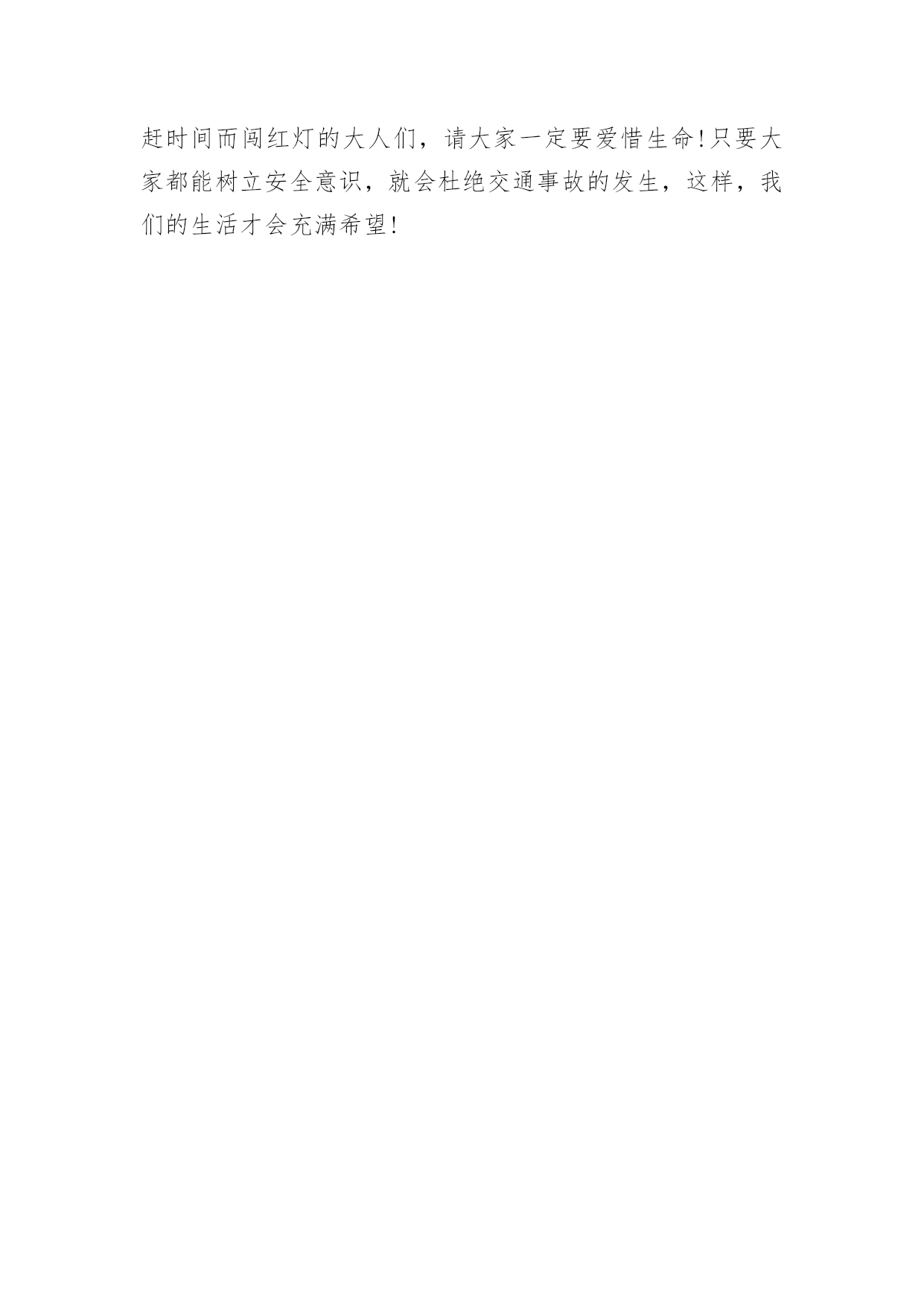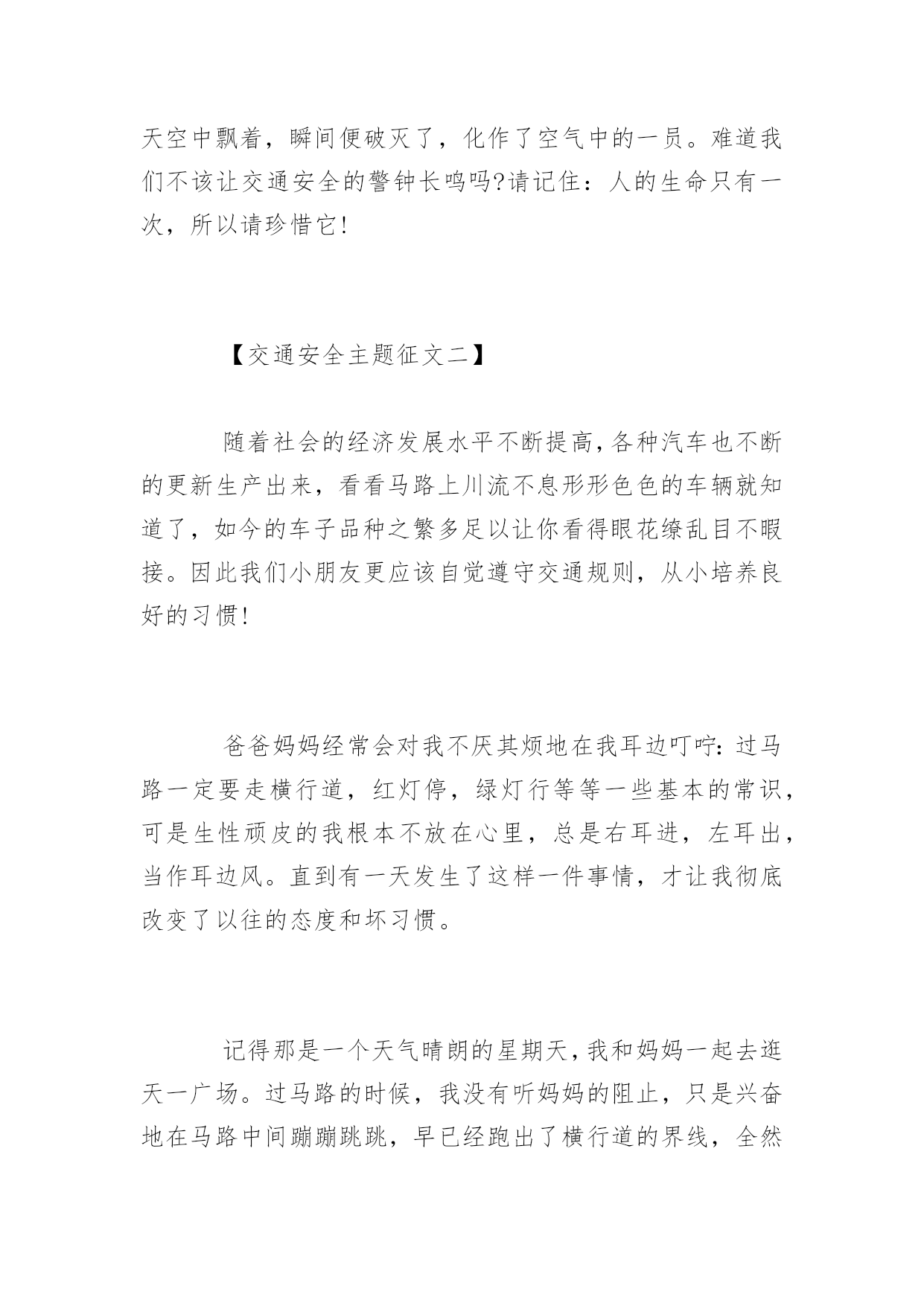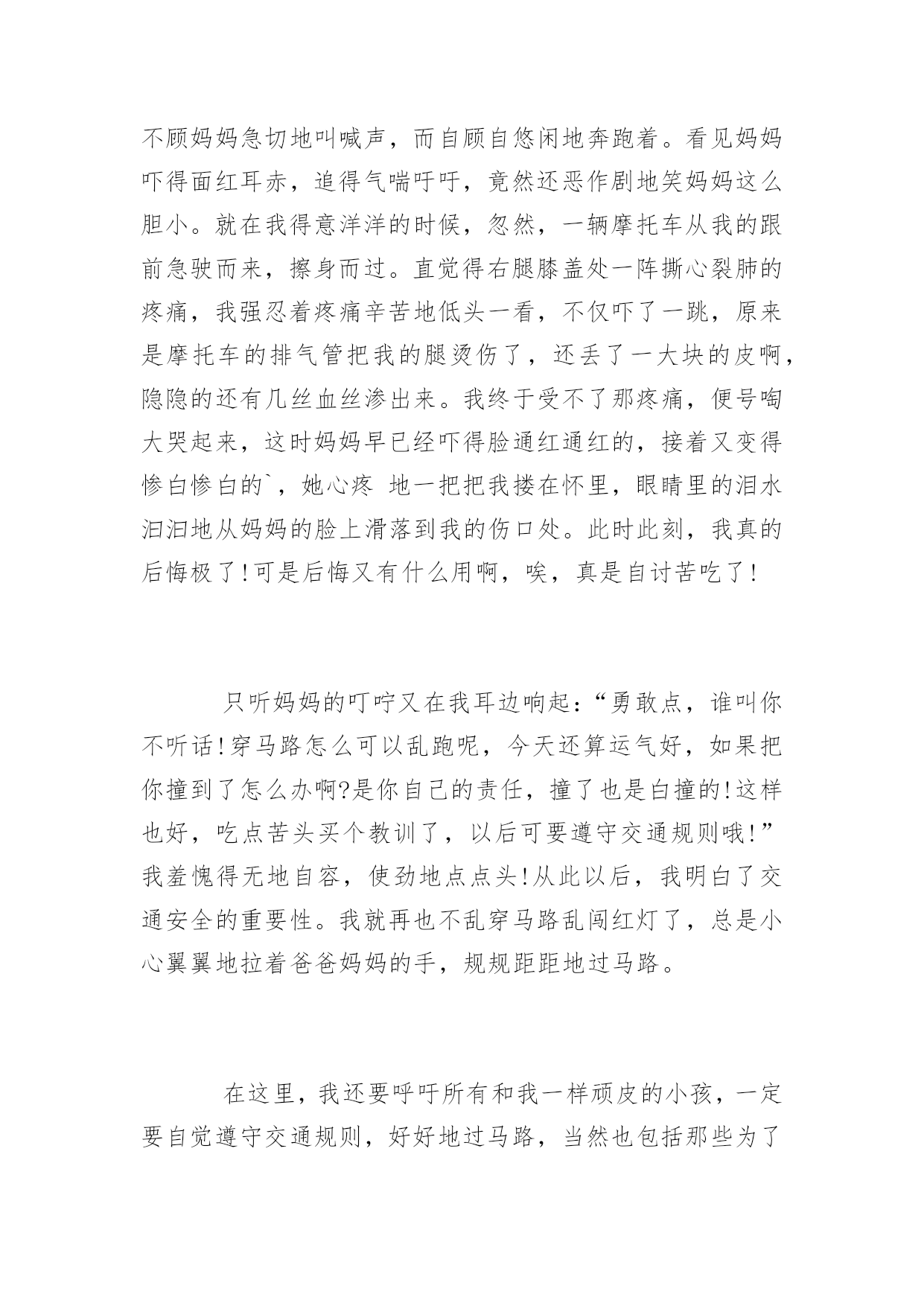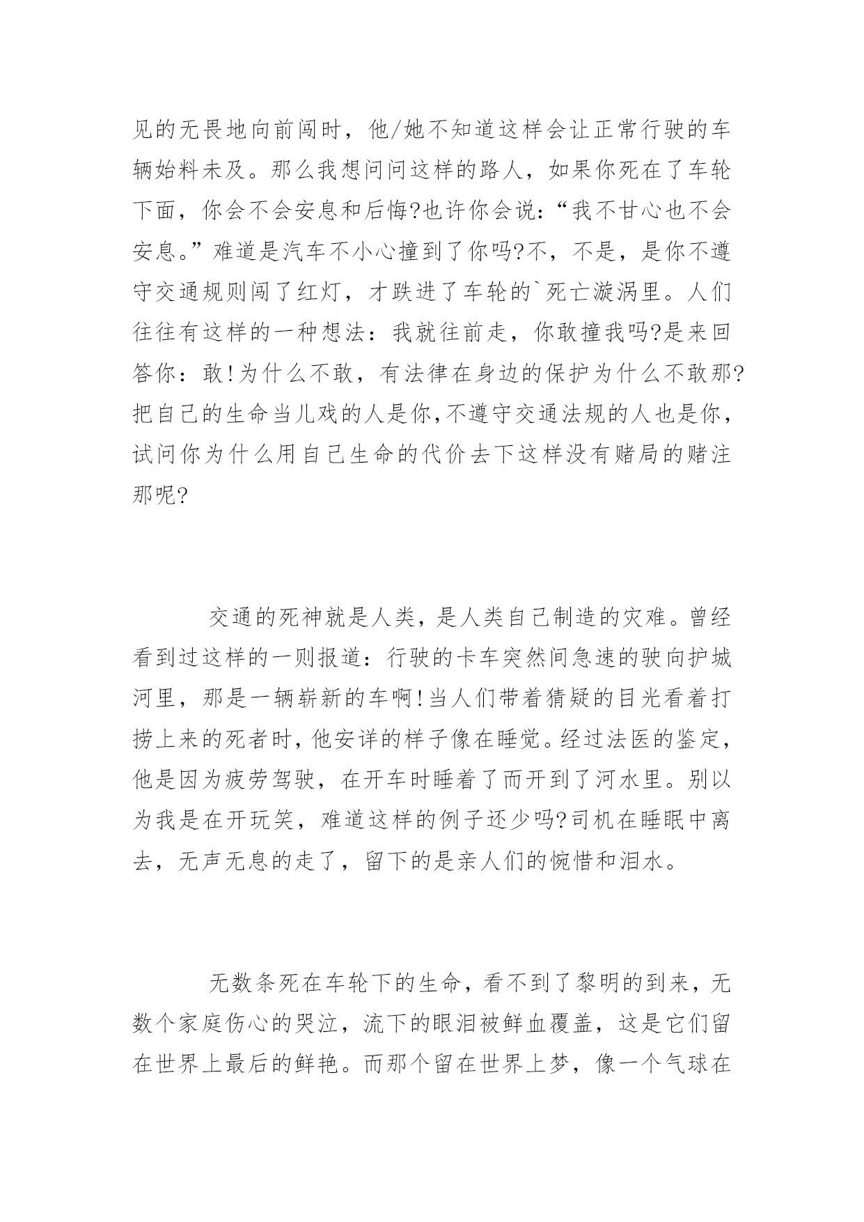 交通安全主题征文引导语:树立安全意识,杜绝交通事故发生。下面是交通安全主题征文,欢迎阅读。【交通安全主题征文一】川流不息的车辆,你是否在此停留过你的目光?一群一群不停下脚步的人,你是否在此叹息过生命的众多?交通事故出现时,你又是否真正问过自己:“你遵守交通规则了吗?”请回答是,还是不是。你会对这样的问题迟疑过,停留了片刻的目光。这个问题太难了,连我自己也被问倒了,我不能承认我一直都在遵守交通规则,现在的你大概也不敢保证你没有为了节省时间而横穿马路的事实。因此,在道路下长眠的绀色灵魂才会愤愤不安那!如果都不能正确的遵守交通规则,会有多少灵魂在无声的哭泣?当司机踩下急刹车时,一条无辜的生命已经离去。剩下的是司机懊悔的叹息和闻声赶来家属痛哭流涕的眼泪。如果我可以将“希望”放飞在已经死去的人身上,我会让它转告地下的所有灵魂:请安息。当过路人看到红灯却视而不见的无畏地向前闯时,他/她不知道这样会让正常行驶的车辆始料未及。那么我想问问这样的路人,如果你死在了车轮下面,你会不会安息和后悔?也许你会说:“我不甘心也不会安息。”难道是汽车不小心撞到了你吗?不,不是,是你不遵守交通规则闯了红灯,才跌进了车轮的`死亡漩涡里。人们往往有这样的一种想法:我就往前走,你敢撞我吗?是来回答你:敢!为什么不敢,有法律在身边的保护为什么不敢那?把自己的生命当儿戏的人是你,不遵守交通法规的人也是你,试问你为什么用自己生命的代价去下这样没有赌局的赌注那呢?交通的死神就是人类,是人类自己制造的灾难。曾经看到过这样的一则报道:行驶的卡车突然间急速的驶向护城河里,那是一辆崭新的车啊!当人们带着猜疑的目光看着打捞上来的死者时,他安详的样子像在睡觉。经过法医的鉴定,他是因为疲劳驾驶,在开车时睡着了而开到了河水里。别以为我是在开玩笑,难道这样的例子还少吗?司机在睡眠中离去,无声无息的走了,留下的是亲人们的惋惜和泪水。无数条死在车轮下的生命,看不到了黎明的到来,无数个家庭伤心的哭泣,流下的眼泪被鲜血覆盖,这是它们留在世界上最后的鲜艳。而那个留在世界上梦,像一个气球在天空中飘着,瞬间便破灭了,化作了空气中的一员。难道我们不该让交通安全的警钟长鸣吗?请记住:人的生命只有一次,所以请珍惜它!【交通安全主题征文二】随着社会的经济发展水平不断提高,各种汽车也不断的更新生产出来,看看马路上川流不息形形色色的车辆就知道了,如今的车子品种之繁多足以让你看得眼花缭乱目不暇接。因此我们小朋友更应该自觉遵守交通规则,从小培养良好的习惯!爸爸妈妈经常会对我不厌其烦地在我耳边叮咛:过马路一定要走横行道,红灯停,绿灯行等等一些基本的常识,可是生性顽皮的我根本不放在心里,总是右耳进,左耳出,当作耳边风。直到有一天发生了这样一件事情,才让我彻底改变了以往的态度和坏习惯。记得那是一个天气晴朗的星期天,我和妈妈一起去逛天一广场。过马路的时候,我没有听妈妈的阻止,只是兴奋地在马路中间蹦蹦跳跳,早已经跑出了横行道的界线,全然不顾妈妈急切地叫喊声,而自顾自悠闲地奔跑着。看见妈妈吓得面红耳赤,追得气喘吁吁,竟然还恶作剧地笑妈妈这么胆小。就在我得意洋洋的时候,忽然,一辆摩托车从我的跟前急驶而来,擦身而过。直觉得右腿膝盖处一阵撕心裂肺的疼痛,我强忍着疼痛辛苦地低头一看,不仅吓了一跳,原来是摩托车的排气管把我的腿烫伤了,还丢了一大块的皮啊,隐隐的还有几丝血丝渗出来。我终于受不了那疼痛,便号啕大哭起来,这时妈妈早已经吓得脸通红通红的,接着又变得惨白惨白的`,她心疼地一把把我搂在怀里,眼睛里的泪水汩汩地从妈妈的脸上滑落到我的伤口处。此时此刻,我真的后悔极了!可是后悔又有什么用啊,唉,真是自讨苦吃了!只听妈妈的叮咛又在我耳边响起:“勇敢点,谁叫你不听话!穿马路怎么可以乱跑呢,今天还算运气好,如果把你撞到了怎么办啊?是你自己的责任,撞了也是白撞的!这样也好,吃点苦头买个教训了,以后可要遵守交通规则哦!”我羞愧得无地自容,使劲地点点头!从此以后,我明白了交通安全的重要性。我就再也不乱穿马路乱闯红灯了,总是小心翼翼地拉着爸爸妈妈的手,规规距距地过马路。在这里,我还要呼吁所有和我一样顽皮的小孩,一定要自觉遵守交通规则,好好地过马路,当然也包括那些为了赶时间而闯红灯的大人们,请大家一定要爱惜生命!只要大家都能树立安全意识,就会杜绝交通事故的发生,这样,我们的生活才会充满希望!
