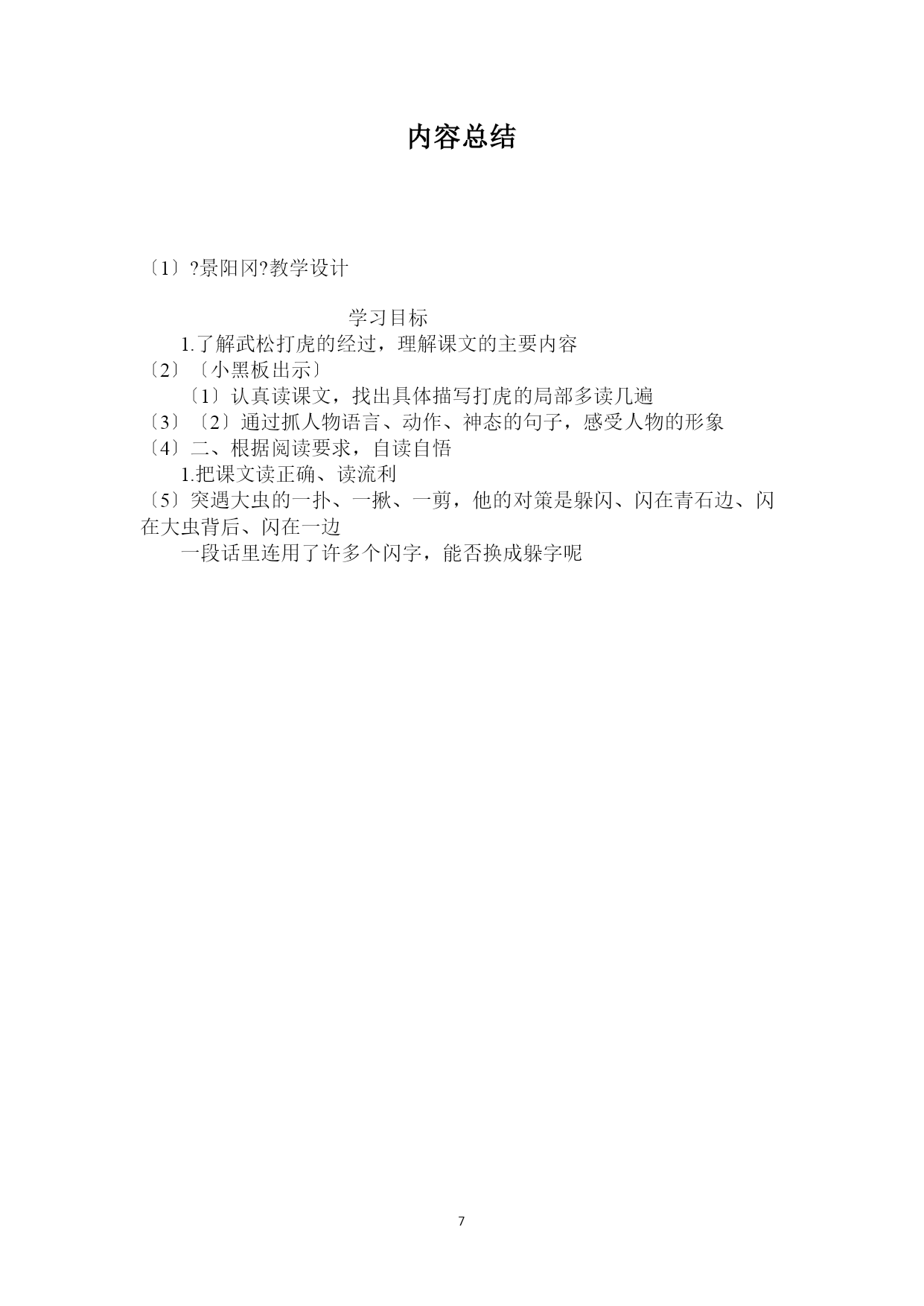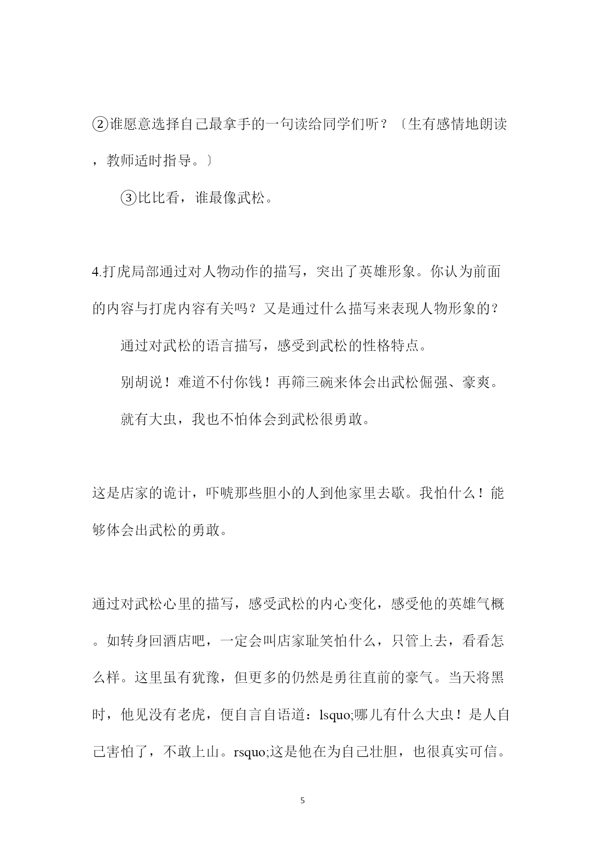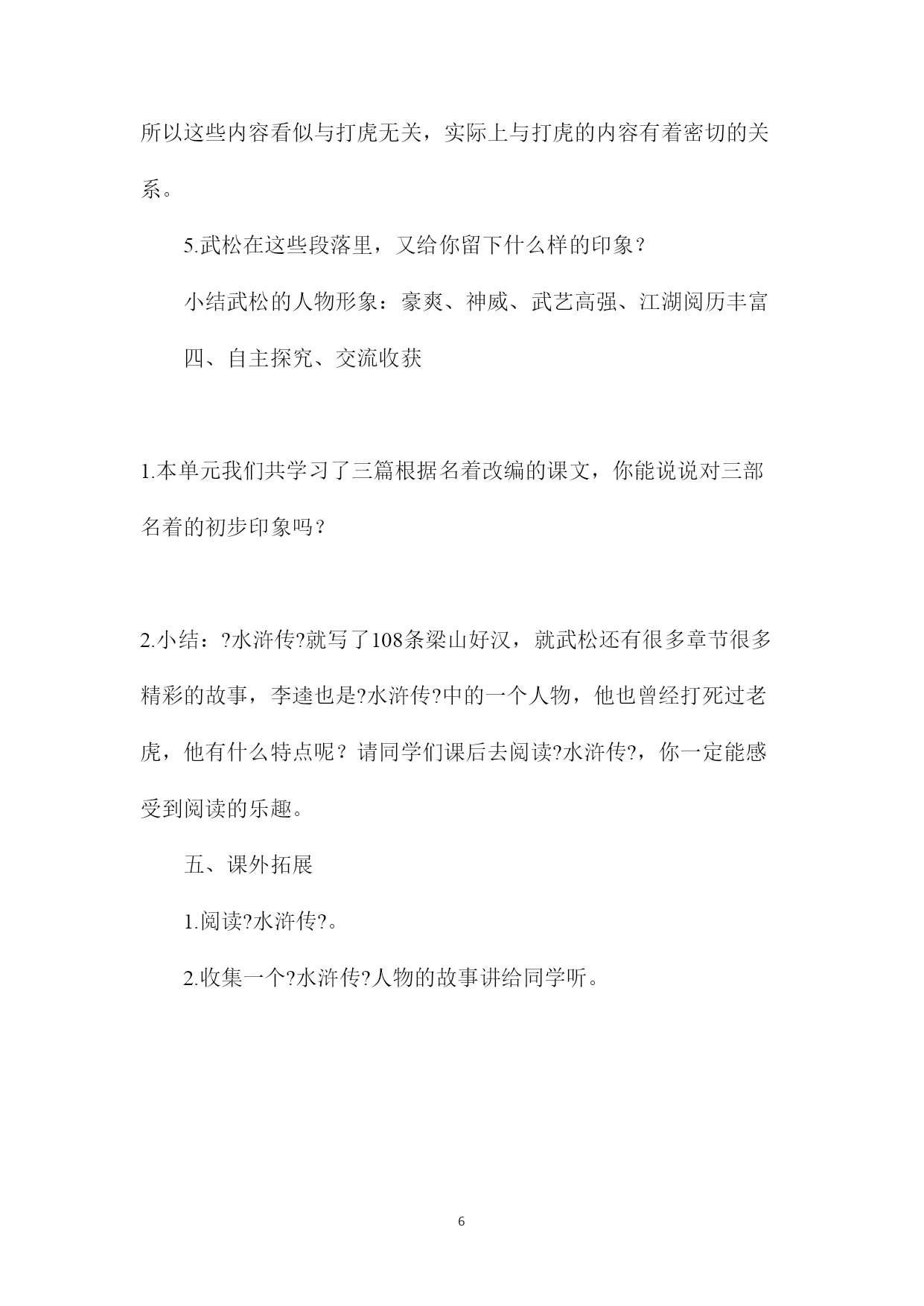 PAGEPAGE7?景阳冈?教学设计学习目标1.了解武松打虎的经过,理解课文的主要内容。2.感受武松的人物形象。体验阅读名着的乐趣,有激发主动阅读名着的兴趣。学习难点除了打虎,课文还写了哪些内容,这些内容跟打虎有什么关系。课时安排1课时教学过程一、激趣导入,明确阅读要求〔播放?好汉歌?,由电视剧主题曲导知名着?水浒传?。〕前面我们已经学习了两篇根据名着改编的课文,让我们再来读读节选自名着的文章。〔板书:20.景阳冈〕1.你们了解?水浒传?吗?认识武松吗?知道的请举手,说说你们是怎么知道的?〔全班交流。一起读文后的资料袋。〕2.指名读课文前的导语,其他同学边听边想:导语提出了哪些阅读要求。〔小黑板出示〕〔1〕认真读课文,找出具体描写打虎的局部多读几遍。〔2〕想一想,除了打虎,课文还写了哪些内容,这些内容跟打虎有什么关系。〔3〕武松给你留下了怎样的印象,你是通过哪些句子感受到的。3.学习方法交流:你准备怎样解决这三个问题?〔1〕理清课文思路,了解段与段的联系。〔2〕通过抓人物语言、动作、神态的句子,感受人物的形象。二、根据阅读要求,自读自悟1.把课文读正确、读流利。由于课文一些语句的意思或用法与现代文有所不同,老师适当做一些提示。如,这酒真有气力──这酒很有劲;筛一碗酒──倒一碗酒;吃酒──喝酒;武松把脚往大虫面门上眼睛里只顾乱踢。──武松只顾往大虫面门上眼睛里乱踢。2.老师巡视,指导学生养成一边读书一边思考批注的好习惯。3.四人小组交流学习情况三、检查自学效果、组织交流1.学习汇报:课文哪几个自然段写武松打虎,课文还写了哪些内容,找出相关段落。〔课文的8~13自然段写武松打虎,除此之外,1~4自然段主要写武松在酒店喝酒,5~7自然段写武松上景阳冈。〕2.抽查四人小组读武松打虎段落。3.在描写武松打虎的段落中,哪些语句给你留下深刻的印象?读后有什么感受?〔1〕引导学生抓住武松打老虎的几个回合里,描写双方动作的词句进行比拟体会。突遇大虫的一扑、一揪、一剪,他的对策是躲闪、闪在青石边、闪在大虫背后、闪在一边一段话里连用了许多个闪字,能否换成躲字呢?〔闪既是本能的反响,又是防御的手段,准确刻画了武松在遭到大虫的突然袭击,毫无防范的情况下的动作。闪这个动作,具有突发性,用在这里很能表现人物的机敏敏捷。而躲却显得很被动。这样,充分说明了这一个连一个的闪字,绝不是重复、雷同,而凸现了武松的有勇有谋、智勇双全。〕描写武松时,用抡劈揪按踢提打等几个字,字字千钧,虎虎生风,形象生动地凸现了武松打虎的英雄气势,淋漓尽致地刻画了武松过人的高大形象。〔2〕根据交流,重点品读相关的句子。①下面请同学们有感情地朗读描写武松打虎的语句,进一步体会武松的性格特点。同学们可以自由发挥,你觉得怎么读像武松就怎么读〔生有感情地朗读。〕②谁愿意选择自己最拿手的一句读给同学们听?〔生有感情地朗读,教师适时指导。〕③比比看,谁最像武松。4.打虎局部通过对人物动作的描写,突出了英雄形象。你认为前面的内容与打虎内容有关吗?又是通过什么描写来表现人物形象的?通过对武松的语言描写,感受到武松的性格特点。别胡说!难道不付你钱!再筛三碗来体会出武松倔强、豪爽。就有大虫,我也不怕体会到武松很勇敢。这是店家的诡计,吓唬那些胆小的人到他家里去歇。我怕什么!能够体会出武松的勇敢。通过对武松心里的描写,感受武松的内心变化,感受他的英雄气概。如转身回酒店吧,一定会叫店家耻笑怕什么,只管上去,看看怎么样。这里虽有犹豫,但更多的仍然是勇往直前的豪气。当天将黑时,他见没有老虎,便自言自语道:lsquo;哪儿有什么大虫!是人自己害怕了,不敢上山。rsquo;这是他在为自己壮胆,也很真实可信。所以这些内容看似与打虎无关,实际上与打虎的内容有着密切的关系。5.武松在这些段落里,又给你留下什么样的印象?小结武松的人物形象:豪爽、神威、武艺高强、江湖阅历丰富四、自主探究、交流收获1.本单元我们共学习了三篇根据名着改编的课文,你能说说对三部名着的初步印象吗?2.小结:?水浒传?就写了108条梁山好汉,就武松还有很多章节很多精彩的故事,李逵也是?水浒传?中的一个人物,他也曾经打死过老虎,他有什么特点呢?请同学们课后去阅读?水浒传?,你一定能感受到阅读的乐趣。五、课外拓展1.阅读?水浒传?。2.收集一个?水浒传?人物的故事讲给同学听。内容总结〔1〕?景阳冈?教学设计学习目标1.了解武松打虎的经过,理解课文的主要内容〔2〕〔小黑板出示〕〔1〕认真读课文,找出具体描写打虎的局部多读几遍〔3〕〔2〕通过抓人物语言、动作、神态的句子,感受人物的形象
