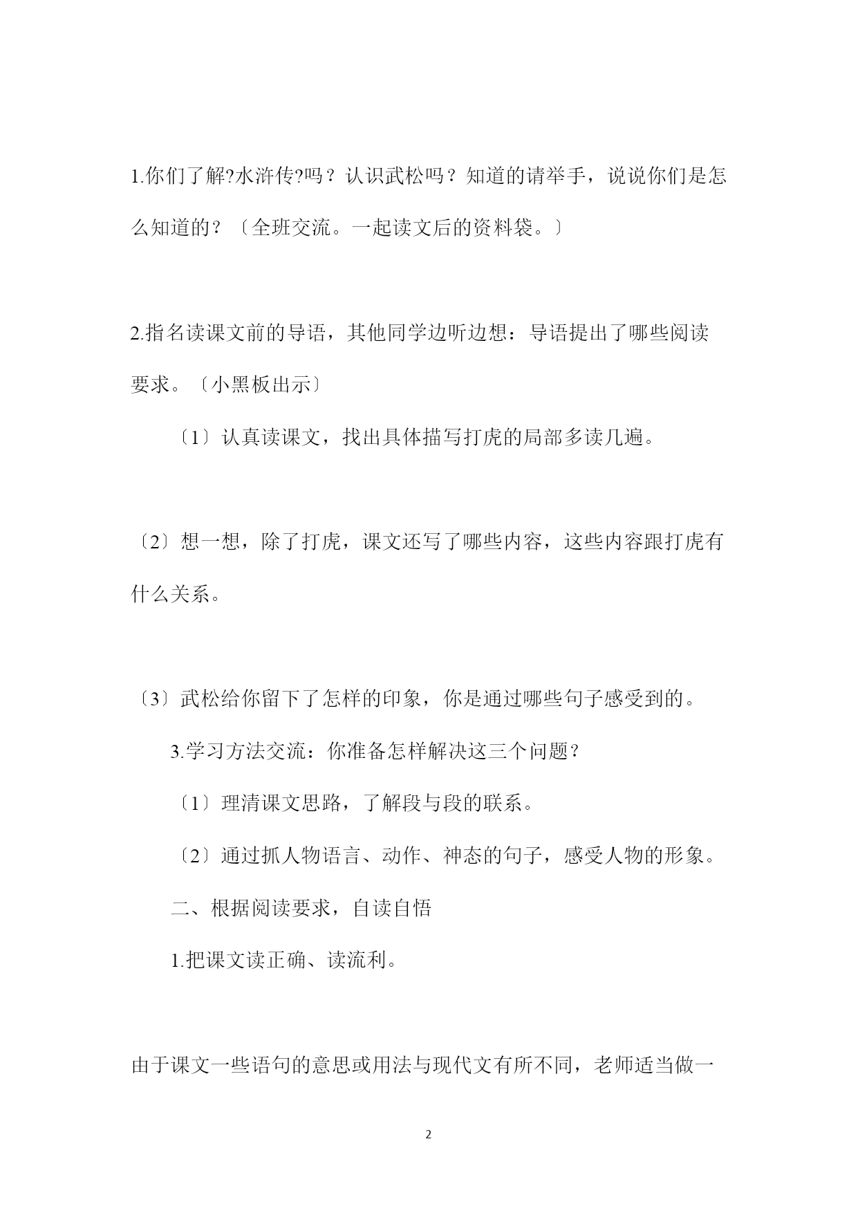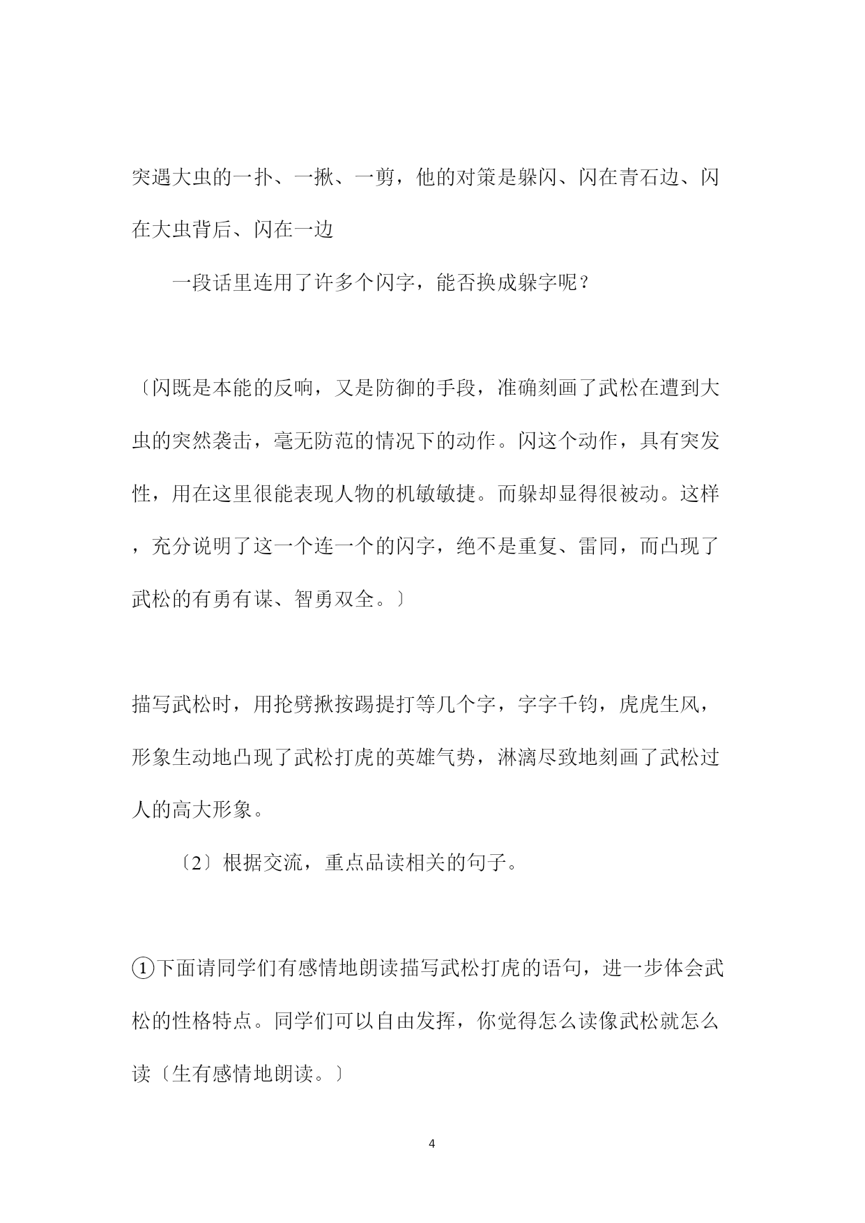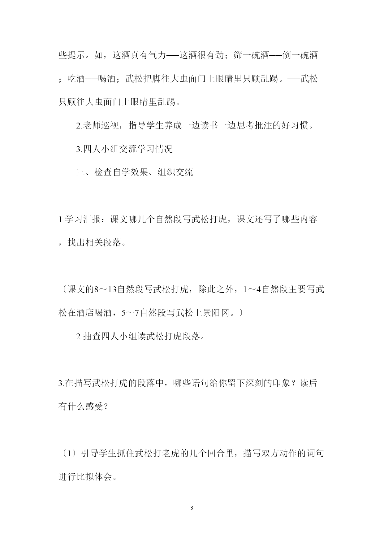 PAGEPAGE7?景阳冈?教学设计学习目标1.了解武松打虎的经过,理解课文的主要内容。2.感受武松的人物形象。体验阅读名着的乐趣,有激发主动阅读名着的兴趣。学习难点除了打虎,课文还写了哪些内容,这些内容跟打虎有什么关系。课时安排1课时教学过程一、激趣导入,明确阅读要求〔播放?好汉歌?,由电视剧主题曲导知名着?水浒传?。〕前面我们已经学习了两篇根据名着改编的课文,让我们再来读读节选自名着的文章。〔板书:20.景阳冈〕1.你们了解?水浒传?吗?认识武松吗?知道的请举手,说说你们是怎么知道的?〔全班交流。一起读文后的资料袋。〕2.指名读课文前的导语,其他同学边听边想:导语提出了哪些阅读要求。〔小黑板出示〕〔1〕认真读课文,找出具体描写打虎的局部多读几遍。〔2〕想一想,除了打虎,课文还写了哪些内容,这些内容跟打虎有什么关系。〔3〕武松给你留下了怎样的印象,你是通过哪些句子感受到的。3.学习方法交流:你准备怎样解决这三个问题?〔1〕理清课文思路,了解段与段的联系。〔2〕通过抓人物语言、动作、神态的句子,感受人物的形象。二、根据阅读要求,自读自悟1.把课文读正确、读流利。由于课文一些语句的意思或用法与现代文有所不同,老师适当做一些提示。如,这酒真有气力──这酒很有劲;筛一碗酒──倒一碗酒;吃酒──喝酒;武松把脚往大虫面门上眼睛里只顾乱踢。──武松只顾往大虫面门上眼睛里乱踢。2.老师巡视,指导学生养成一边读书一边思考批注的好习惯。3.四人小组交流学习情况三、检查自学效果、组织交流1.学习汇报:课文哪几个自然段写武松打虎,课文还写了哪些内容,找出相关段落。〔课文的8~13自然段写武松打虎,除此之外,1~4自然段主要写武松在酒店喝酒,5~7自然段写武松上景阳冈。〕2.抽查四人小组读武松打虎段落。3.在描写武松打虎的段落中,哪些语句给你留下深刻的印象?读后有什么感受?〔1〕引导学生抓住武松打老虎的几个回合里,描写双方动作的词句进行比拟体会。突遇大虫的一扑、一揪、一剪,他的对策是躲闪、闪在青石边、闪在大虫背后、闪在一边一段话里连用了许多个闪字,能否换成躲字呢?〔闪既是本能的反响,又是防御的手段,准确刻画了武松在遭到大虫的突然袭击,毫无防范的情况下的动作。闪这个动作,具有突发性,用在这里很能表现人物的机敏敏捷。而躲却显得很被动。这样,充分说明了这一个连一个的闪字,绝不是重复、雷同,而凸现了武松的有勇有谋、智勇双全。〕描写武松时,用抡劈揪按踢提打等几个字,字字千钧,虎虎生风,形象生动地凸现了武松打虎的英雄气势,淋漓尽致地刻画了武松过人的高大形象。〔2〕根据交流,重点品读相关的句子。①下面请同学们有感情地朗读描写武松打虎的语句,进一步体会武松的性格特点。同学们可以自由发挥,你觉得怎么读像武松就怎么读〔生有感情地朗读。〕②谁愿意选择自己最拿手的一句读给同学们听?〔生有感情地朗读,教师适时指导。〕③比比看,谁最像武松。4.打虎局部通过对人物动作的描写,突出了英雄形象。你认为前面的内容与打虎内容有关吗?又是通过什么描写来表现人物形象的?通过对武松的语言描写,感受到武松的性格特点。别胡说!难道不付你钱!再筛三碗来体会出武松倔强、豪爽。就有大虫,我也不怕体会到武松很勇敢。这是店家的诡计,吓唬那些胆小的人到他家里去歇。我怕什么!能够体会出武松的勇敢。通过对武松心里的描写,感受武松的内心变化,感受他的英雄气概。如转身回酒店吧,一定会叫店家耻笑怕什么,只管上去,看看怎么样。这里虽有犹豫,但更多的仍然是勇往直前的豪气。当天将黑时,他见没有老虎,便自言自语道:lsquo;哪儿有什么大虫!是人自己害怕了,不敢上山。rsquo;这是他在为自己壮胆,也很真实可信。所以这些内容看似与打虎无关,实际上与打虎的内容有着密切的关系。5.武松在这些段落里,又给你留下什么样的印象?小结武松的人物形象:豪爽、神威、武艺高强、江湖阅历丰富四、自主探究、交流收获1.本单元我们共学习了三篇根据名着改编的课文,你能说说对三部名着的初步印象吗?2.小结:?水浒传?就写了108条梁山好汉,就武松还有很多章节很多精彩的故事,李逵也是?水浒传?中的一个人物,他也曾经打死过老虎,他有什么特点呢?请同学们课后去阅读?水浒传?,你一定能感受到阅读的乐趣。五、课外拓展1.阅读?水浒传?。2.收集一个?水浒传?人物的故事讲给同学听。内容总结〔1〕?景阳冈?教学设计学习目标1.了解武松打虎的经过,理解课文的主要内容〔2〕〔小黑板出示〕〔1〕认真读课文,找出具体描写打虎的局部多读几遍〔3〕〔2〕通过抓人物语言、动作、神态的句子,感受人物的形象