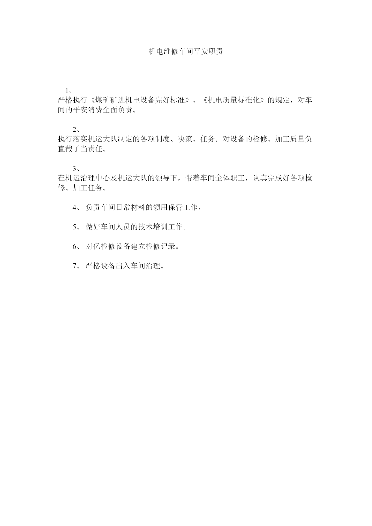 机电维修车间平安职责1、严格执行《煤矿矿进机电设备完好标准》、《机电质量标准化》的规定,对车间的平安消费全面负责。2、执行落实机运大队制定的各项制度、决策、任务。对设备的检修、加工质量负直截了当责任。3、在机运治理中心及机运大队的领导下,带着车间全体职工,认真完成好各项检修、加工任务。4、负责车间日常材料的领用保管工作。5、做好车间人员的技术培训工作。6、对亿检修设备建立检修记录。7、严格设备出入车间治理。