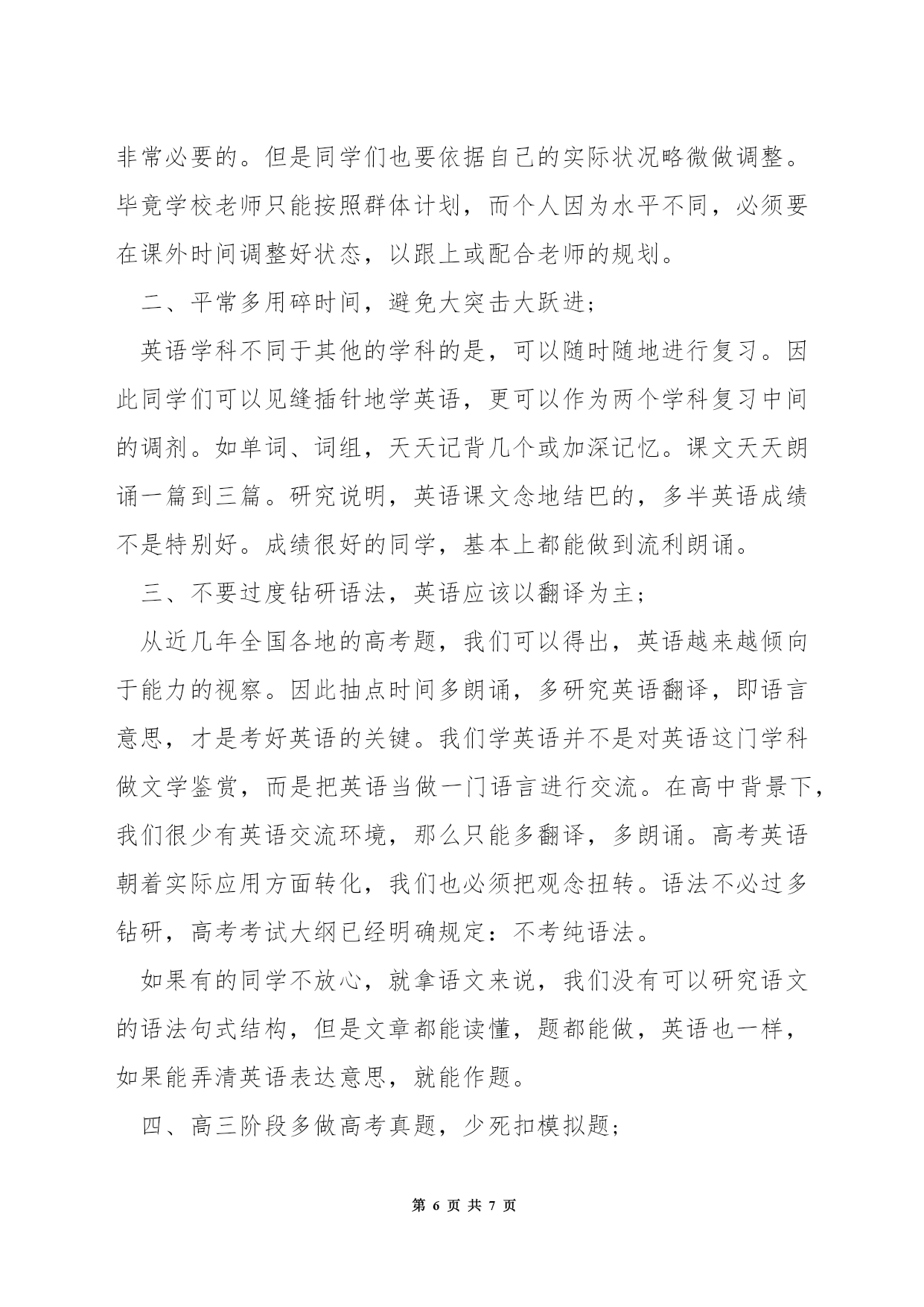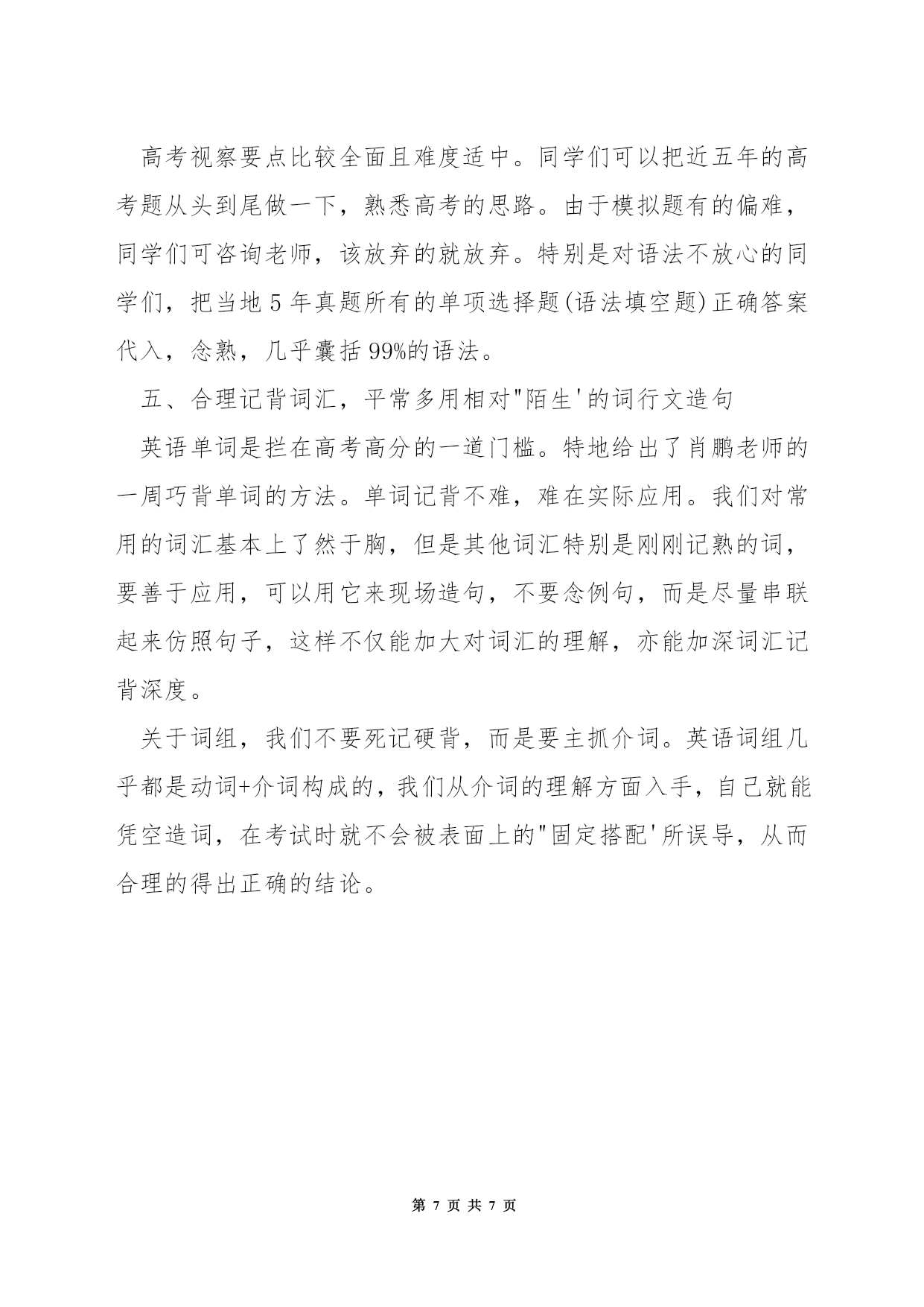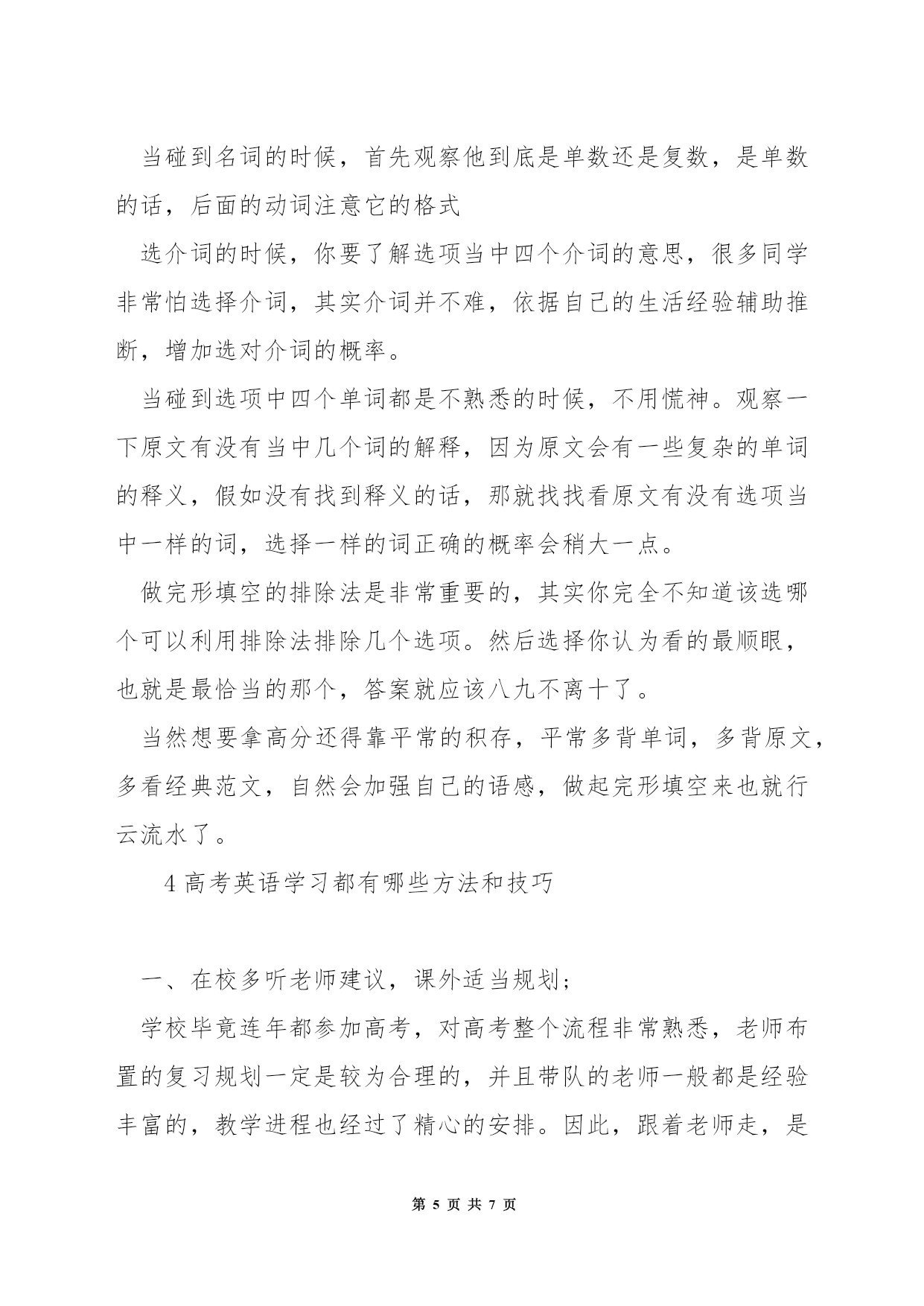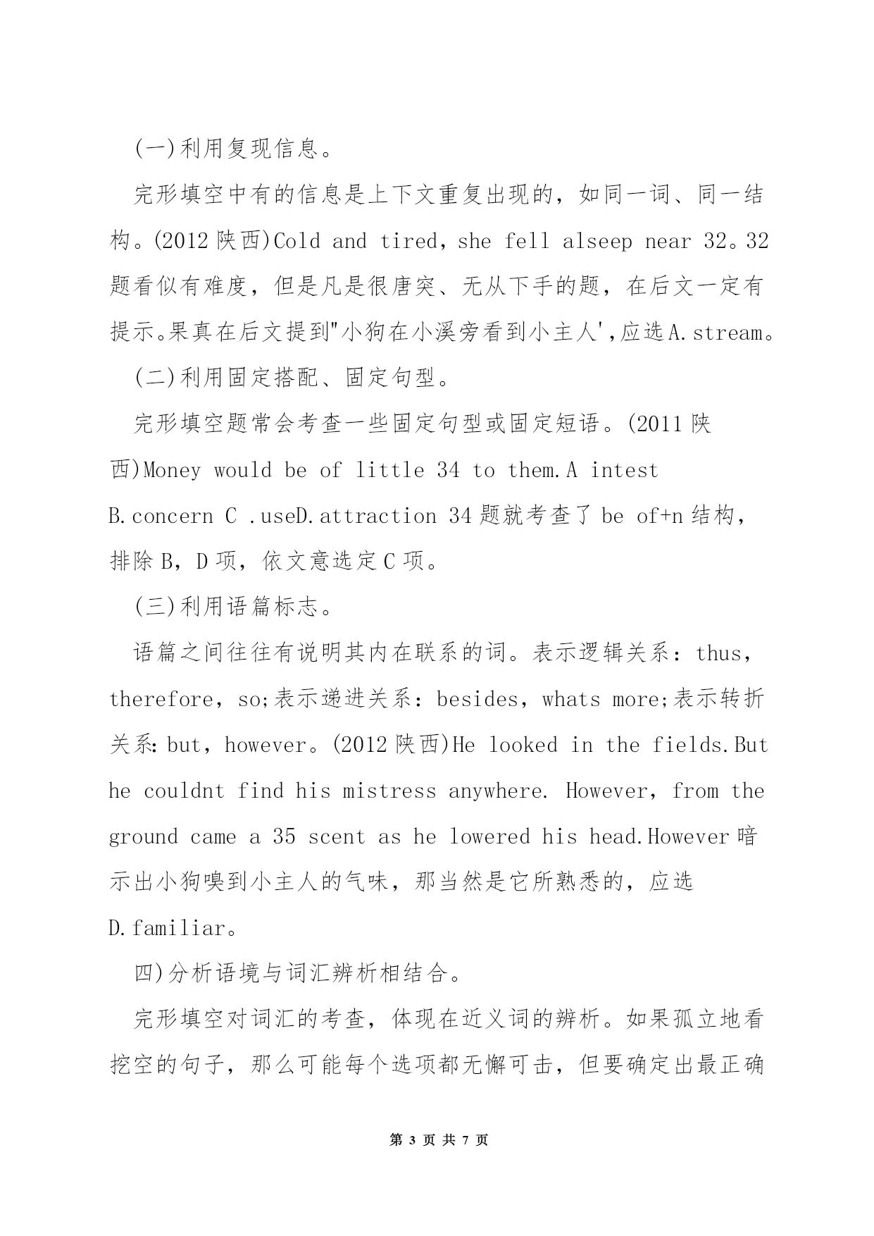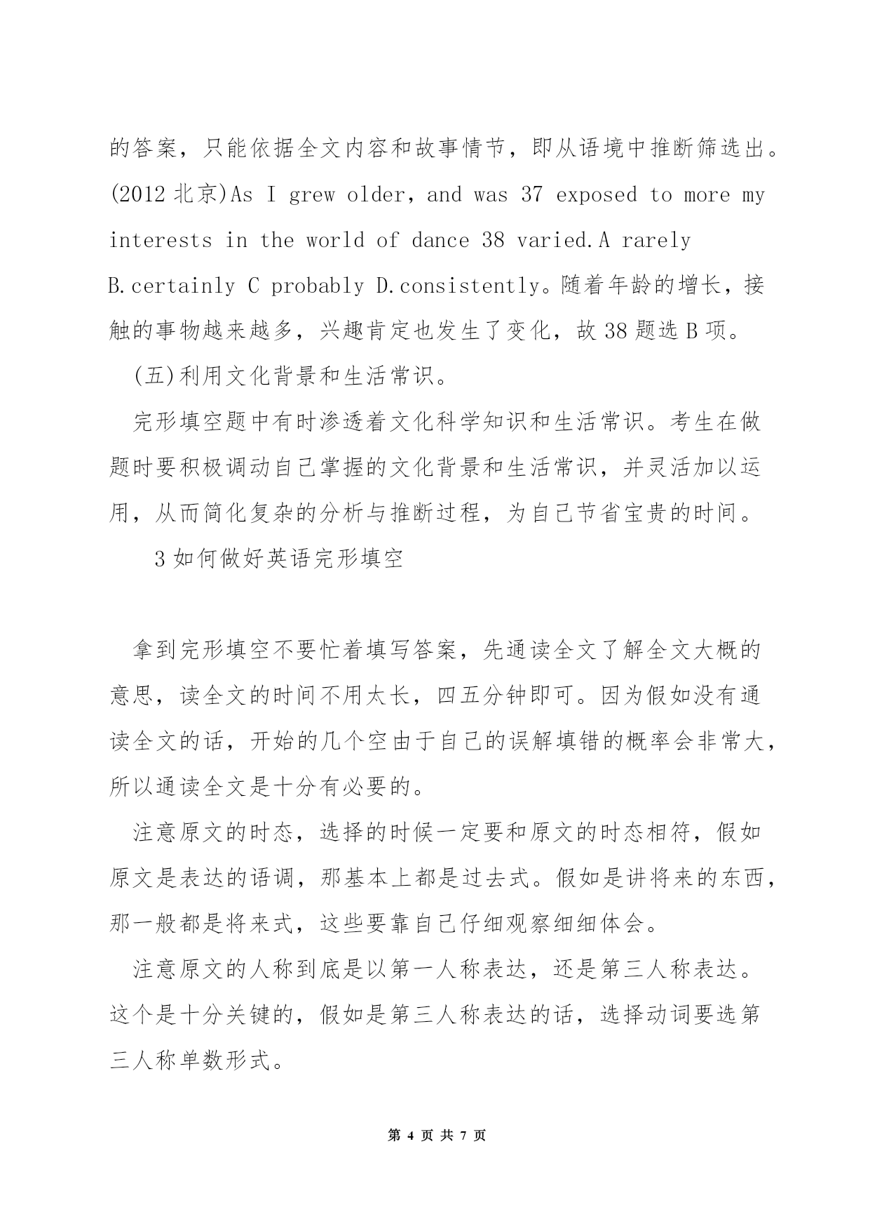 第PAGE\*MERGEFORMAT7页共NUMPAGES\*MERGEFORMAT7页高考英语完型技巧平心静气不急不躁对完形填空心存恐惧,是导致失误的根本原因,有些考生满脑子的畏难思想,殊不知这种情绪只会使得自己的全部思想游离题外,根本无法进入思维,还谈何理解文章的内容呢?所以,集中思想、树立信心、平心静气、去除杂念才是做好完型填空题的确保。浏览全文把握大意浏览全文能获得更多的上下文提供的信息,并依据文章的内在逻辑意义、贯穿文章始终的主线以及行文的走向,把握文脉,调整并定位自己的解题思路,从而做出最终的推断。如在Compuer一文中,贯穿文章始终的主线为Computersareimportantforhumanbeings,但到了最后,笔锋一转,提出Areyouafraidifcomputerscanreallythinkoneday?的行文走向是一种担心和忧虑,所以读者既要善于听话听音,也要把握准文脉,及时调整、定位自己的思路,就会发现上述问题的正确回答应该是Yes,weareafraid.。识别短语注意搭配一类短语是由动词+介词,或动词+副词构成,在现代英语中,这类词组很多而且有用性强、结构简练、使用灵活、表达生动,如breaktheice,lookforwardto,keepaneyeon,catchoneseye等;还有一类使用极广的是介词短语,如withregardto,inablinkof,oneveryoneslips,attheageof等。如果平常能注意词组、短语的整体记忆,掌握它们的搭配规律,在做完型填空时就能得心应手,减少失误,提升完型填空的命中率。运用语法理顺关系语法知识是指导完型填空的法宝,词汇是依据语法规则确定各自的位置,有了语法规则文章才干有条不紊、顺理成章。完型填空题实际上是"形断意不断,貌离神不离',正如藕断而丝连,语法规则起到"牵动荷花带出藕'的功效。如介词后的代词必定是宾格;物质名词一般不用复数;形容词必须放在不定代词后;行为动词的否定和疑问句应由助动词do构成;情态动词只能与不带to的动词连用等。如黄浦区2003年中考模拟试卷中的完型填空题第3小题:Iwasthehappiestboyintheworld,填入的词逻辑依据为happy,语法依据为高级,因为前一个词是the,后面是intheworld短语,即在一个范围内进行比较,应用形容词的高级,因而推断出该词为happiest;再如该项的第6小题,挖空处为dont,因为行为动词的否定式应由助动词构成,而且主语是I,因此得出该词为dont。2如何做好高考英语完形填空题(一)利用复现信息。完形填空中有的信息是上下文重复出现的,如同一词、同一结构。(2012陕西)Coldandtired,shefellalseepnear32。32题看似有难度,但是凡是很唐突、无从下手的题,在后文一定有提示。果真在后文提到"小狗在小溪旁看到小主人',应选A.stream。(二)利用固定搭配、固定句型。完形填空题常会考查一些固定句型或固定短语。(2011陕西)Moneywouldbeoflittle34tothem.AintestB.concernC.useD.attraction34题就考查了beof+n结构,排除B,D项,依文意选定C项。(三)利用语篇标志。语篇之间往往有说明其内在联系的词。表示逻辑关系:thus,therefore,so;表示递进关系:besides,whatsmore;表示转折关系:but,however。(2012陕西)Helookedinthefields.Buthecouldntfindhismistressanywhere.However,fromthegroundcamea35scentasheloweredhishead.However暗示出小狗嗅到小主人的气味,那当然是它所熟悉的,应选D.familiar。四)分析语境与词汇辨析相结合。完形填空对词汇的考查,体现在近义词的辨析。如果孤立地看挖空的句子,那么可能每个选项都无懈可击,但要确定出最正确的答案,只能依据全文内容和故事情节,即从语境中推断筛选出。(2012北京)AsIgrewolder,andwas37exposedtomoremyinterestsintheworldofdance38varied.ArarelyB.certainlyCprobablyD.consistently。随着年龄的增长,接触的事物越来越多,兴趣肯定也发生了变化,故38题选B项。(五)利用文化背景和生活常识。完形填空题中有时渗透着文化科学知识和生活常识。考生在做题时要积极调动自己掌握的文化背景和生活常识,并灵活加以运用,从而简化复杂的分析与推断过程,为自己节省宝