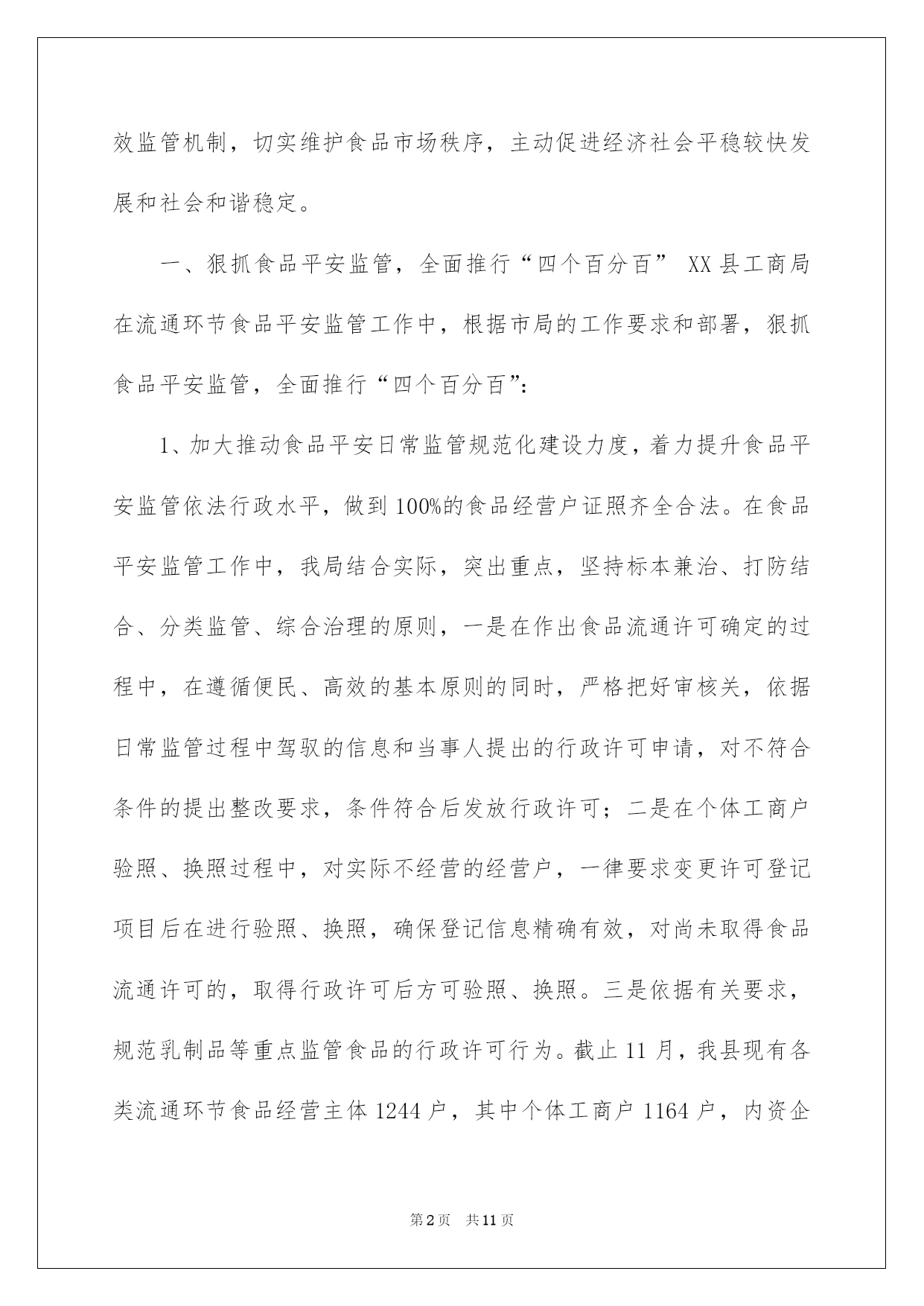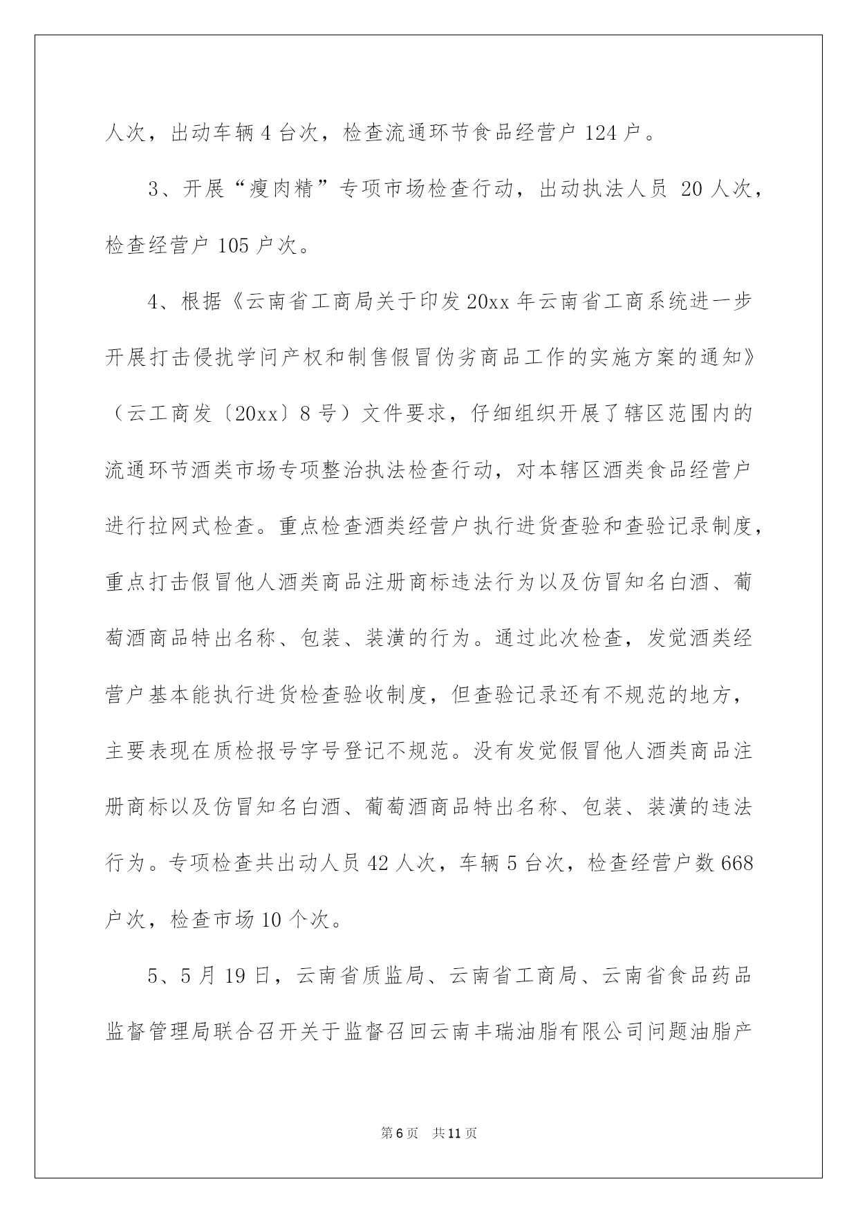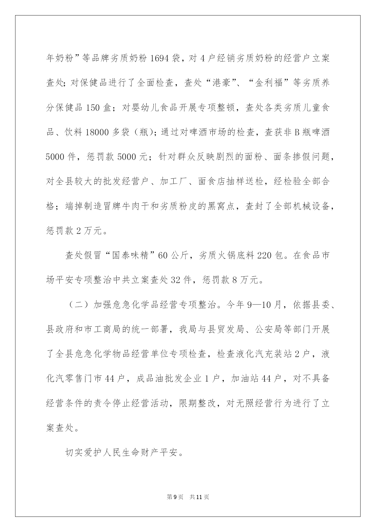 第PAGE\*Arabic\*MERGEFORMAT11页共NUMPAGES\*Arabic\*MERGEFORMAT11页第PAGE\*MERGEFORMAT11页共NUMPAGES\*MERGEFORMAT11页第PAGE\*MERGEFORMAT11页共NUMPAGES\*MERGEFORMAT11页第PAGE\*MERGEFORMAT11页共NUMPAGES\*MERGEFORMAT11页第PAGE\*MERGEFORMAT11页共NUMPAGES\*MERGEFORMAT11页第PAGE\*MERGEFORMAT11页共NUMPAGES\*MERGEFORMAT11页第PAGE\*MERGEFORMAT11页共NUMPAGES\*MERGEFORMAT11页第PAGE\*MERGEFORMAT11页共NUMPAGES\*MERGEFORMAT11页第PAGE\*MERGEFORMAT11页共NUMPAGES\*MERGEFORMAT11页第PAGE\*MERGEFORMAT11页共NUMPAGES\*MERGEFORMAT11页第PAGE\*MERGEFORMAT11页共NUMPAGES\*MERGEFORMAT11页2022县工商局安全工作总结县工商局平安工作总结总结是在某一时期、某一项目或某些工作告一段落或者全部完成后进行回顾检查、分析评价,从而得出教训和一些规律性相识的一种书面材料,它可以促使我们思索,让我们好好写一份总结吧。总结怎么写才不会一模一样呢?以下是我帮大家整理的县工商局平安工作总结,希望能够帮助到大家。县工商局平安工作总结120xx年,我县工商局在市工商局和县委政府的正确领导下,根据省、市工商局的统一部署,全面落实全国工商行政管理工作会议和云南省工商系统食品平安监管工作会议的支配,以科学发展观为指导,切实履行流通领域食品质量监管职能,把加强食品平安、保障消费者的身心健康与人身平安,作为践行执政为民的动身点和落脚点。以保障流通环节食品平安为目标,坚持标本兼治、重在治本和打防结合的原则,深化开展流通环节整治执法行动,强化日常规范监管,推动完善经营者自律体系,健全和落实食品平安监管各项制度,主动构建长效监管机制,切实维护食品市场秩序,主动促进经济社会平稳较快发展和社会和谐稳定。一、狠抓食品平安监管,全面推行“四个百分百”XX县工商局在流通环节食品平安监管工作中,根据市局的工作要求和部署,狠抓食品平安监管,全面推行“四个百分百”:1、加大推动食品平安日常监管规范化建设力度,着力提升食品平安监管依法行政水平,做到100%的食品经营户证照齐全合法。在食品平安监管工作中,我局结合实际,突出重点,坚持标本兼治、打防结合、分类监管、综合治理的原则,一是在作出食品流通许可确定的过程中,在遵循便民、高效的基本原则的同时,严格把好审核关,依据日常监管过程中驾驭的信息和当事人提出的行政许可申请,对不符合条件的提出整改要求,条件符合后发放行政许可;二是在个体工商户验照、换照过程中,对实际不经营的经营户,一律要求变更许可登记项目后在进行验照、换照,确保登记信息精确有效,对尚未取得食品流通许可的,取得行政许可后方可验照、换照。三是依据有关要求,规范乳制品等重点监管食品的行政许可行为。截止11月,我县现有各类流通环节食品经营主体1244户,其中个体工商户1164户,内资企业78户,外商投资企业2户。2、加大推动食品经营者诚信自律体系建设力度,着力监督和引导食品经营者落实主体责任,做到与100%的食品经营者签订食品平安责任书。一是刚好更新食品平安责任书的内容,确保责任书的内容涵盖经营者的责任和义务、法律责任等内容,明确责任和义务。二是在日常监管的过程,对经营者存在的问题进行具体的指导,告知经营者未履行的责任、义务和违反的法律条款,提高经营者的法律意识,并树立依法行政的工商形象。三是片区责任人对所管辖的片区食品经营实行动态监管,刚好驾驭经营户的变动信息和责任书的签订状况,做到刚好签订,不留死角。3、加大推动食品经营者食品平安责任体系建设力度,着力监督和引导食品经营者落实索证索票、进货查验的责任,严格监督食品经营者把好食品进货关,做到100%的食品经营者建立并执行索证索票、进货查验制度。一是在日常监管中加大对索证索票、进货查验制度的宣扬,让食品经营者充分相识到索证索票、进货查验制度的重要性,树立食品经营者不但要对自己负责,同时更应当对社会负责的意识。二是在日常巡查过程中,耐性细致的对经营者讲解鉴别和发觉问题食品的相关学问,让经营者自觉抵制假冒伪劣商品和不合格食品。三是对检查过程中发觉