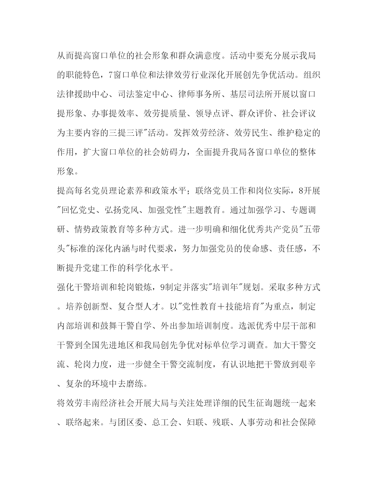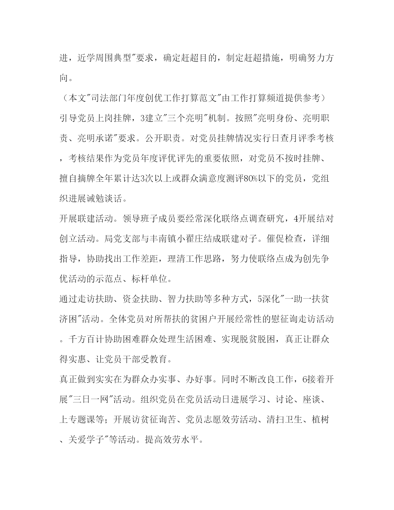司法部门年度创优工作参考计划局创先争优总体工作目的是以邓小平理论和"三个代表"重要思想为指导,年。深化贯彻落实科学开展观,全面贯彻落实党的十七届五中全会精神,充分发挥司法行政职能作用,紧紧围绕推进政法三项重点工作和"打造经济强区、建立生态水城"中心工作,强化党内创先、系统创佳、岗位创优和司法行政工作创新,保持在全国、全省、全市的领先地位,争创全国、全省优秀司法局;基层司法所在保持文明单位、文明建立先进单位荣誉的根底上,工作再登新台阶。充分发挥党组织和党员在打造经济强区,建立生态水城"中的战斗堡垒和先锋榜样作用,为推进全系统司法行政事业科学开展、效劳和保障"十二五"良好开局提供政治动力和组织保证,确保实现创先争优与司法行政工作双丰收。承诺的内容与工作职责、本职岗位相结合,1搞好认责承诺工作。组织党员坚持从工作实际出发。与日常工作相结合,与领导点评的征询题和党员群众的意见相结合,与为群众做好事、实事相结合,内容详细,目的明确。同时,加强对履诺、践诺情况的动态治理,健全考核、奖惩机制。以赶超同系统省级先进、争创全国先进单位为目的,2施行全面对标赶超。局党支部立足实际。对照受司法部表彰的省县司法局、省市区司法局,定位开展目的,提高工作标准;党员个人按照"远学全国全省先进,近学周围典型"要求,确定赶超目的,制定赶超措施,明确努力方向。(本文"司法部门年度创优工作打算范文"由工作打算频道提供参考)引导党员上岗挂牌,3建立"三个亮明"机制。按照"亮明身份、亮明职责、亮明承诺"要求。公开职责。对党员挂牌情况实行日查月评季考核,考核结果作为党员年度评优评先的重要依照,对党员不按时挂牌、擅自摘牌全年累计达3次以上或群众满意度测评80%以下的党员,党组织进展诫勉谈话。开展联建活动。领导班子成员要经常深化联络点调查研究,4开展结对创立活动。局党支部与丰南镇小翟庄结成联建对子。催促检查,详细指导,协助找出工作差距,理清工作思路,努力使联络点成为创先争优活动的示范点、标杆单位。通过走访扶助、资金扶助、智力扶助等多种方式,5深化"一助一扶贫济困"活动。全体党员对所帮扶的贫困户开展经常性的慰征询走访活动。千方百计协助困难群众处理生活困难、实现脱贫脱困,真正让群众得实惠、让党员干部受教育。真正做到实实在为群众办实事、办好事。同时不断改良工作,6接着开展"三日一网"活动。组织党员在党员活动日进展学习、讨论、座谈、上专题课等;开展访贫征询苦、党员志愿效劳活动、清扫卫生、植树、关爱学子"等活动。提高效劳水平。从而提高窗口单位的社会形象和群众满意度。活动中要充分展示我局的职能特色,7窗口单位和法律效劳行业深化开展创先争优活动。组织法律援助中心、司法鉴定中心、律师事务所、基层司法所开展以窗口提形象、办事提效率、效劳提质量、领导点评、群众评价、社会评议为主要内容的三提三评"活动。发挥效劳经济、效劳民生、维护稳定的作用,扩大窗口单位的社会妨碍力,全面提升我局各窗口单位的整体形象。提高每名党员理论素养和政策水平;联络党员工作和岗位实际,8开展"回忆党史、弘扬党风、加强党性"主题教育。通过加强学习、专题调研、情势政策教育等多种方式。进一步明确和细化优秀共产党员"五带头"标准的深化内涵与时代要求,努力加强党员的使命感、责任感,不断提升党建工作的科学化水平。强化干警培训和轮岗锻炼,9制定并落实"培训年"规划。采取多种方式。培养创新型、复合型人才。以"党性教育+技能培育"为重点,制定内部培训和鼓舞干警自学、外出参加培训制度。选派优秀中层干部和干警到全国先进地区和我局创先争优对标单位学习调查。加大干警交流、轮岗力度,进一步健全干警交流制度,有认识地把干警放到艰辛、复杂的环境中去磨练。将效劳丰南经济社会开展大局与关注处理详细的民生征询题统一起来、联络起来。与团区委、总工会、妇联、残联、人事劳动和社会保障局和老干部局等部门相结合,10围绕效劳人民群众推进党群共建创先争优。不断加大法律援助、148法律征询和律师治理工作力度。进一步加强对法律援助工作站的指导和监视,使法律援助工作覆盖妇女、未成年人、老年人、残疾人、农民工、下岗职工等各类弱势群体,努力实现应援尽援,尽援优援。同时,以市局在区建立残疾人法律援助联络点为契机,探究残疾人法律援助工作方式。以关注民生、效劳民生为重点,接着降低门槛,让更多的困难群众享遭到实惠。积极深化基层,11围绕促进社会和谐推进党群共建创先争优。组织引导在人民调解、法制宣传、安置帮教、社区矫正等工作岗位上的党、团员。及时协调处理好各种涉及群众权益民间矛盾纠纷,以及群众反映突出的征询题,做好人文关心和释疑解惑、疏导情绪等工作,妥善协调各方面利益关系。三项重点工作"中发挥积极作用。从基层各个行业、不同岗位上选树一批创先争优活动中涌现