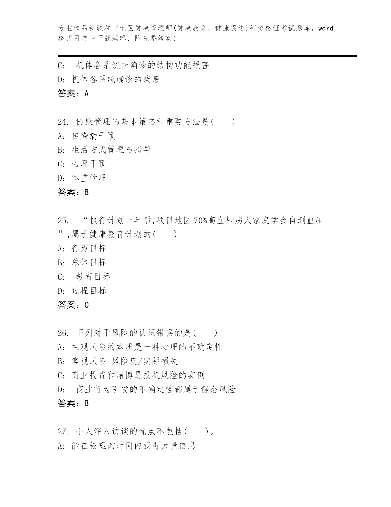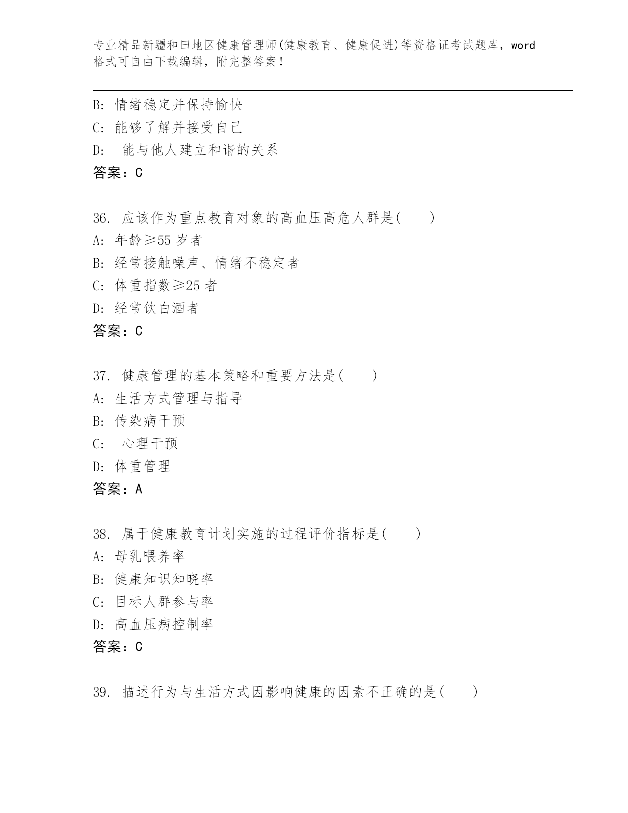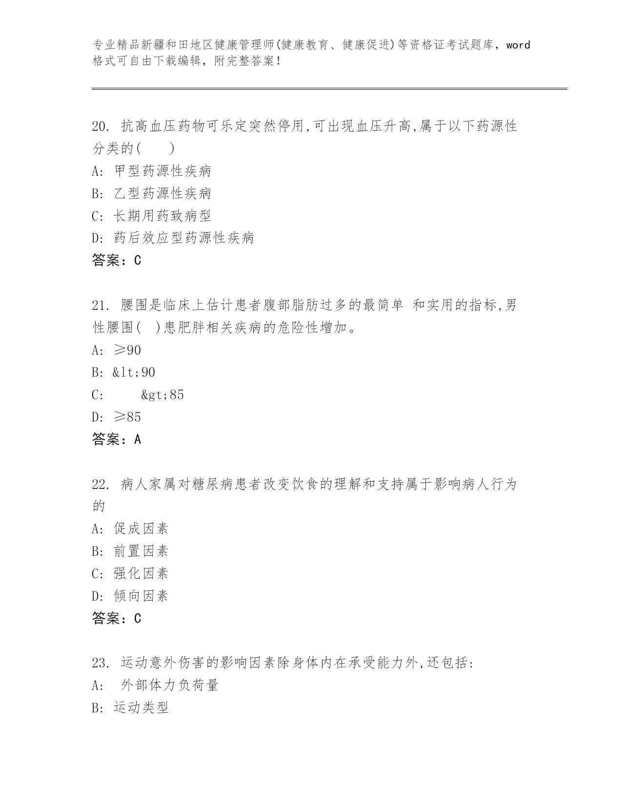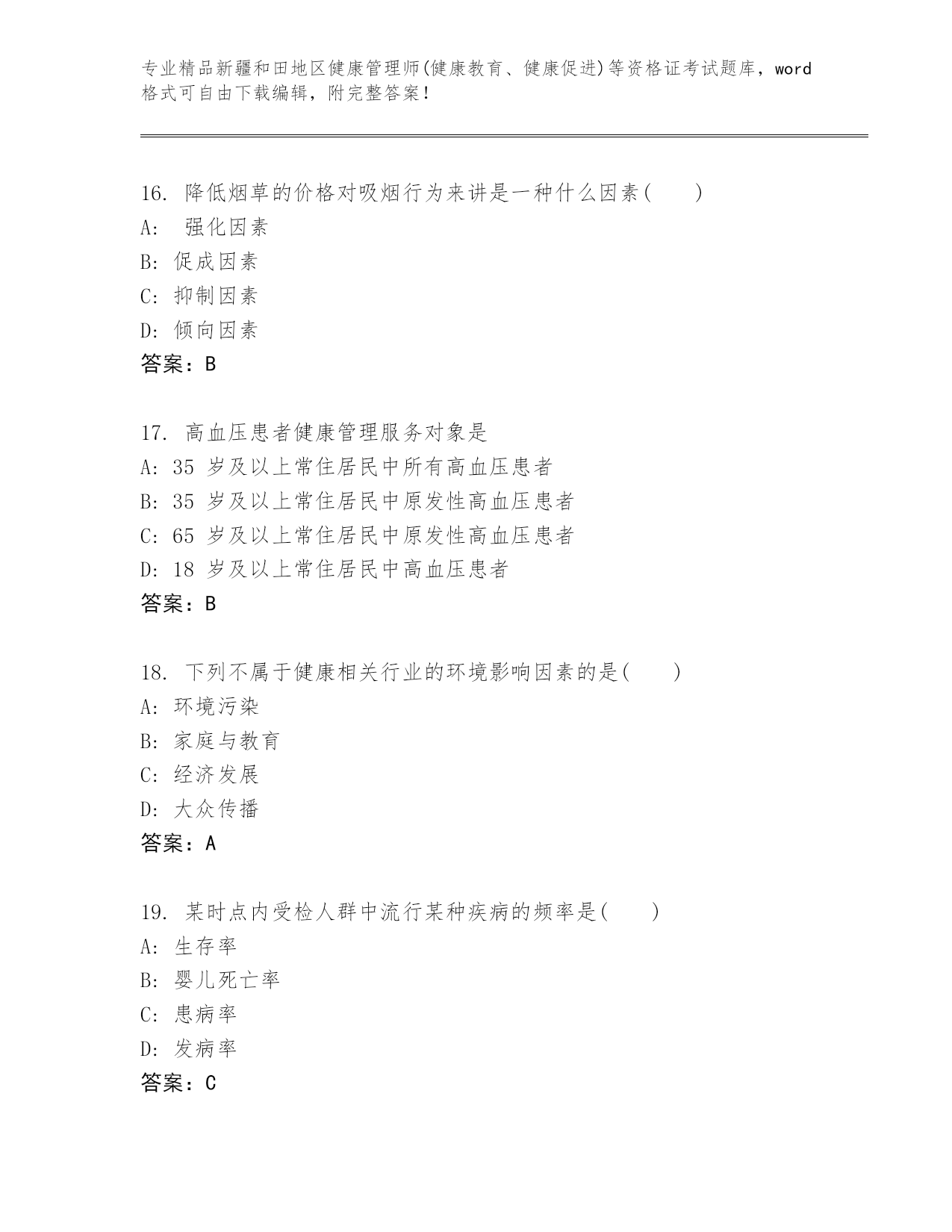 优选新疆和田地区健康管理师(健康教育、健康促进)等资格证考试真题精品(全国通用)