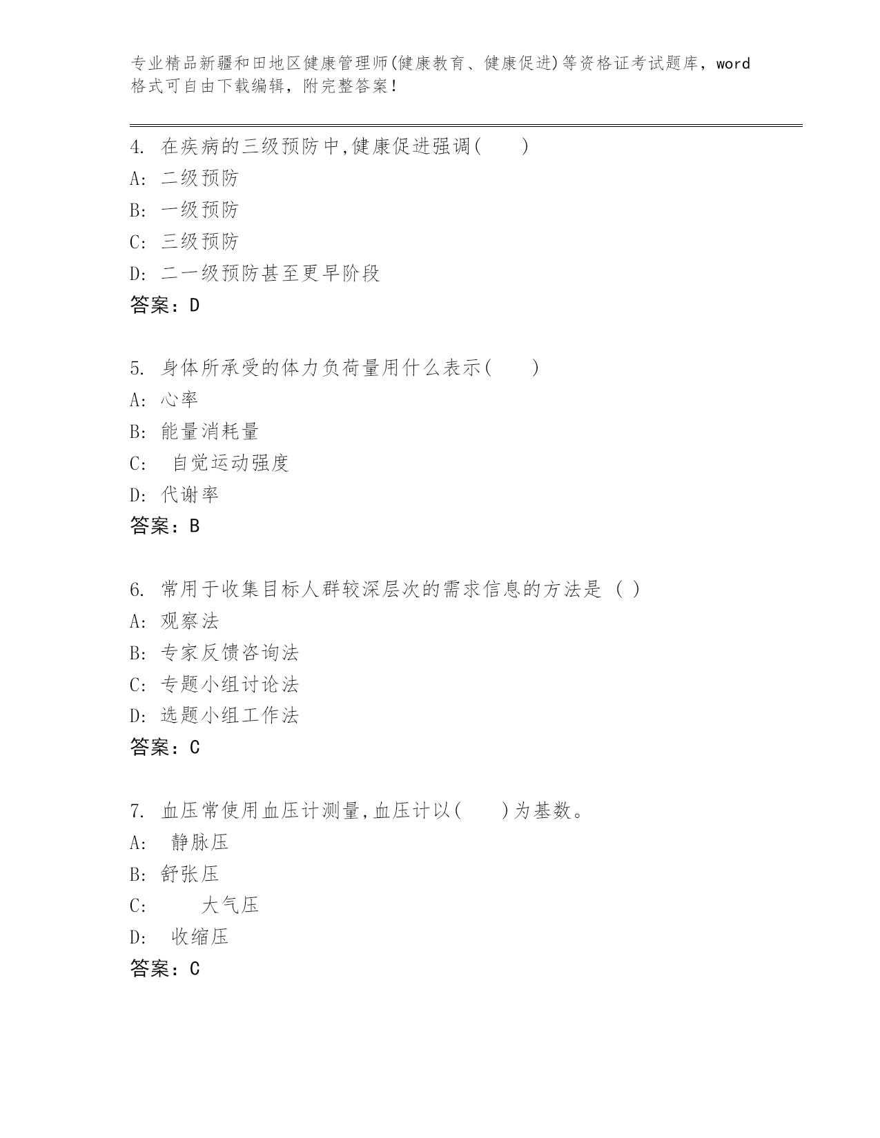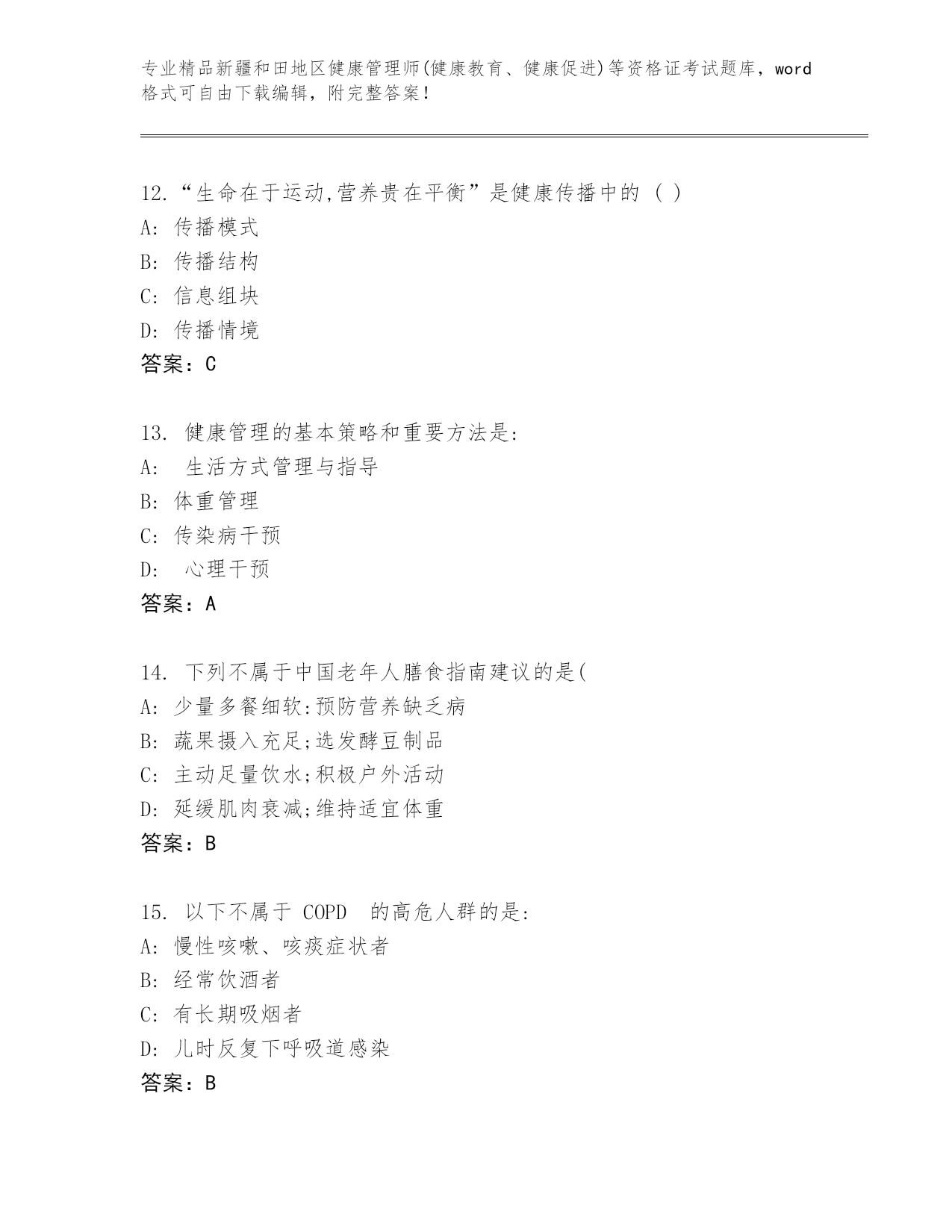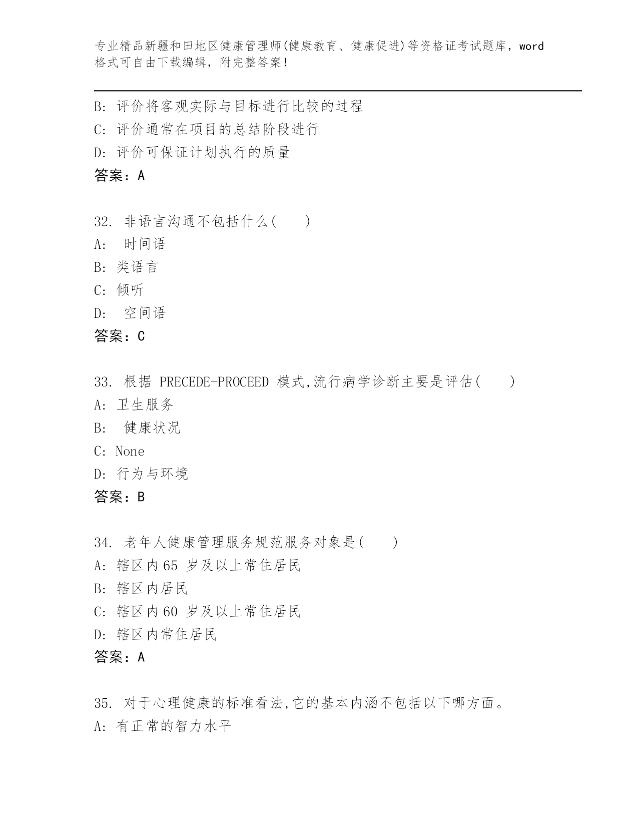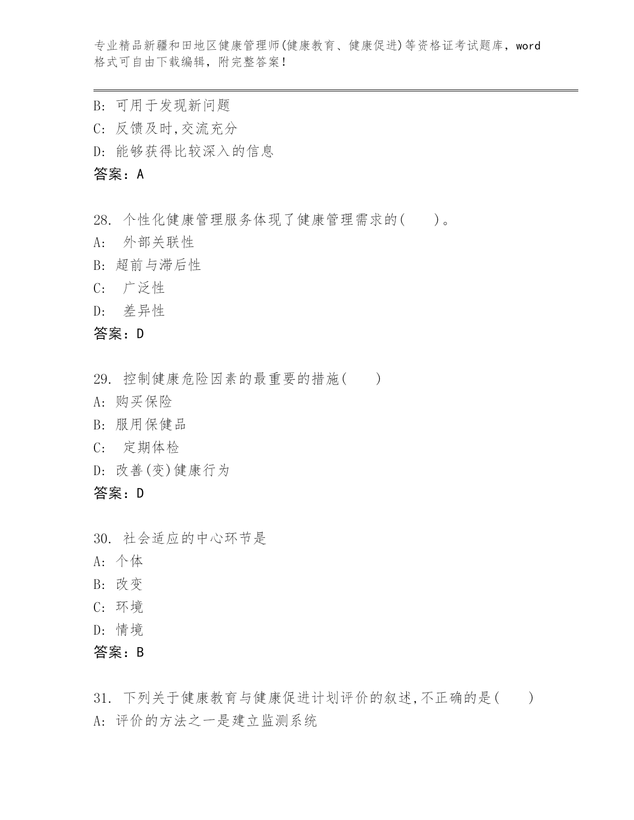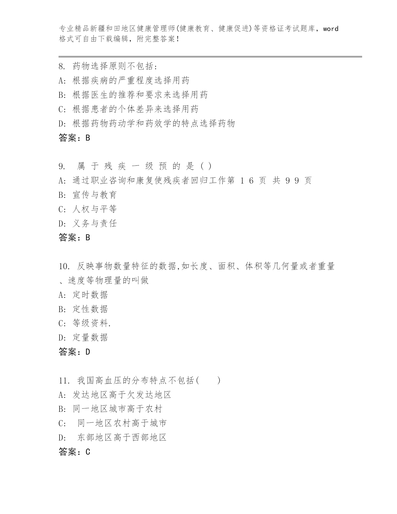 优选新疆和田地区健康管理师(健康教育、健康促进)等资格证考试真题精品(全国通用)