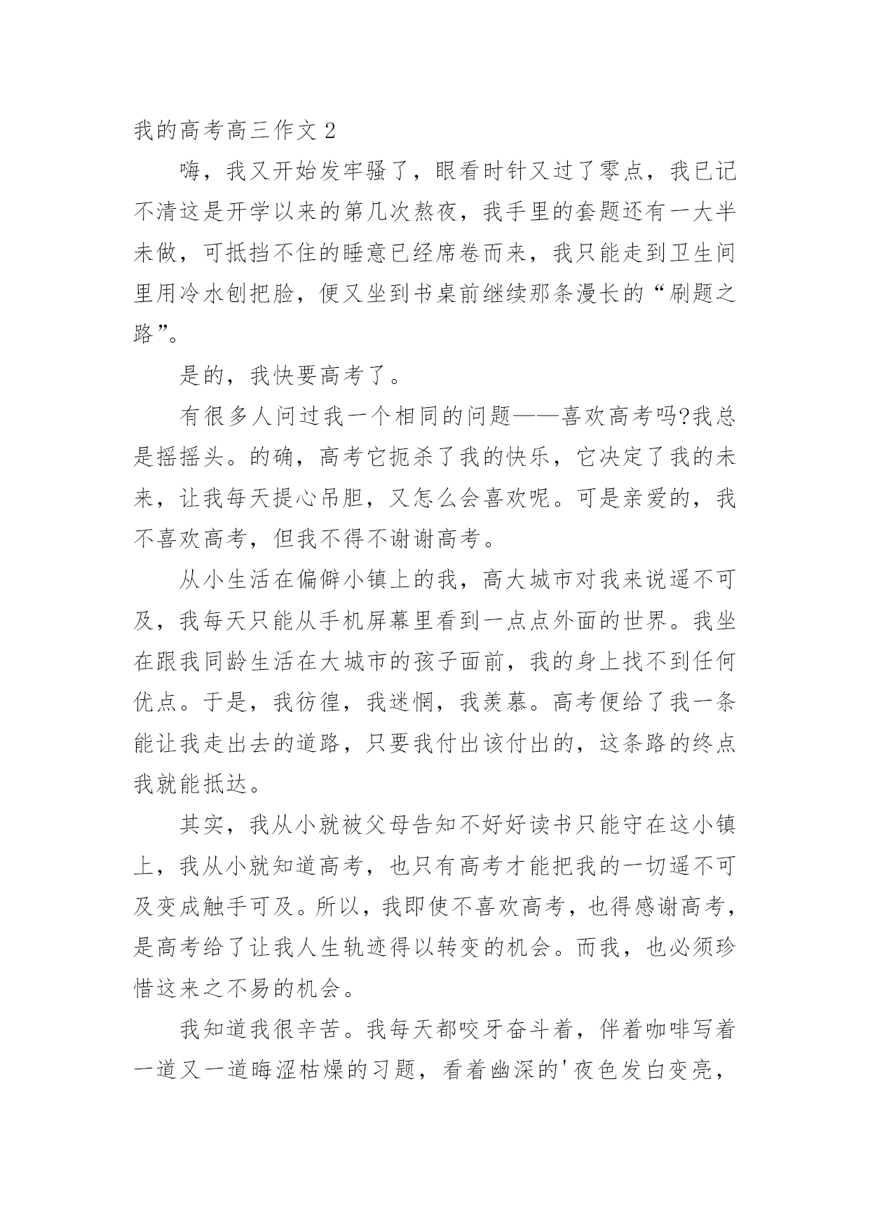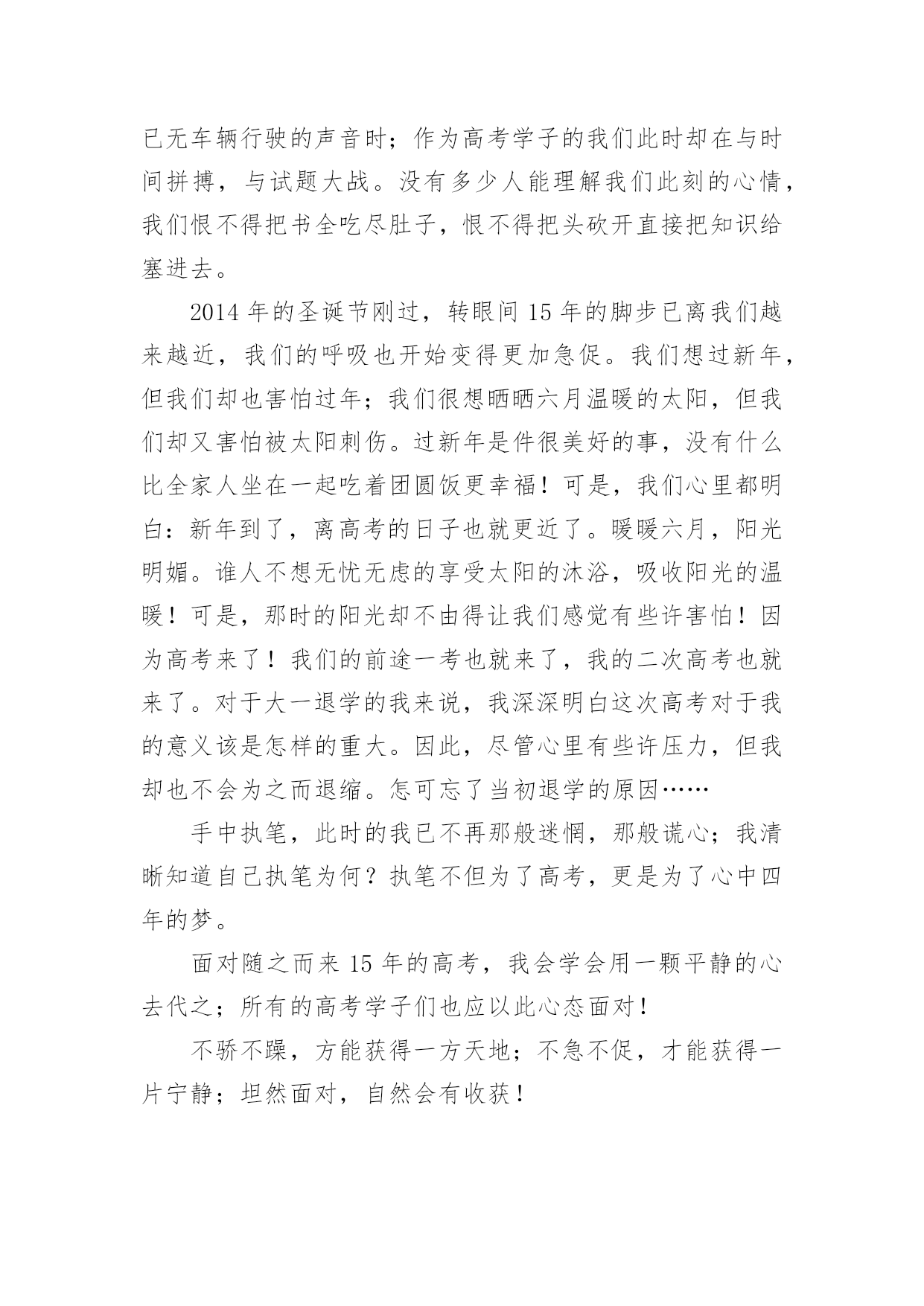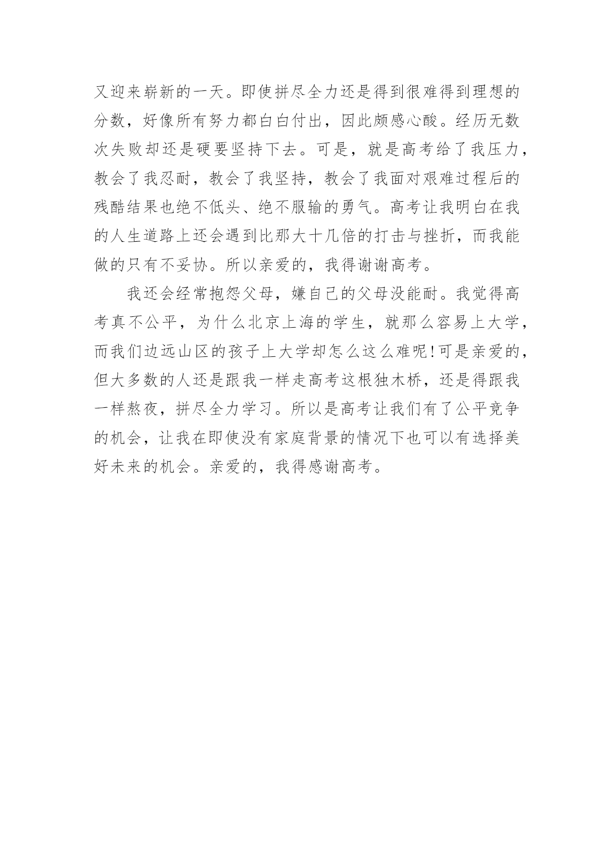 我的高考高三作文在日常学习、工作或生活中,说到作文,大家肯定都不陌生吧,作文是一种言语活动,具有高度的综合性和创造性。那么,怎么去写作文呢?以下是小编收集整理的我的高考高三作文,欢迎阅读与收藏。我的高考高三作文1手中执笔,却不知如何入手。此时的我心中犹如一团乱麻缠搅在一起。我急了,心里拼命的拉扯这团乱麻,希望可以将它解开,可是,乱麻总归是乱麻,你越扯它它反而越紧;于是我不得不暂且放下这颗急躁的心,坦然处之。不想过了一会儿,原先急躁的心突然变的宁静了许多。面对高考,我不再那样紧张的喘不过气了!一颗平静的心有时往往能决定一个人的成败;面对高考,我们更多的是需要泰然处之。十年寒窗磨一剑,只为一朝得志名题金榜。高考对于我们读书人来说,它就是一个决定人生命运的'转折点,对于我们高三。高四。甚至高五的学生来说,它更是我们的所有。早晨,日还未出,天还未明;当大多数人还沉浸在温柔美丽的梦乡中时,当他们还在大声打着呼噜时,做为高考学子的我们却早已拿起自己的高考复习资料,认认真真的做起了各门科目的高考试题。他们不但起的比鸡早,而且睡的也比狗晚;当夜深人静时,当所有的人家灯光尽数息灭时,当街上已无车辆行驶的声音时;作为高考学子的我们此时却在与时间拼搏,与试题大战。没有多少人能理解我们此刻的心情,我们恨不得把书全吃尽肚子,恨不得把头砍开直接把知识给塞进去。2014年的圣诞节刚过,转眼间15年的脚步已离我们越来越近,我们的呼吸也开始变得更加急促。我们想过新年,但我们却也害怕过年;我们很想晒晒六月温暖的太阳,但我们却又害怕被太阳刺伤。过新年是件很美好的事,没有什么比全家人坐在一起吃着团圆饭更幸福!可是,我们心里都明白:新年到了,离高考的日子也就更近了。暖暖六月,阳光明媚。谁人不想无忧无虑的享受太阳的沐浴,吸收阳光的温暖!可是,那时的阳光却不由得让我们感觉有些许害怕!因为高考来了!我们的前途一考也就来了,我的二次高考也就来了。对于大一退学的我来说,我深深明白这次高考对于我的意义该是怎样的重大。因此,尽管心里有些许压力,但我却也不会为之而退缩。怎可忘了当初退学的原因……手中执笔,此时的我已不再那般迷惘,那般谎心;我清晰知道自己执笔为何?执笔不但为了高考,更是为了心中四年的梦。面对随之而来15年的高考,我会学会用一颗平静的心去代之;所有的高考学子们也应以此心态面对!不骄不躁,方能获得一方天地;不急不促,才能获得一片宁静;坦然面对,自然会有收获!我的高考高三作文2嗨,我又开始发牢骚了,眼看时针又过了零点,我已记不清这是开学以来的第几次熬夜,我手里的套题还有一大半未做,可抵挡不住的睡意已经席卷而来,我只能走到卫生间里用冷水刨把脸,便又坐到书桌前继续那条漫长的“刷题之路”。是的,我快要高考了。有很多人问过我一个相同的问题——喜欢高考吗?我总是摇摇头。的确,高考它扼杀了我的快乐,它决定了我的未来,让我每天提心吊胆,又怎么会喜欢呢。可是亲爱的,我不喜欢高考,但我不得不谢谢高考。从小生活在偏僻小镇上的我,高大城市对我来说遥不可及,我每天只能从手机屏幕里看到一点点外面的世界。我坐在跟我同龄生活在大城市的孩子面前,我的身上找不到任何优点。于是,我彷徨,我迷惘,我羡慕。高考便给了我一条能让我走出去的道路,只要我付出该付出的,这条路的终点我就能抵达。其实,我从小就被父母告知不好好读书只能守在这小镇上,我从小就知道高考,也只有高考才能把我的一切遥不可及变成触手可及。所以,我即使不喜欢高考,也得感谢高考,是高考给了让我人生轨迹得以转变的机会。而我,也必须珍惜这来之不易的机会。我知道我很辛苦。我每天都咬牙奋斗着,伴着咖啡写着一道又一道晦涩枯燥的习题,看着幽深的'夜色发白变亮,又迎来崭新的一天。即使拼尽全力还是得到很难得到理想的分数,好像所有努力都白白付出,因此颇感心酸。经历无数次失败却还是硬要坚持下去。可是,就是高考给了我压力,教会了我忍耐,教会了我坚持,教会了我面对艰难过程后的残酷结果也绝不低头、绝不服输的勇气。高考让我明白在我的人生道路上还会遇到比那大十几倍的打击与挫折,而我能做的只有不妥协。所以亲爱的,我得谢谢高考。我还会经常抱怨父母,嫌自己的父母没能耐。我觉得高考真不公平,为什么北京上海的学生,就那么容易上大学,而我们边远山区的孩子上大学却怎么这么难呢!可是亲爱的,但大多数的人还是跟我一样走高考这根独木桥,还是得跟我一样熬夜,拼尽全力学习。所以是高考让我们有了公平竞争的机会,让我在即使没有家庭背景的情况下也可以有选择美好未来的机会。亲爱的,我得感谢高考。