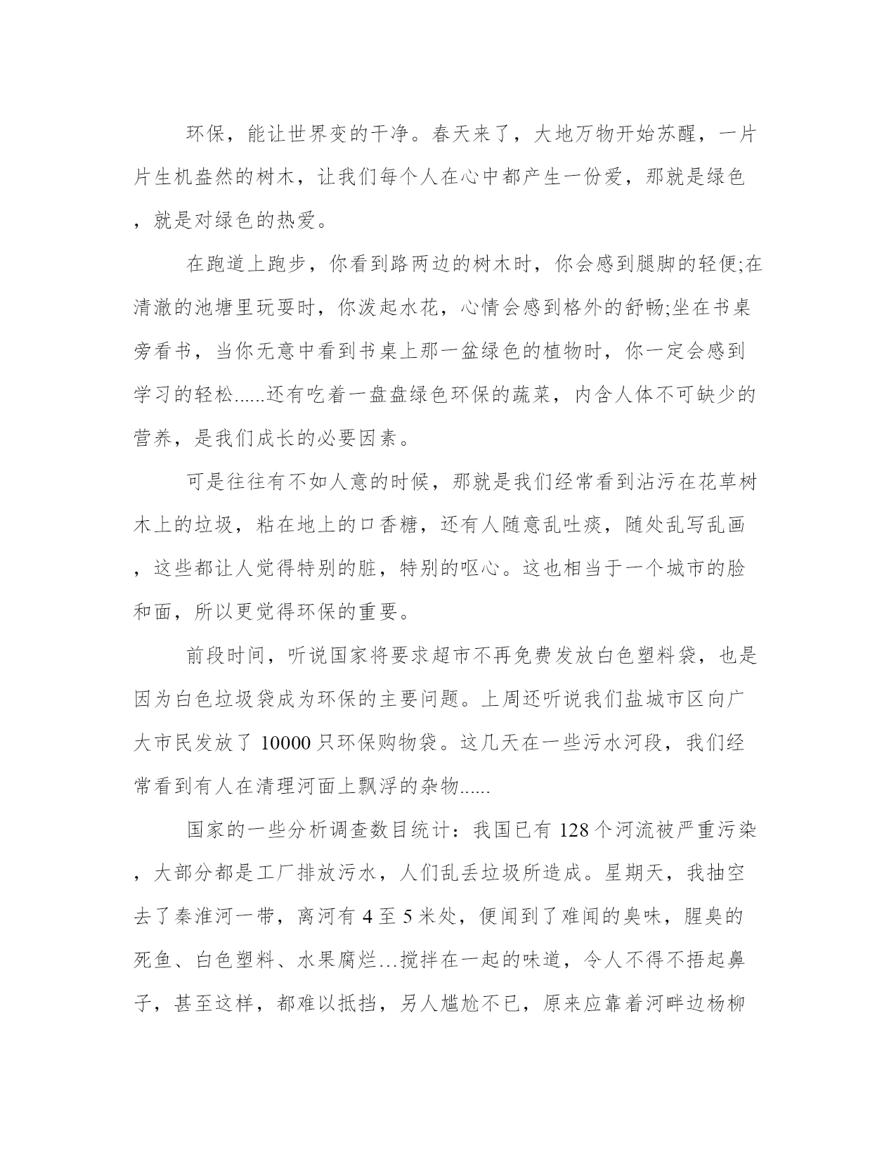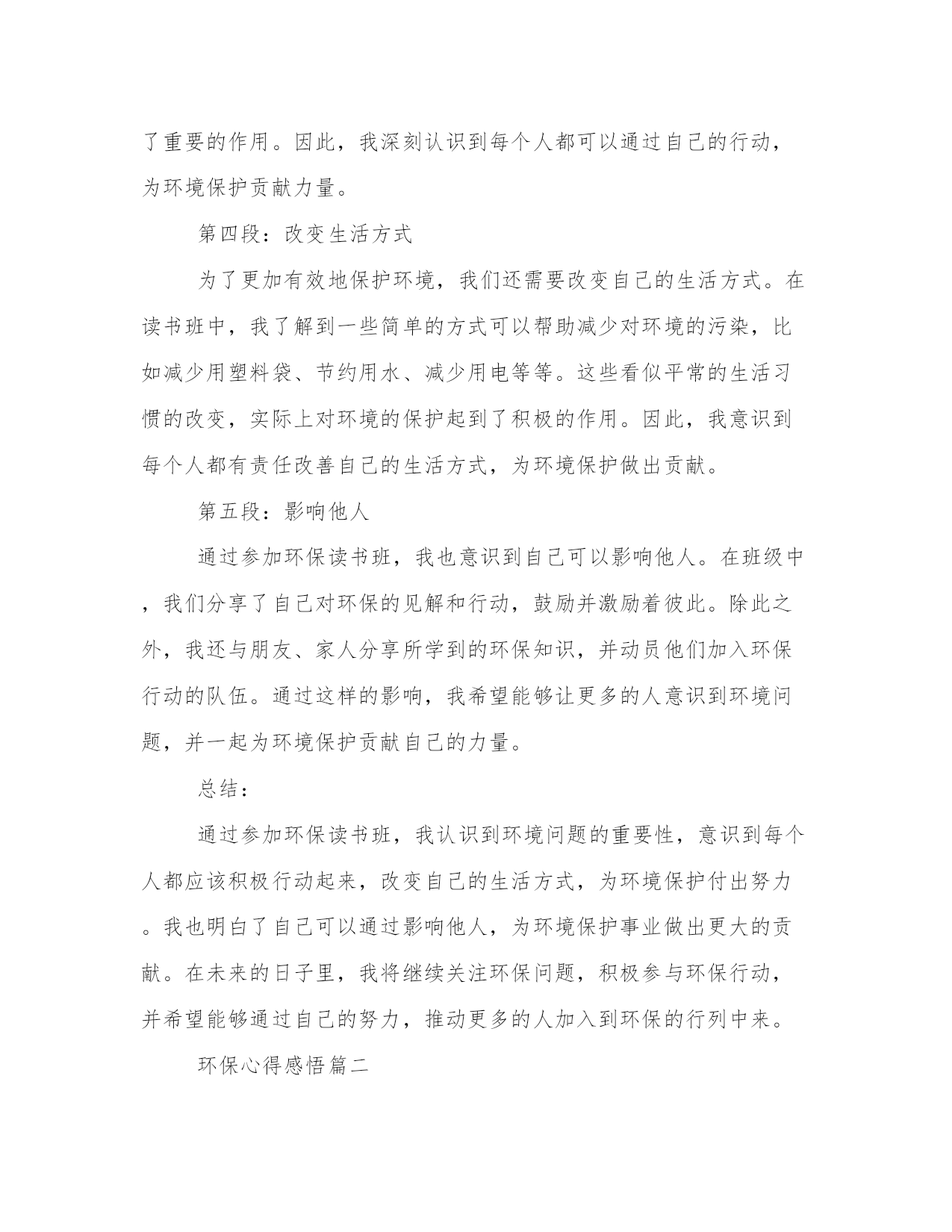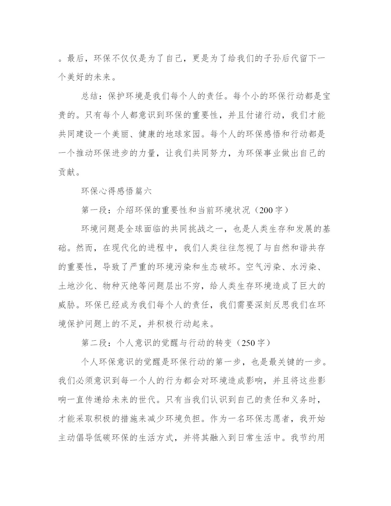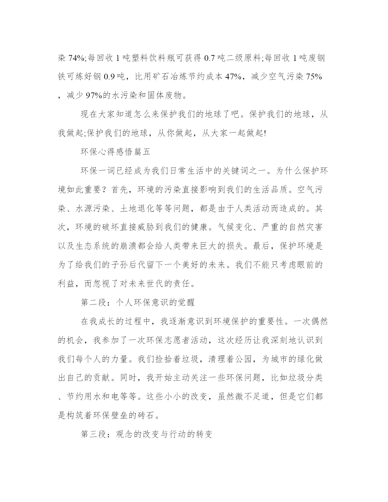 优质环保心得感悟范文(16篇)感悟来自于生活的历练与体验,是对人生真理的一种深刻洞察和把握。借鉴他人的感悟,如何平衡个人表达和其它观点?以下是一些关于感悟的经典范文,供大家参考和品味。环保心得感悟篇一我参加了一场名为环保读书班的活动,这是一次近距离接触环保主题的机会。通过参与这个班级,我收获了很多知识,同时也对环保问题有了更深的了解。在这篇文章中,我将分享一些我在这个环保读书班中的心得体会和感悟。第二段:关注环境问题的重要性在读书班的过程中,我逐渐认识到环境问题的重要性。通过学习环保主题的书籍,我了解到人类的行为对于地球造成了巨大的破坏,比如过度开发资源、过度使用化学物质等等。这些问题不仅仅会让我们的地球变得不宜居,还将影响到我们未来的生活。因此,我们每个人都应该关注环境问题,并积极采取行动,保护我们的地球。第三段:环保行动的重要性仅仅关注环境问题是不够的,我们还需要采取积极的环保行动。在读书班中,我了解到很多人们已经开始行动起来,为环境保护付出了努力。比如,在书中我了解到一些环境保护组织在进行垃圾分类、植树造林等活动。这些行动虽然看起来微小,但却对于环境保护起到了重要的作用。因此,我深刻认识到每个人都可以通过自己的行动,为环境保护贡献力量。第四段:改变生活方式为了更加有效地保护环境,我们还需要改变自己的生活方式。在读书班中,我了解到一些简单的方式可以帮助减少对环境的污染,比如减少用塑料袋、节约用水、减少用电等等。这些看似平常的生活习惯的改变,实际上对环境的保护起到了积极的作用。因此,我意识到每个人都有责任改善自己的生活方式,为环境保护做出贡献。第五段:影响他人通过参加环保读书班,我也意识到自己可以影响他人。在班级中,我们分享了自己对环保的见解和行动,鼓励并激励着彼此。除此之外,我还与朋友、家人分享所学到的环保知识,并动员他们加入环保行动的队伍。通过这样的影响,我希望能够让更多的人意识到环境问题,并一起为环境保护贡献自己的力量。总结:通过参加环保读书班,我认识到环境问题的重要性,意识到每个人都应该积极行动起来,改变自己的生活方式,为环境保护付出努力。我也明白了自己可以通过影响他人,为环境保护事业做出更大的贡献。在未来的日子里,我将继续关注环保问题,积极参与环保行动,并希望能够通过自己的努力,推动更多的人加入到环保的行列中来。环保心得感悟篇二环保,能让世界变的干净。春天来了,大地万物开始苏醒,一片片生机盎然的树木,让我们每个人在心中都产生一份爱,那就是绿色,就是对绿色的热爱。在跑道上跑步,你看到路两边的树木时,你会感到腿脚的轻便;在清澈的池塘里玩耍时,你泼起水花,心情会感到格外的舒畅;坐在书桌旁看书,当你无意中看到书桌上那一盆绿色的植物时,你一定会感到学习的轻松......还有吃着一盘盘绿色环保的蔬菜,内含人体不可缺少的营养,是我们成长的必要因素。可是往往有不如人意的时候,那就是我们经常看到沾污在花草树木上的垃圾,粘在地上的口香糖,还有人随意乱吐痰,随处乱写乱画,这些都让人觉得特别的脏,特别的呕心。这也相当于一个城市的脸和面,所以更觉得环保的重要。前段时间,听说国家将要求超市不再免费发放白色塑料袋,也是因为白色垃圾袋成为环保的主要问题。上周还听说我们盐城市区向广大市民发放了10000只环保购物袋。这几天在一些污水河段,我们经常看到有人在清理河面上飘浮的杂物......国家的一些分析调查数目统计:我国已有128个河流被严重污染,大部分都是工厂排放污水,人们乱丢垃圾所造成。星期天,我抽空去了秦淮河一带,离河有4至5米处,便闻到了难闻的臭味,腥臭的死鱼、白色塑料、水果腐烂…搅拌在一起的味道,令人不得不捂起鼻子,甚至这样,都难以抵挡,另人尴尬不已,原来应靠着河畔边杨柳享受风光,坐在长椅上津津有味读着小说书,倚在梧桐树的枝丫上锻炼的老人、青年、儿童现在都一散而光。那是因为杨柳被顽皮的儿童折的枯枝残叶,河里散发阵阵恶臭,大树的浓荫被破坏所导致的种.种因素。“1、2、3、4、5…”说得夸张点,这似乎比天上的星星还难。这时,从我头的正前方,一个古囊囊的黑色塑料袋飞驰而过,落在河的正中央,塑料袋慢慢松散,只见成群的垃圾随波逐流,,我愤恨地瞪了楼层上方一眼,此时,我有一个久置心中的疑惑:一个动物活在世上,都会爱自己的家园,珍惜自己的家园。而一个人——这样的高级动物,为何却对所处的环境如此不屑呢?回过头讲,如你的环保意识缺乏,或下降,就意味着你的生命的浅薄,人类思想的退化,这样一来,活在世上,似乎是脱了骨头支撑的皮肉;已毫无意义。环保,是否困扰着你,我,他?不是的,因为环保是每个人的责任,应尽的责任,而不是捐给希望工程的爱心,施舍给路边乞丐的一顿饭。环保心得感悟篇三我身边有一个环保达人——小琦。小琦是一个