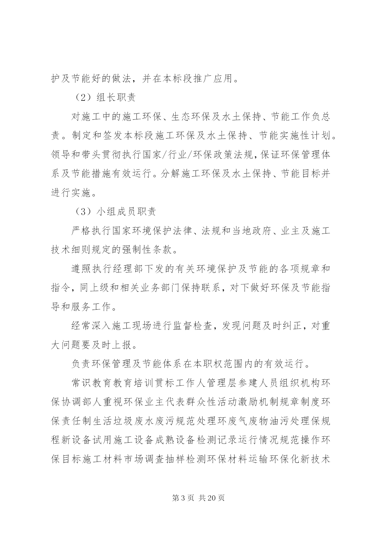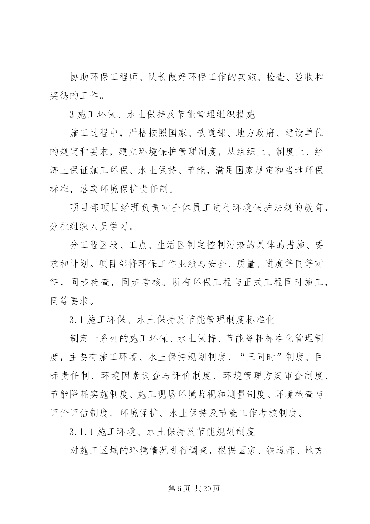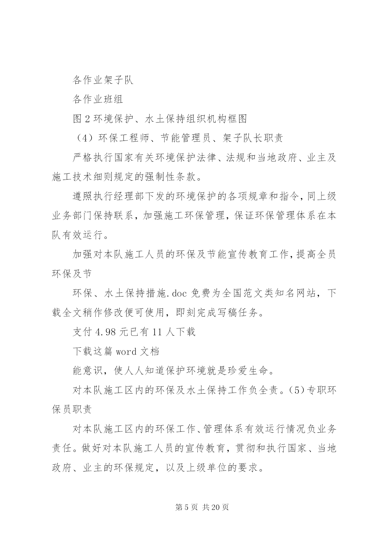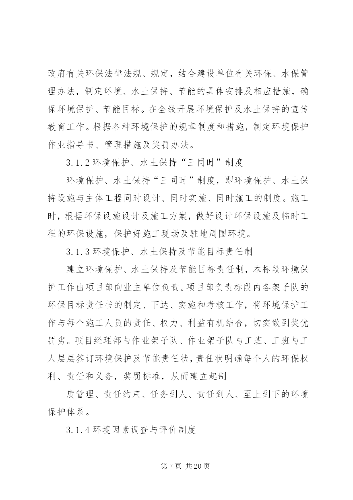 第PAGE\*Arabic\*MERGEFORMAT20页共NUMPAGES\*MERGEFORMAT20页环保、水土保持措施新建铁路成都至重庆客运专线施工环保、水土保持措施编制:日期审核:日期批准:日期中建铁路建设有限公司成渝客运专线cysg二标项目经理部施工环保、水土保持措施1环境保护、水土保持目标努力把工程设计和施工对环境的不利影响减至最低限度,确保铁路沿线景观不受破坏,地表水和地下水水质不受污染,植被有效保护,噪声、振动和扬尘的环境影响得到有效控制,文物得到有效保护;坚持做到“少破坏、多保护,少扰动、多防护,少污染、多防治”,使环境保护监控项目与监控结果达到设计文件及有关规定;做到环保、水保设施与工程建设“同时设计,同时施工,同时交付使用”。2施工环保、水土保持保证体系2.1施工环保、水土保持保证体系建立由项目经理部负责领导、部室分工管理、安全质量部、机械物资部监督指导、各作业架子队实施,从人、机、料、法、环、测六个方面完整的环境保护及节能保证体系,详见图1环境保护、水土保持保证体系框图。2.2施工环保、水土保持及节能管理组织机构2.2.1管理机构项目部将按照iso14001环境管理体系标准要求建立以项目经理任组长的环境保护、水土保持及节能领导小组,各作业架子队对应成立环境保护、水土保持及节能实施小组,配备必要的环保设施和环保专业人员,详见图2环境保护、水土保持组织机构框图。2.2.2主要职责(1)领导小组职责贯彻执行有关国家环境保护法律、法规和当地人民政府、建设单位、工程监理环保规定中的强制性条款;严格执行建设行政主管部门批复该工程的环境影响报告书。健全环境保护及水土保持组织机构,制定环保及节能目标和有关规章制度,对本标段施工环保、水土保持及节能工作负总责。负责施工期间环保、水保、节能措施和方案的制定与实施。讨论、研究和解决重要环保及节能事宜。保持与业主、环境监理及地方环保部门的联系,接受监督检查和指导。负责环保体系标准及节能和有关规章的贯彻落实,确保环保及节能管理体系有效运行。组织对下检查和指导工作,深入基层认真调查和收集环境保护及节能好的做法,并在本标段推广应用。(2)组长职责对施工中的施工环保、生态环保及水土保持、节能工作负总责。制定和签发本标段施工环保及水土保持、节能实施性计划。领导和带头贯彻执行国家/行业/环保政策法规,保证环保管理体系及节能措施有效运行。分解施工环保及水土保持、节能目标并进行实施。(3)小组成员职责严格执行国家环境保护法律、法规和当地政府、业主及施工技术细则规定的强制性条款。遵照执行经理部下发的有关环境保护及节能的各项规章和指令,同上级和相关业务部门保持联系,对下做好环保及节能指导和服务工作。经常深入施工现场进行监督检查,发现问题及时纠正,对重大问题要及时上报。负责环保管理及节能体系在本职权范围内的有效运行。常识教育教育培训贯标工作人管理层参建人员组织机构环保协调部人重视环保业主代表群众性活动激励机制规章制度环保责任制生活垃圾废水废污规范处理环废气废物油污处理保规程新设备试用施工设备成熟设备检测记录运行情况规范操作环保目标施工材料市场调查抽样检测环保材料运输环保化新技术新工艺试验环境污染控制有效,土地资源节约利用,水保措施落实到位,工程绿化完善美观,努力建成一流的资源节约型、环境友好型高速铁路。客运专线信息化手段施工方法环保检查施工图优化检测、记录参数总结环保情况大面积推广应用环环保要求专项检查持续改进保交底图纸审核定期检查数据联网信息反馈监理工程师施工环境施工噪声、废弃物、油污处理规程周围居民、学校三通一平文明施工标识标牌符合国家/行业/地方要求,做到\同时\改善卫生条件人人健康环保创优环保水土保护职业卫生健康事前检测重大事件处置机制监测环保\检\事中检测事后检测符合环保当地环保部门外部环保控制业主、监理要求图1环境保护、水土保持保证体系框图工程技术部安全质量部项目经理部环境保护、水土及节能保持领导小组组长:项目经理,副组长:副经理、项目总工,成员:各部门负责人、各架子队负责人综合管理部精测队物资设备部计划财务部中心试验室项目分部各作业架子队各作业班组图2环境保护、水土保持组织机构框图(4)环保工程师、节能管理员、架子队长职责严格执行国家有关环境保护法律、法规和当地政府、业主及施工技术细则规定的强制性条款。遵照执行经理部下发的环境保护的各项规章和指令,同上级业务部门保持联系,加强施工环保管理,保证环保管理体系在本队有效运行。加强对本队施工人员的环保及节能宣传教育工作,提高全员环保及节环保、水土保持措施.doc免费为全国范文类知名网站,下载全文稍作修改便可使用,即刻完成写稿任务。支付4.98元已有11人下载下载这篇word文档能意识,使人人知道保护环境就是珍爱生命