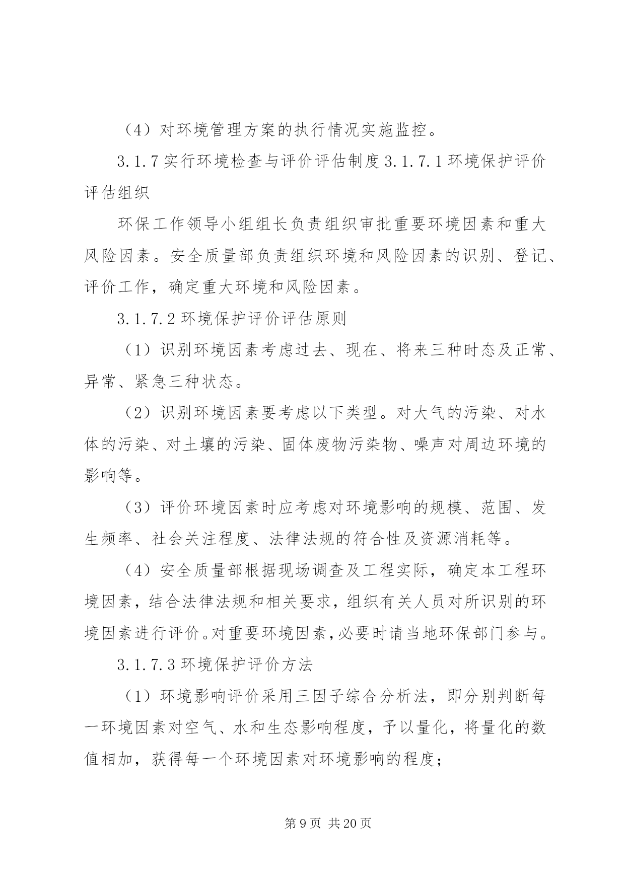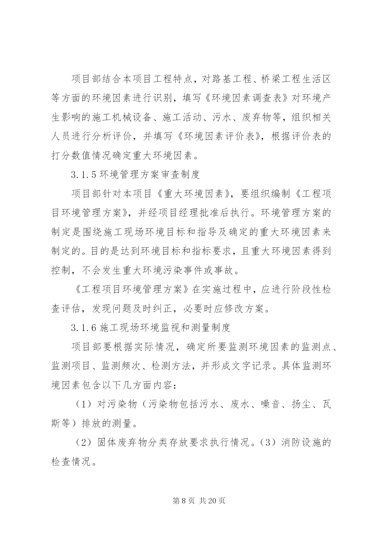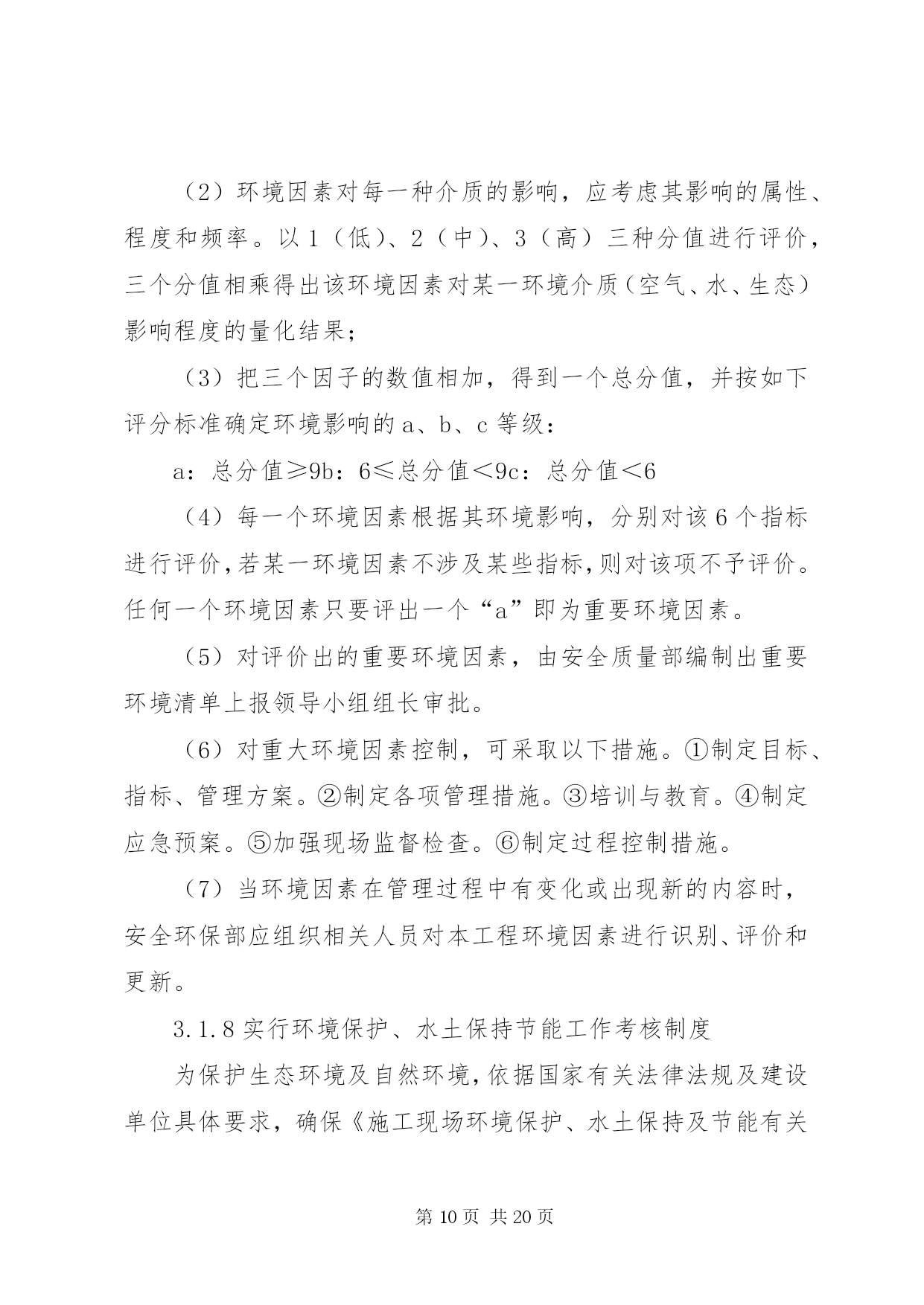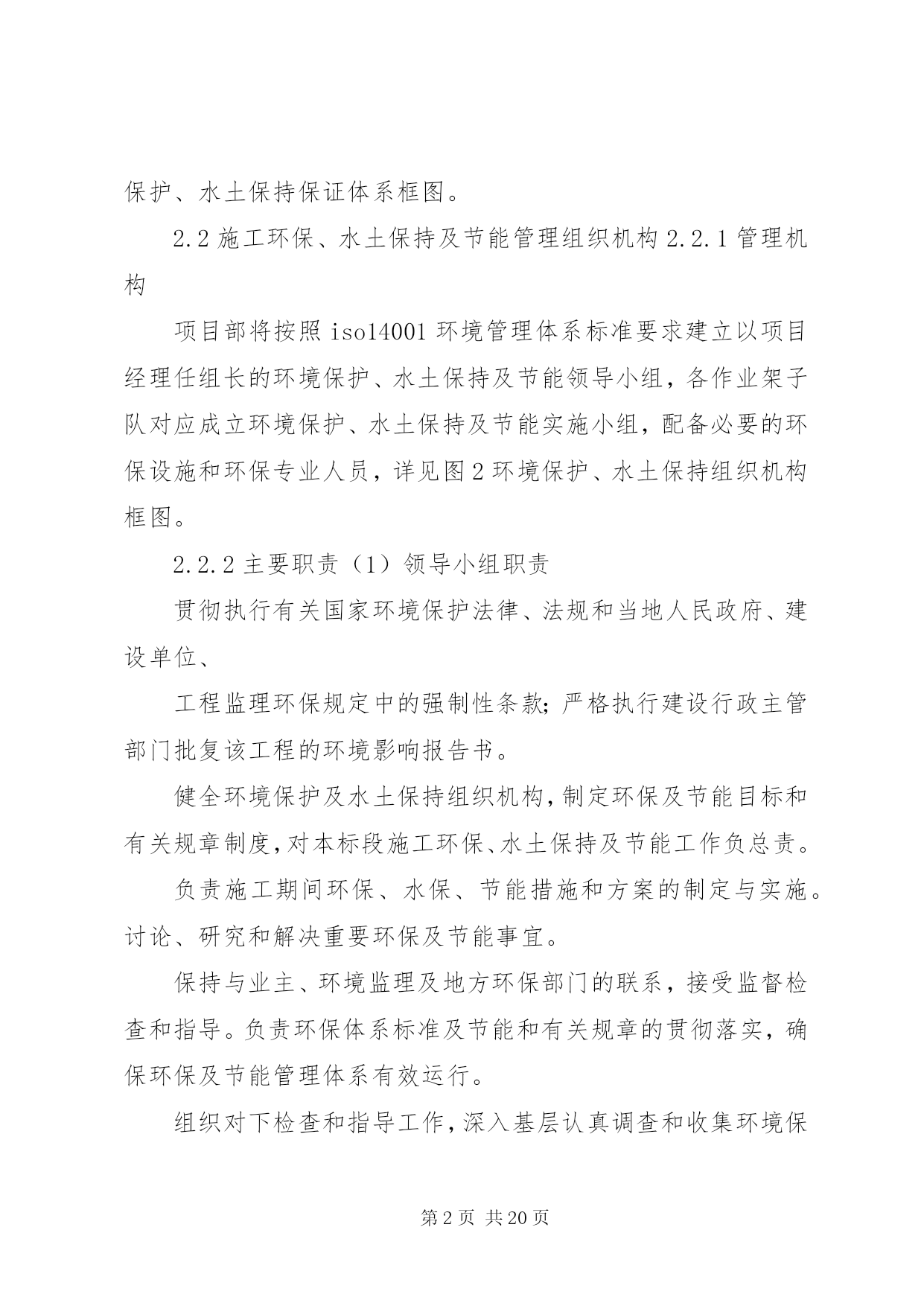 第PAGE\*Arabic\*MERGEFORMAT20页共NUMPAGES\*MERGEFORMAT20页环保、水土保持措施新建铁路成都至重庆客运专线施工环保、水土保持措施编制:日期审核:日期批准:日期中建铁路建设有限公司成渝客运专线cysg二标项目经理部施工环保、水土保持措施1环境保护、水土保持目标努力把工程设计和施工对环境的不利影响减至最低限度,确保铁路沿线景观不受破坏,地表水和地下水水质不受污染,植被有效保护,噪声、振动和扬尘的环境影响得到有效控制,文物得到有效保护;坚持做到“少破坏、多保护,少扰动、多防护,少污染、多防治”,使环境保护监控项目与监控结果达到设计文件及有关规定;做到环保、水保设施与工程建设“同时设计,同时施工,同时交付使用”。2施工环保、水土保持保证体系2.1施工环保、水土保持保证体系建立由项目经理部负责领导、部室分工管理、安全质量部、机械物资部监督指导、各作业架子队实施,从人、机、料、法、环、测六个方面完整的环境保护及节能保证体系,详见图1环境保护、水土保持保证体系框图。2.2施工环保、水土保持及节能管理组织机构2.2.1管理机构项目部将按照iso14001环境管理体系标准要求建立以项目经理任组长的环境保护、水土保持及节能领导小组,各作业架子队对应成立环境保护、水土保持及节能实施小组,配备必要的环保设施和环保专业人员,详见图2环境保护、水土保持组织机构框图。2.2.2主要职责(1)领导小组职责贯彻执行有关国家环境保护法律、法规和当地人民政府、建设单位、工程监理环保规定中的强制性条款;严格执行建设行政主管部门批复该工程的环境影响报告书。健全环境保护及水土保持组织机构,制定环保及节能目标和有关规章制度,对本标段施工环保、水土保持及节能工作负总责。负责施工期间环保、水保、节能措施和方案的制定与实施。讨论、研究和解决重要环保及节能事宜。保持与业主、环境监理及地方环保部门的联系,接受监督检查和指导。负责环保体系标准及节能和有关规章的贯彻落实,确保环保及节能管理体系有效运行。组织对下检查和指导工作,深入基层认真调查和收集环境保护及节能好的做法,并在本标段推广应用。(2)组长职责对施工中的施工环保、生态环保及水土保持、节能工作负总责。制定和签发本标段施工环保及水土保持、节能实施性计划。领导和带头贯彻执行国家/行业/环保政策法规,保证环保管理体系及节能措施有效运行。分解施工环保及水土保持、节能目标并进行实施。(3)小组成员职责严格执行国家环境保护法律、法规和当地政府、业主及施工技术细则规定的强制性条款。遵照执行经理部下发的有关环境保护及节能的各项规章和指令,同上级和相关业务部门保持联系,对下做好环保及节能指导和服务工作。经常深入施工现场进行监督检查,发现问题及时纠正,对重大问题要及时上报。负责环保管理及节能体系在本职权范围内的有效运行。常识教育教育培训贯标工作人管理层参建人员组织机构环保协调部人重视环保业主代表群众性活动激励机制规章制度环保责任制生活垃圾废水废污规范处理环废气废物油污处理保规程新设备试用施工设备成熟设备检测记录运行情况规范操作环保目标施工材料市场调查抽样检测环保材料运输环保化新技术新工艺试验环境污染控制有效,土地资源节约利用,水保措施落实到位,工程绿化完善美观,努力建成一流的资源节约型、环境友好型高速铁路。客运专线信息化手段施工方法环保检查施工图优化检测、记录参数总结环保情况大面积推广应用环环保要求专项检查持续改进保交底图纸审核定期检查数据联网信息反馈监理工程师施工环境施工噪声、废弃物、油污处理规程周围居民、学校三通一平文明施工标识标牌符合国家/行业/地方要求,做到\同时\改善卫生条件人人健康环保创优环保水土保护职业卫生健康事前检测重大事件处置机制监测环保\检\事中检测事后检测符合环保当地环保部门外部环保控制业主、监理要求图1环境保护、水土保持保证体系框图工程技术部安全质量部项目经理部环境保护、水土及节能保持领导小组组长:项目经理,副组长:副经理、项目总工,成员:各部门负责人、各架子队负责人综合管理部精测队物资设备部计划财务部中心试验室项目分部各作业架子队各作业班组图2环境保护、水土保持组织机构框图(4)环保工程师、节能管理员、架子队长职责严格执行国家有关环境保护法律、法规和当地政府、业主及施工技术细则规定的强制性条款。遵照执行经理部下发的环境保护的各项规章和指令,同上级业务部门保持联系,加强施工环保管理,保证环保管理体系在本队有效运行。加强对本队施工人员的环保及节能宣传教育工作,提高全员环保及节环保、水土保持措施.doc免费为全国范文类知名网站,下载全文稍作修改便可使用,即刻完成写稿任务。支付4.98元已有11人下载下载这篇word文档能意识,使人人知道保护环境就是珍爱生命