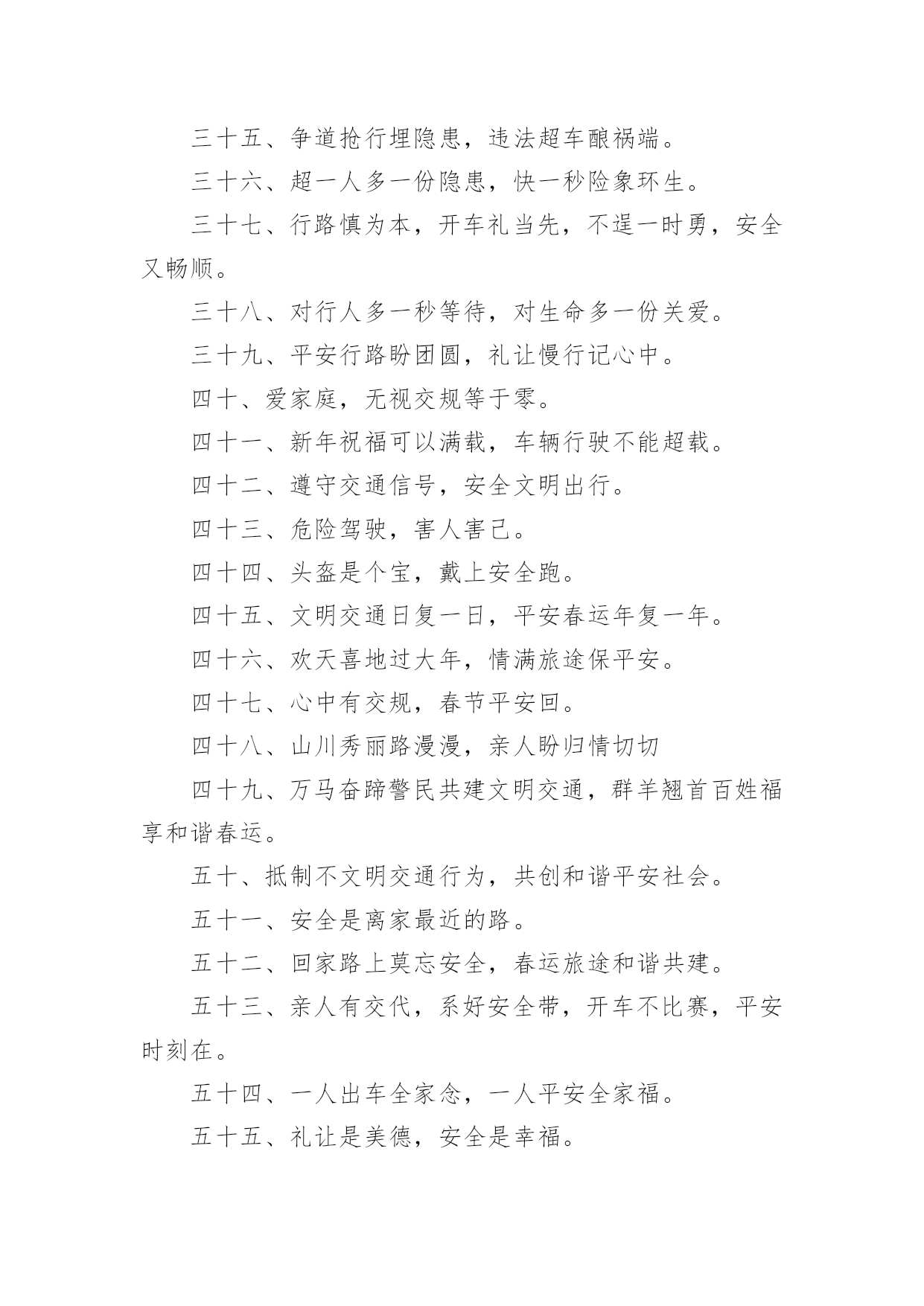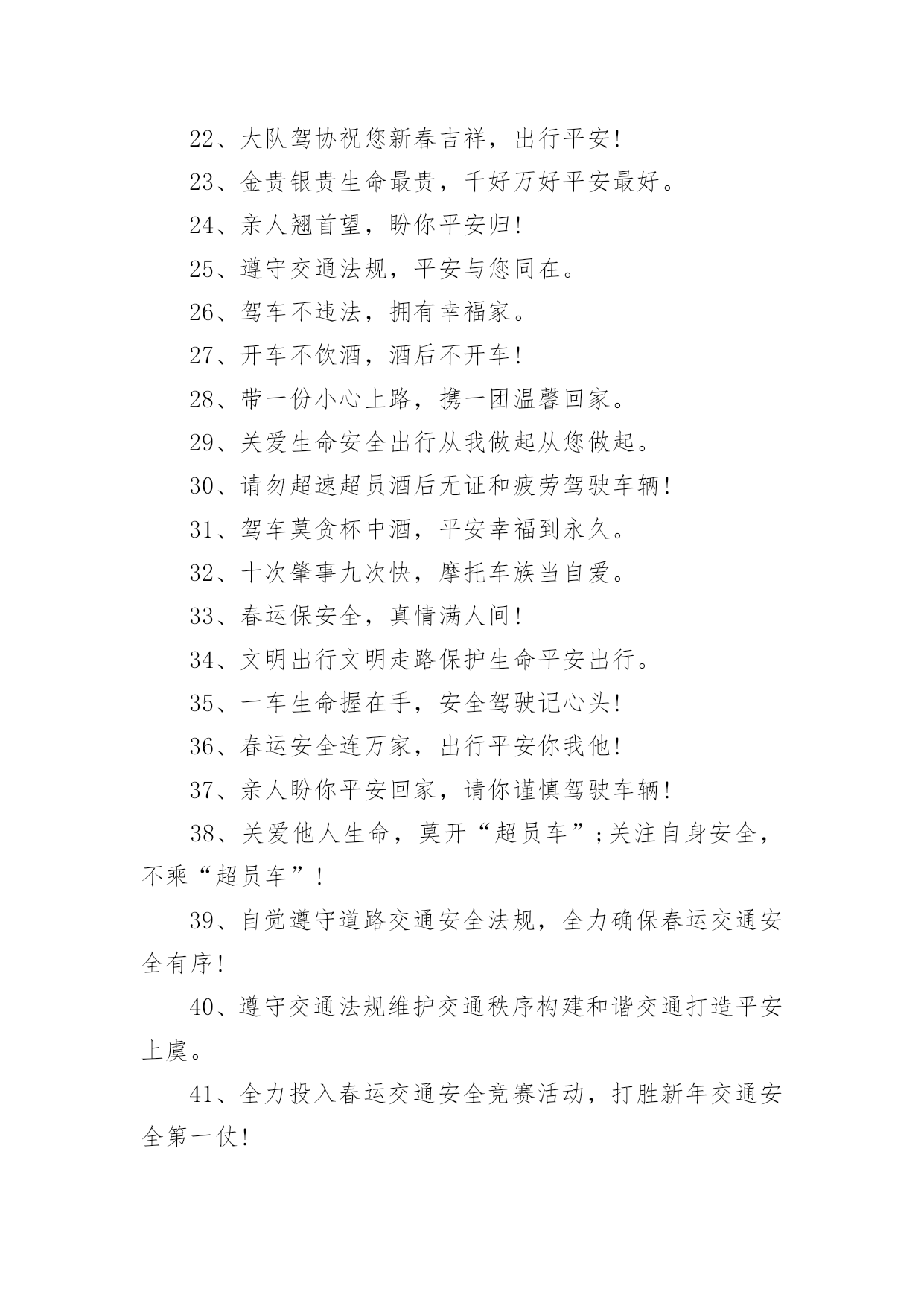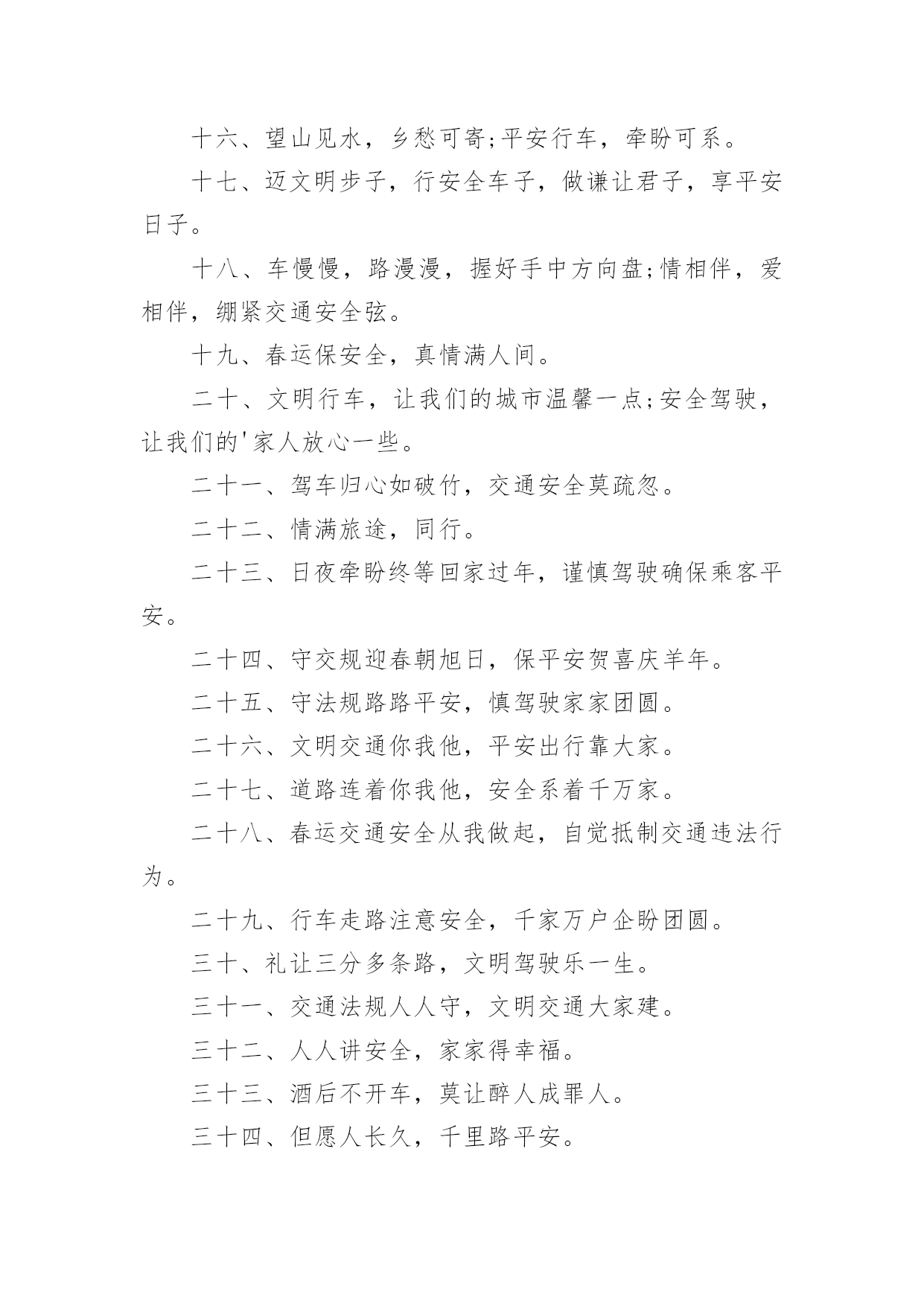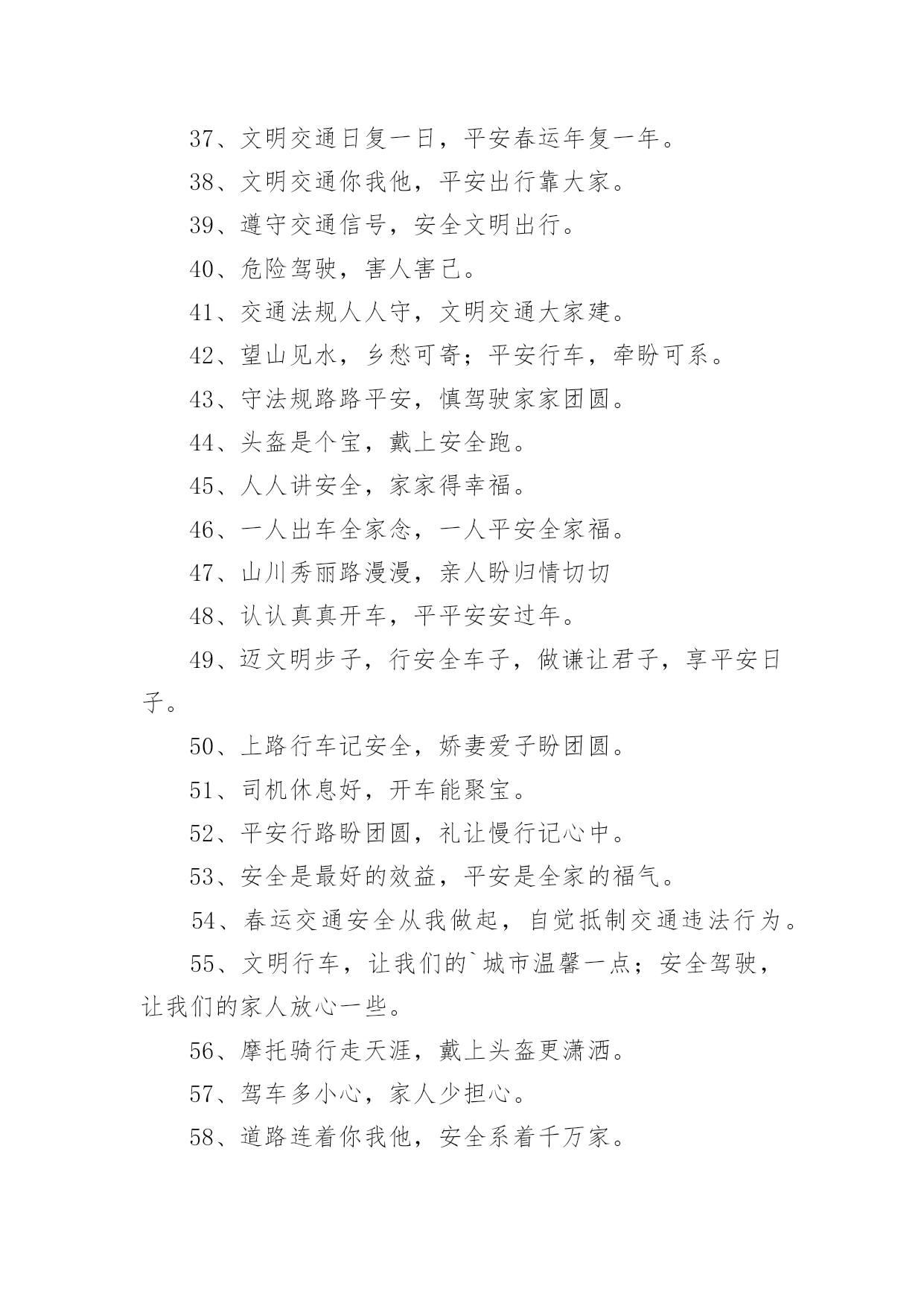 春运交通安全标语1春运交通安全标语在平平淡淡的日常中,大家对标语都再熟悉不过了吧,借助标语可以达到宣传文化的目的。什么样的标语才经典呢?以下是小编精心整理的春运交通安全标语,欢迎大家分享。春运交通安全标语1一、交通法规记心上,一看二慢三不抢。二、出车要小心,平安永相伴。三、驾车多小心,家人少担心。四、上路开车虽易,平安团圆不易,且行且珍惜。五、摩托骑行走天涯,戴上头盔更潇洒。六、超载超速,步步惊心。七、司机休息好,开车能聚宝。八、认认真真开车,平平安安过年。九、文明交通一路平安,和谐中国万家欢乐。十、上有老、下有小,交通安全要记牢。十一、过年团圆心切,开车回家慢行。十二、安全是最好的效益,平安是全家的福气。十三、谨慎驾驶勿大意,平安回家享团圆。十四、春运安全连万家,出行平安你我他。十五、亲朋相会聚一桌,有酒不劝司机喝;杯下留情真呵护,一路平安幸福多。十六、望山见水,乡愁可寄;平安行车,牵盼可系。十七、迈文明步子,行安全车子,做谦让君子,享平安日子。十八、车慢慢,路漫漫,握好手中方向盘;情相伴,爱相伴,绷紧交通安全弦。十九、春运保安全,真情满人间。二十、文明行车,让我们的城市温馨一点;安全驾驶,让我们的'家人放心一些。二十一、驾车归心如破竹,交通安全莫疏忽。二十二、情满旅途,同行。二十三、日夜牵盼终等回家过年,谨慎驾驶确保乘客平安。二十四、守交规迎春朝旭日,保平安贺喜庆羊年。二十五、守法规路路平安,慎驾驶家家团圆。二十六、文明交通你我他,平安出行靠大家。二十七、道路连着你我他,安全系着千万家。二十八、春运交通安全从我做起,自觉抵制交通违法行为。二十九、行车走路注意安全,千家万户企盼团圆。三十、礼让三分多条路,文明驾驶乐一生。三十一、交通法规人人守,文明交通大家建。三十二、人人讲安全,家家得幸福。三十三、酒后不开车,莫让醉人成罪人。三十四、但愿人长久,千里路平安。三十五、争道抢行埋隐患,违法超车酿祸端。三十六、超一人多一份隐患,快一秒险象环生。三十七、行路慎为本,开车礼当先,不逞一时勇,安全又畅顺。三十八、对行人多一秒等待,对生命多一份关爱。三十九、平安行路盼团圆,礼让慢行记心中。四十、爱家庭,无视交规等于零。四十一、新年祝福可以满载,车辆行驶不能超载。四十二、遵守交通信号,安全文明出行。四十三、危险驾驶,害人害己。四十四、头盔是个宝,戴上安全跑。四十五、文明交通日复一日,平安春运年复一年。四十六、欢天喜地过大年,情满旅途保平安。四十七、心中有交规,春节平安回。四十八、山川秀丽路漫漫,亲人盼归情切切四十九、万马奋蹄警民共建文明交通,群羊翘首百姓福享和谐春运。五十、抵制不文明交通行为,共创和谐平安社会。五十一、安全是离家最近的路。五十二、回家路上莫忘安全,春运旅途和谐共建。五十三、亲人有交代,系好安全带,开车不比赛,平安时刻在。五十四、一人出车全家念,一人平安全家福。五十五、礼让是美德,安全是幸福。五十六、一车生命握在手,安全驾驶记心头。五十七、带一份小心上路,携一团温馨回家。五十八、上路行车记安全,娇妻爱子盼团圆。春运交通安全标语21、高高兴兴出行来,平平安安回家去!2、全力投入春运交通安全竞赛活动,打胜新年交通安全第一仗!3、保障春运交通安全,营造节日祥和氛围!4、维护道路交通畅通,保障群众出行安全!5、自觉遵守道路交通安全法规,全力确保春运交通安全有序!6、规范行车秩序,严查交通违法,确保春运安全!7、强化春运客运管理,提高春运服务质量!8、春运安全连万家,出行平安你我他!9、春运保安全,真情满人间!10、安全是最好的效益,平安是全家的福气!11、守法规路路平安,慎驾驶家家团圆!12、春运交通安全从我做起,自觉抵制交通违法行为!13、一车生命握在手,安全驾驶记心头!14、行路慎为本,开车礼当先,不逞一时勇,安全又畅通!15、严禁“病车”上路,不准客车超员!16、不超速,不超员,不酒后驾驶,不疲劳驾驶!17、开车不饮酒,酒后不开车!18、对行人多一秒等待,对生命多一份关爱!19、不乘违法车辆,确保乘车安全!春运交通安全标语31、文明交通一路平安,和谐中国万家欢乐。2、有一种叮咛叫滴酒莫沾,有一种感觉叫望眼欲穿,有一种期盼叫一路平安,有一种温馨叫合家团圆。3、万马奋蹄警民共建文明交通,群羊翘首百姓福享和谐春运。4、过年团圆心切,开车回家慢行。5、驾车归心如破竹,交通安全莫疏忽。6、春运保安全,真情满人间。7、亲朋相会聚一桌,有酒不劝司机喝;杯下留情真呵护,一路平安幸福多。8、情满旅途,同行。9、亲人有交代,系好安全带,开车不比赛,平安时刻在。10、出车要小心,平安永相伴。11、争道抢行埋隐患,违法超车酿祸端。12、抵制不文明交通行为,共创和谐平安社会。13、新年祝福可以满载,车辆行驶不能超载。14、安全是父母的寄托,安全是妻子