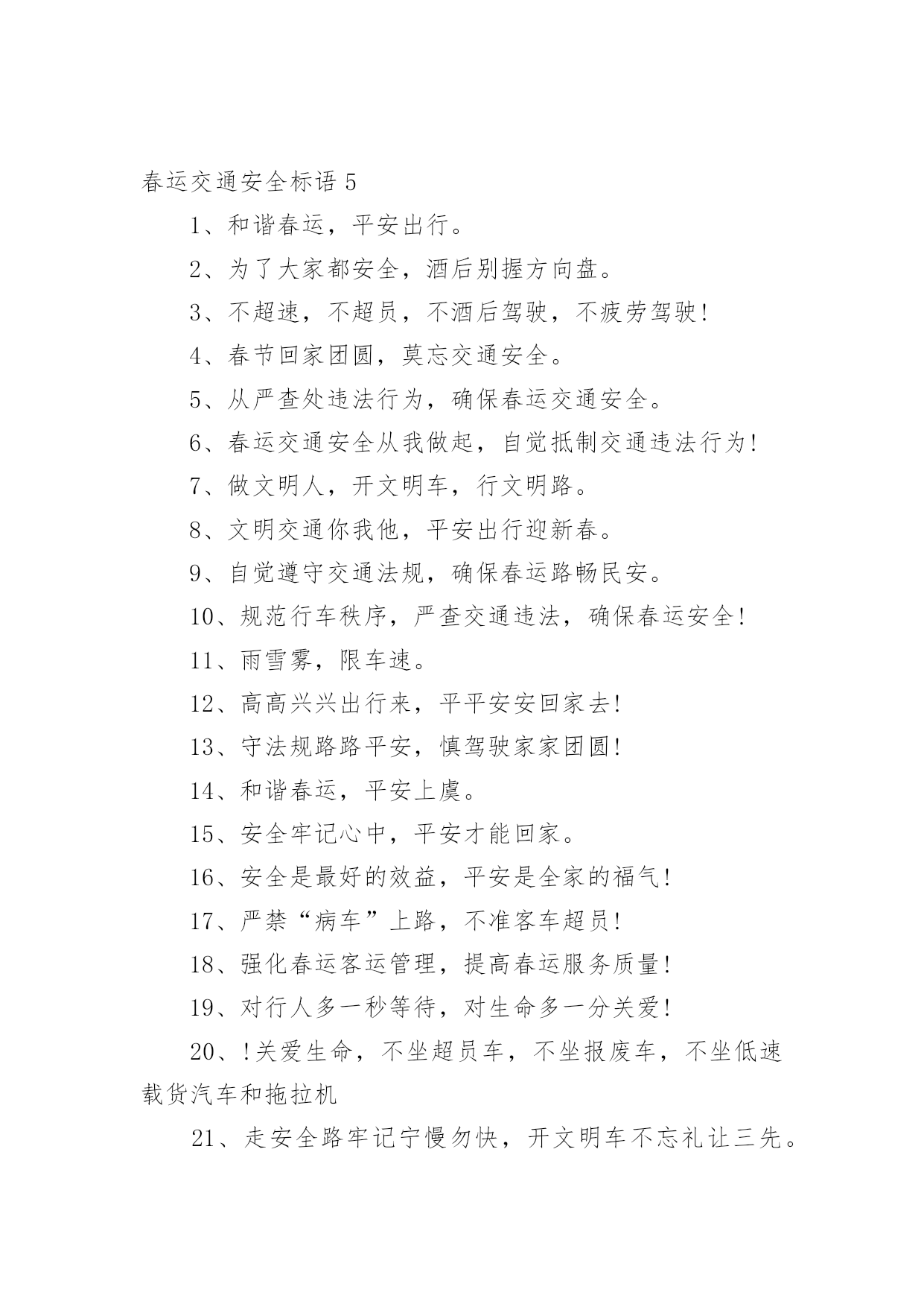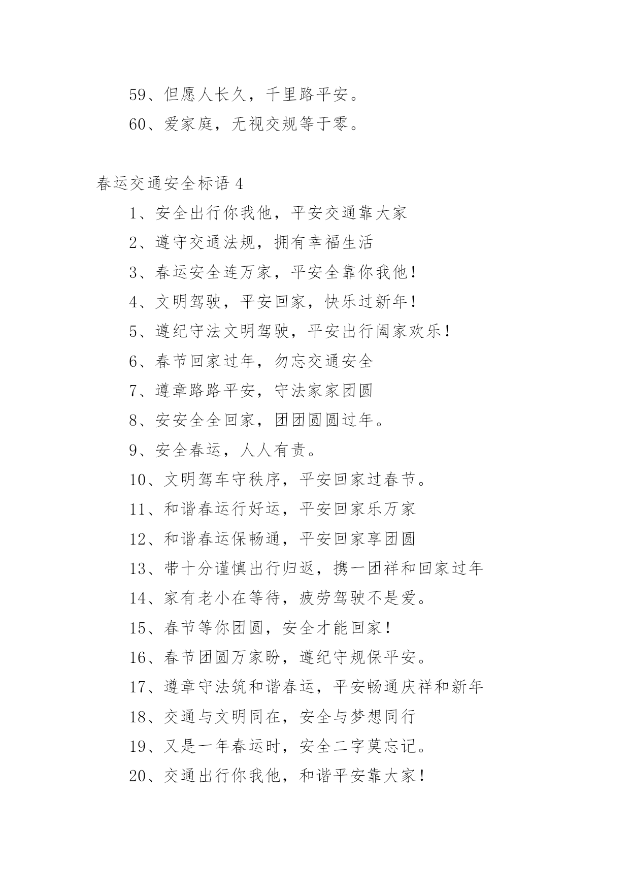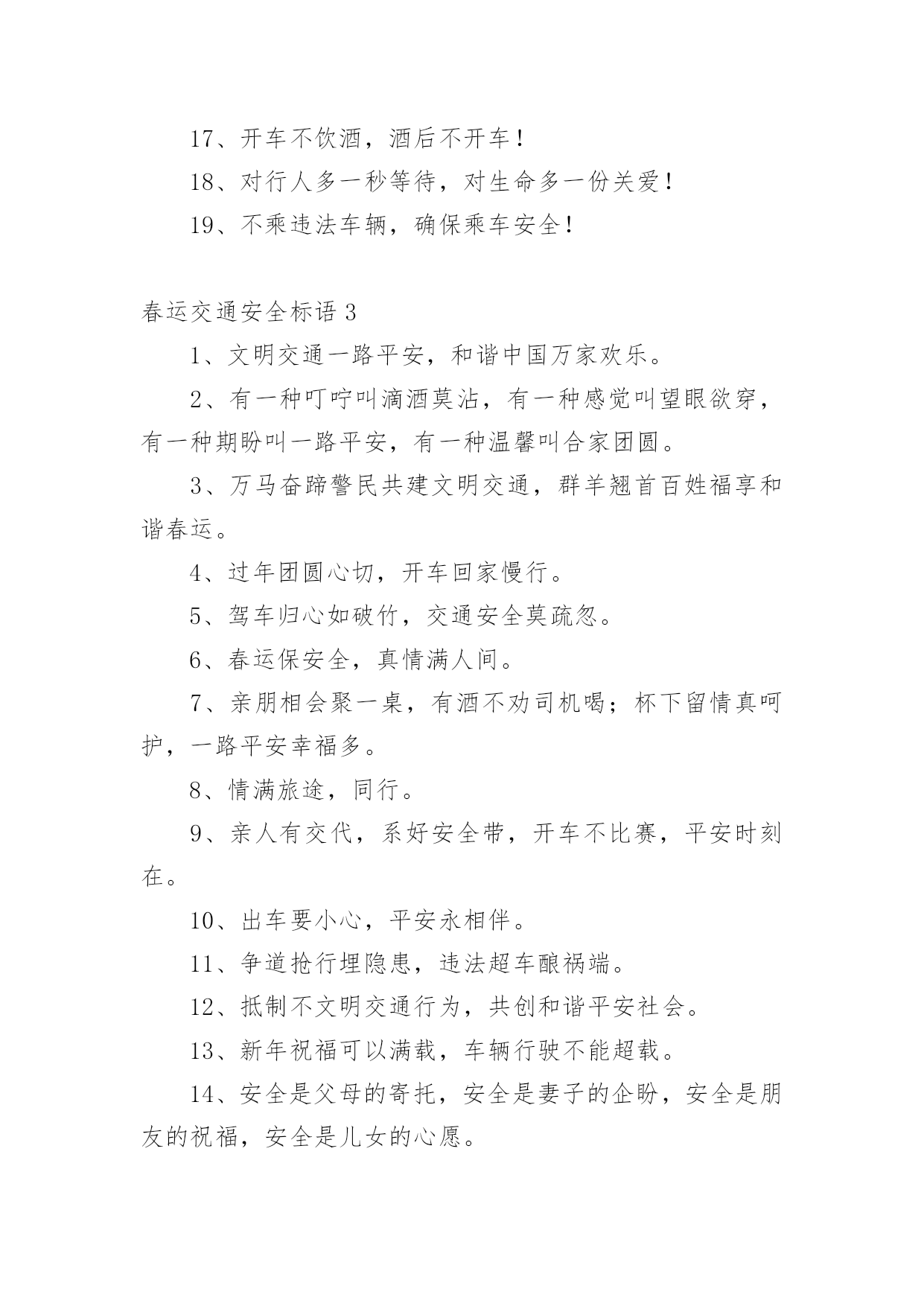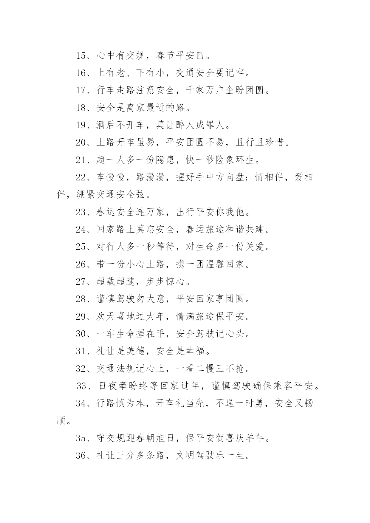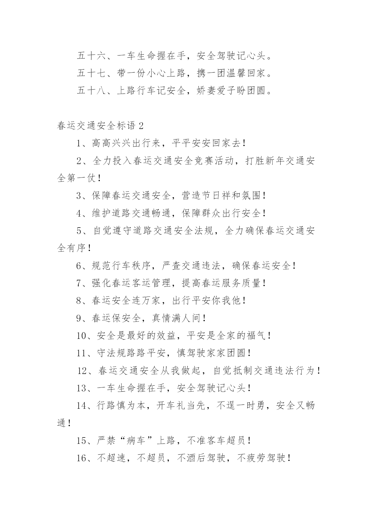 春运交通安全标语1春运交通安全标语在平平淡淡的日常中,大家对标语都再熟悉不过了吧,借助标语可以达到宣传文化的目的。什么样的标语才经典呢?以下是小编精心整理的春运交通安全标语,欢迎大家分享。春运交通安全标语1一、交通法规记心上,一看二慢三不抢。二、出车要小心,平安永相伴。三、驾车多小心,家人少担心。四、上路开车虽易,平安团圆不易,且行且珍惜。五、摩托骑行走天涯,戴上头盔更潇洒。六、超载超速,步步惊心。七、司机休息好,开车能聚宝。八、认认真真开车,平平安安过年。九、文明交通一路平安,和谐中国万家欢乐。十、上有老、下有小,交通安全要记牢。十一、过年团圆心切,开车回家慢行。十二、安全是最好的效益,平安是全家的福气。十三、谨慎驾驶勿大意,平安回家享团圆。十四、春运安全连万家,出行平安你我他。十五、亲朋相会聚一桌,有酒不劝司机喝;杯下留情真呵护,一路平安幸福多。十六、望山见水,乡愁可寄;平安行车,牵盼可系。十七、迈文明步子,行安全车子,做谦让君子,享平安日子。十八、车慢慢,路漫漫,握好手中方向盘;情相伴,爱相伴,绷紧交通安全弦。十九、春运保安全,真情满人间。二十、文明行车,让我们的城市温馨一点;安全驾驶,让我们的'家人放心一些。二十一、驾车归心如破竹,交通安全莫疏忽。二十二、情满旅途,同行。二十三、日夜牵盼终等回家过年,谨慎驾驶确保乘客平安。二十四、守交规迎春朝旭日,保平安贺喜庆羊年。二十五、守法规路路平安,慎驾驶家家团圆。二十六、文明交通你我他,平安出行靠大家。二十七、道路连着你我他,安全系着千万家。二十八、春运交通安全从我做起,自觉抵制交通违法行为。二十九、行车走路注意安全,千家万户企盼团圆。三十、礼让三分多条路,文明驾驶乐一生。三十一、交通法规人人守,文明交通大家建。三十二、人人讲安全,家家得幸福。三十三、酒后不开车,莫让醉人成罪人。三十四、但愿人长久,千里路平安。三十五、争道抢行埋隐患,违法超车酿祸端。三十六、超一人多一份隐患,快一秒险象环生。三十七、行路慎为本,开车礼当先,不逞一时勇,安全又畅顺。三十八、对行人多一秒等待,对生命多一份关爱。三十九、平安行路盼团圆,礼让慢行记心中。四十、爱家庭,无视交规等于零。四十一、新年祝福可以满载,车辆行驶不能超载。四十二、遵守交通信号,安全文明出行。四十三、危险驾驶,害人害己。四十四、头盔是个宝,戴上安全跑。四十五、文明交通日复一日,平安春运年复一年。四十六、欢天喜地过大年,情满旅途保平安。四十七、心中有交规,春节平安回。四十八、山川秀丽路漫漫,亲人盼归情切切四十九、万马奋蹄警民共建文明交通,群羊翘首百姓福享和谐春运。五十、抵制不文明交通行为,共创和谐平安社会。五十一、安全是离家最近的路。五十二、回家路上莫忘安全,春运旅途和谐共建。五十三、亲人有交代,系好安全带,开车不比赛,平安时刻在。五十四、一人出车全家念,一人平安全家福。五十五、礼让是美德,安全是幸福。五十六、一车生命握在手,安全驾驶记心头。五十七、带一份小心上路,携一团温馨回家。五十八、上路行车记安全,娇妻爱子盼团圆。春运交通安全标语21、高高兴兴出行来,平平安安回家去!2、全力投入春运交通安全竞赛活动,打胜新年交通安全第一仗!3、保障春运交通安全,营造节日祥和氛围!4、维护道路交通畅通,保障群众出行安全!5、自觉遵守道路交通安全法规,全力确保春运交通安全有序!6、规范行车秩序,严查交通违法,确保春运安全!7、强化春运客运管理,提高春运服务质量!8、春运安全连万家,出行平安你我他!9、春运保安全,真情满人间!10、安全是最好的效益,平安是全家的福气!11、守法规路路平安,慎驾驶家家团圆!12、春运交通安全从我做起,自觉抵制交通违法行为!13、一车生命握在手,安全驾驶记心头!14、行路慎为本,开车礼当先,不逞一时勇,安全又畅通!15、严禁“病车”上路,不准客车超员!16、不超速,不超员,不酒后驾驶,不疲劳驾驶!17、开车不饮酒,酒后不开车!18、对行人多一秒等待,对生命多一份关爱!19、不乘违法车辆,确保乘车安全!春运交通安全标语31、文明交通一路平安,和谐中国万家欢乐。2、有一种叮咛叫滴酒莫沾,有一种感觉叫望眼欲穿,有一种期盼叫一路平安,有一种温馨叫合家团圆。3、万马奋蹄警民共建文明交通,群羊翘首百姓福享和谐春运。4、过年团圆心切,开车回家慢行。5、驾车归心如破竹,交通安全莫疏忽。6、春运保安全,真情满人间。7、亲朋相会聚一桌,有酒不劝司机喝;杯下留情真呵护,一路平安幸福多。8、情满旅途,同行。9、亲人有交代,系好安全带,开车不比赛,平安时刻在。10、出车要小心,平安永相伴。11、争道抢行埋隐患,违法超车酿祸端。12、抵制不文明交通行为,共创和谐平安社会。13、新年祝福可以满载,车辆行驶不能超载。14、安全是父母的寄托,安全是妻子